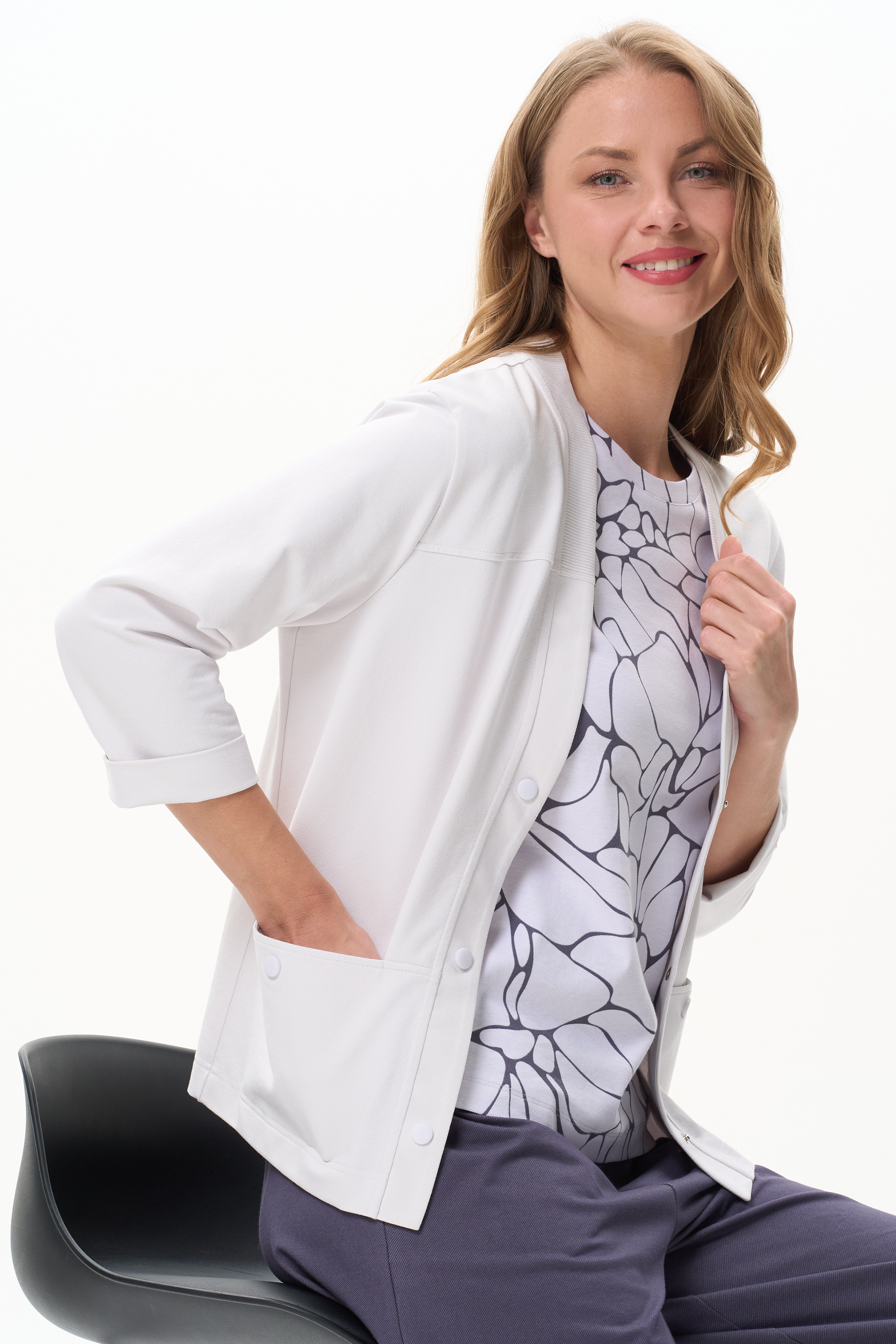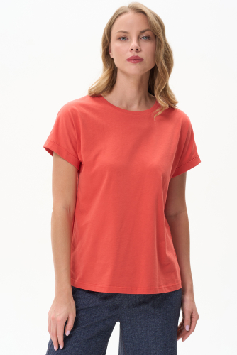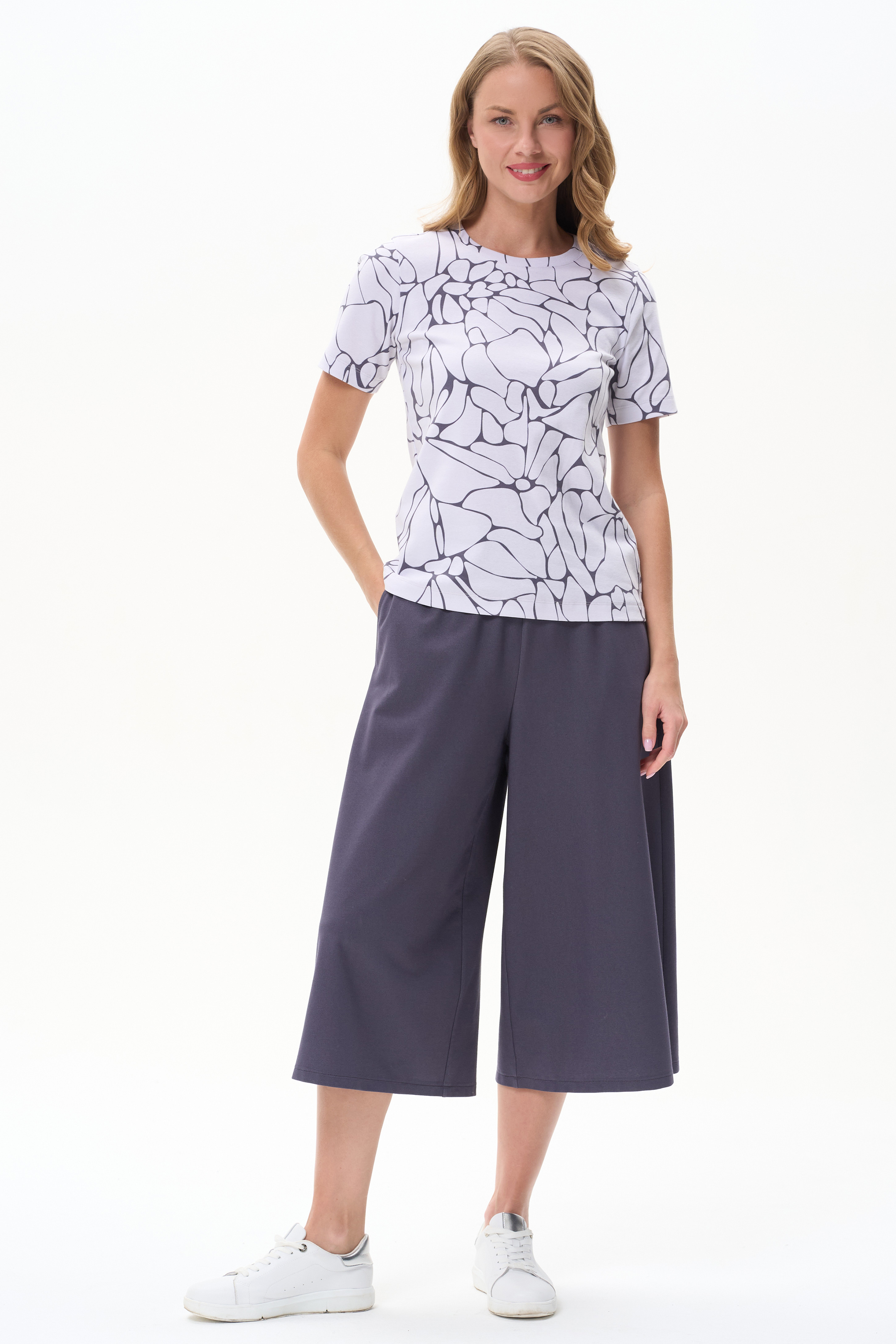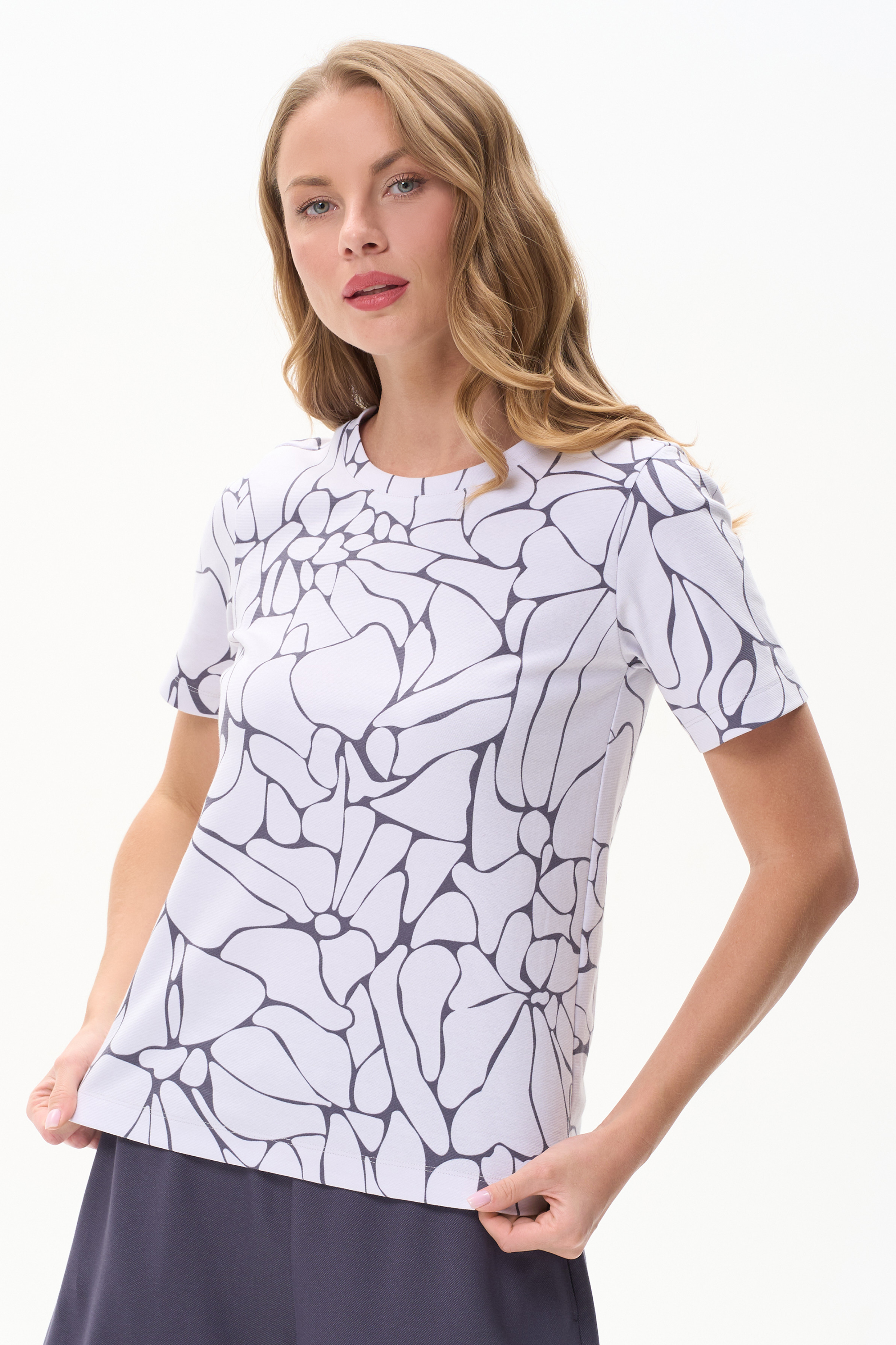 92% хлопок, 8% эластан Футболка-джемпер выполнена из пластичной рибаны с дизайнерским рисунком. Модель прямого силуэта, круглый углубленный вырез, рукава втачные. Рисунок и сочетание оттенков придает модели нарядный и презентабельный вид. Рост модели 175 см.