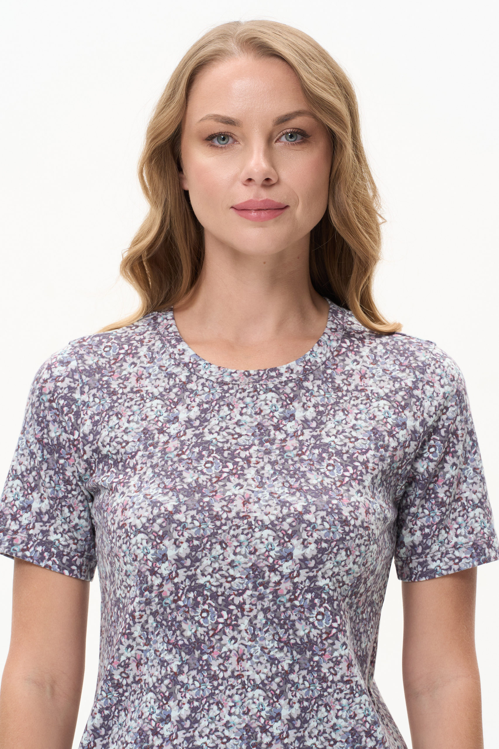 Футболка выполнена из пластичной рибаны с цветочным рисункоми. Модель прямого силуэта, круглый углубленный вырез, рукава втачные. Комфотртная модель для повседневных образов с брюками и юбкой. Рост модели 175 см .