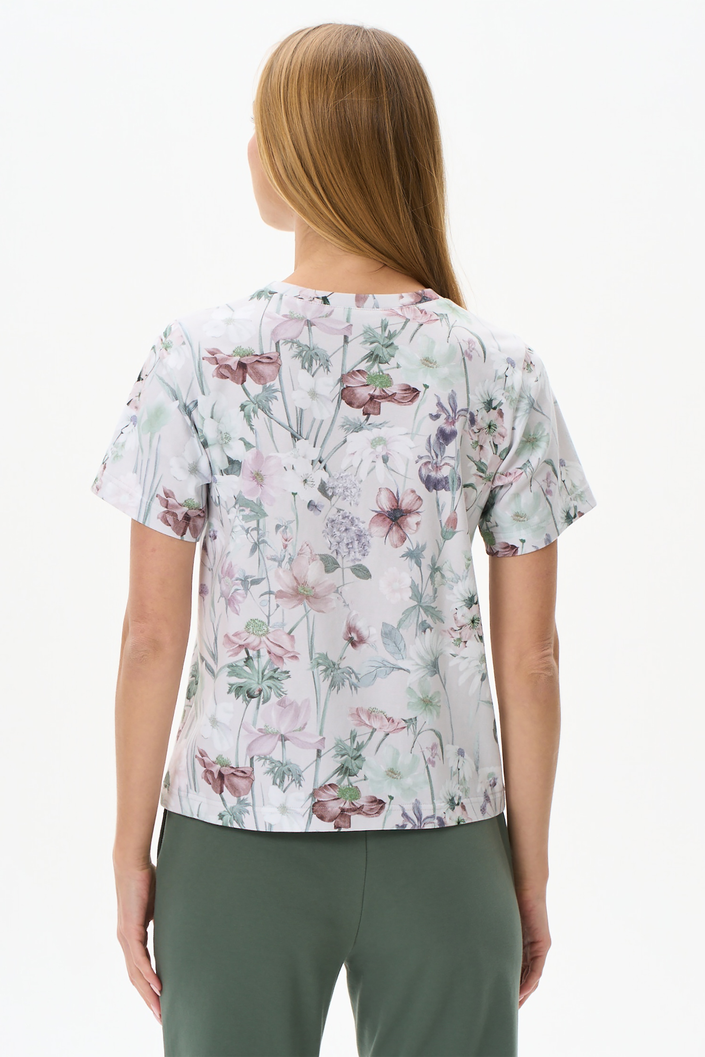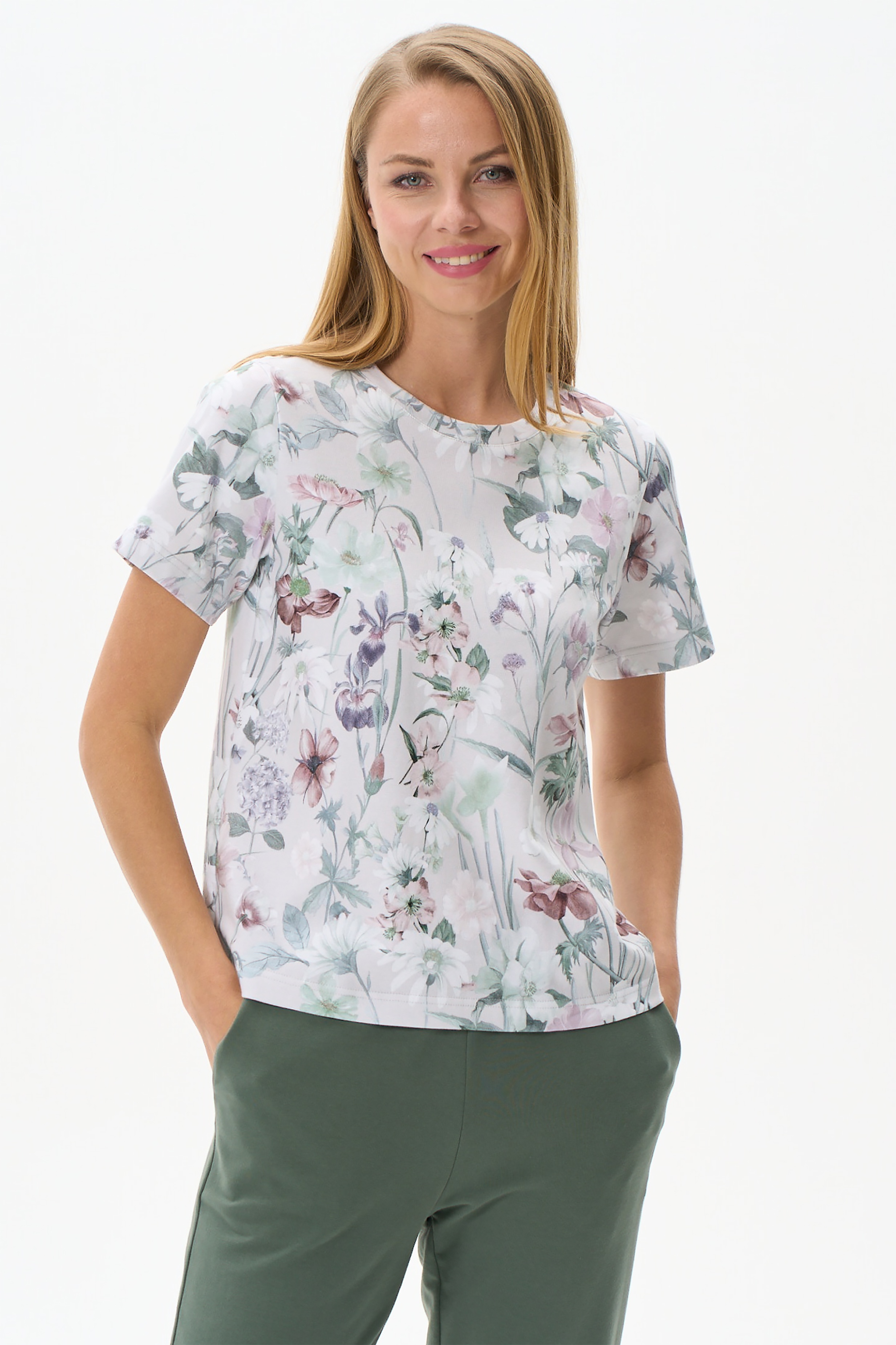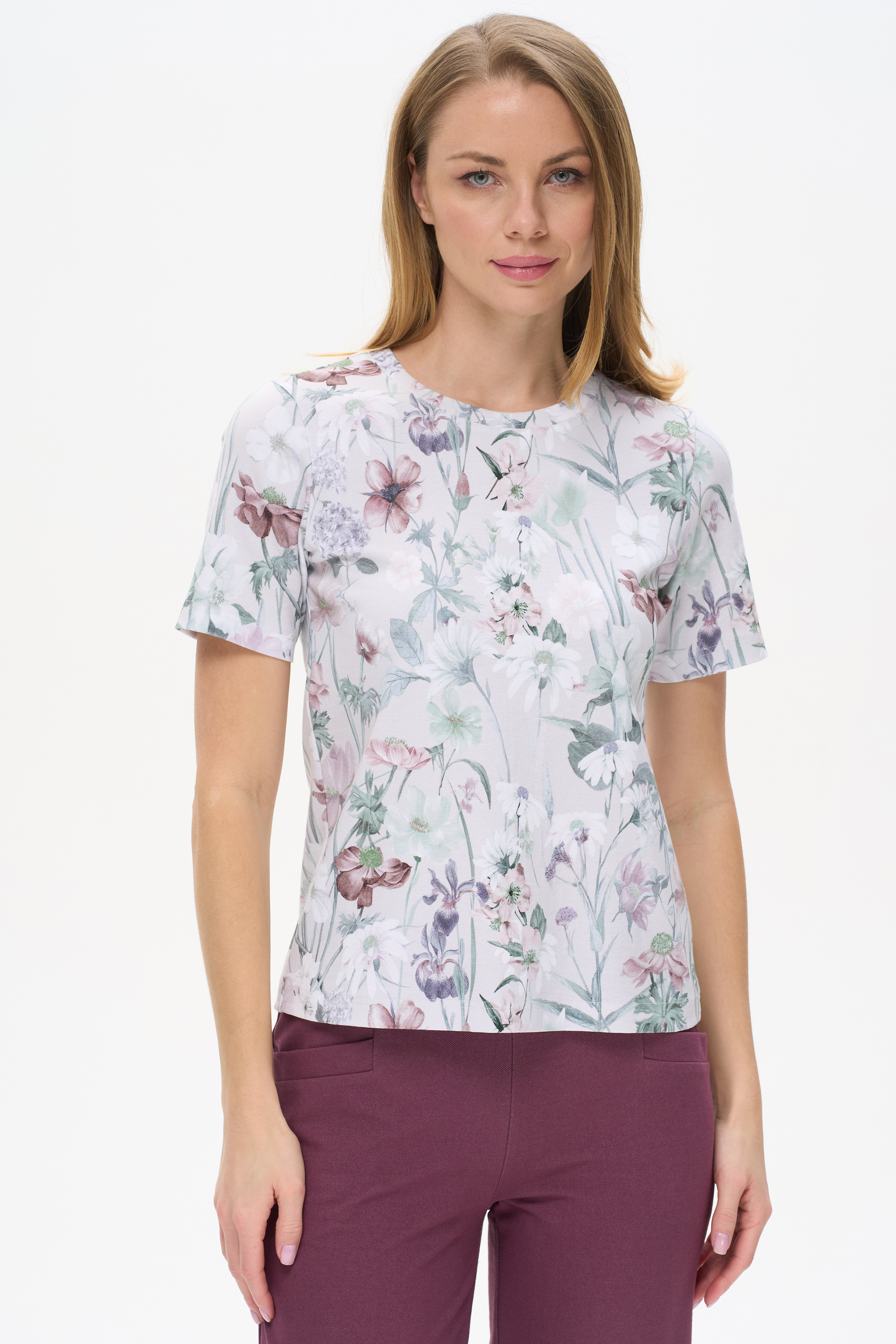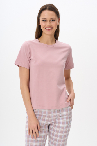 Стильная футболка прямого силуэта, выполнена из хлопкового трикотажного полотна с эластаном - рибана. Круглый вырез горловины, втачные короткие рукава. Рост модели на фото 178см.