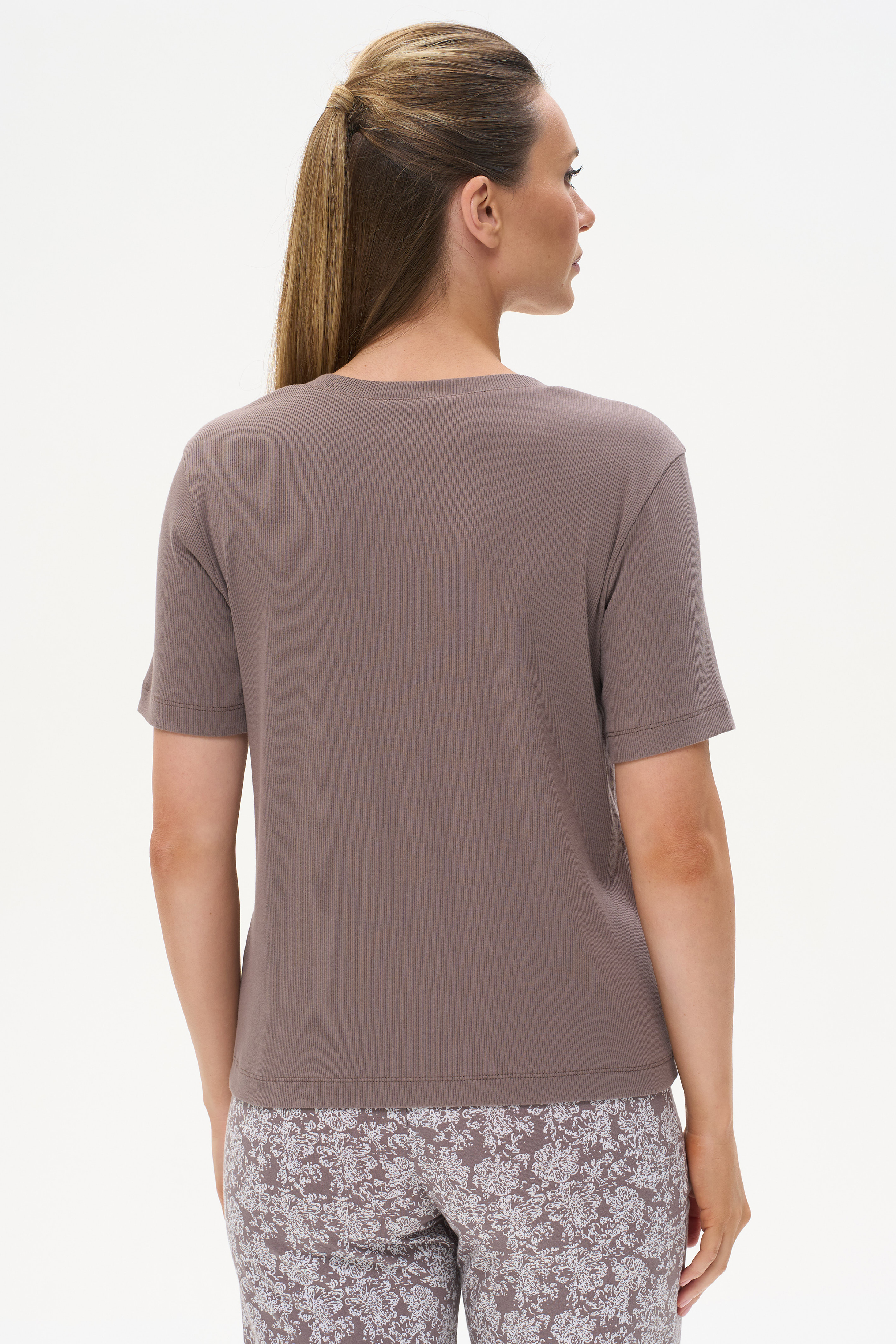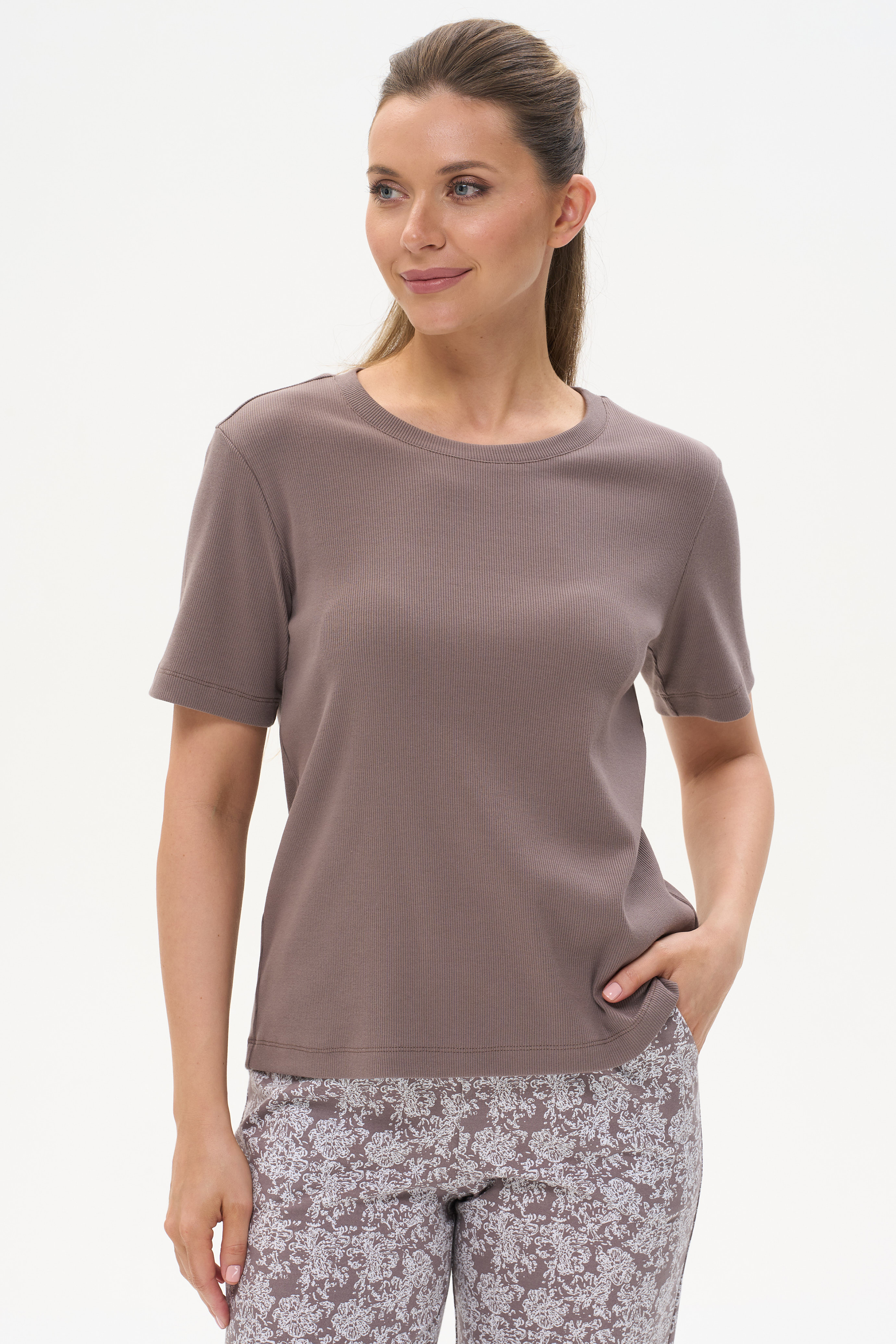 92% хлопок, 8% эластан Стильная футболка прямого силуэта, выполнена из хлопкового трикотажного полотна с эластаном - кашкорсе. Круглый вырез горловины, втачные короткие рукава. Рост модели на фото 178см.