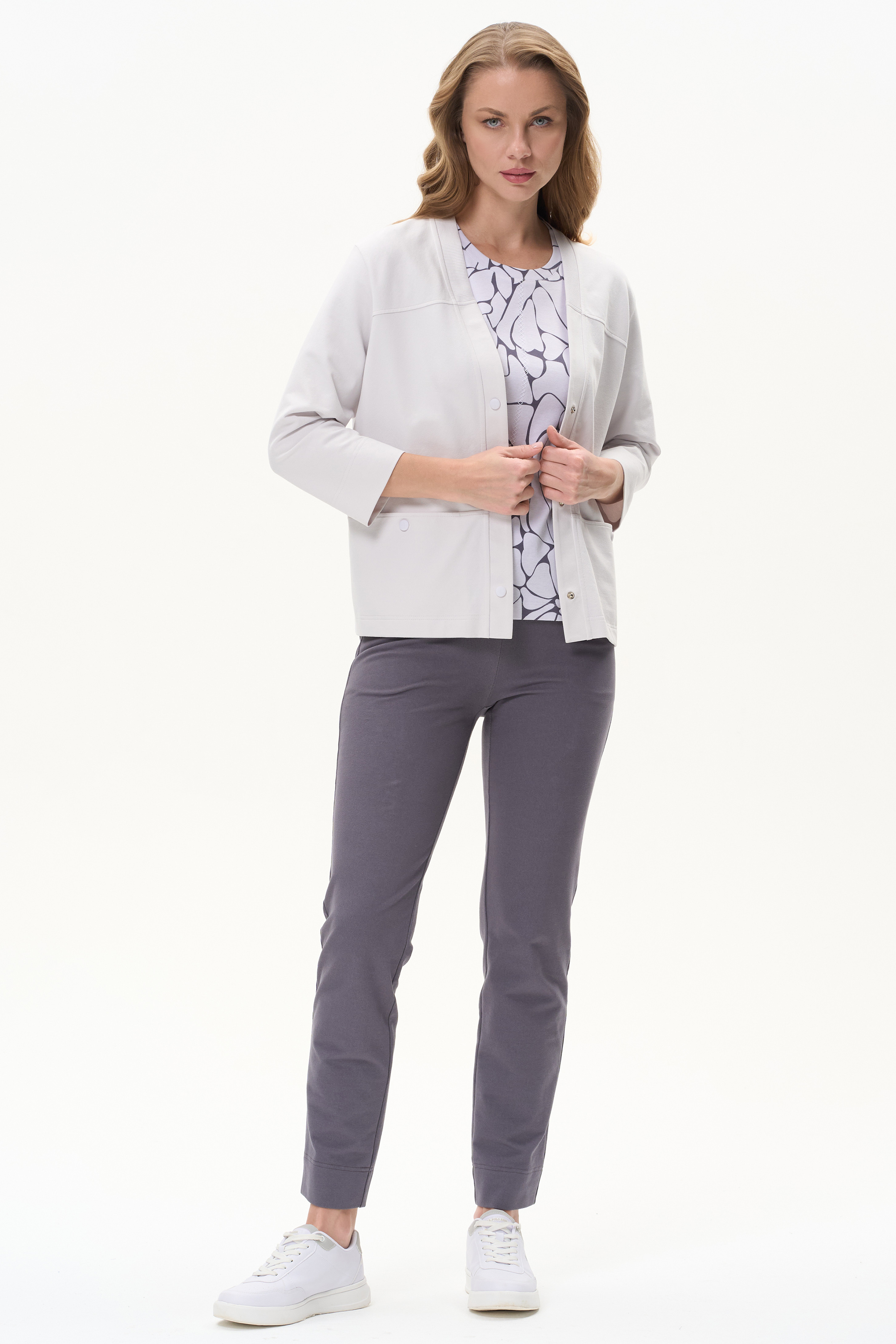 92% хлопок, 8% эластан Футболка-джемпер выполнена из пластичной рибаны с дизайнерским рисунком и с декоративной строчкой по полочке и спинке. Модель прямого силуэта, круглый углубленный вырез, рукава втачные. Рисунок и сочетание оттенков придает модели нарядный и презентабельный вид. Рост модели 175 см