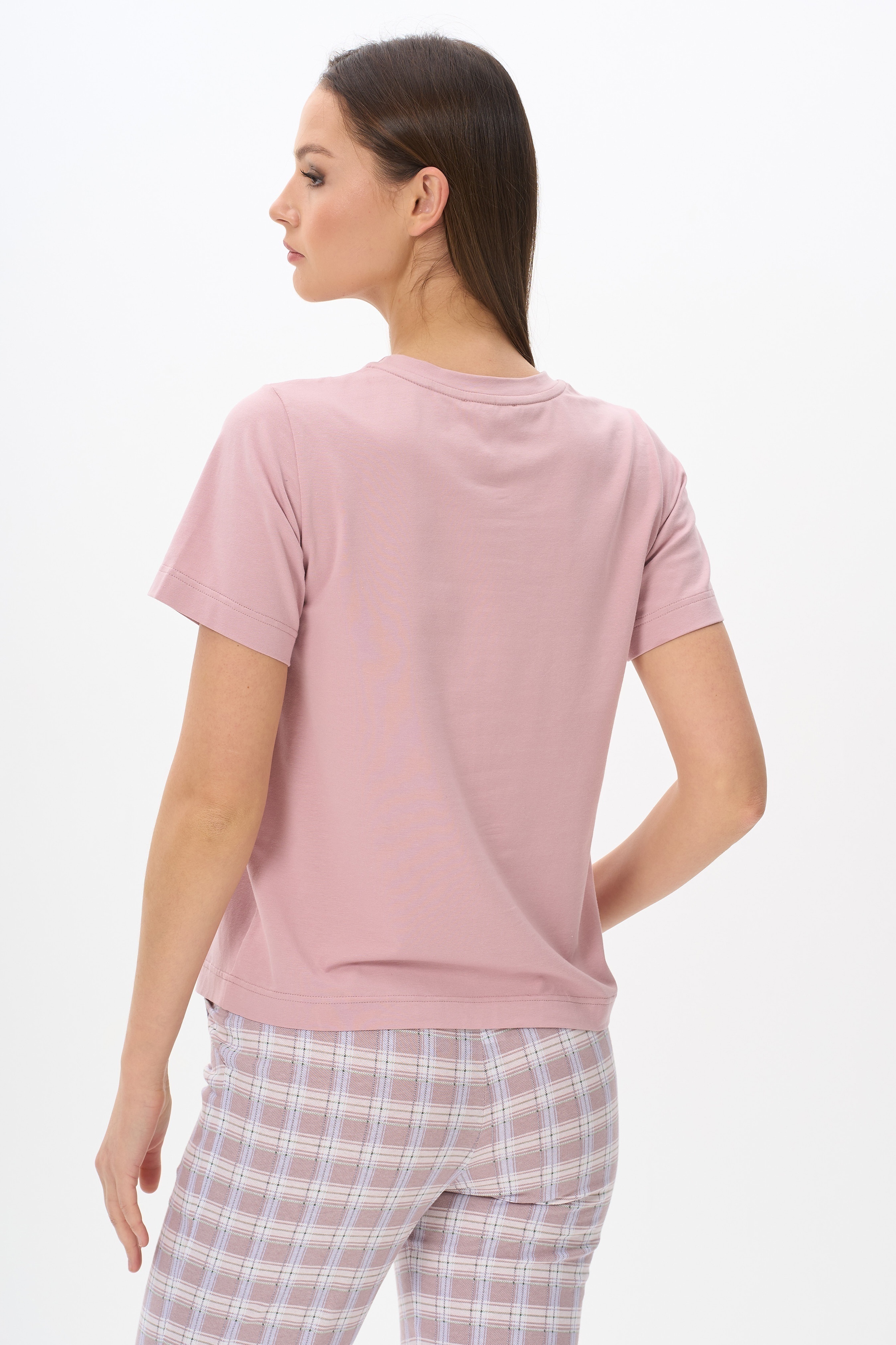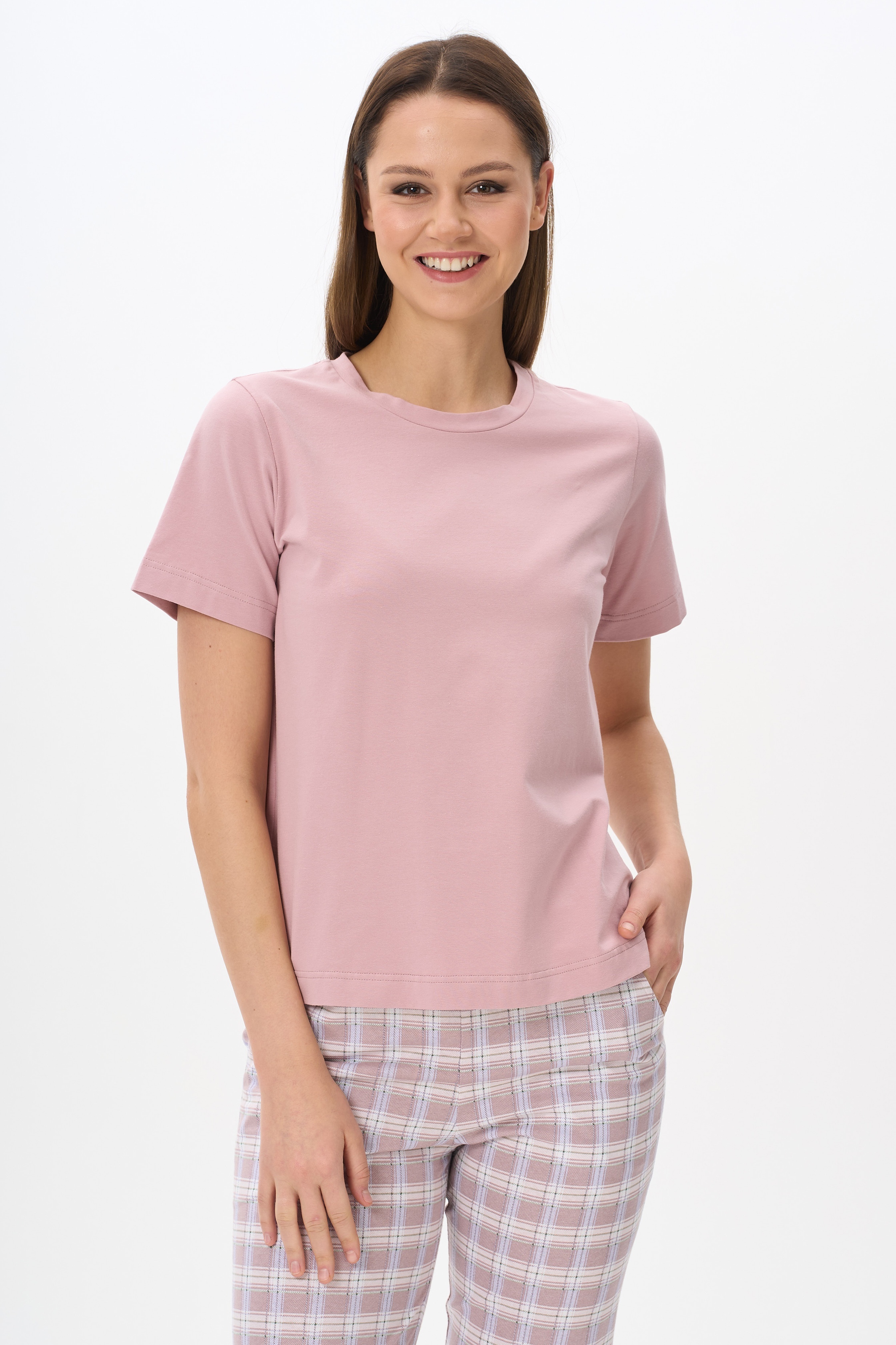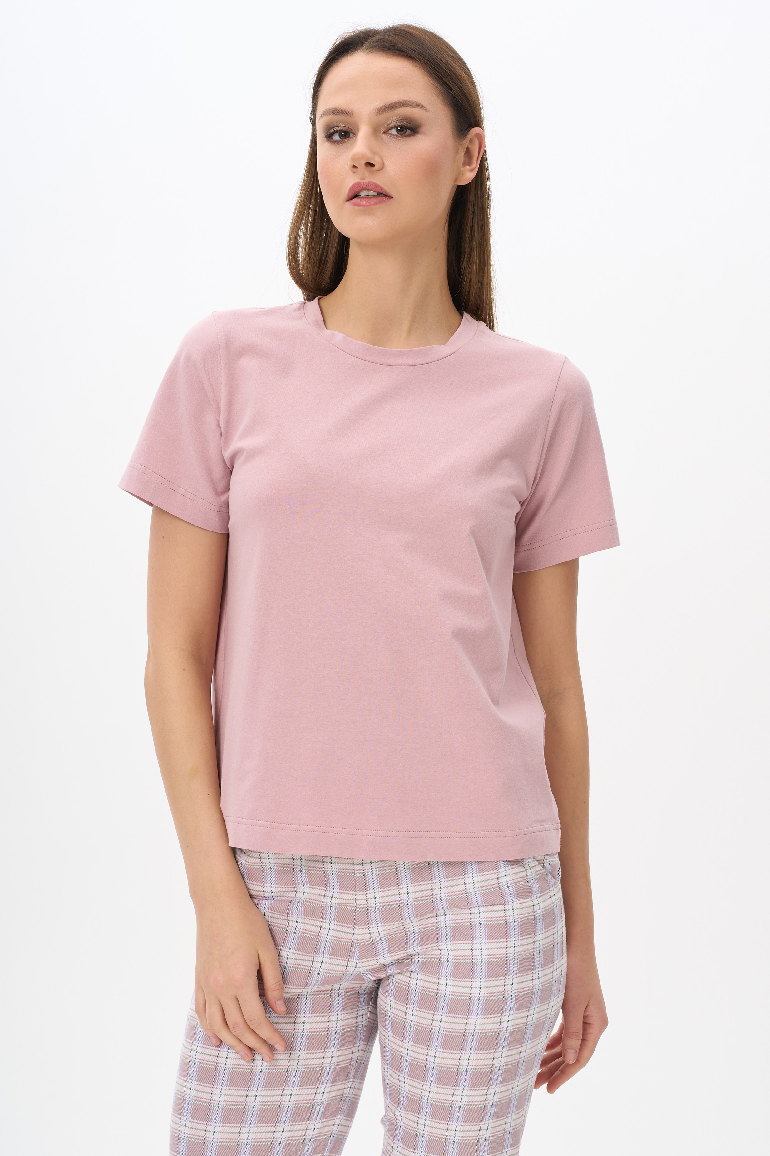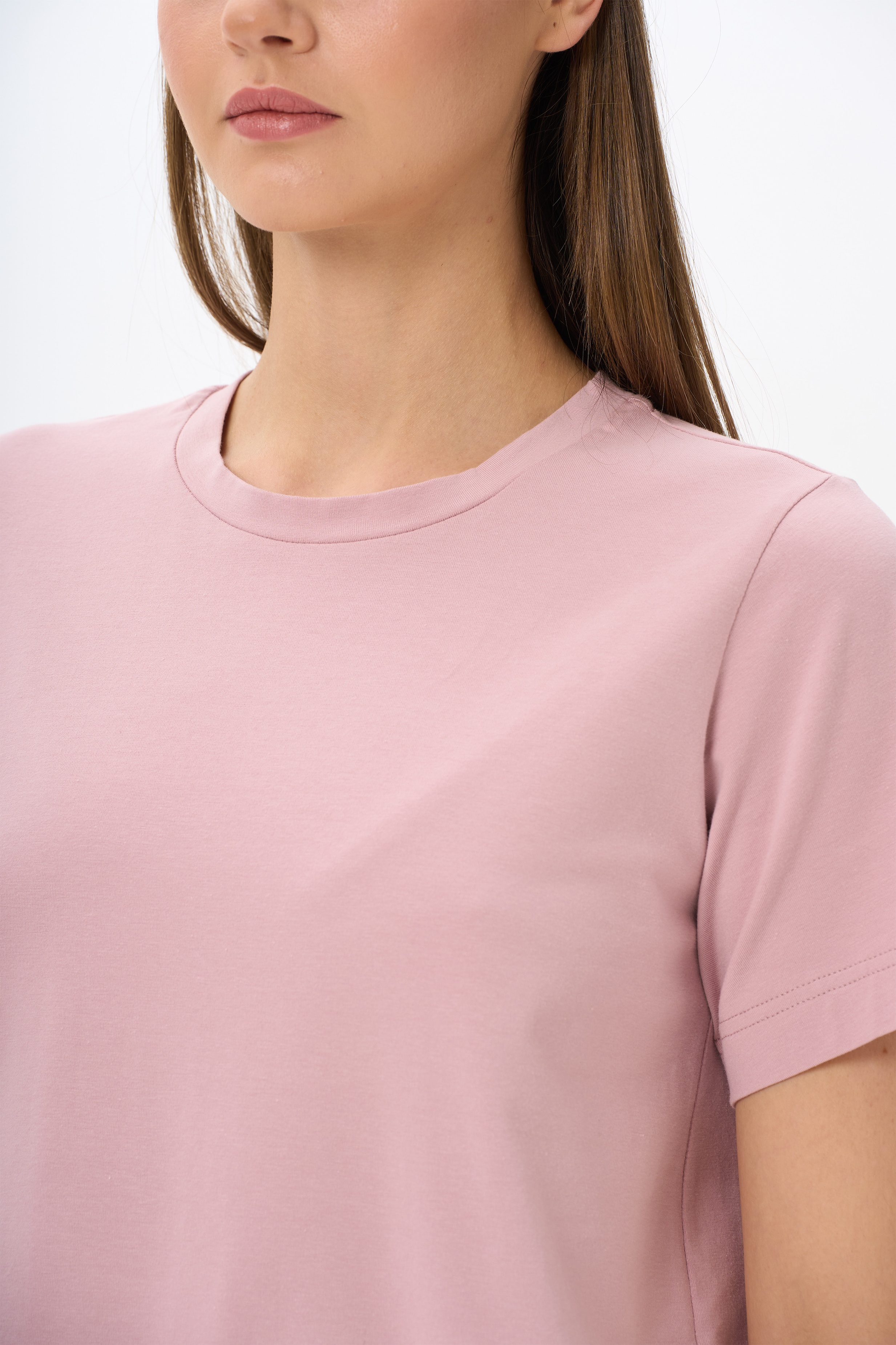 Футболка модного кроя, свободная и чуть укороченная, до середины бёдер. Выполнена из хлопкового трикотажного полотна с эластаном. Свободный втачной рукав гармонизирует общий стиль. Рост модели на фото 177см