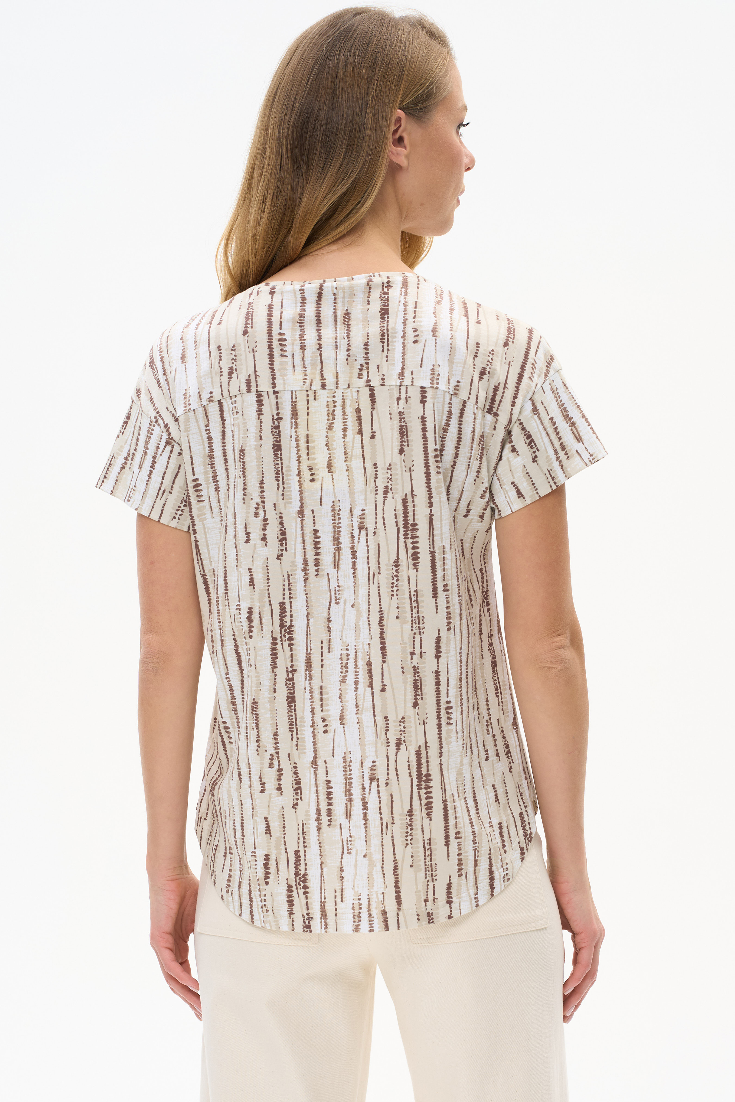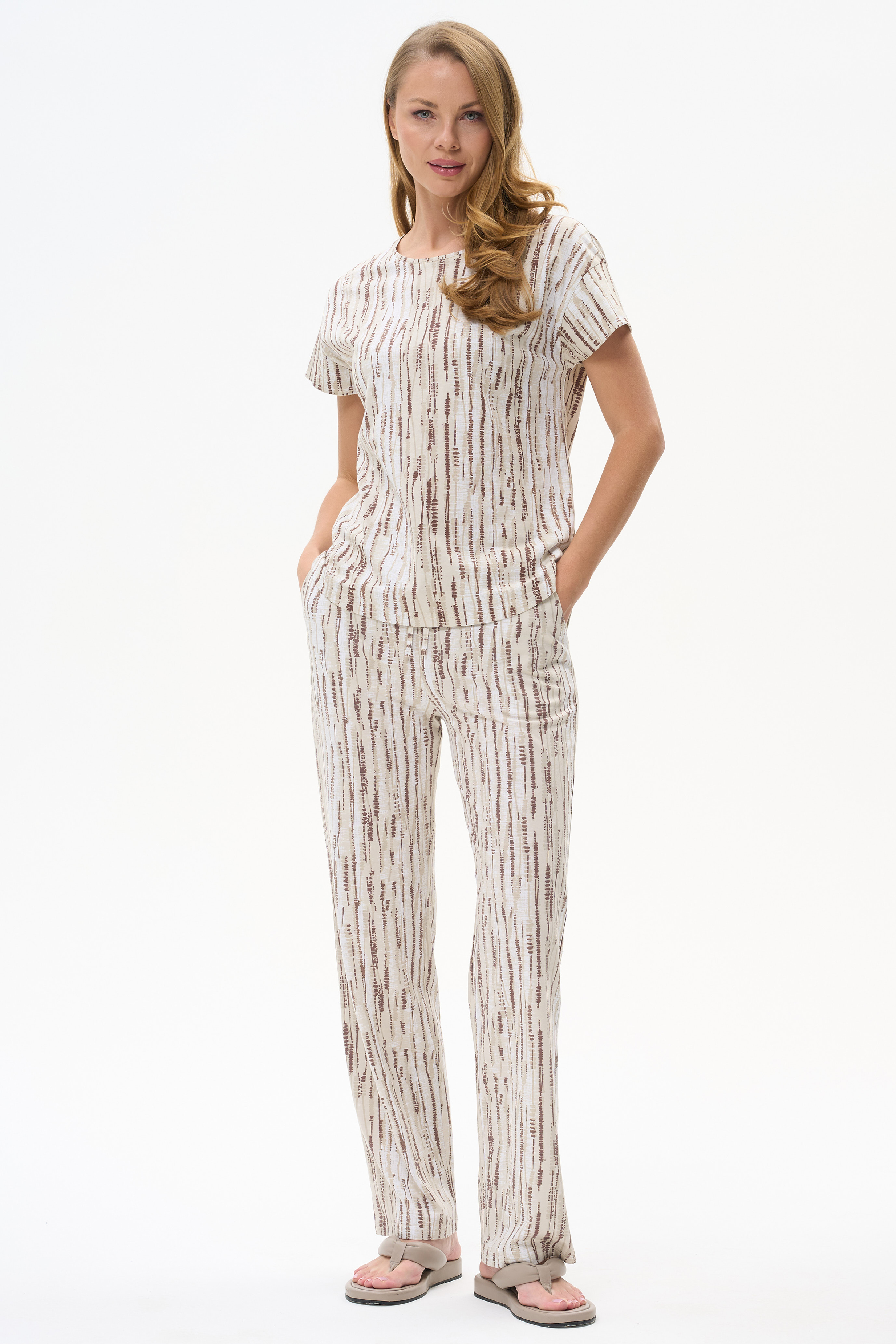 100% хлопок Свободная футболка из кулирки 150 гр Вертикальная полоска в оттенках коллекции. Модель удлинённая, со спущенным плечом, круглый вырез горловины, короткие рукава закруглённый низ. Комфортная, лёгкая модель на жаркие дни. Рост модели 175 см.