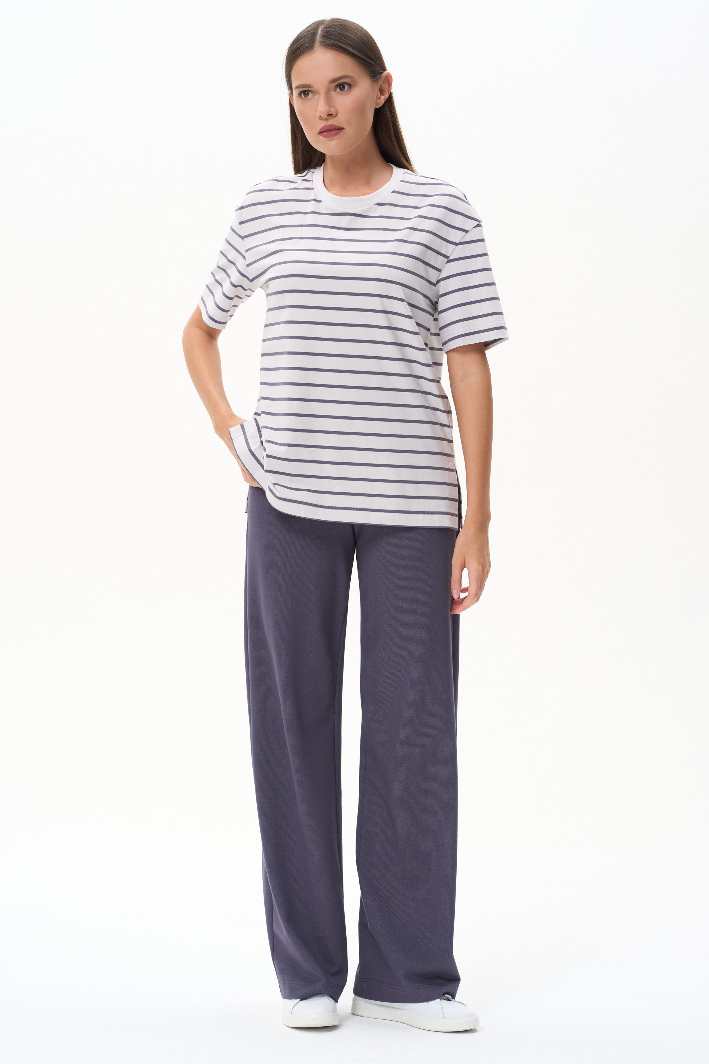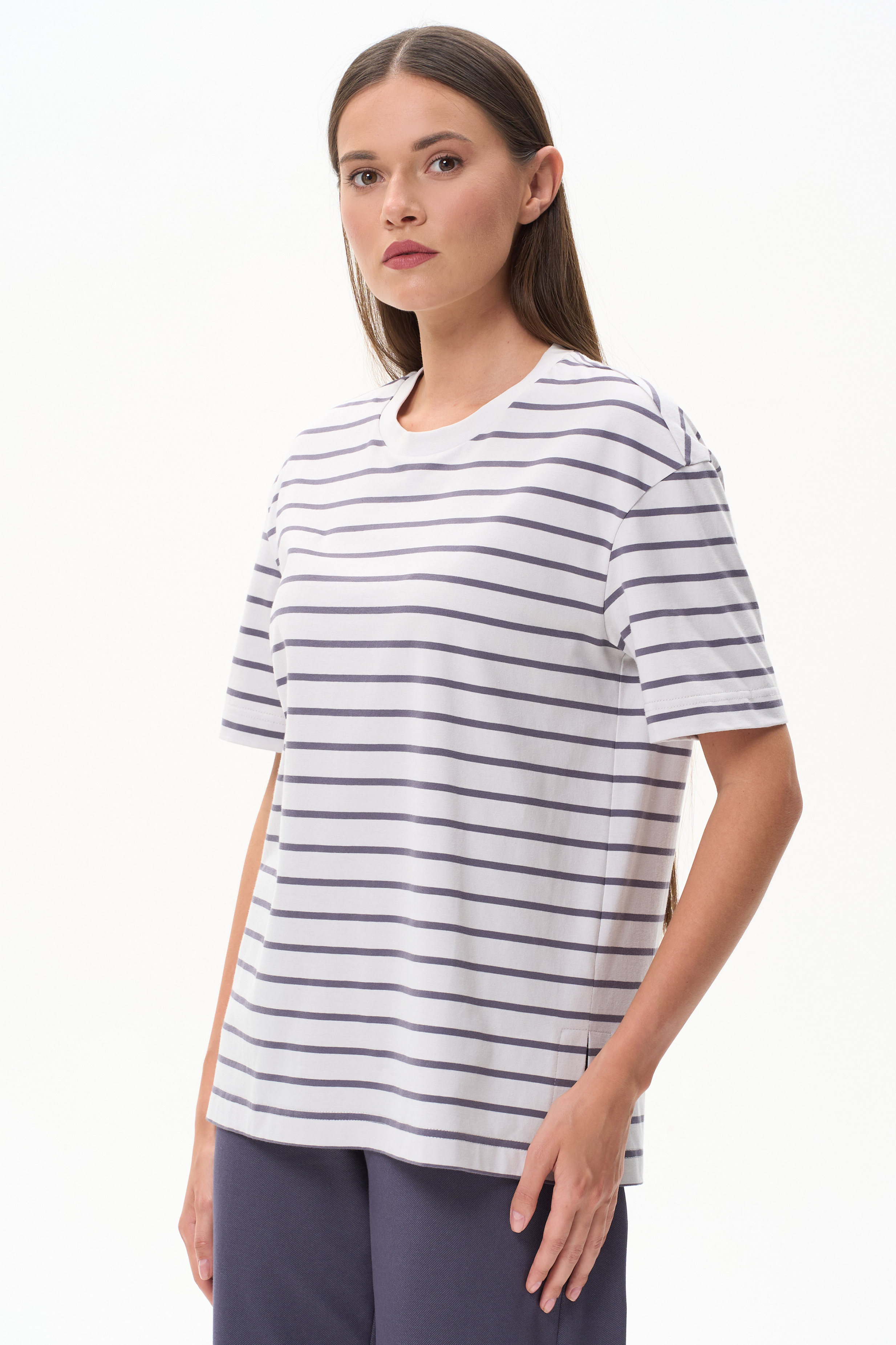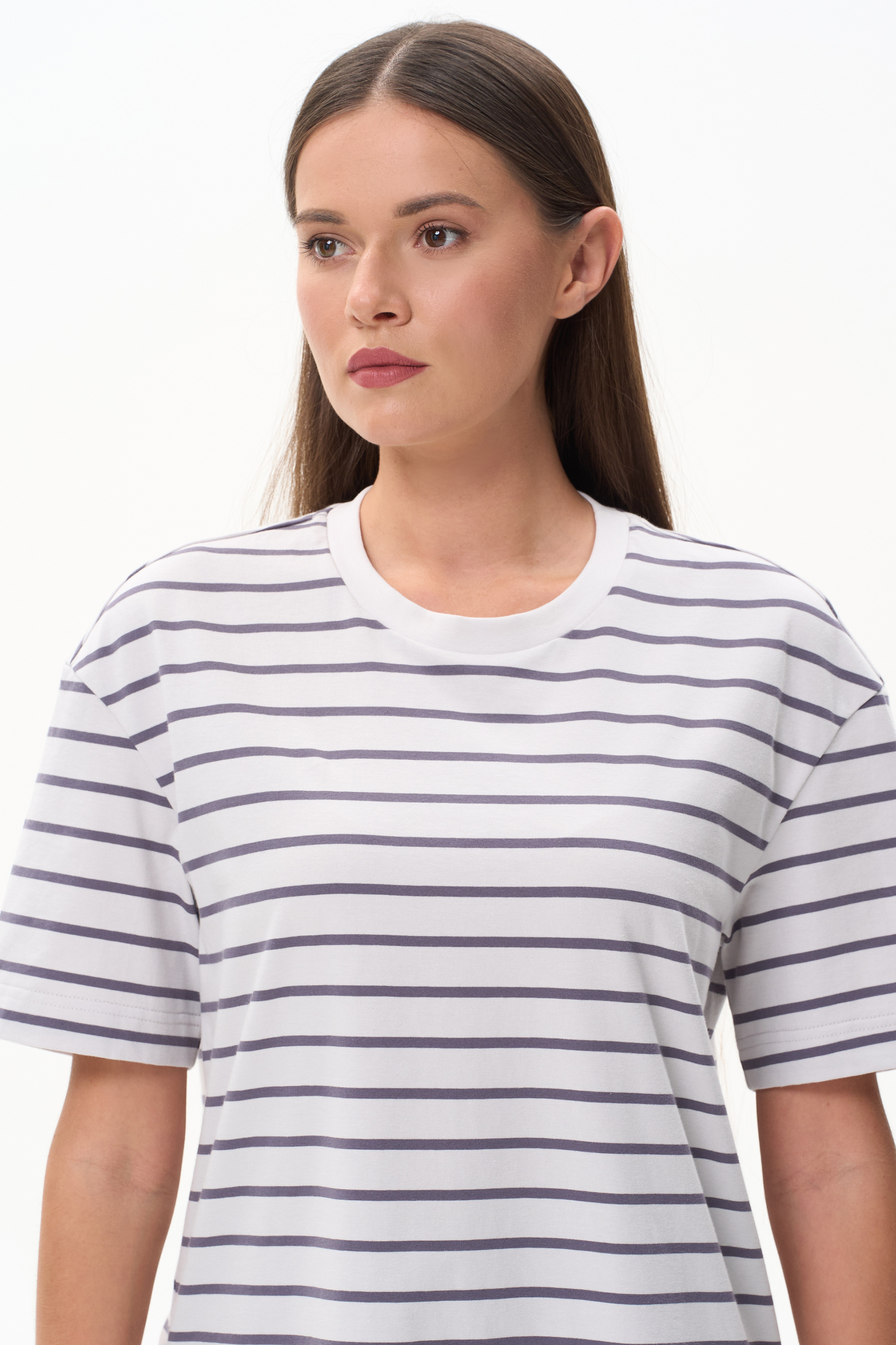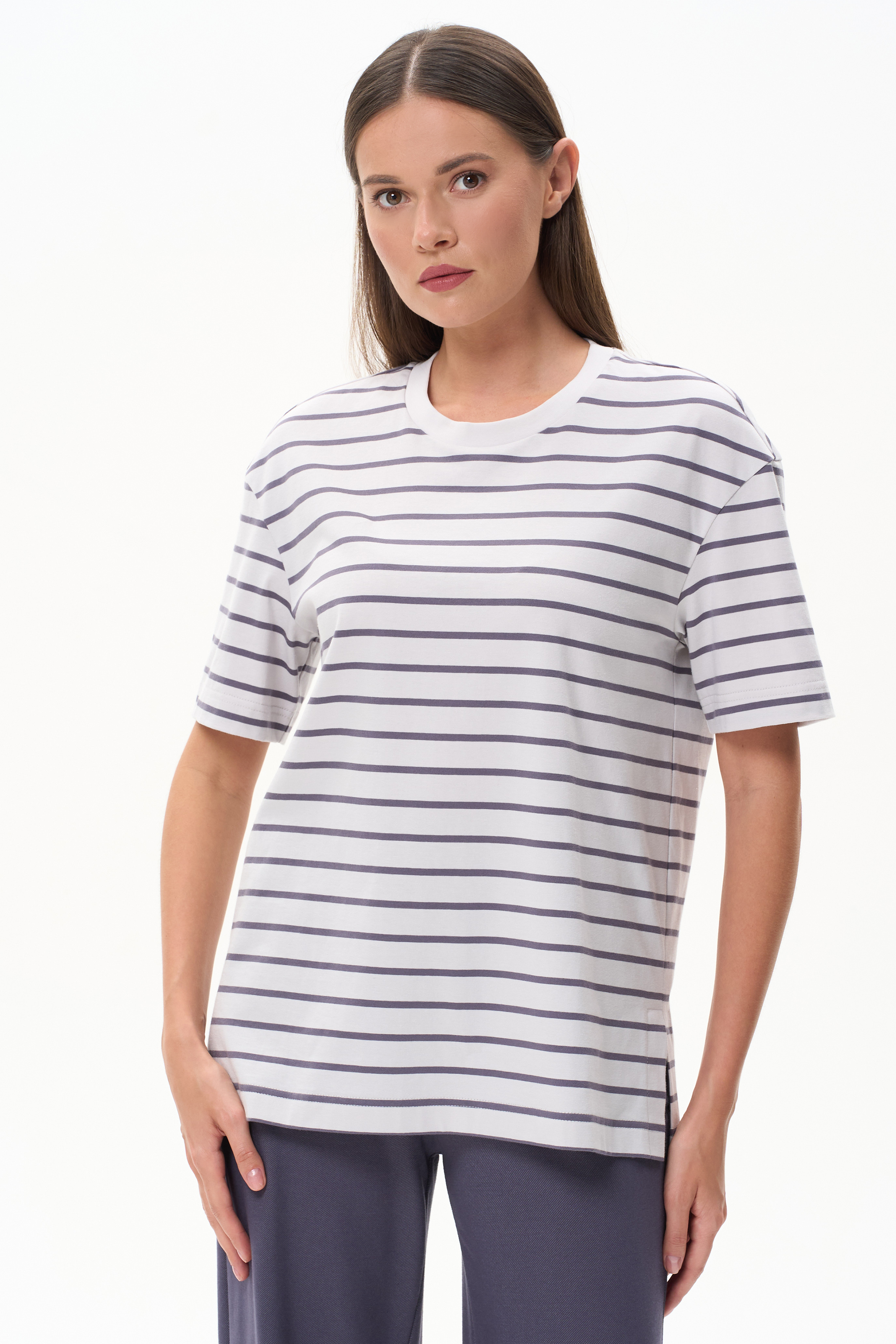 100% хлопок Повседневная базовая футболка в полоску из хлопкового полотна качества пенье 186 гр. Модель удлинённая, с круглым вырезом горловины и рукавами до локтя. Комфортная, универсальная модель в трендовых оттнеках: Жемчужный и Утренний туман. Рост модели 175 см.
