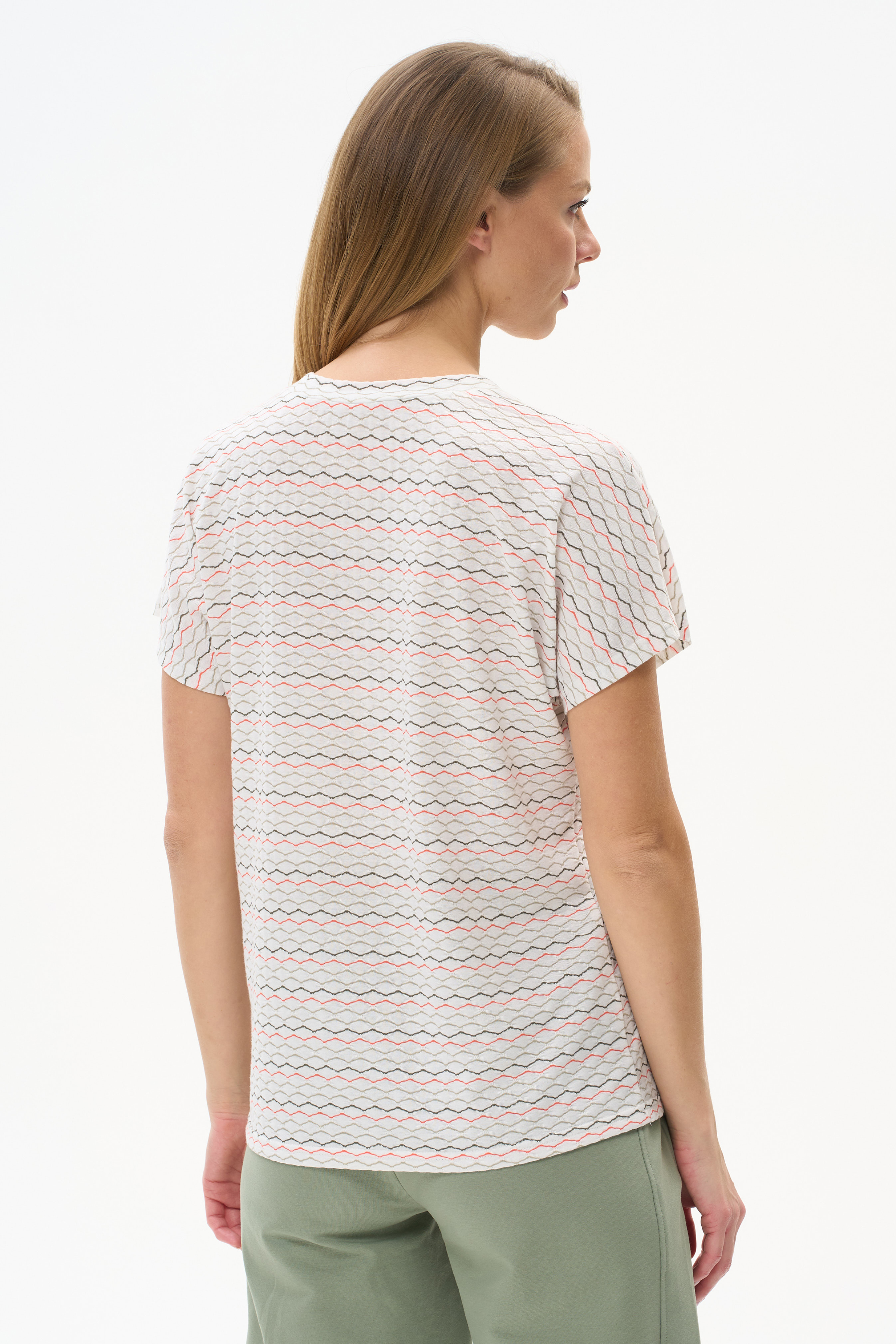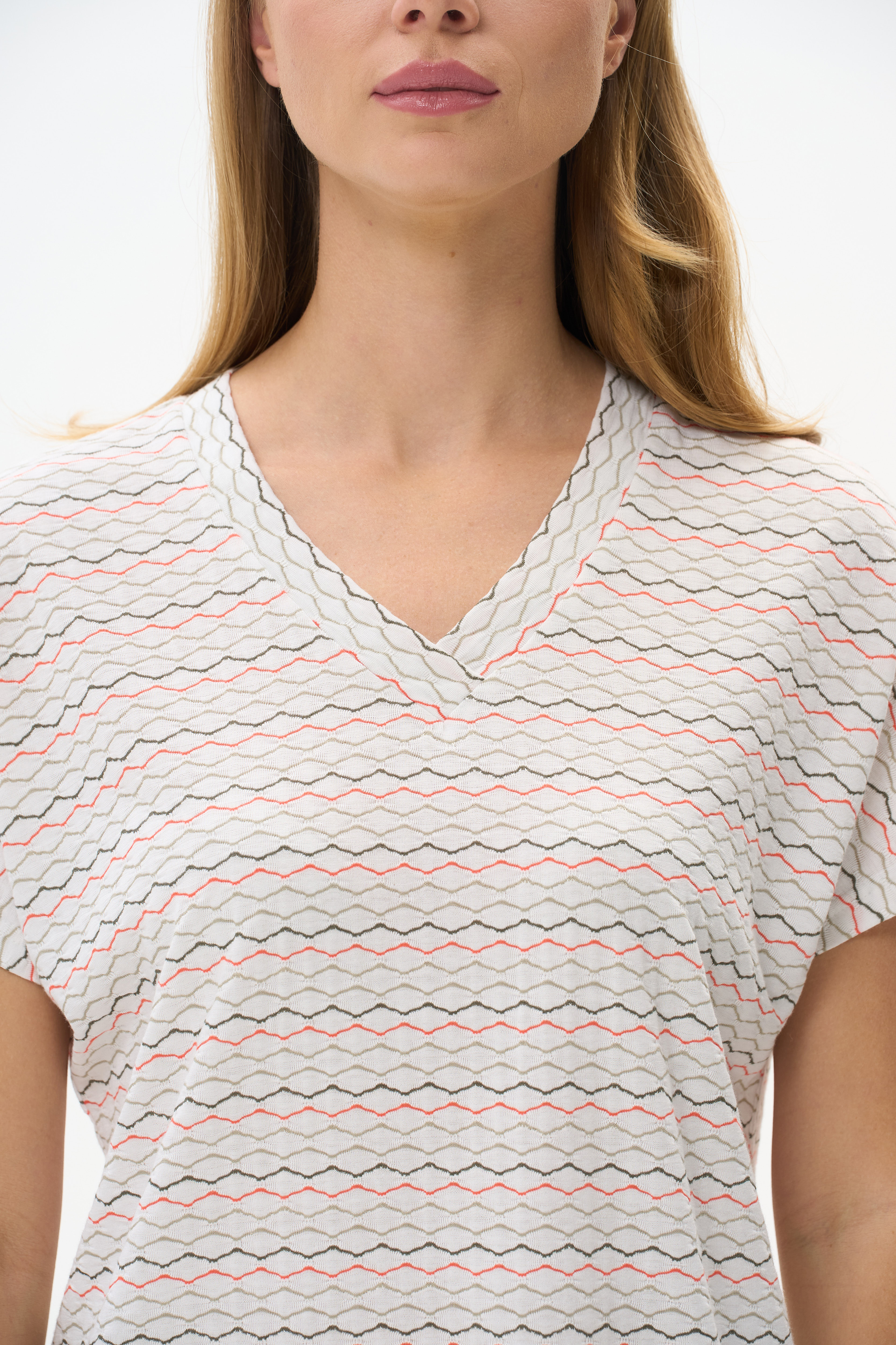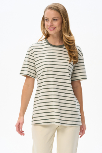 95% хлопок, 5% эластан Свободная футболка выполнена из хлопкового жаккардового трикотажного полотна с эластаном. V-образный вырез горловины, короткие цельнокроенные рукава. Рост модели на фото 178см.