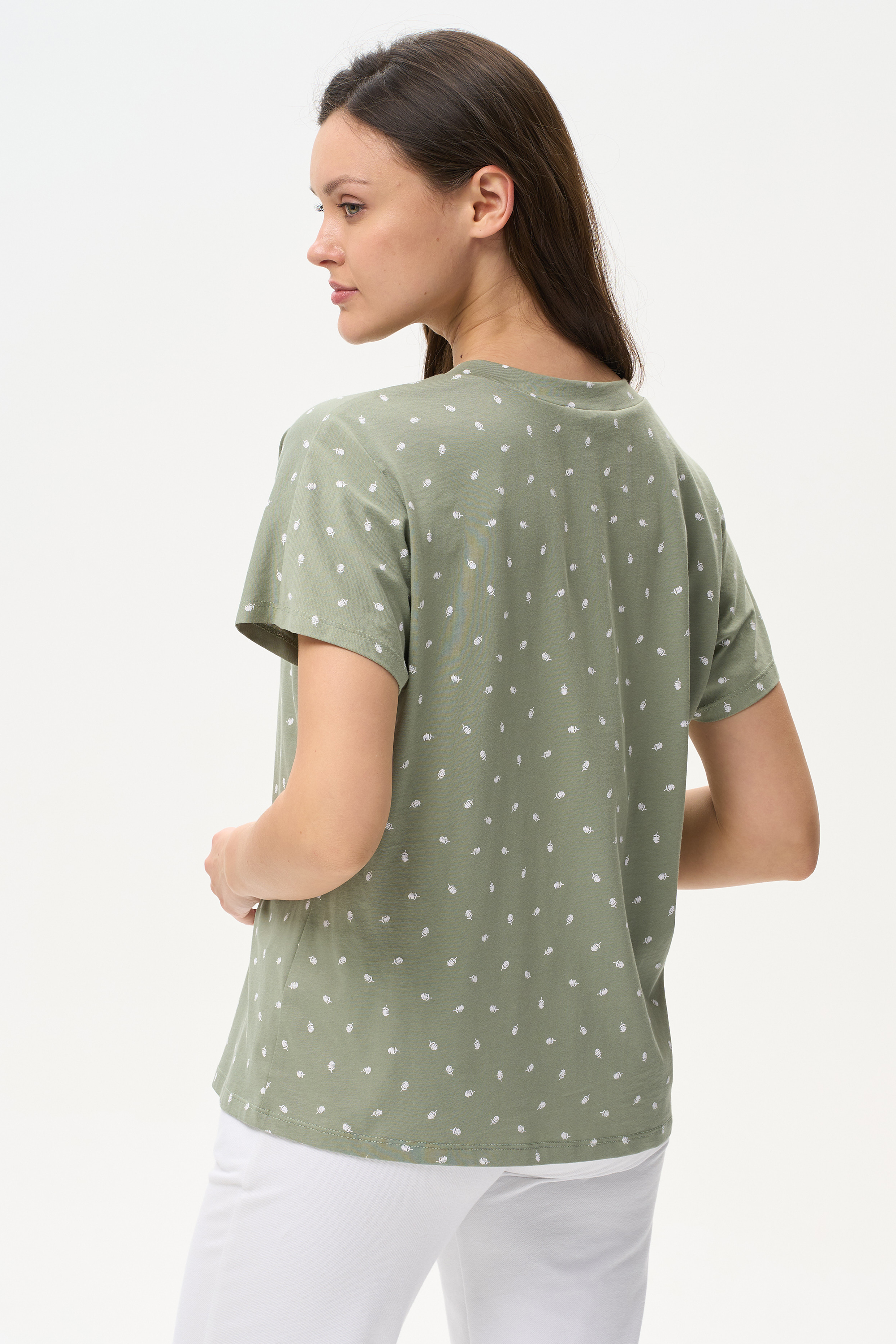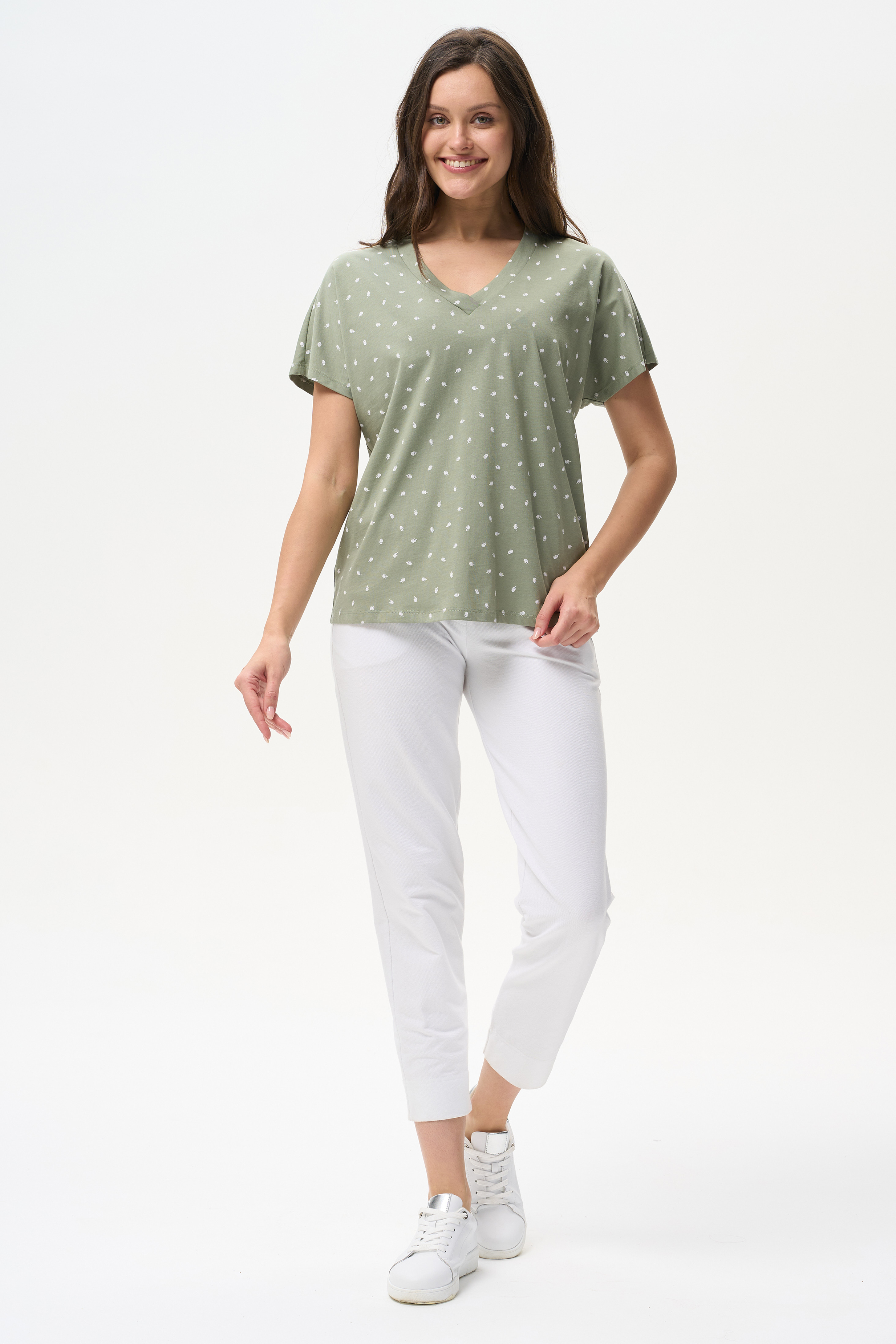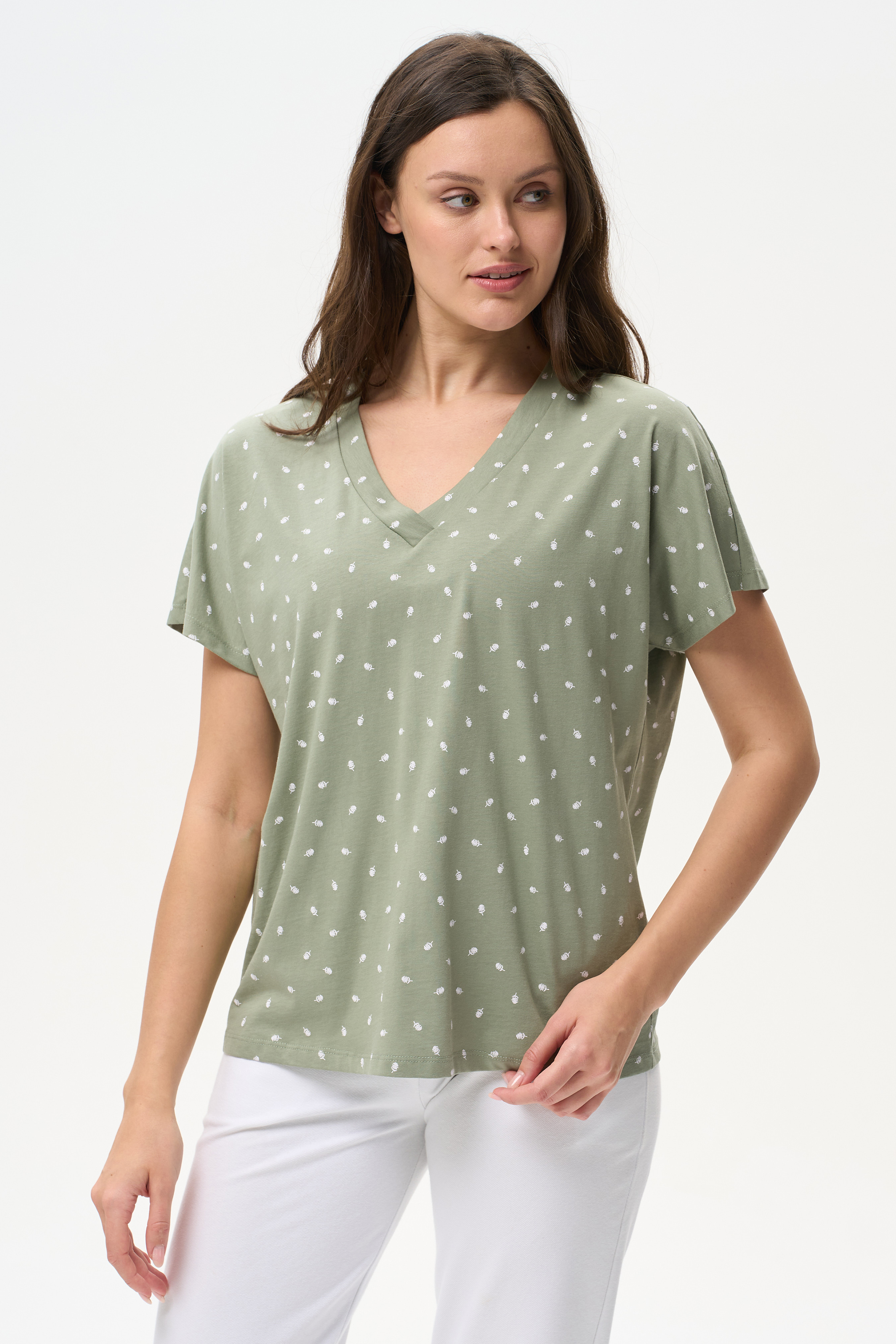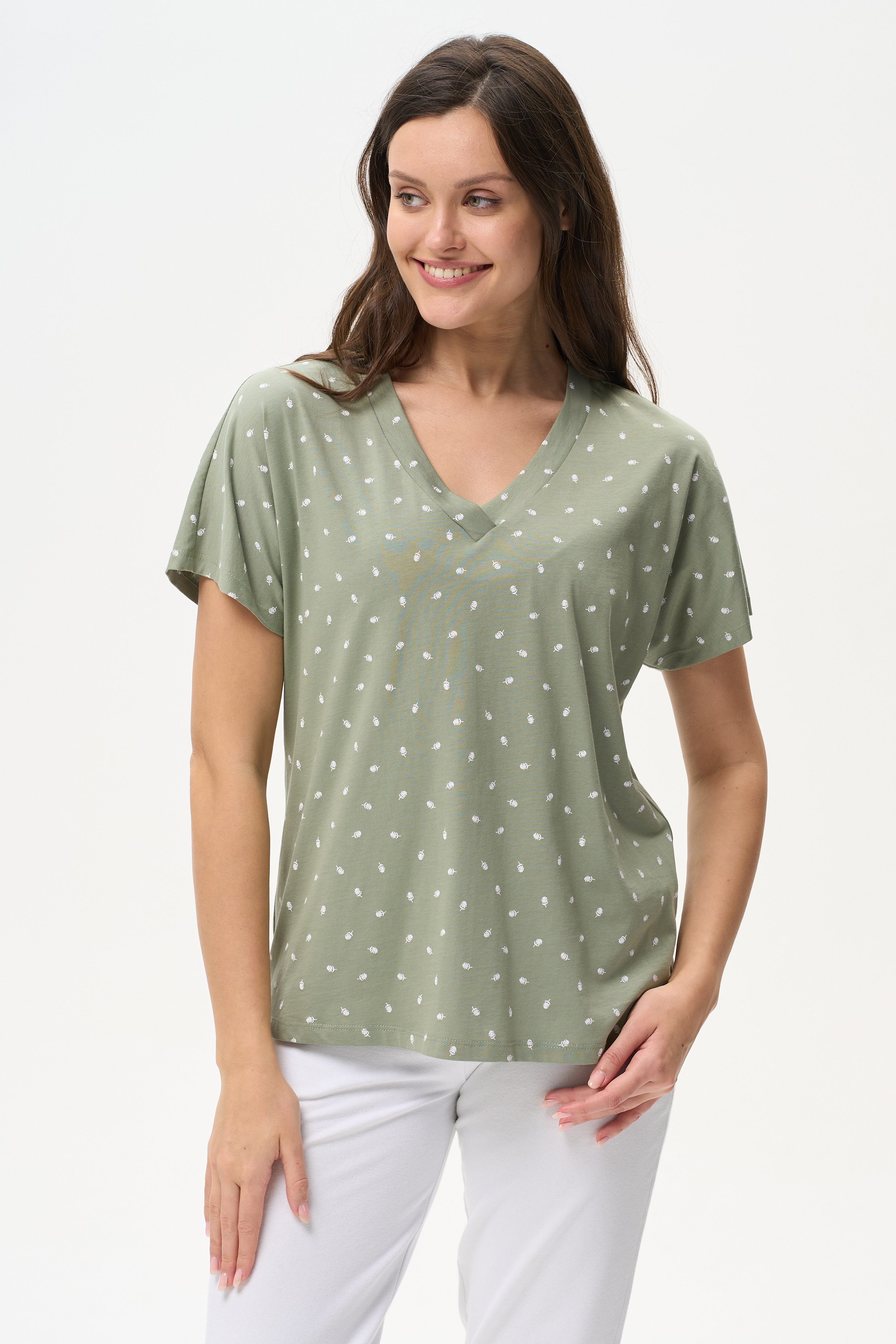100% хлопок Футболка из кулирки качества ПЕ 150 гр. Модель свободная, красивый V-образный вырез горловины оформлен планкой, спущенное плечо, короткие цельнокроенные рукава. Приятная, комфортная модель на жаркие дни, благодаря рисунку и силуэту выглядит женственно. Рост модели 175 см.