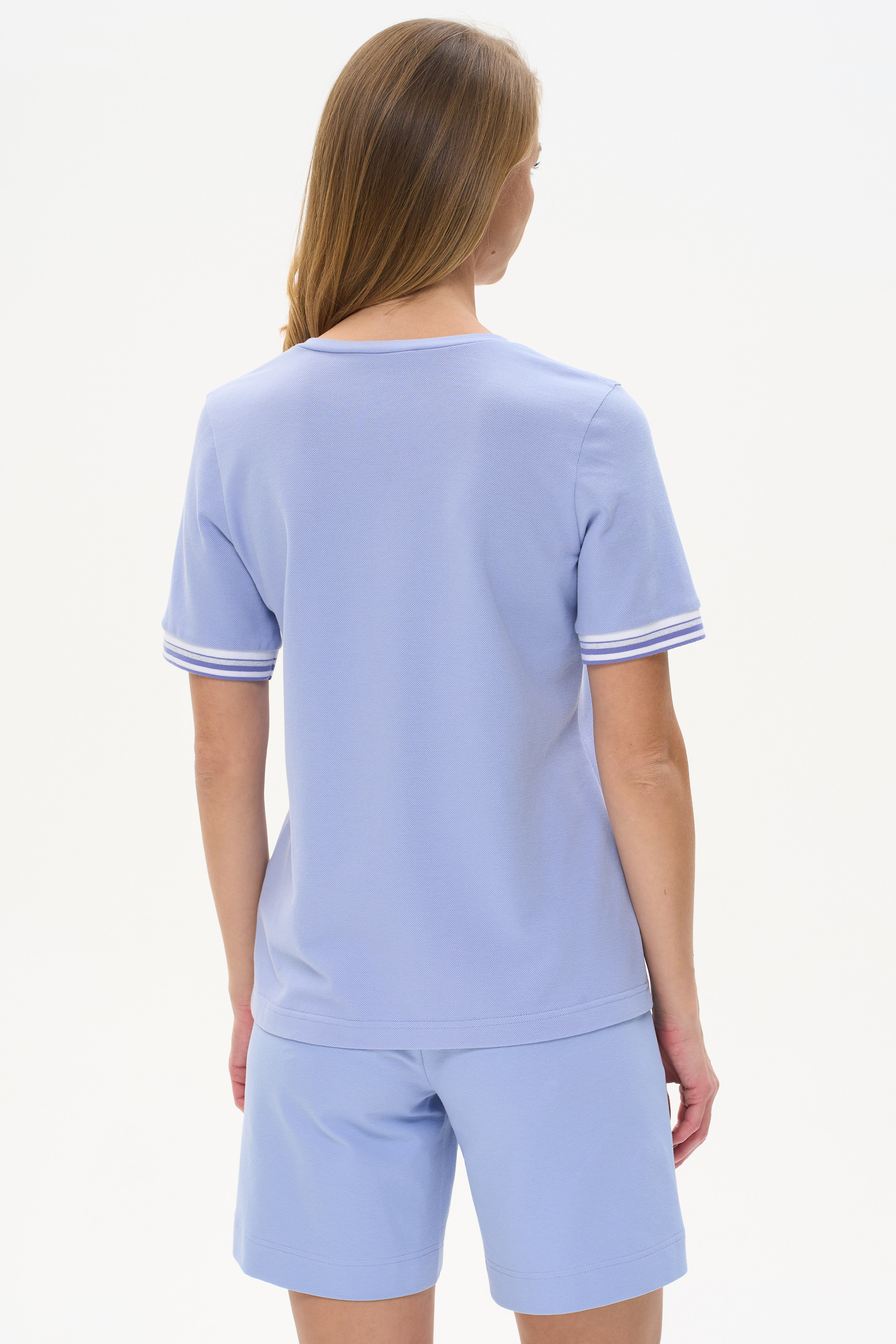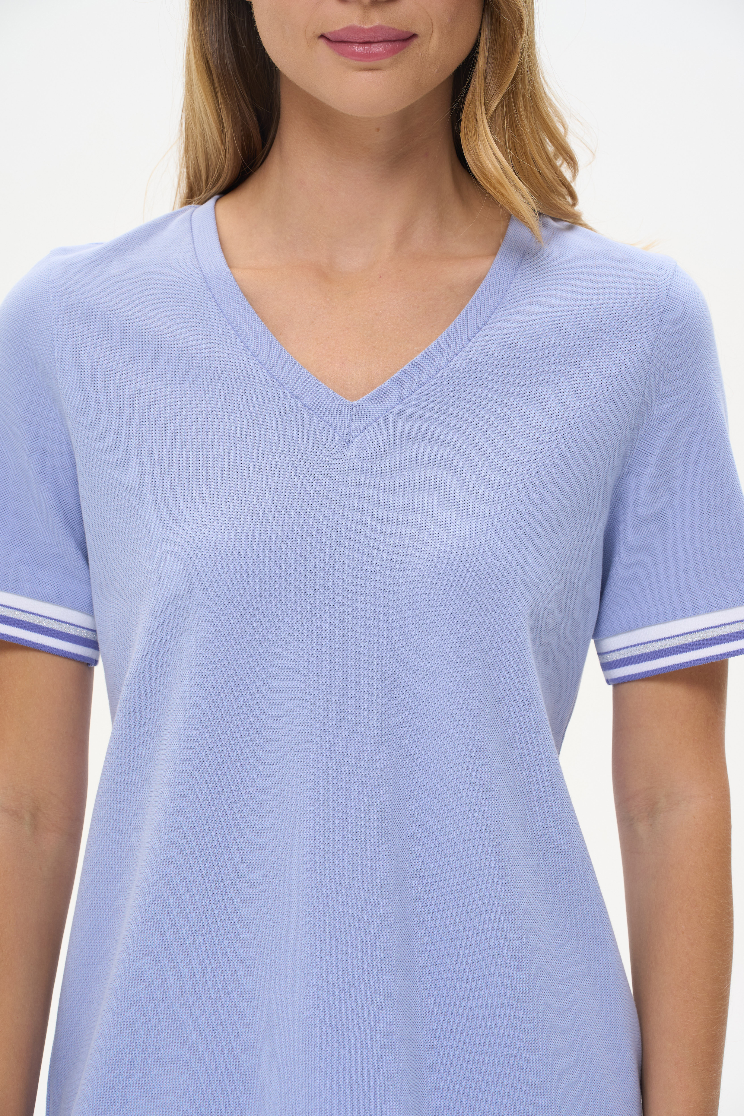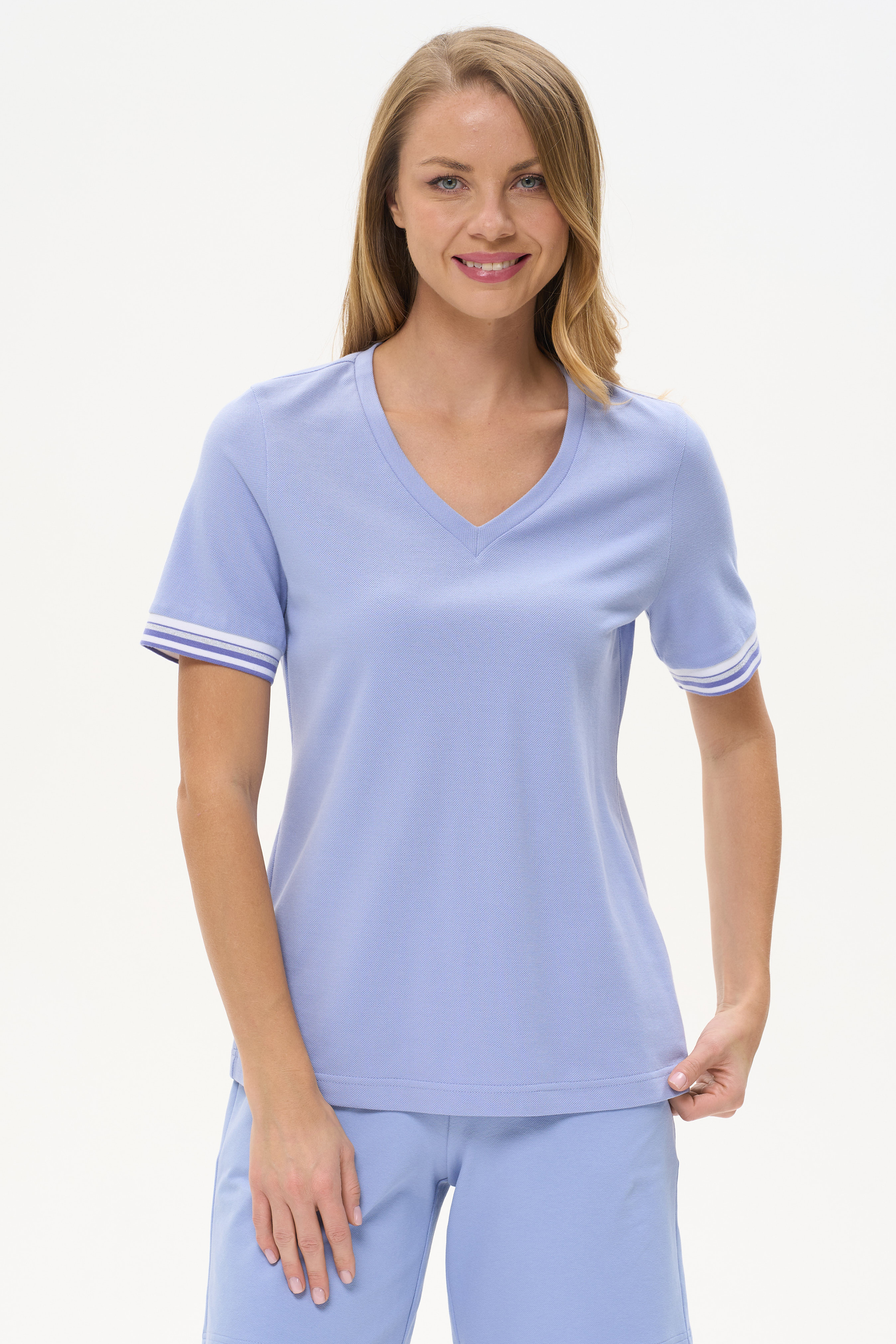 100% хлопок Футболка выполнена из хлопкового полотна - пике. V-образный вырез горловины, короткие рукава. Рост модели на фото 177см