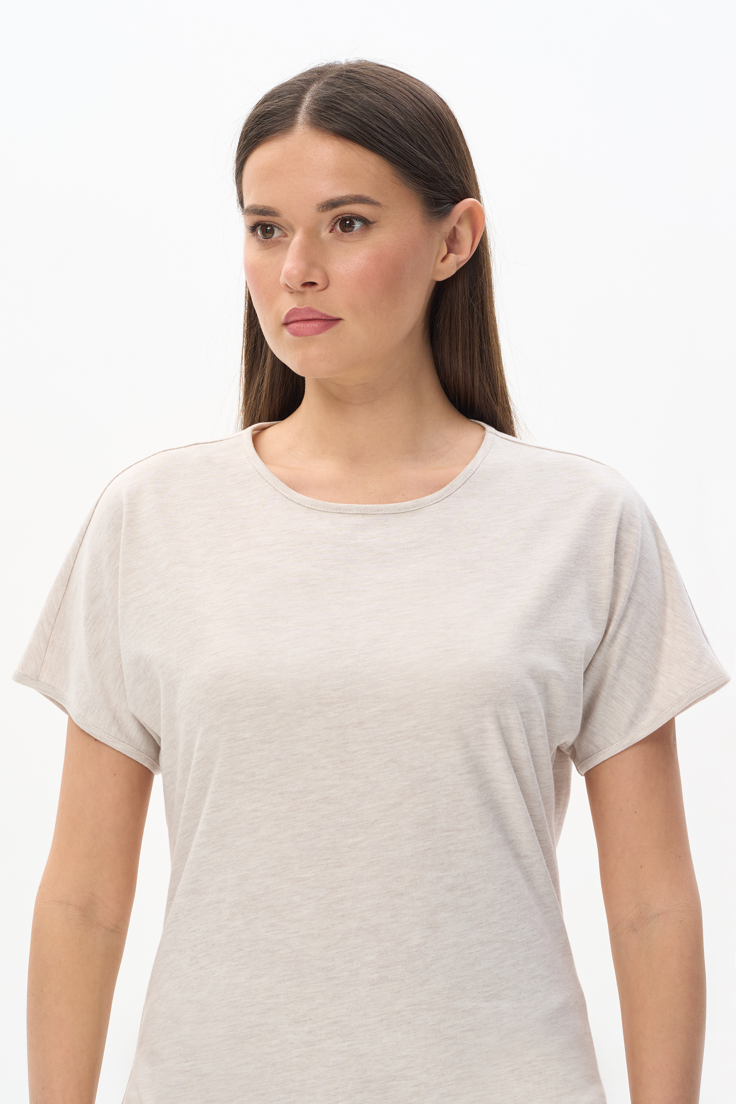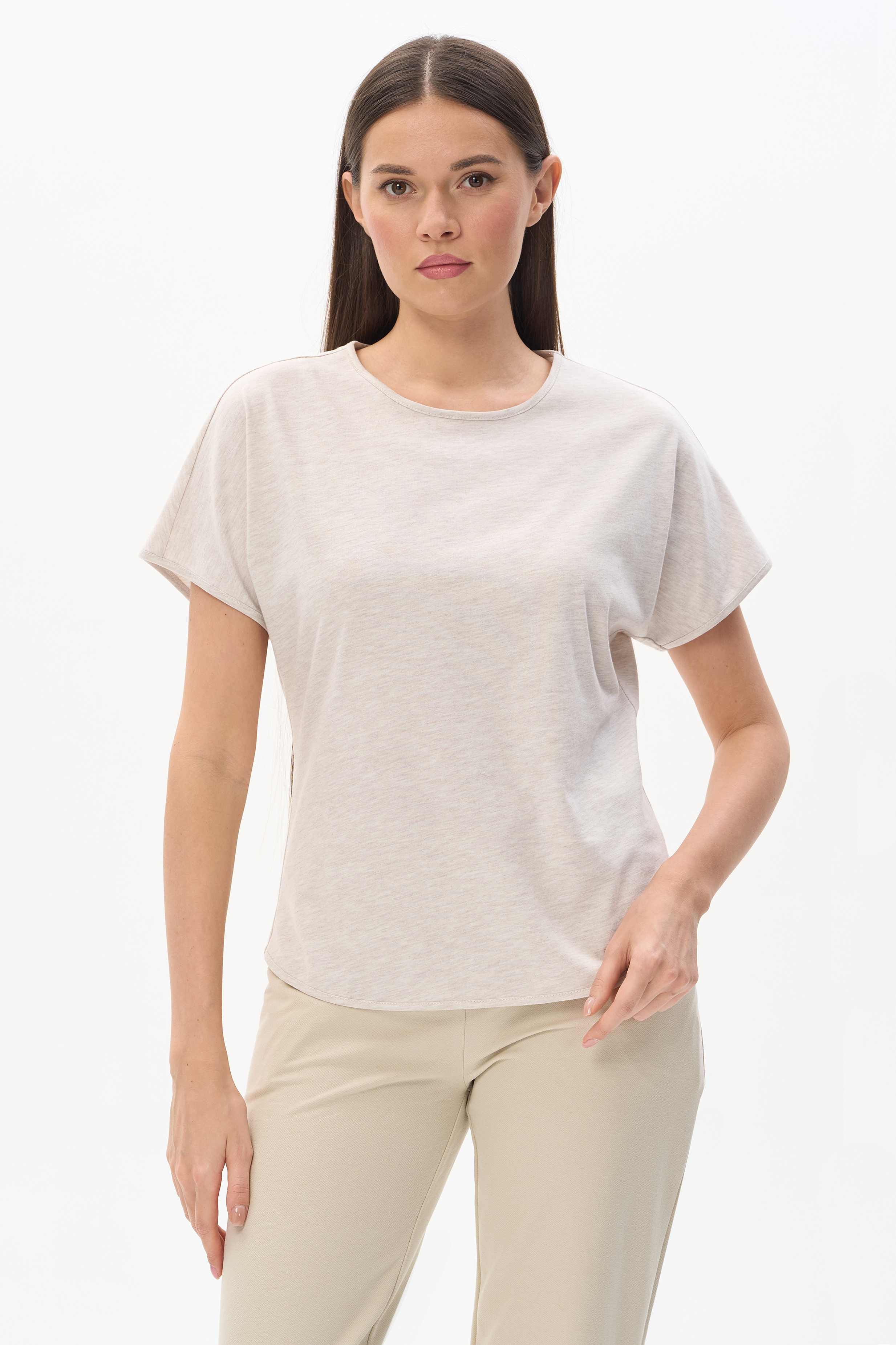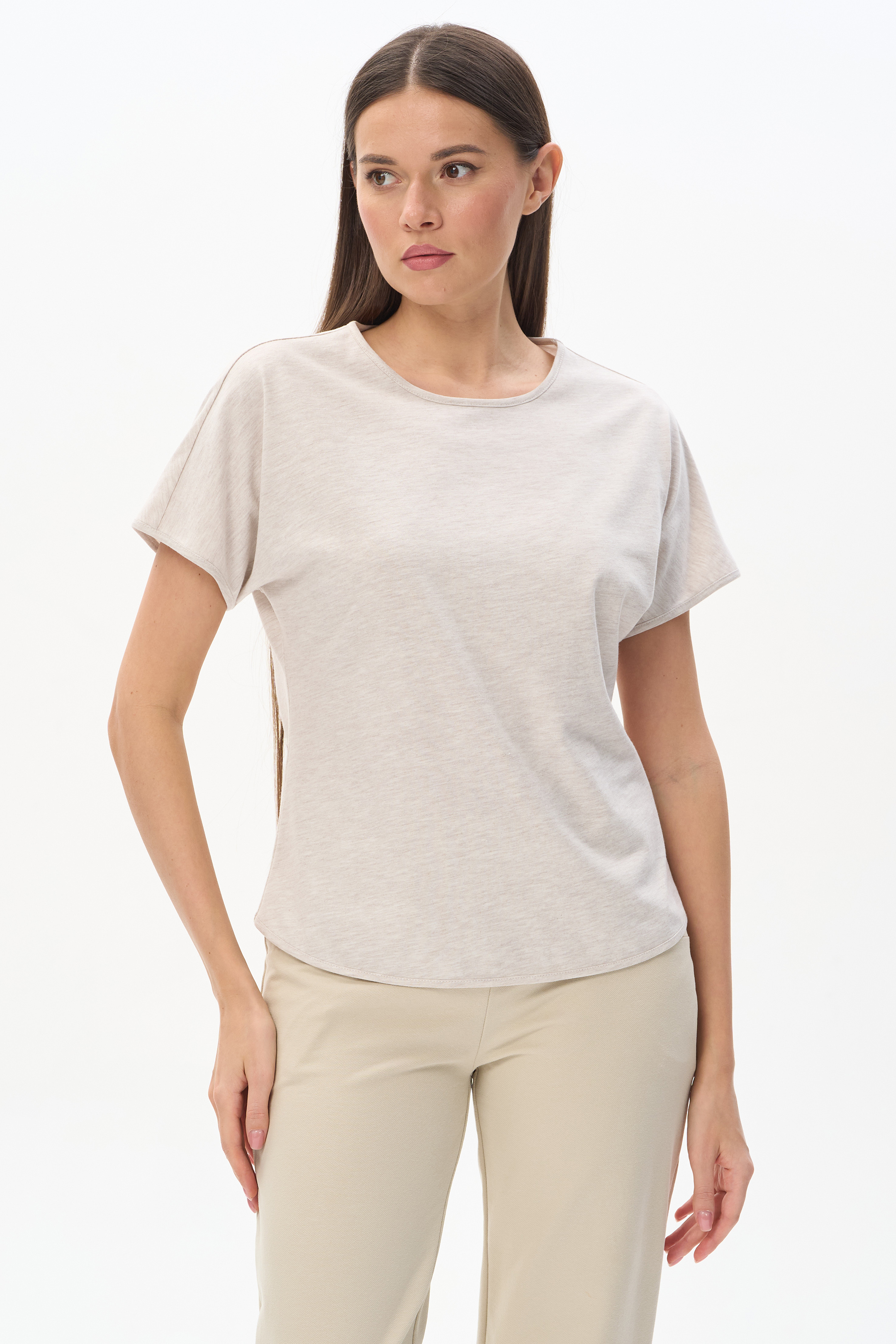 70% хлопок, 30% полиэстер Футболка из меланжевого полотна 150 гр в светло-бежевом оттенке. Модель модного силуэта, свободная, приталенная, спущенная линия плеча, цельнокроеные короткие рукава, круглая горловина обработана тонкой бейкой, закруглённая линия низа. Комфортная, универсальная модель для городских образов, отдыха и путешествий. Отличный компаньон к брюкам-алладинам из того же полотна. Рост модели 175 см.