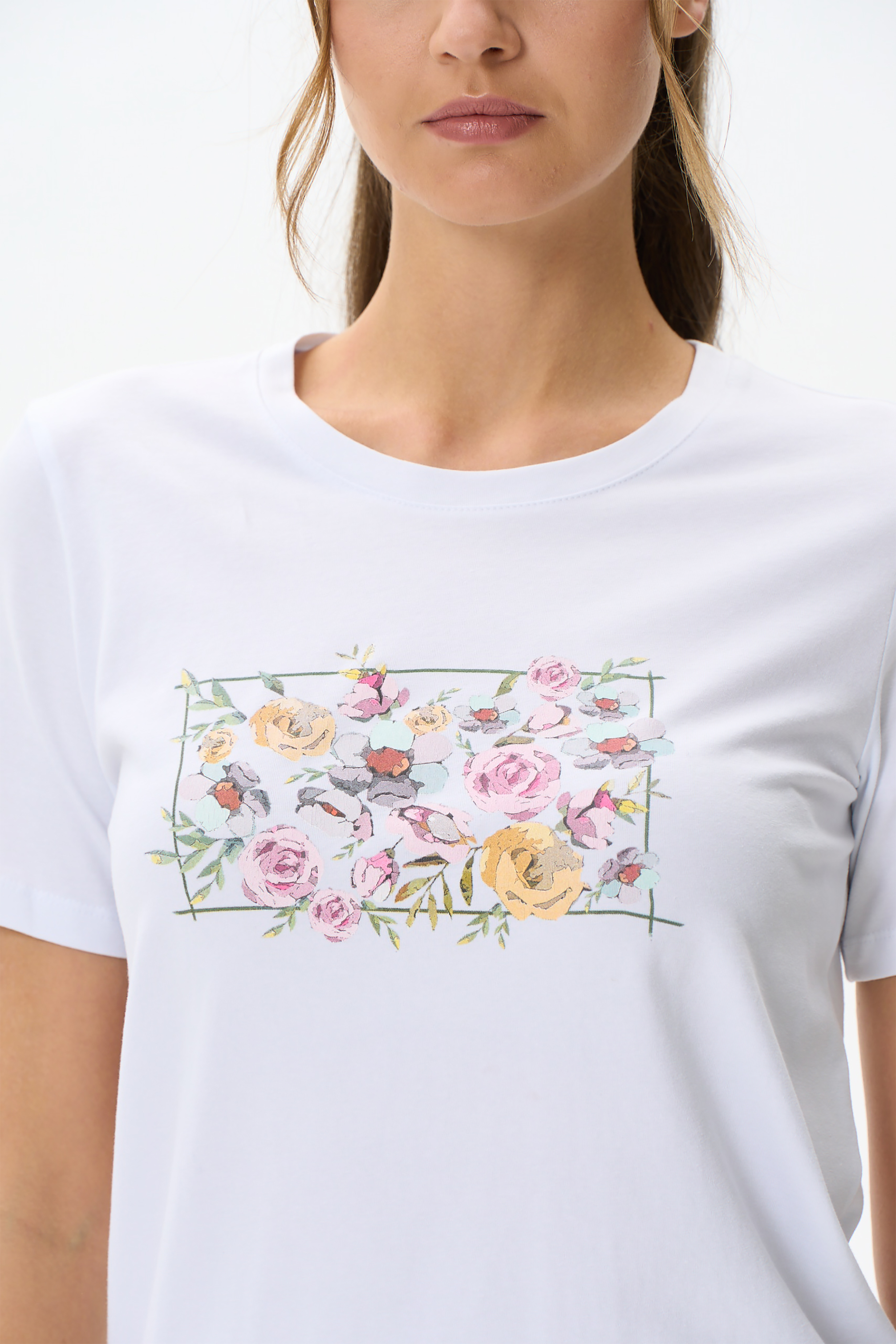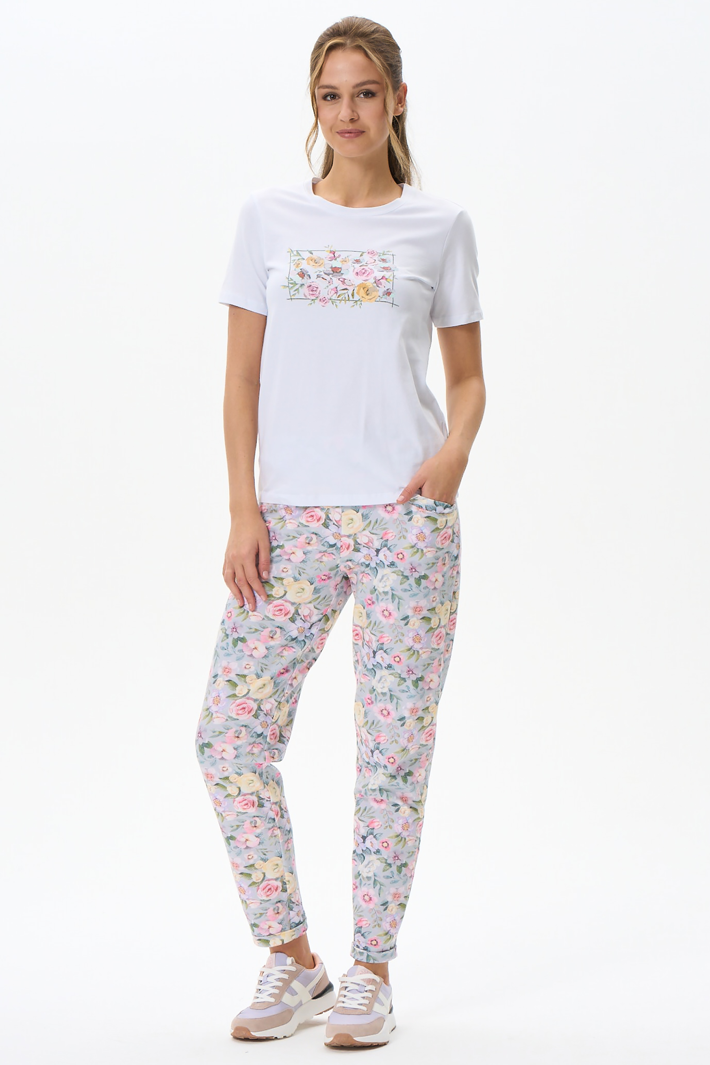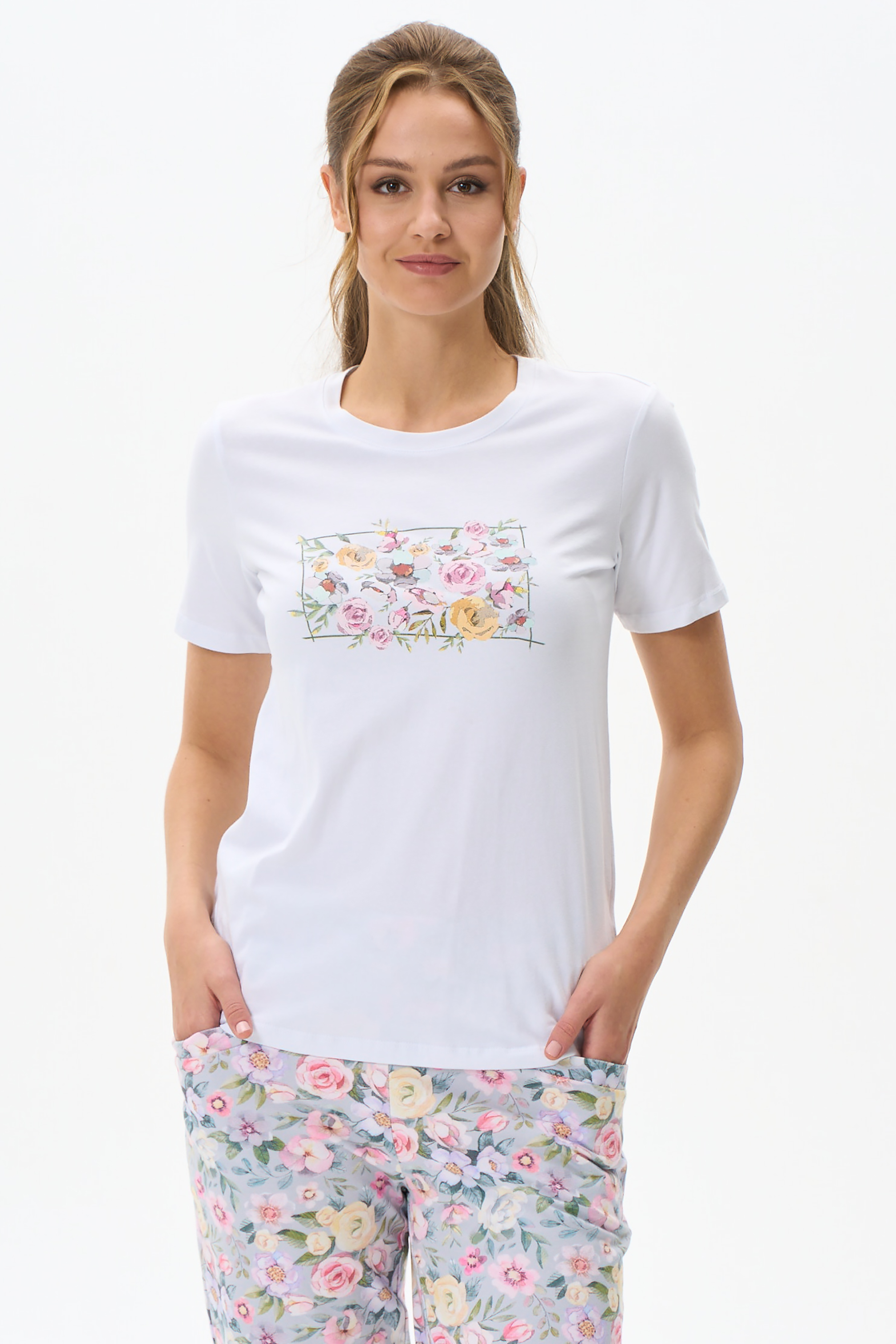 92% хлопок, 8% эластан Футболка с ярким принтом, втачным коротким рукавом выполнена из хлопкового трикотажного полотна с эластаном, качества пенье. Круглый вырез горловины. Рост модели 175 см.