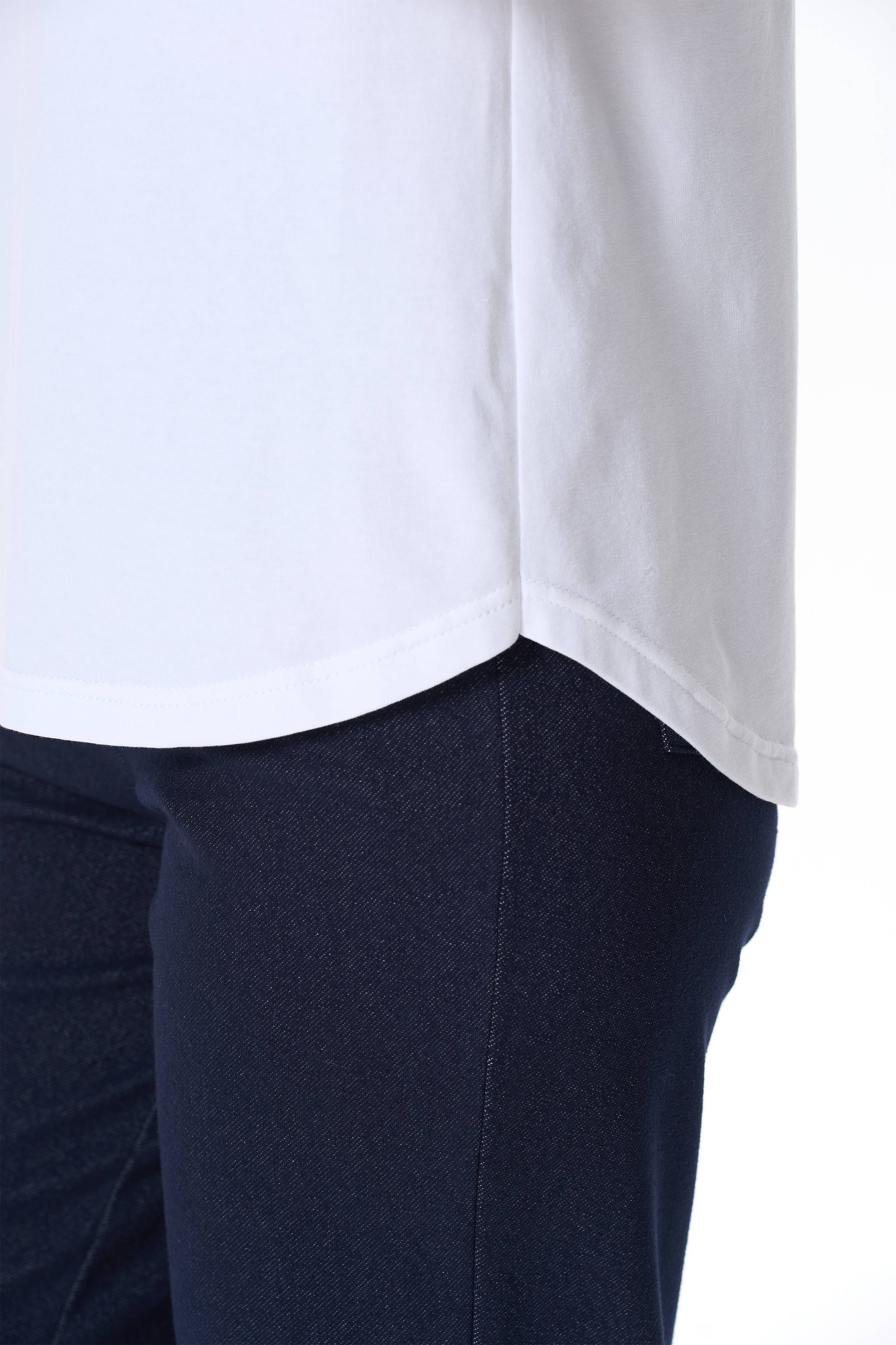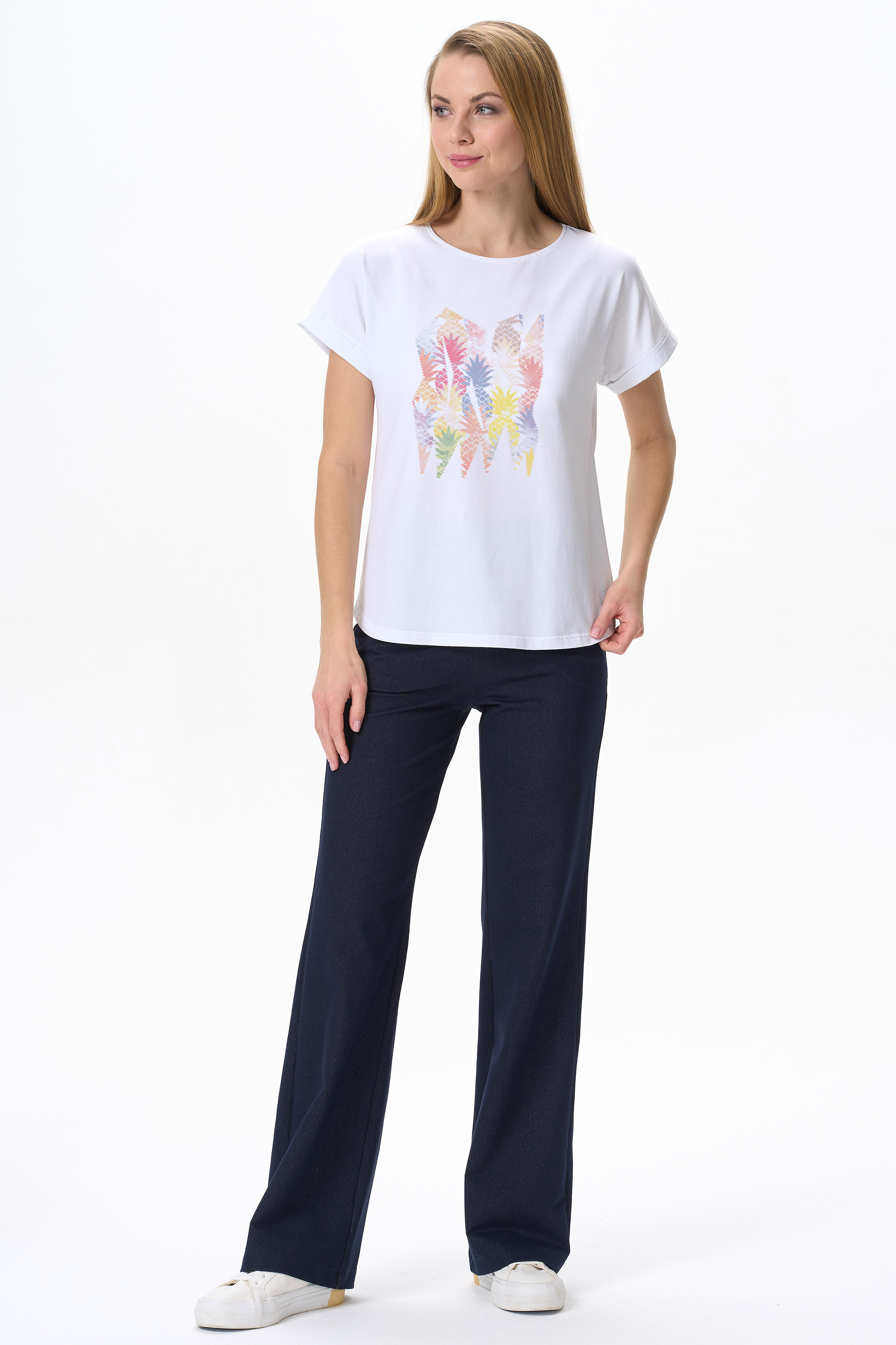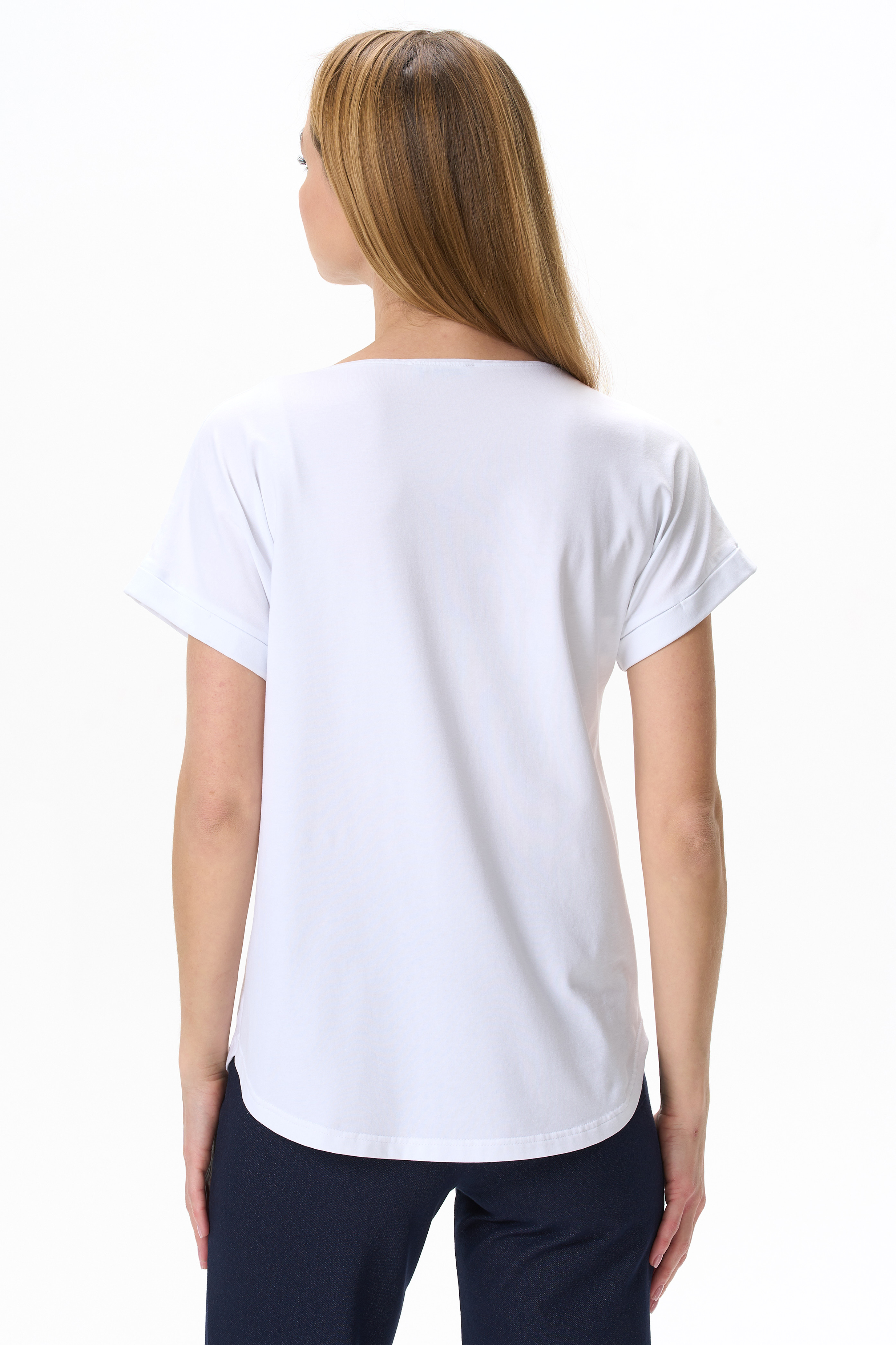 92% хлопок, 8% эластан Футболка с принтом из хлопкового полотна с эластаном. Круглый вырез горловины, цельнокроеные короткие рукава с отворотами, фигурная линия низа. Рост модели на фото 178см.