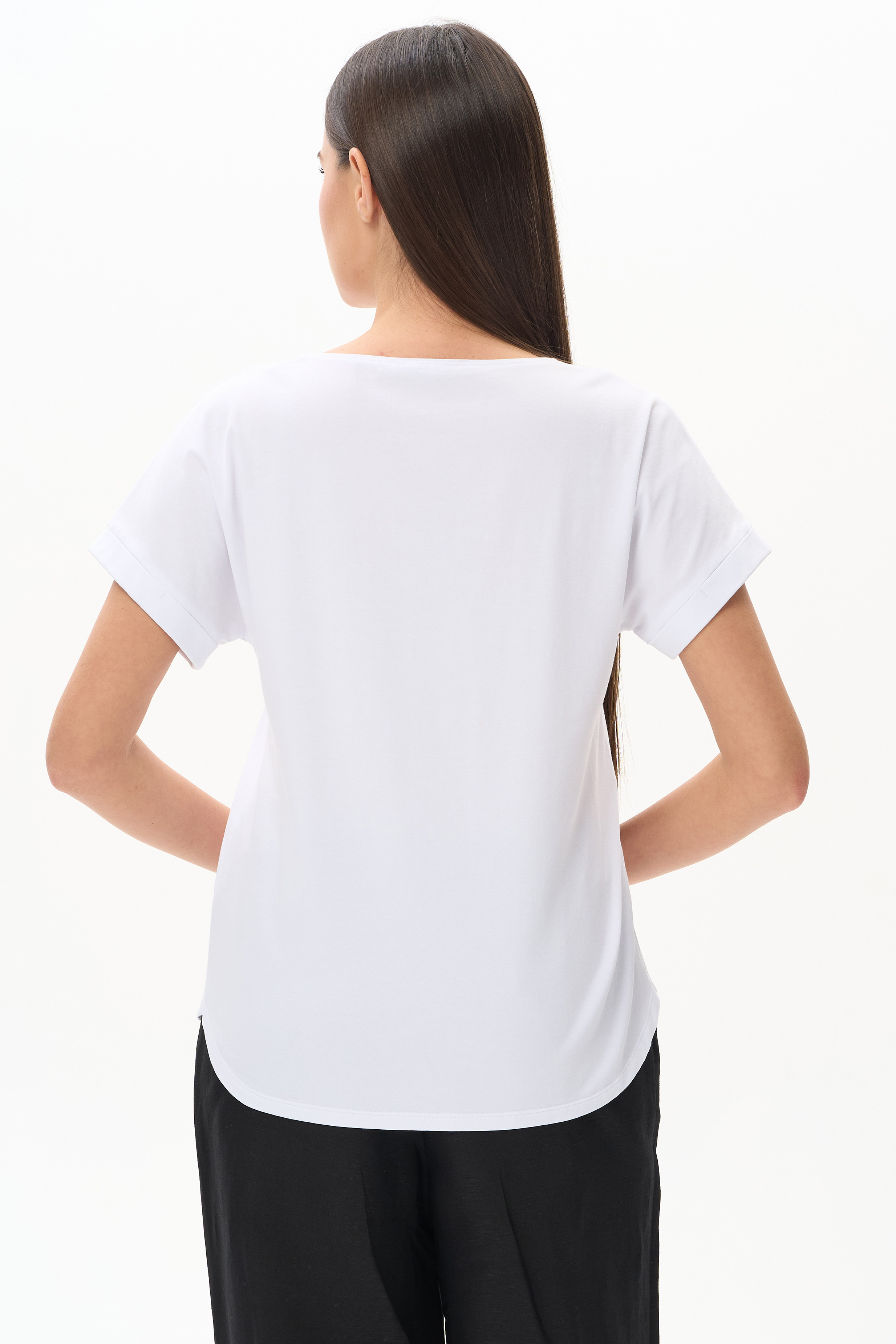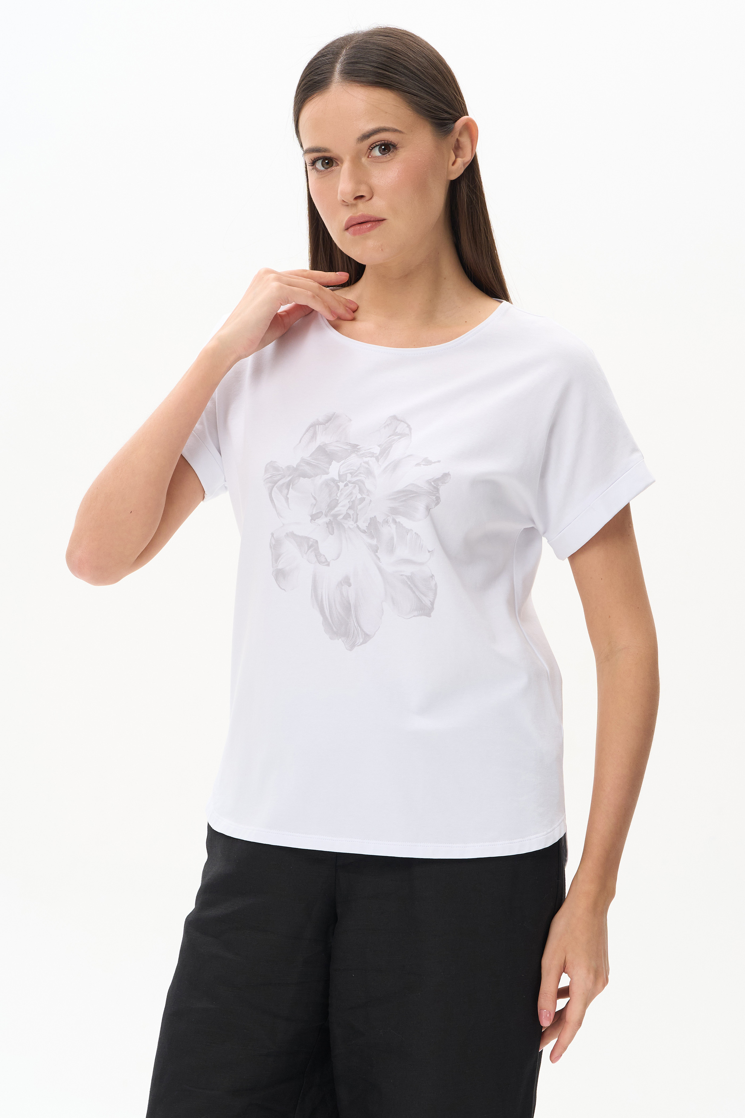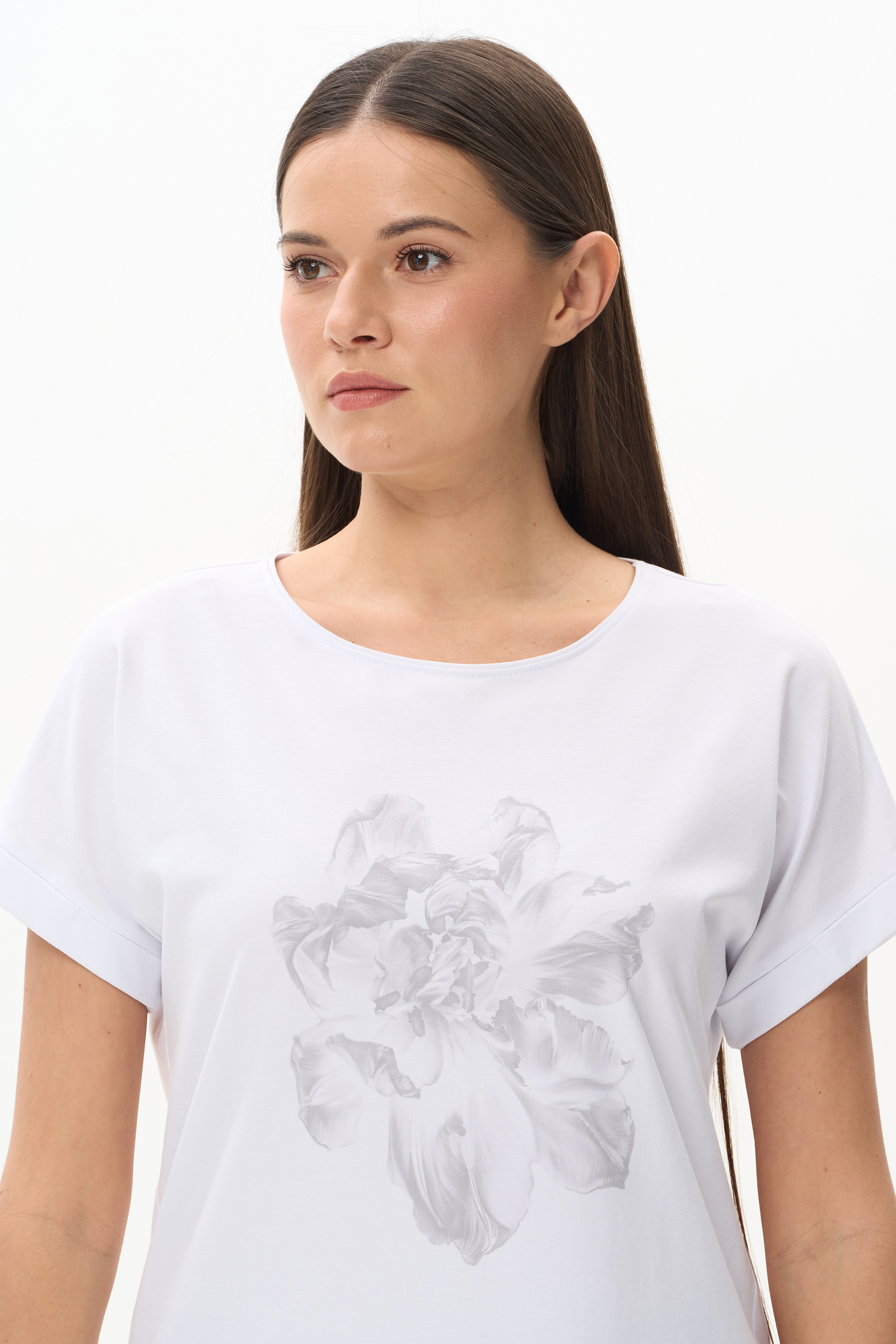 92% хлопок, 8% эластан Белая футболка из кулирки с эластаном качества ПЕ 165 гр. Модель с круглым вырезом горловины, цельнокроеными короткими рукавами с зафиксированным подворотом, фигурная линия низа. Принт - Крупный пастельный графичный цветок позволяет сочетать футболку с любыми брюками коллекции и уместна в любой ситуации. Рост модели 175 см.