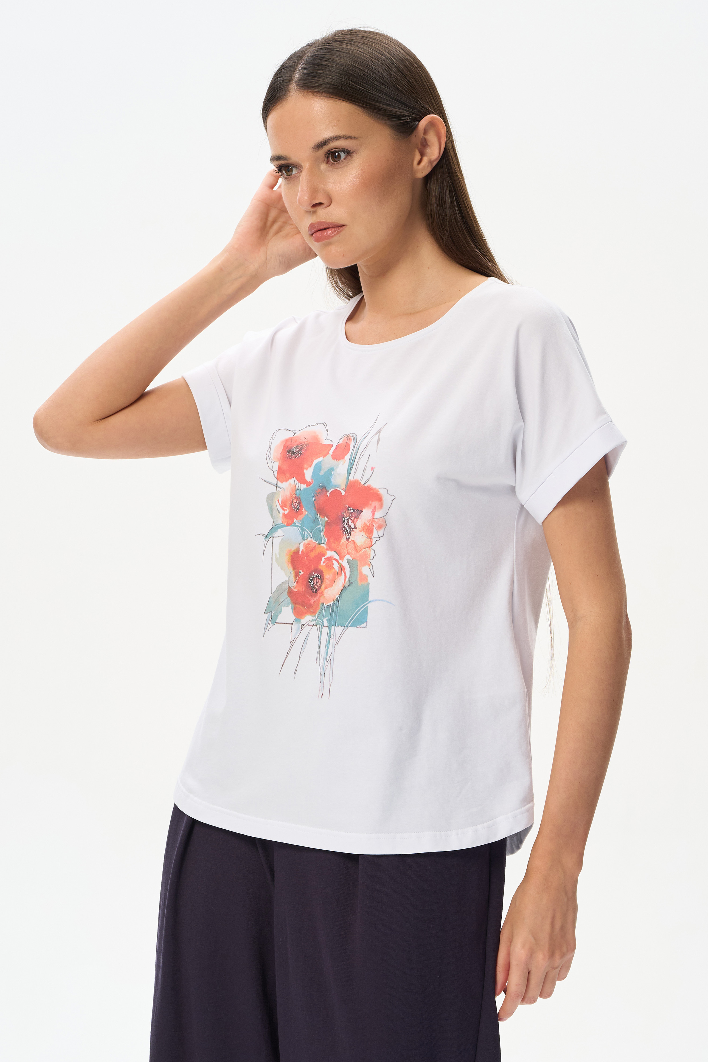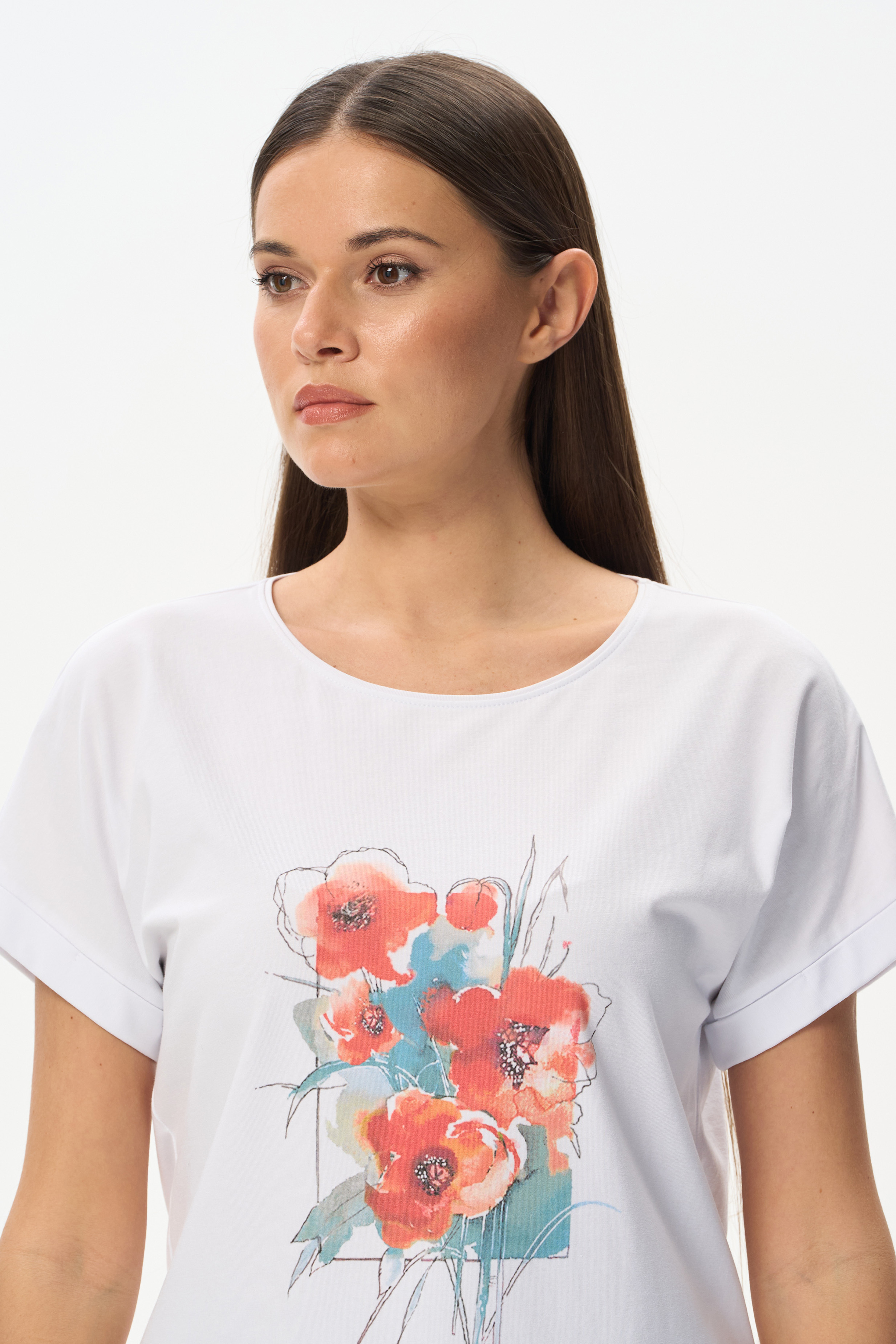 92% хлопок, 8% эластан Белая футболка из кулирки с эластаном качества ПЕ 165 гр. Модель с круглым вырезом горловины, цельнокроеными короткими рукавами с зафиксированным подворотом, фигурная линия низа. Принт - прекрасные красные маки. Благодаря такой печати модель выглядит особенно ярко и эффектно и сделает ваш образ нарядным. Рост модели 175 см.