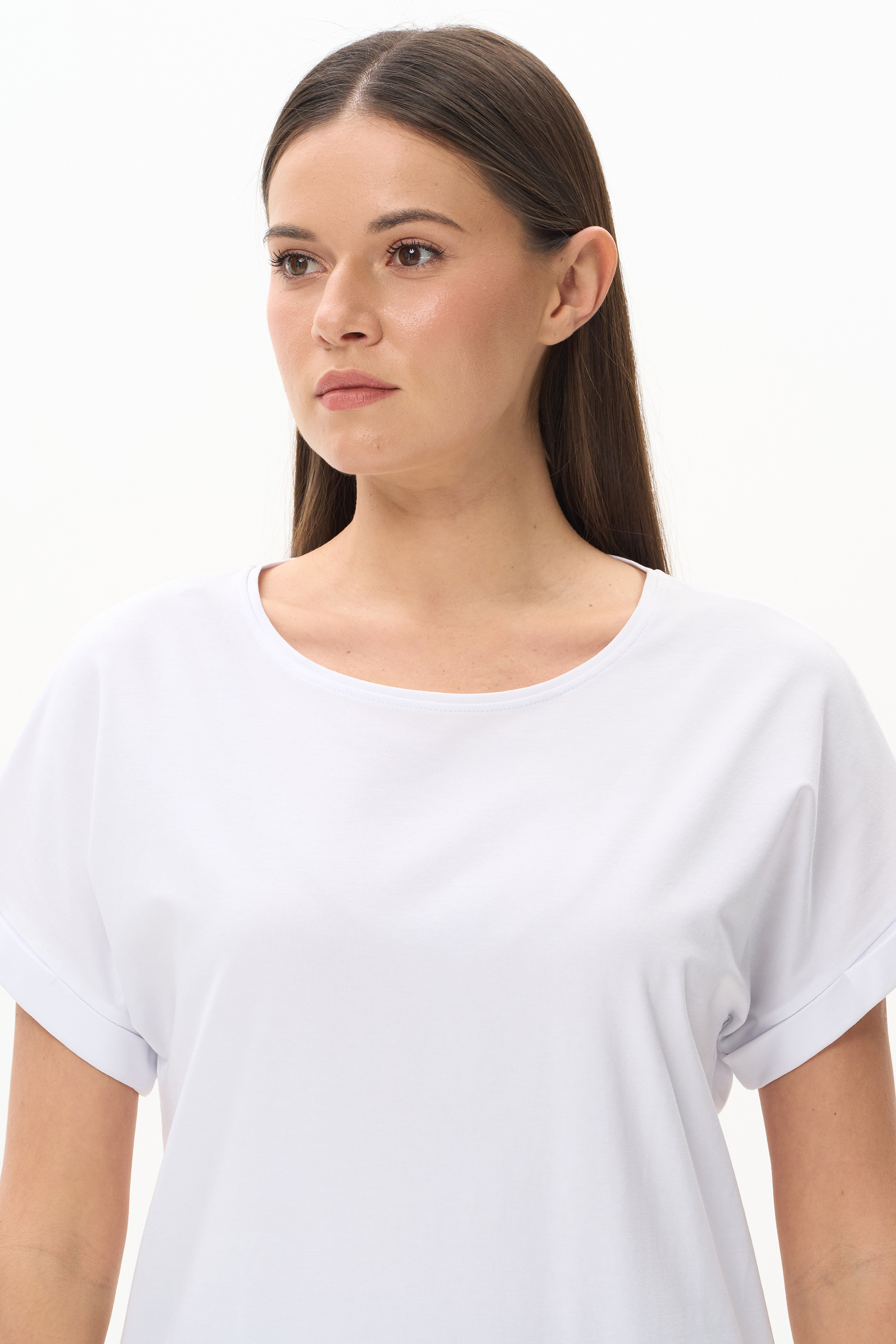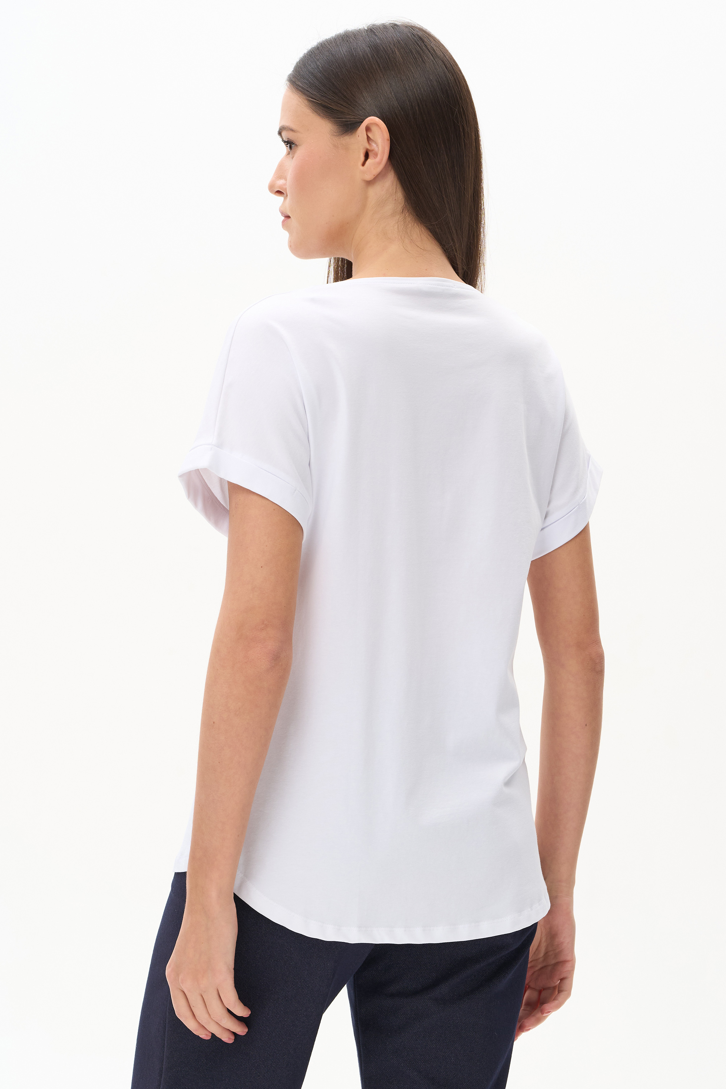 92% хлопок, 8% эластан Футболка из хлопкового полотна с эластаном. Круглый вырез горловины, цельнокроеные короткие рукава с отворотами, фигурная линия низа. Рост модели на фото 175 см.