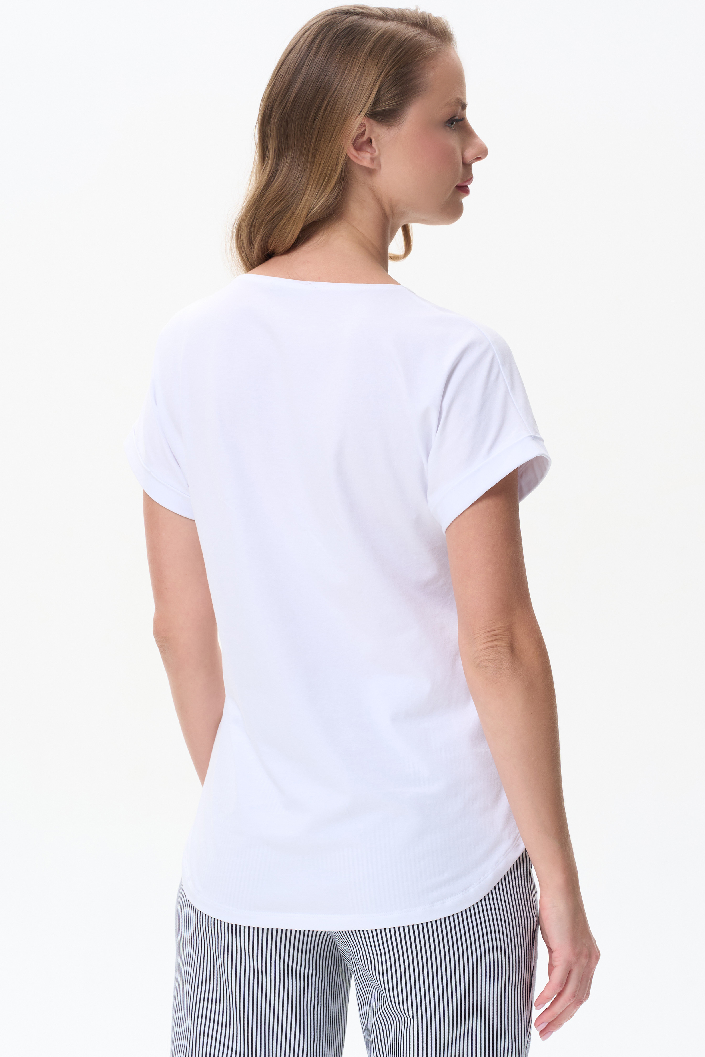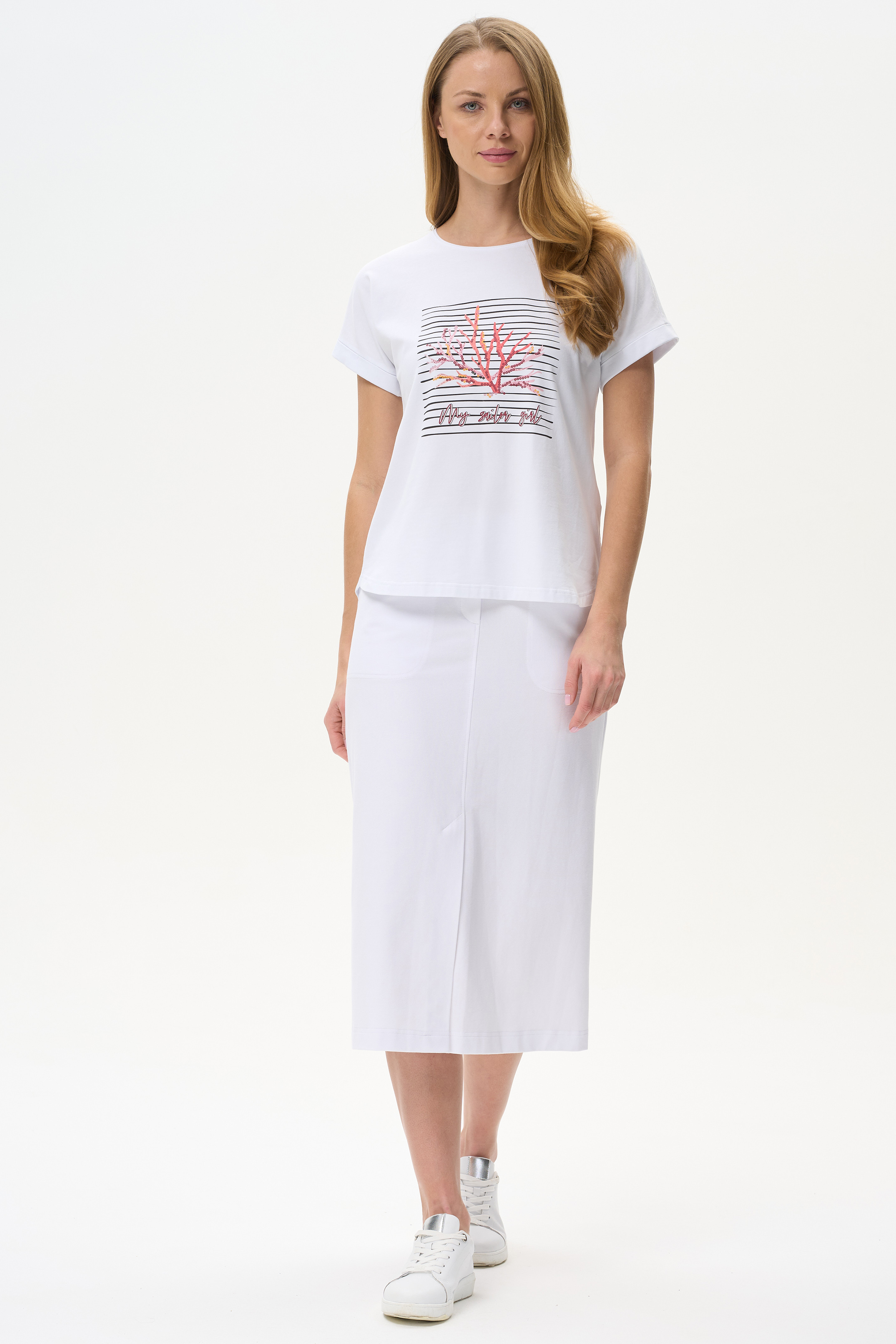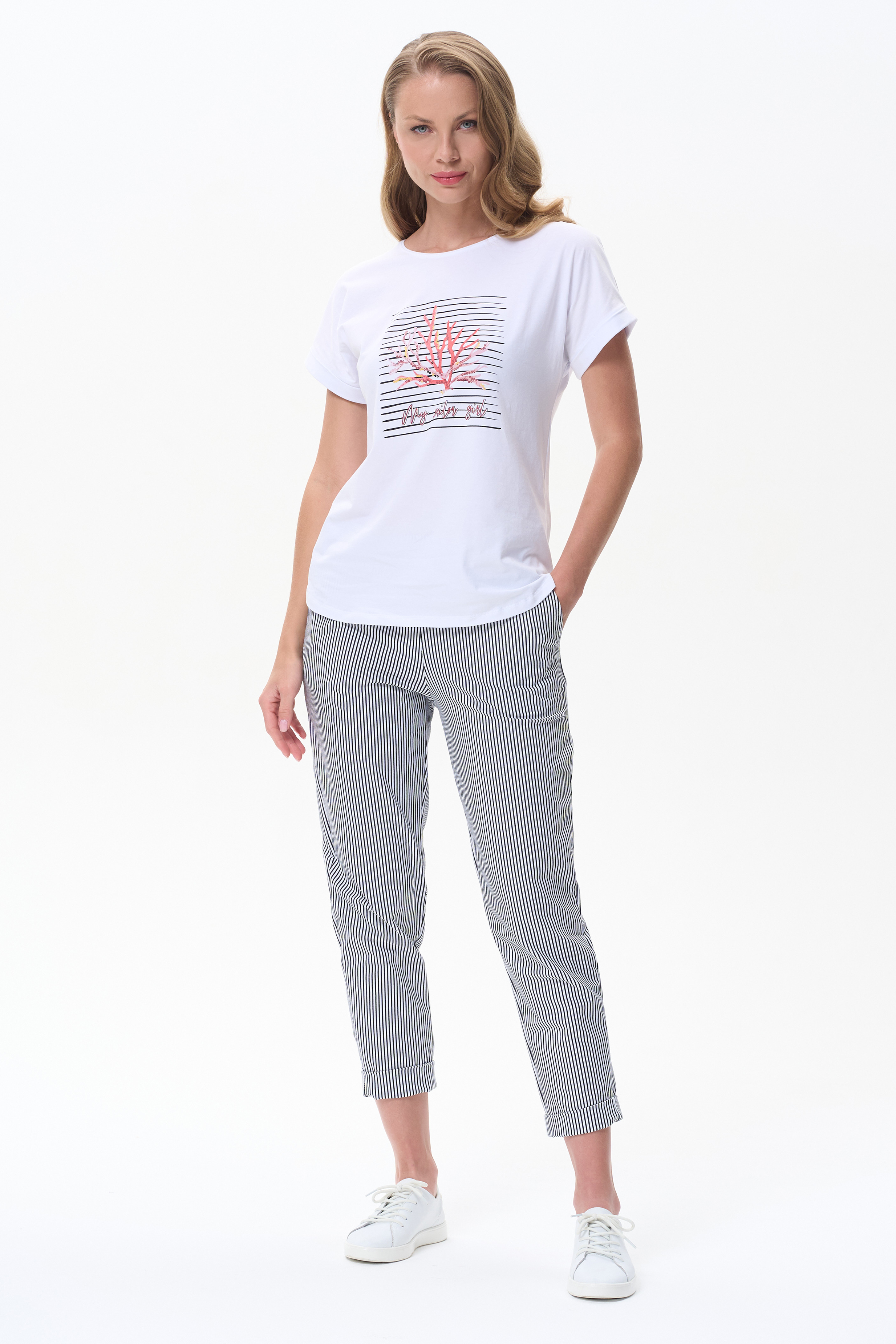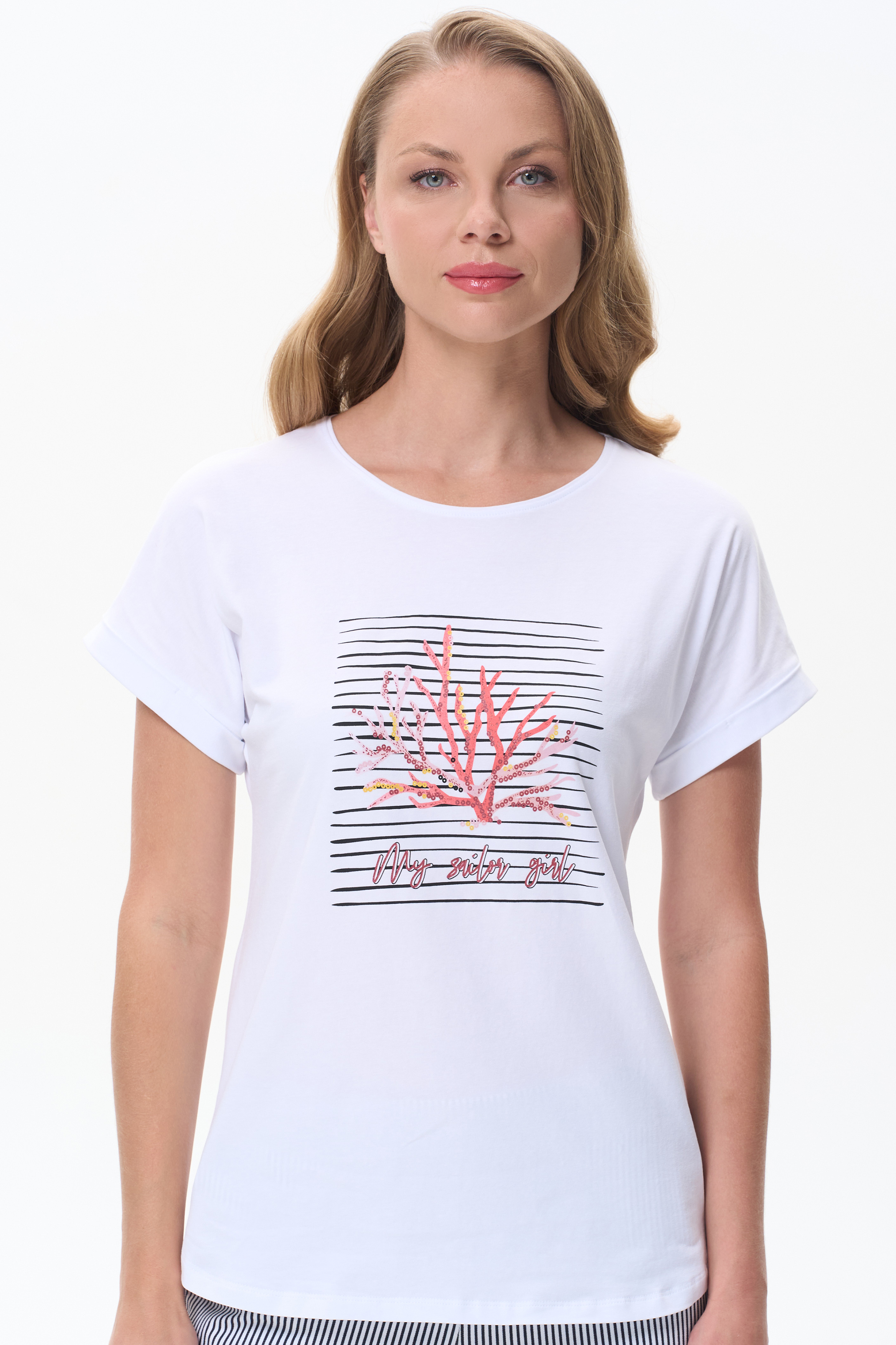 92% хлопок, 8% эластан Белая футболка из кулирки с эластаном качества ПЕ 165 гр. Модель с круглым вырезом горловины, цельнокроеными короткими рукавами с зафиксированным подворотом, фигурная линия низа. Принт - красные кораллы на полоске. Благодаря такой печати модель выглядит ярко и привлекательно и сделает ваш образ эффектным. Рост модели 175 см.