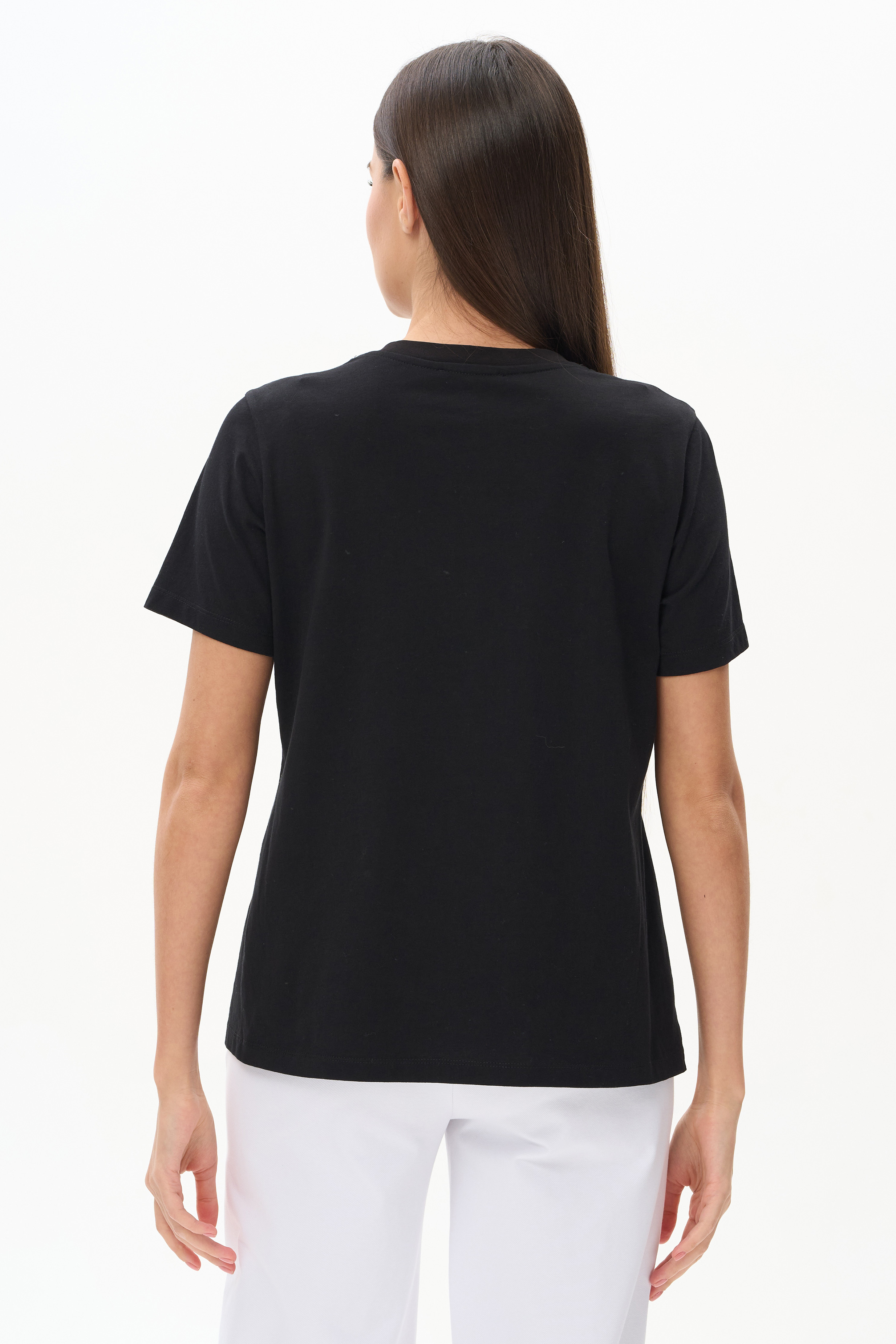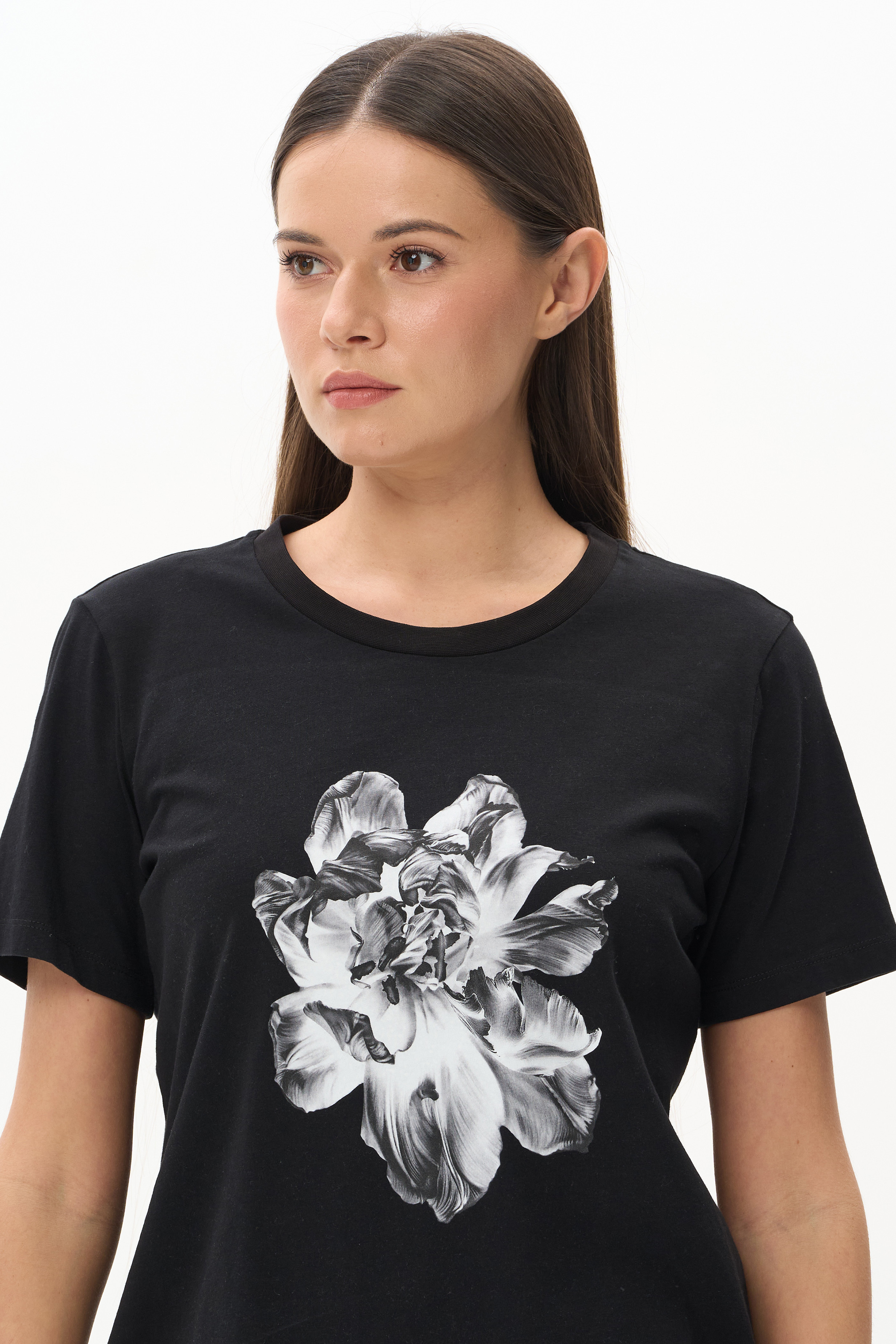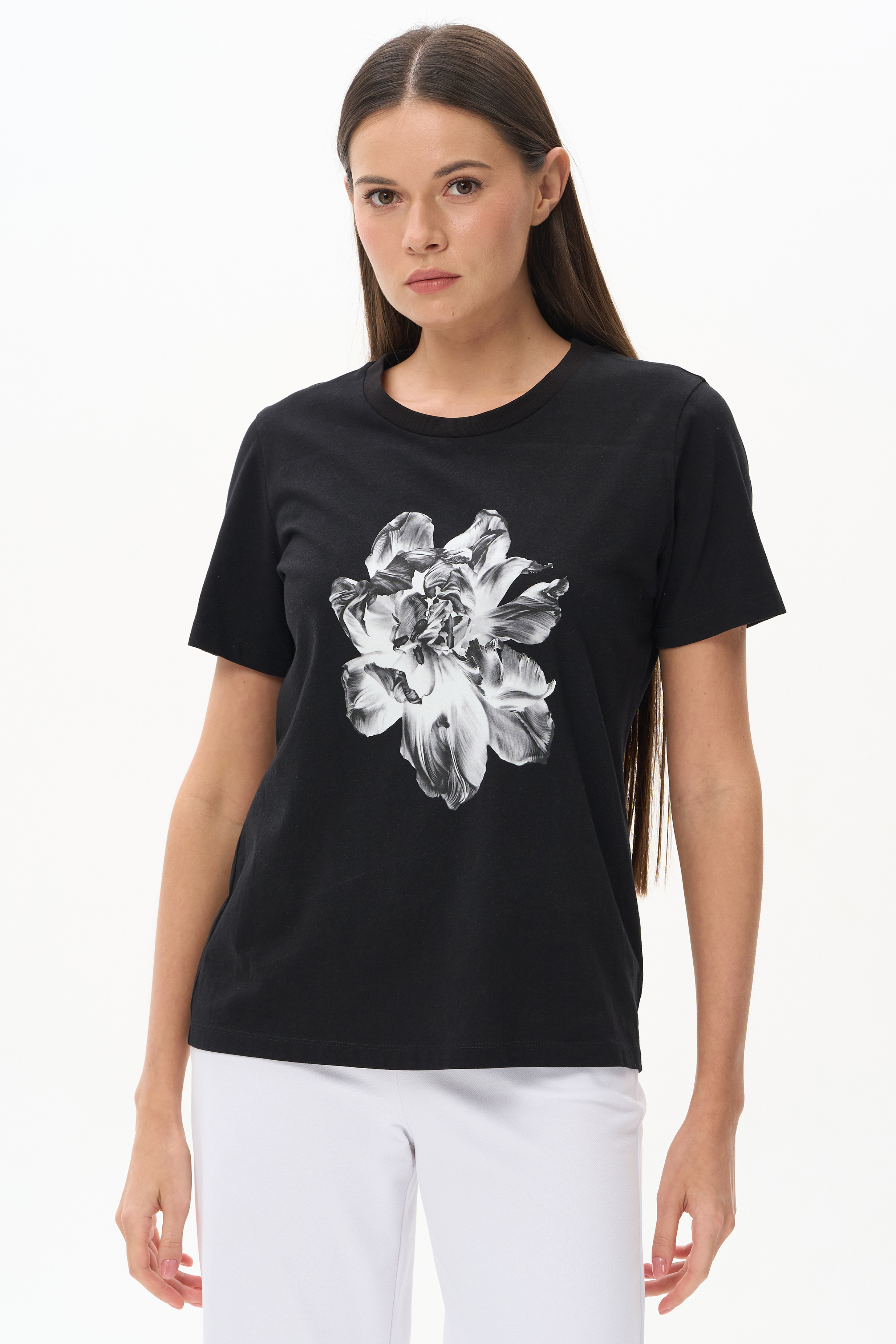 100% хлопок Футболка из кулирки качества пенье 150 гр.в глубоком чёрном оттенке. Модель модного кроя с принтом в виде белой цветочной графики. Футболка прямого силуэта, длина до середины бёдер, втачные короткие рукава, круглый вырез горловины обработан рибаной. Крупный контрастный принт придает модели актуальность и позволяет сочетать с любыми брюками коллекции. Рост модели 175 см.