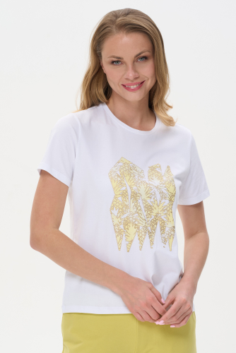 100% хлопок Футболка из кулирки качества пенье 145 гр, Горошки в Сливочном оттенке на фоне Перламутровое облако. Модель модного кроя, прямого силуэта, длина до середины бёдер, втачные короткие рукава. Круглый вырез горловины обработан хлопковой рибаной. Универсальная модель с комфортным прилеганием. Рост модели 175 см.
