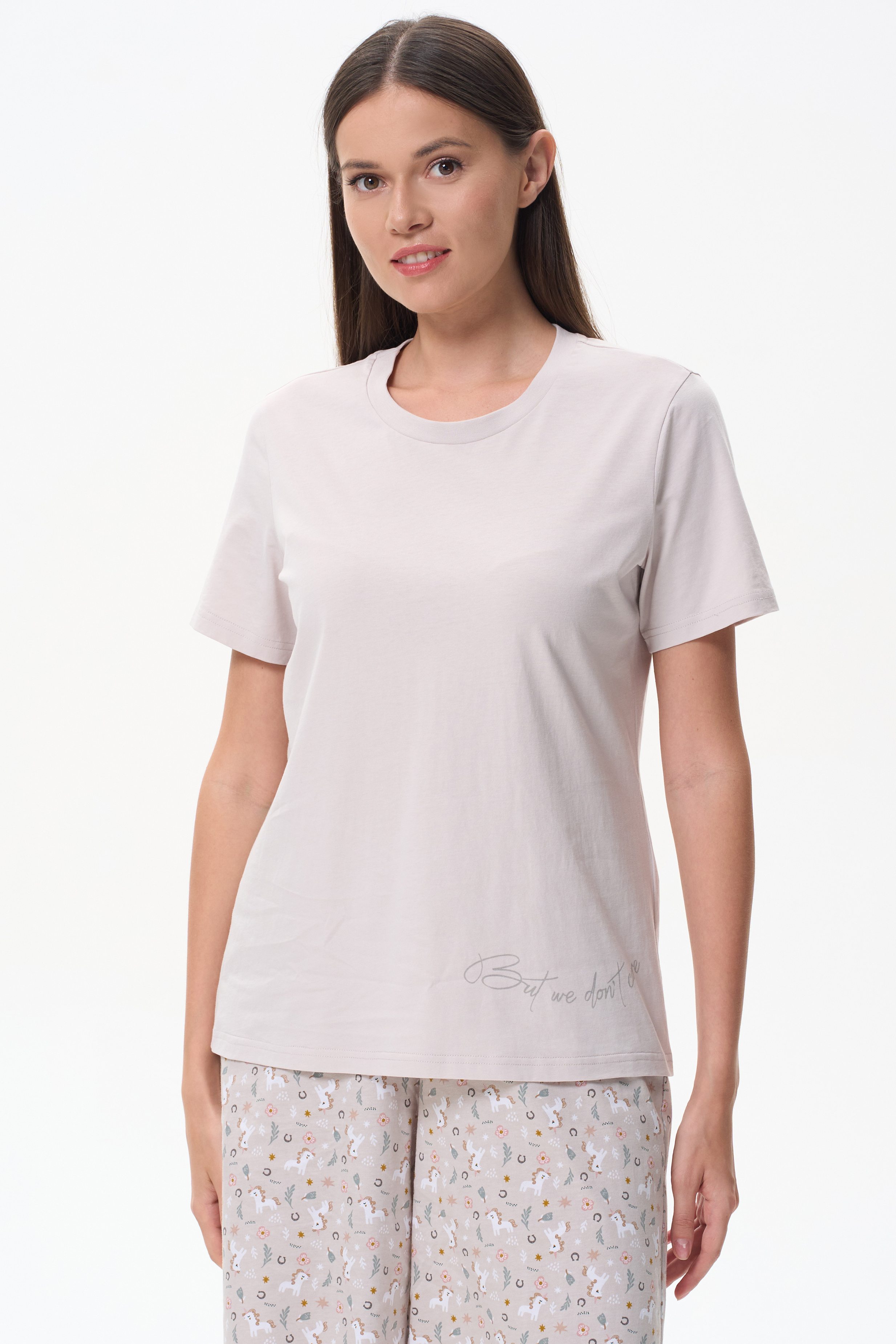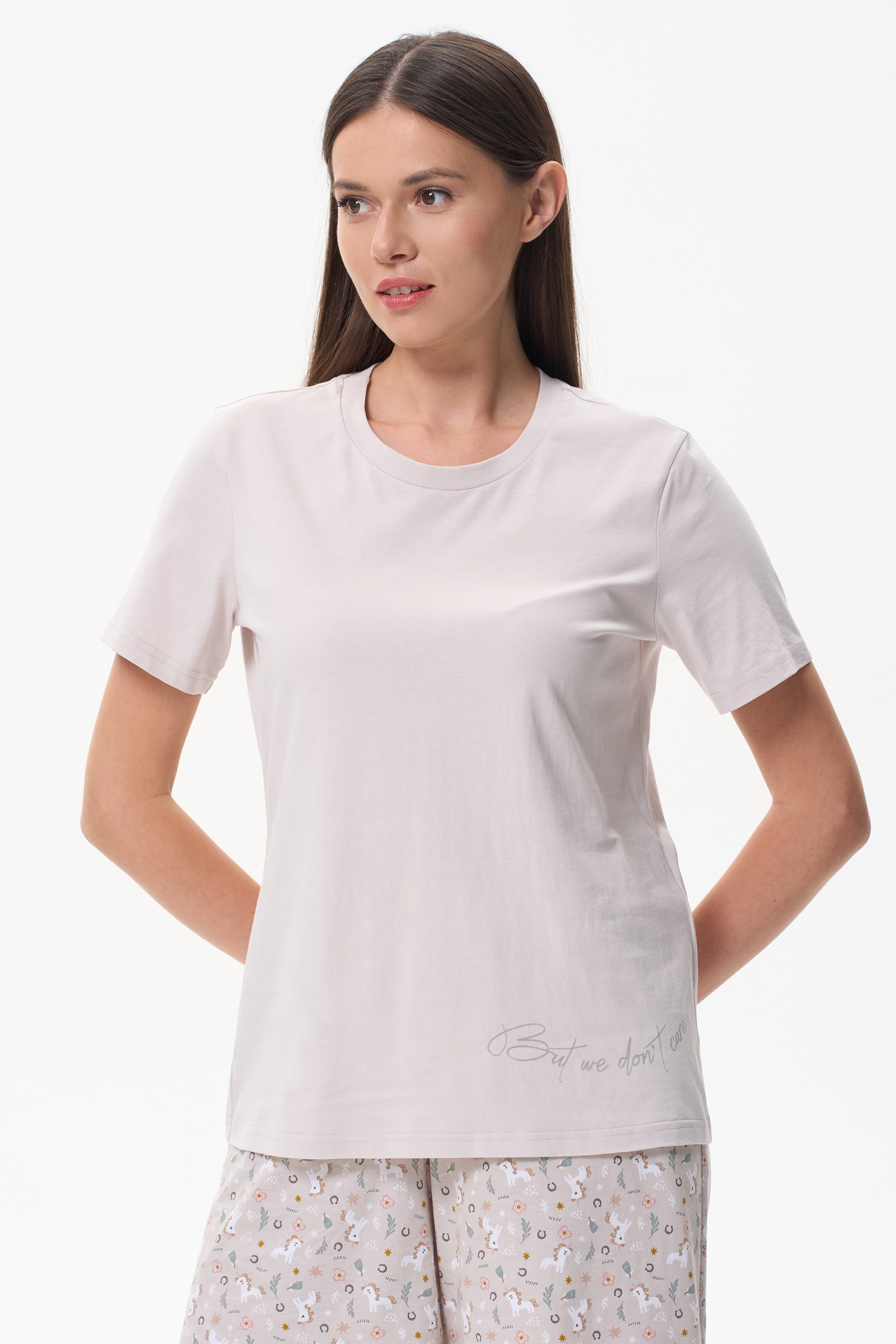 Футболка с принтом модного кроя из хлопкового трикотажного полотна. Свободный силуэт, длина до середины бёдер, втачные рукава. Круглый вырез горловины обработан хлопковым полотном рибана. Рост модели 175 см.