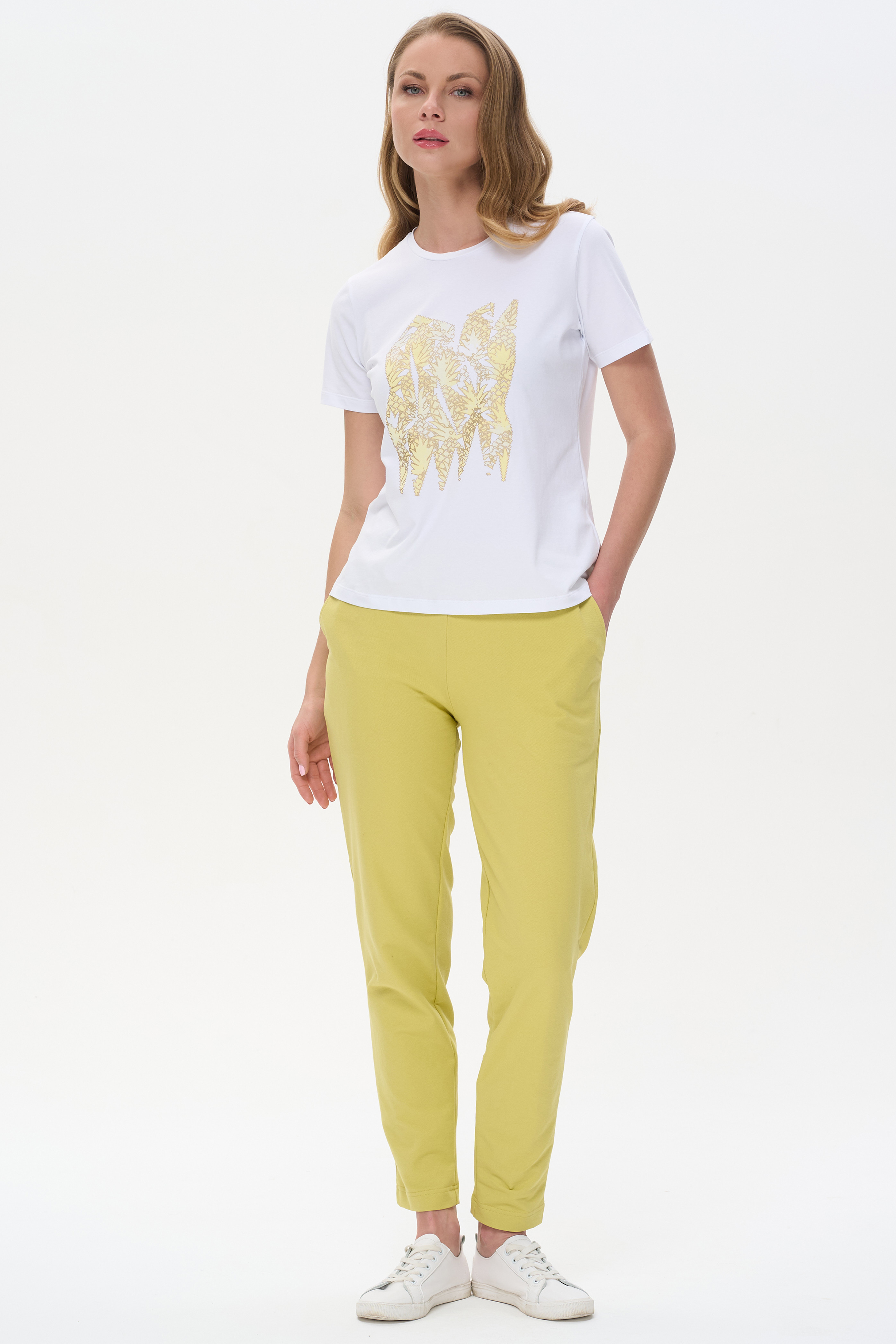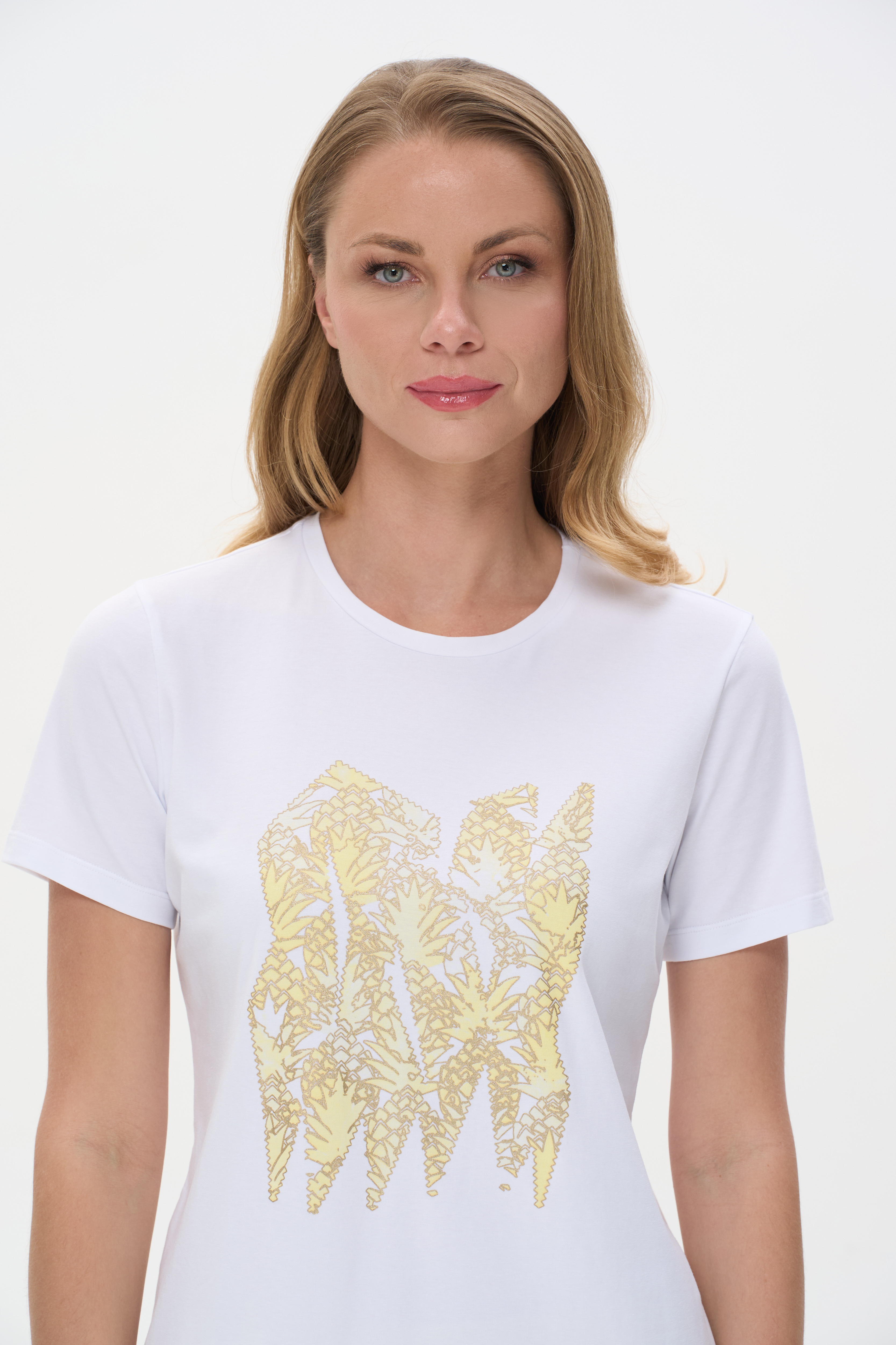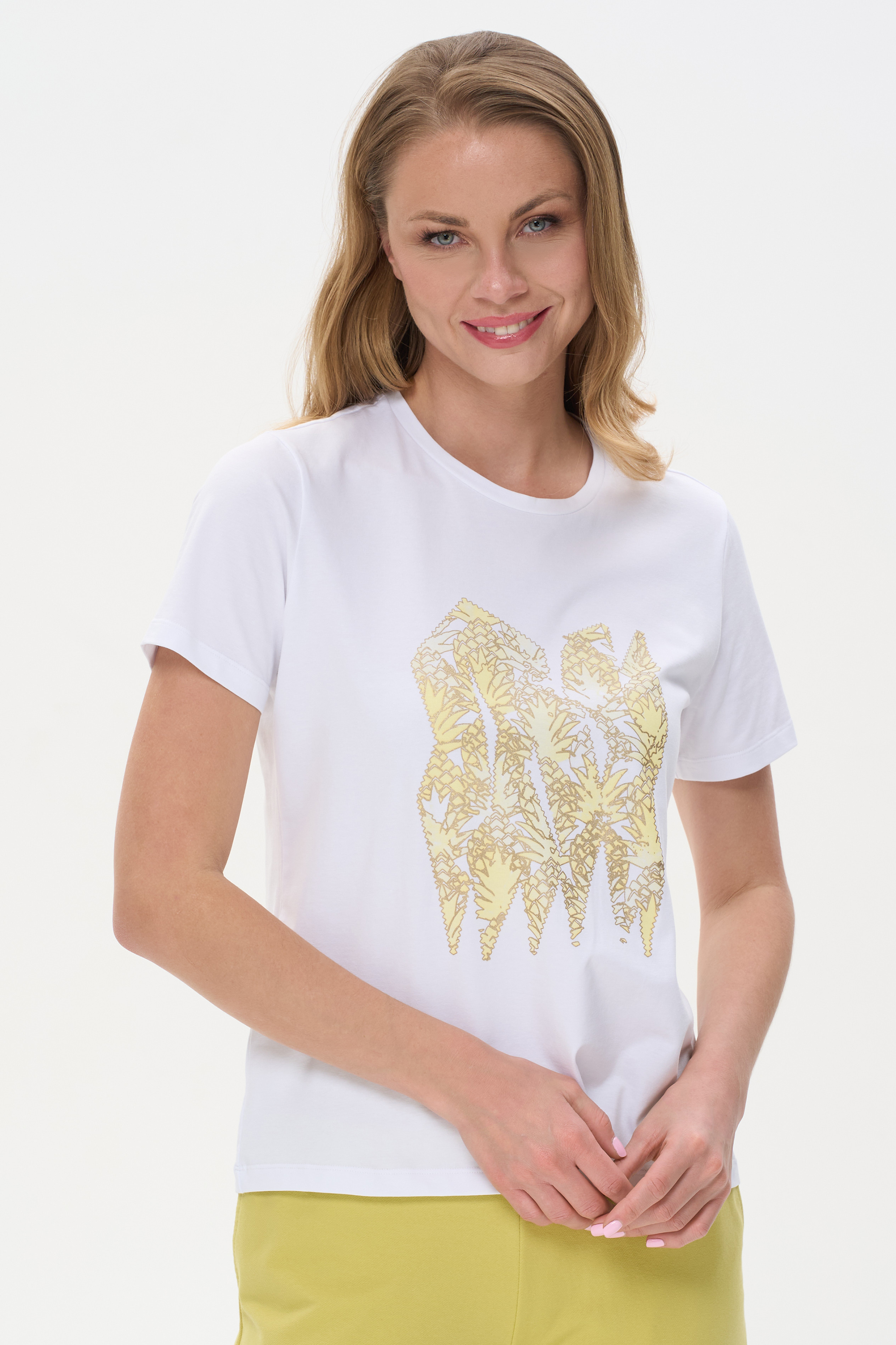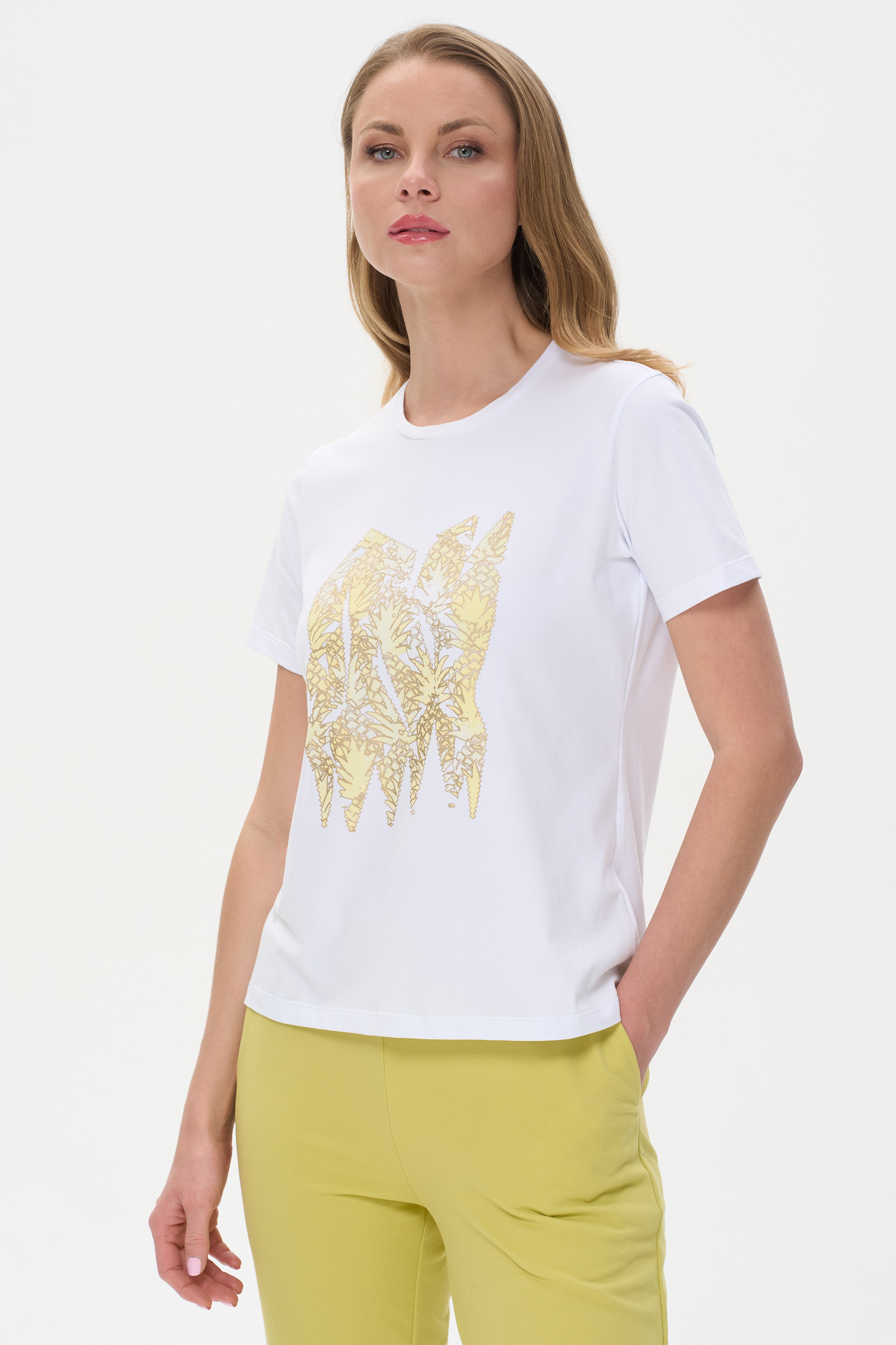 92% хлопок, 8% эластан Белая футболка из хлопкового полотна качества пенье 150 гр. Модель с круглым вырезом горловины и цельнокроеными короткими рукавами с подворотом. Принт - растительная абстракция в трендовом оттенке с эффектом золота выглядит актуально и сделает ваш образ привлекательным. Рост модели 175 см