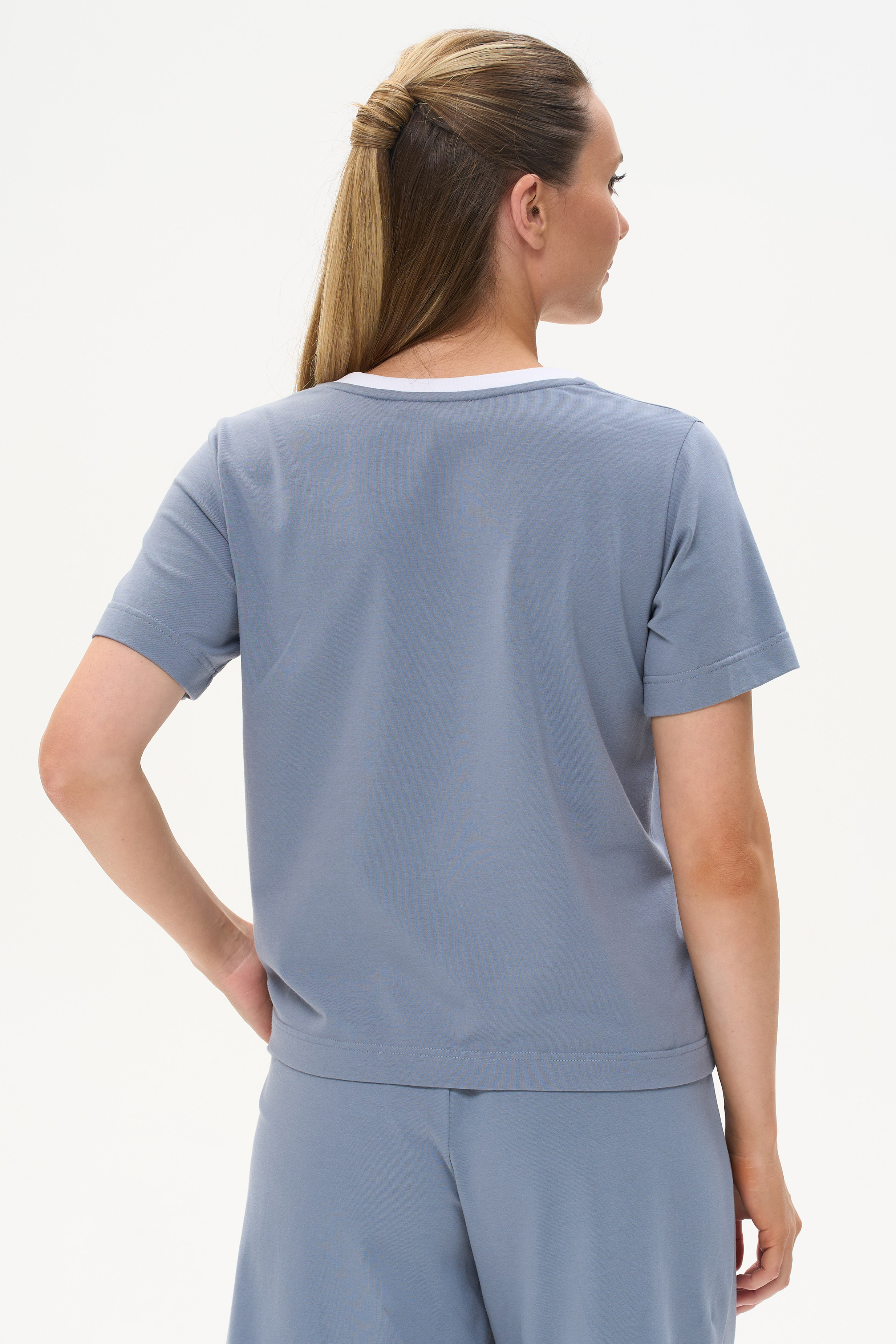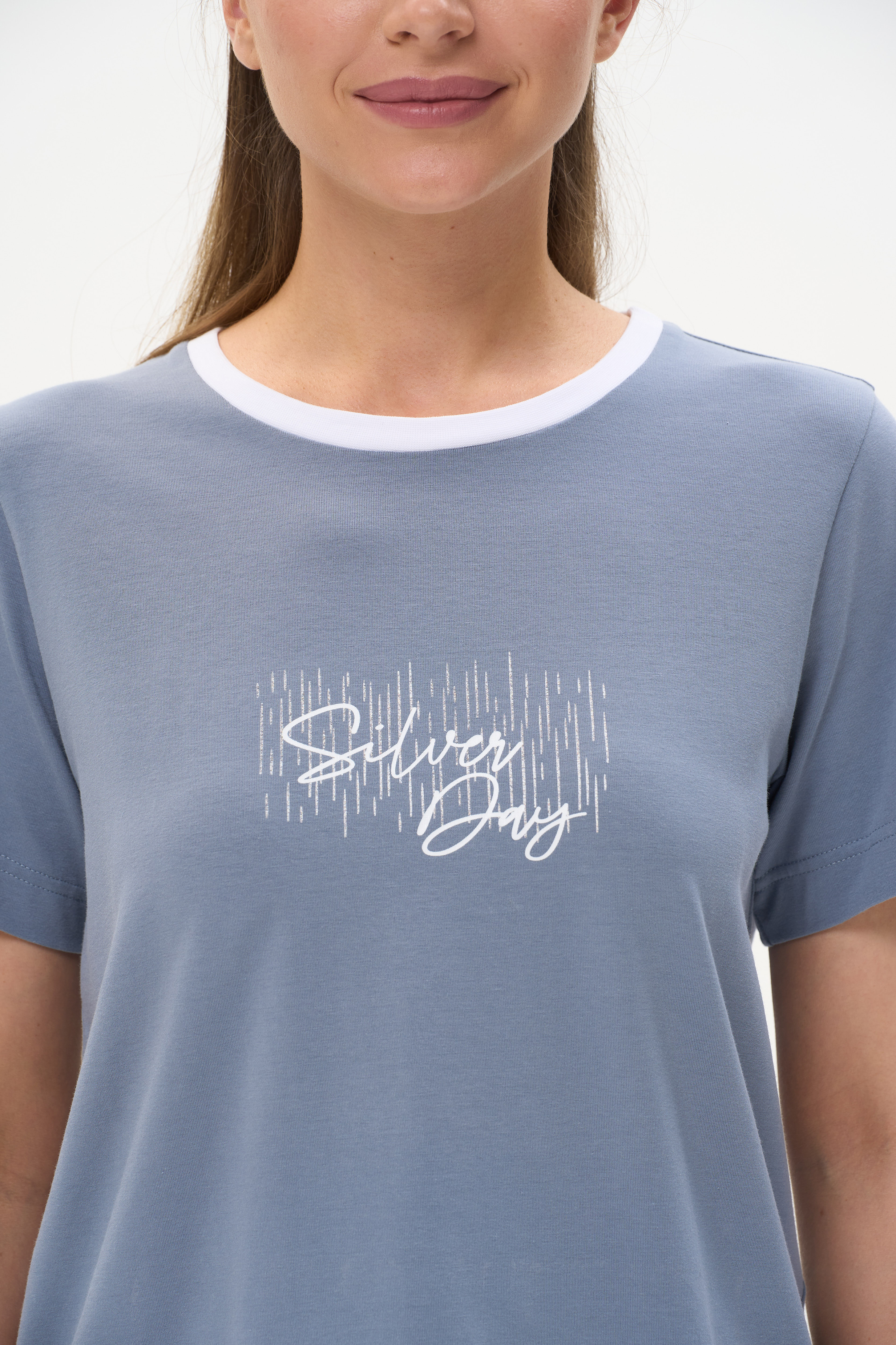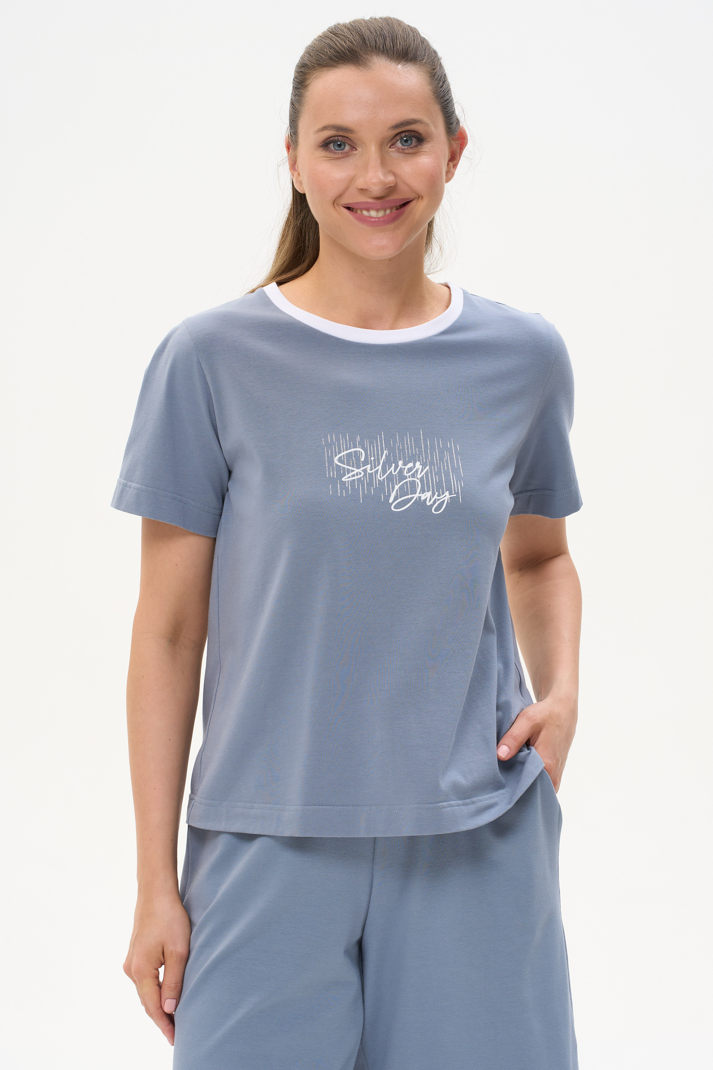 92% хлопок, 8% эластан Футболка из кулирки с эластаном качества ПЕ 200 гр. Модель свободного силуэта, модного кроя, длина до середины бёдер, втачные короткие рукава. Круглый вырез горловины обработан рибаной. На полочке стильный принт белый с серебром. Отлично подходит к белым брюкам из джинскота. Рост модели 175 см.
