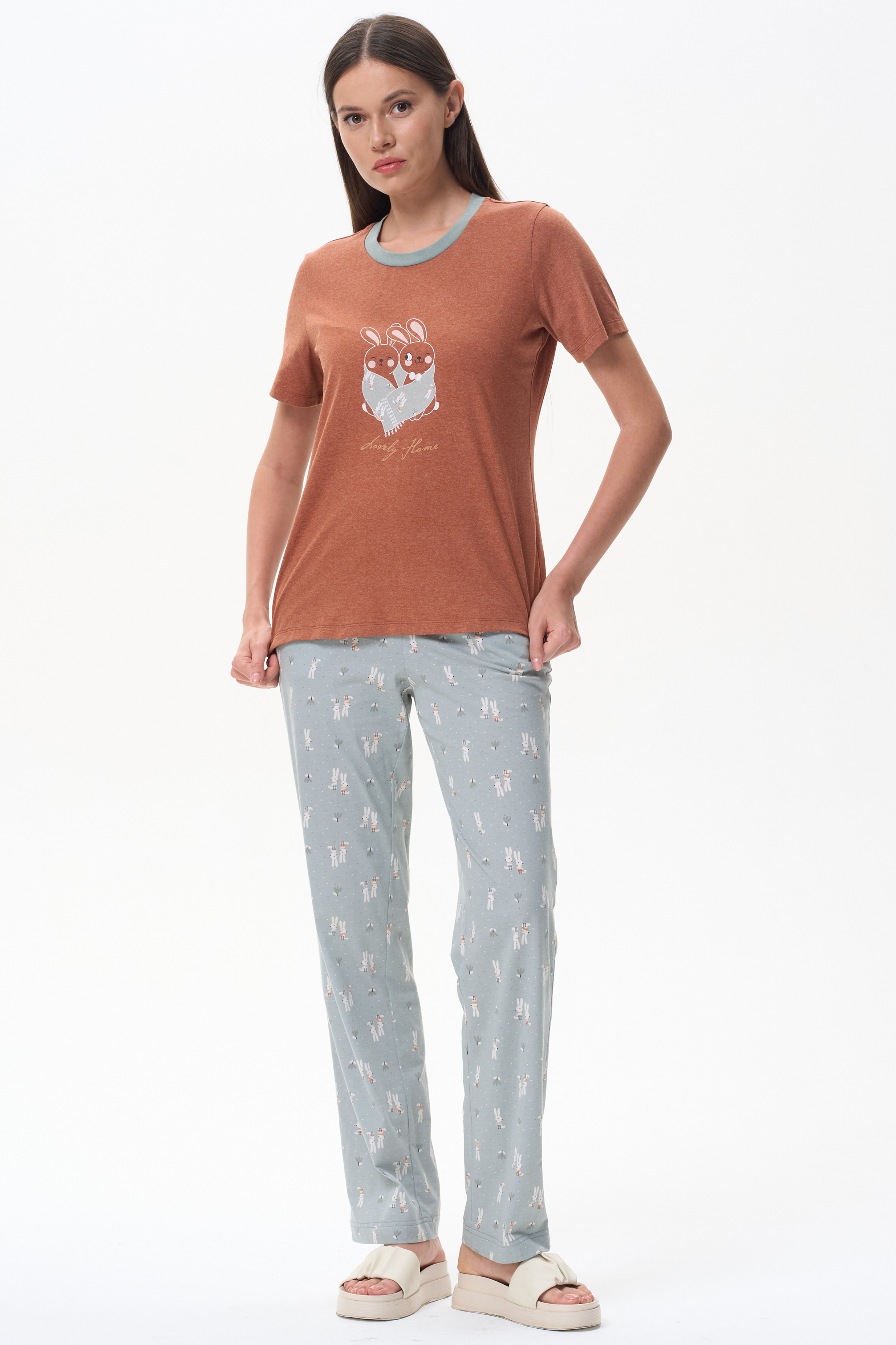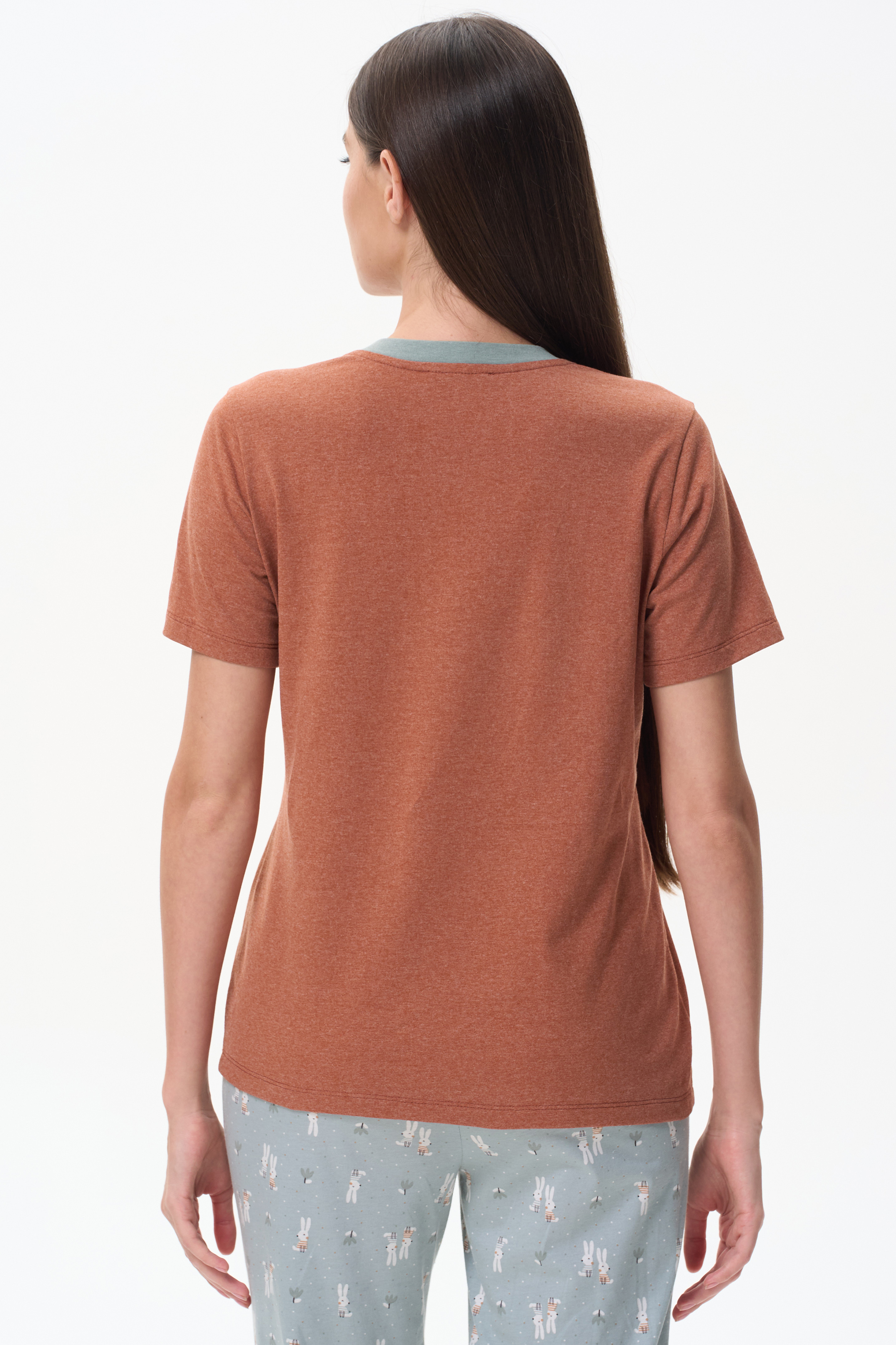Футболка с принтом "зайчики", модного кроя из хлопкового трикотажного полотна. Свободный силуэт, длина до середины бёдер, втачные рукава. Круглый вырез горловины обработан хлопковым полотном рибана. Рост модели 175 см.