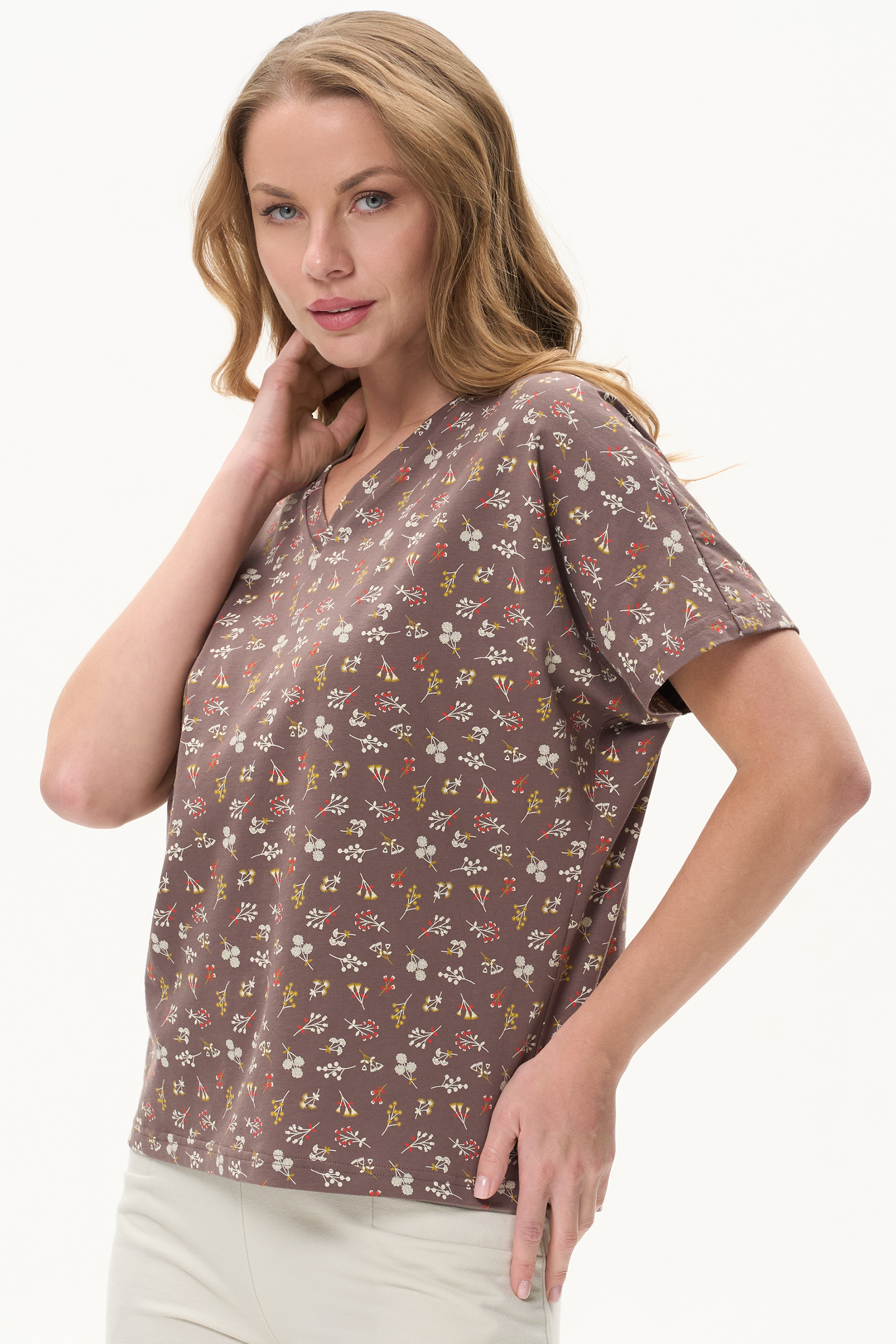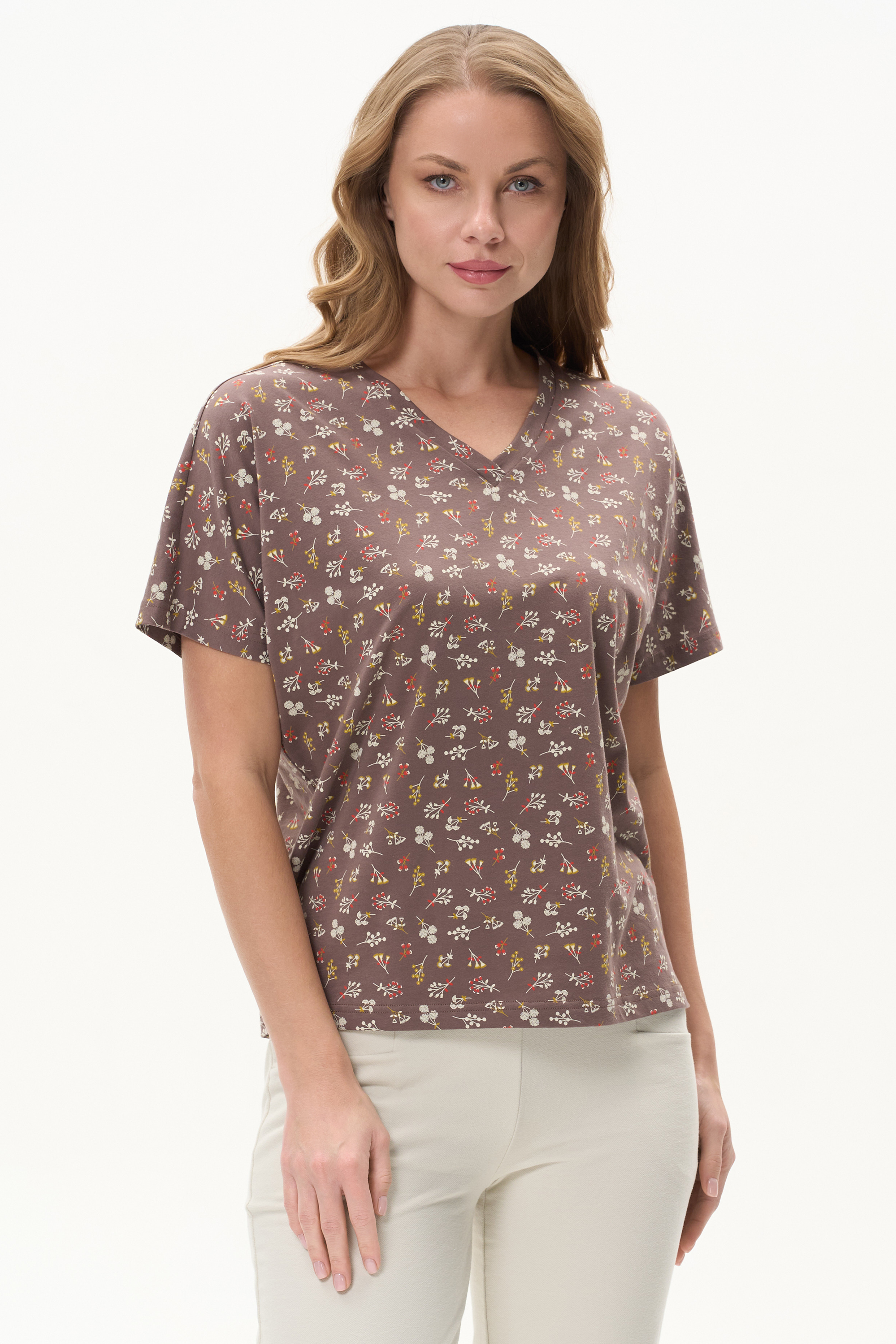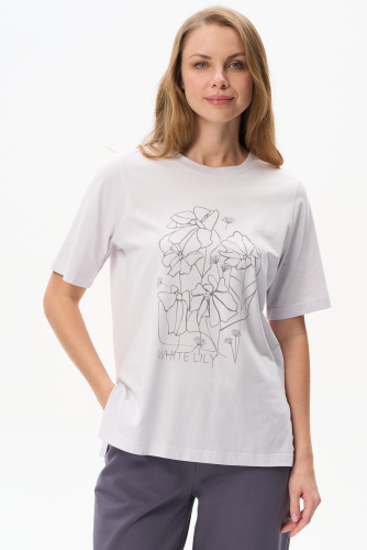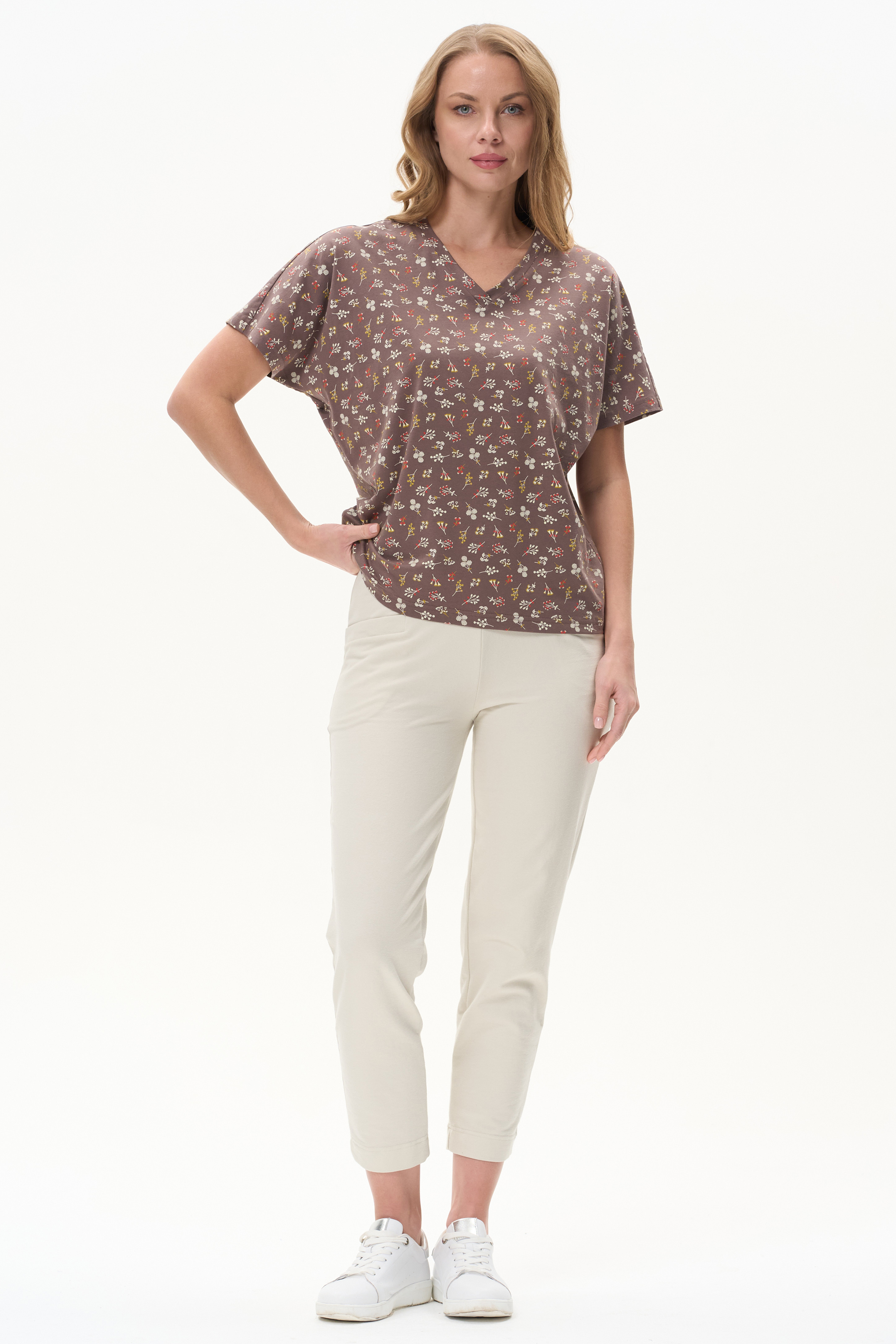 100% хлопок Футболка из кулирки качества ПЕ 150 гр Модель новой формы, свободная, укороченная, V-образный вырез горловины оформлен планкой, спущенное плечо, короткие цельнокроенные рукава. Удобная повседневная модель. Рост модели 175 см.