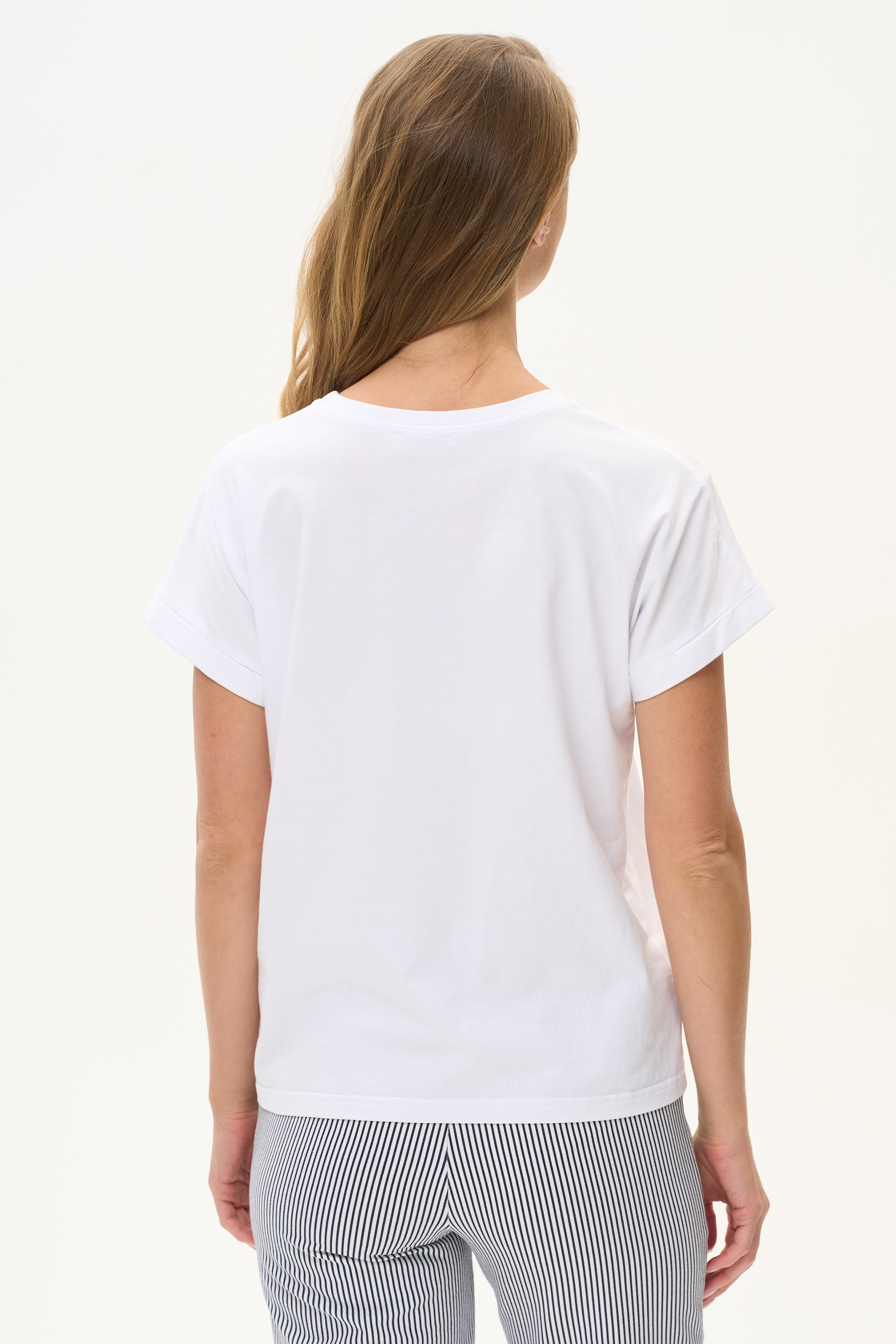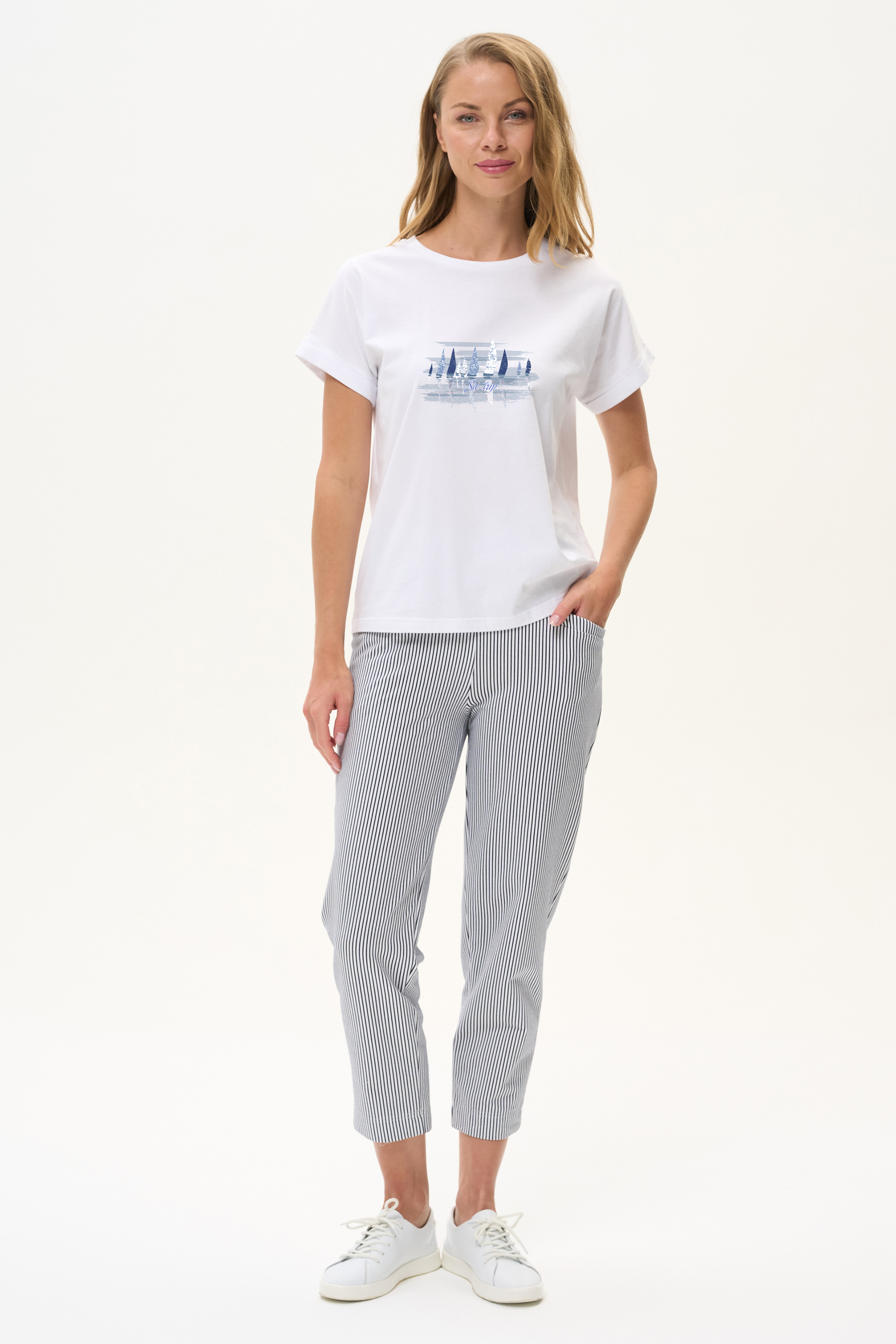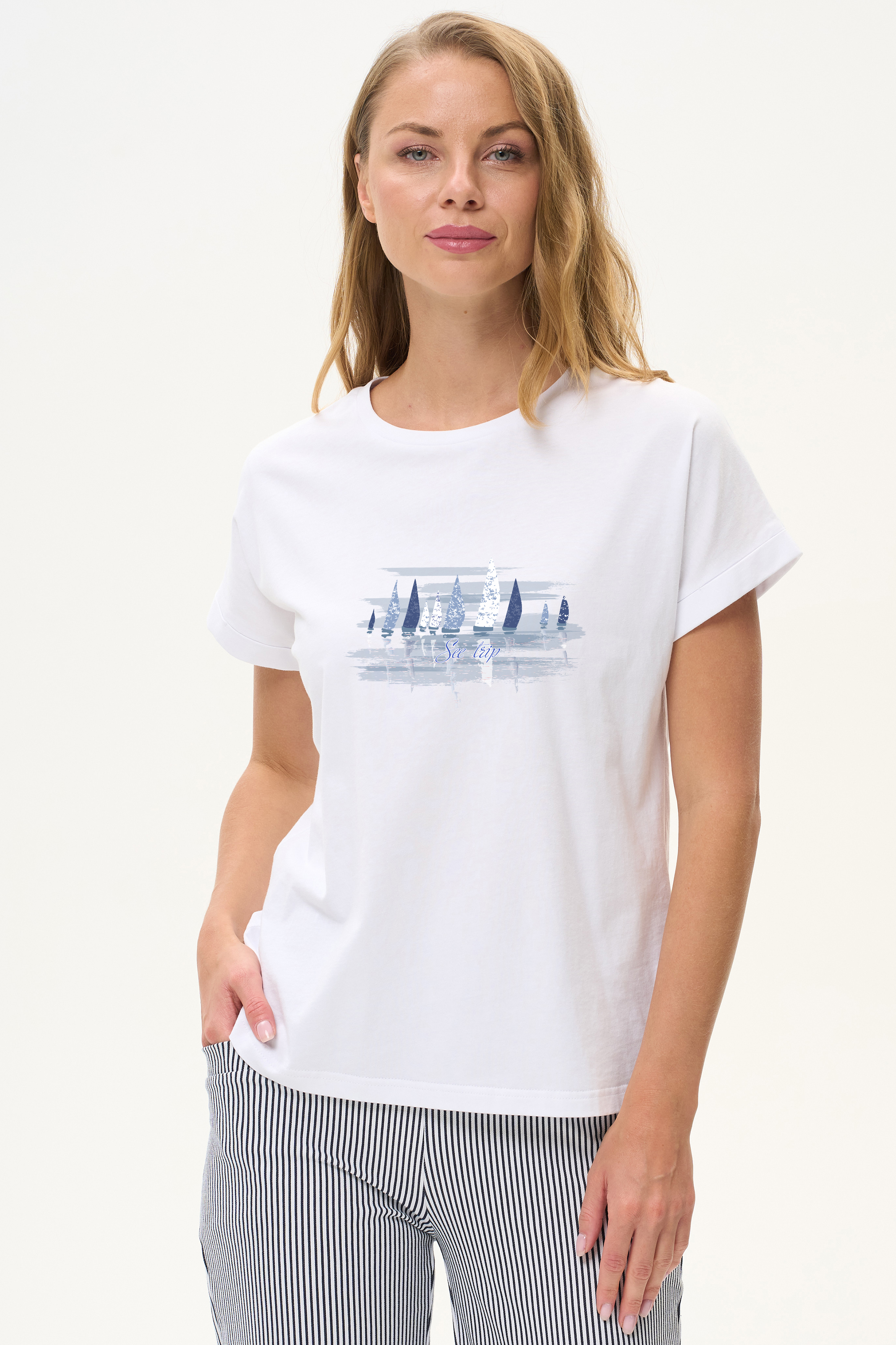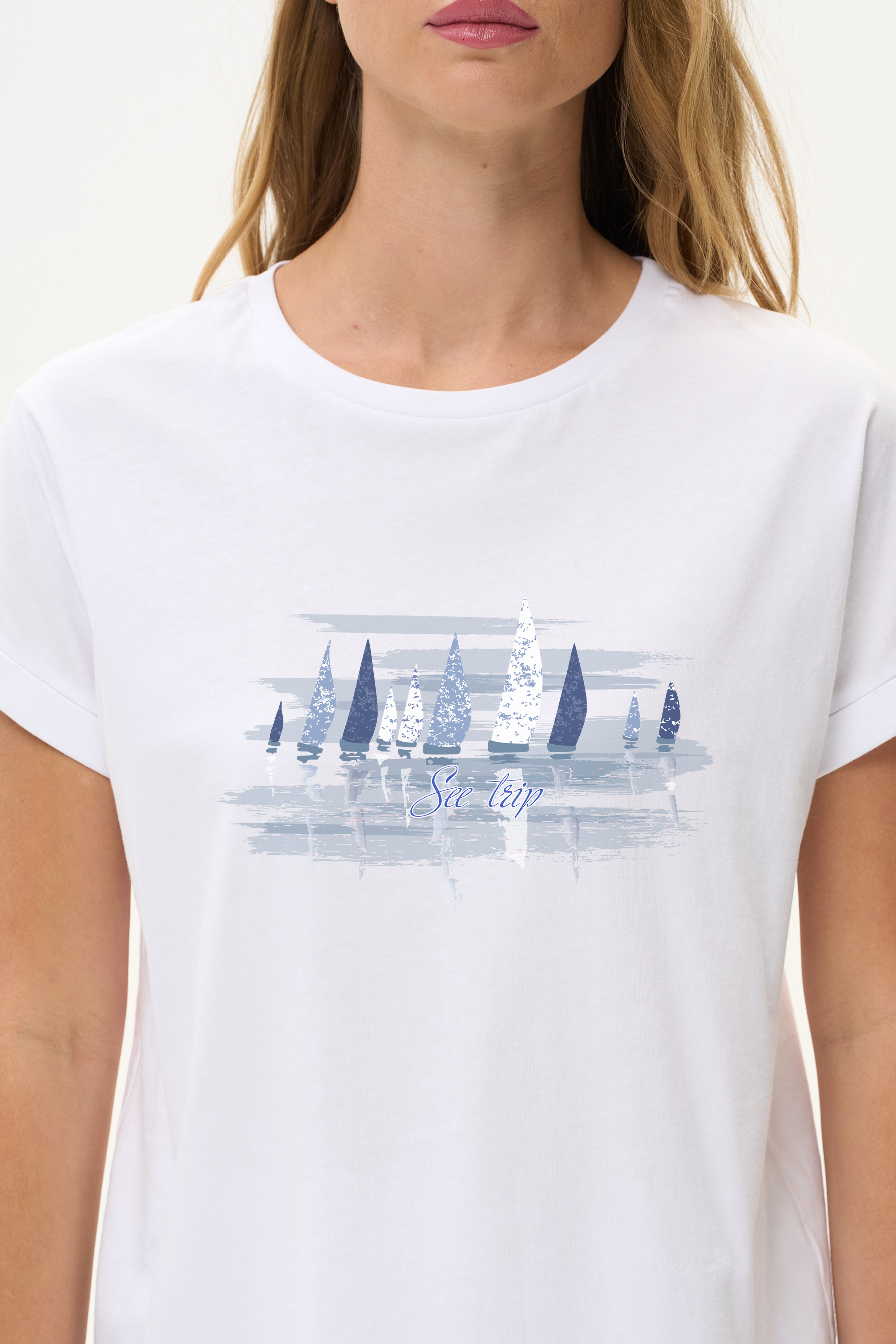 100% хлопок Белая футболка из хлопкового полотна качества пенье 150 гр. Модель с круглым вырезом горловины и цельнокроеными короткими рукавами с подворотом. Корабли в сине-голубых тонах. Благодаря такой печати модель выглядит особенно свежо и актуально. Рост модели 175 см.