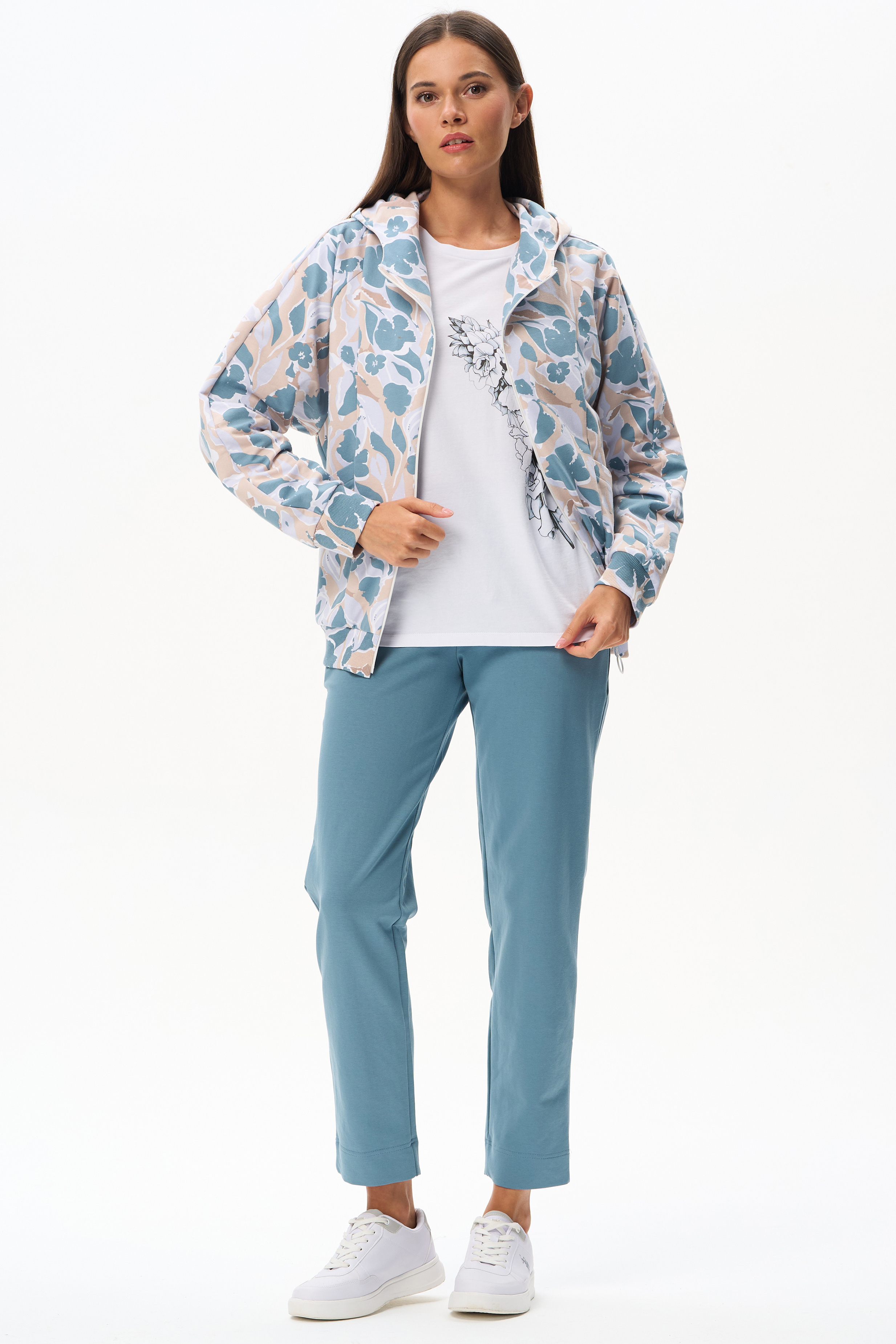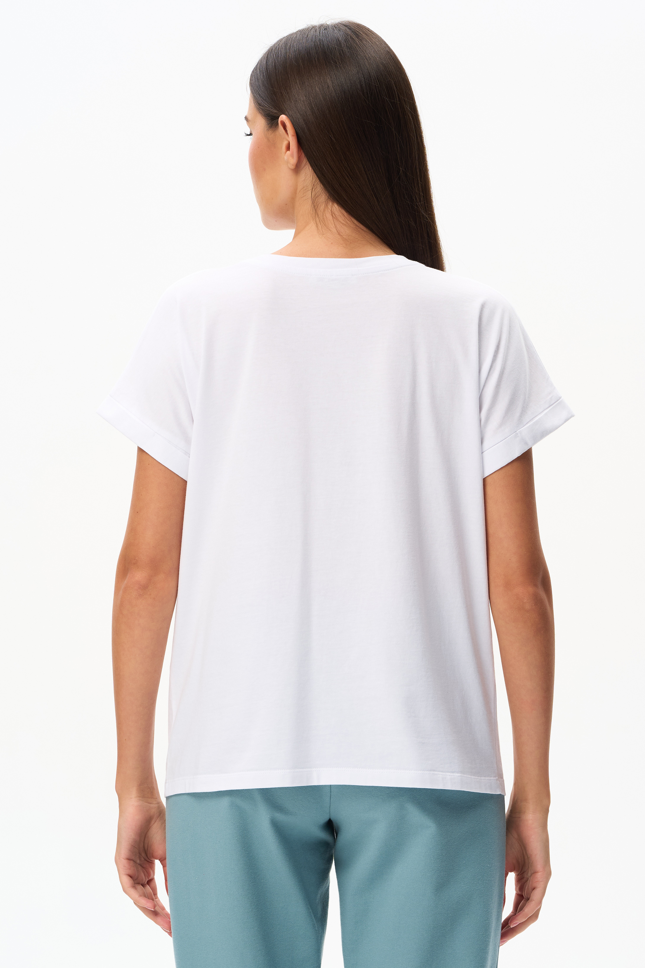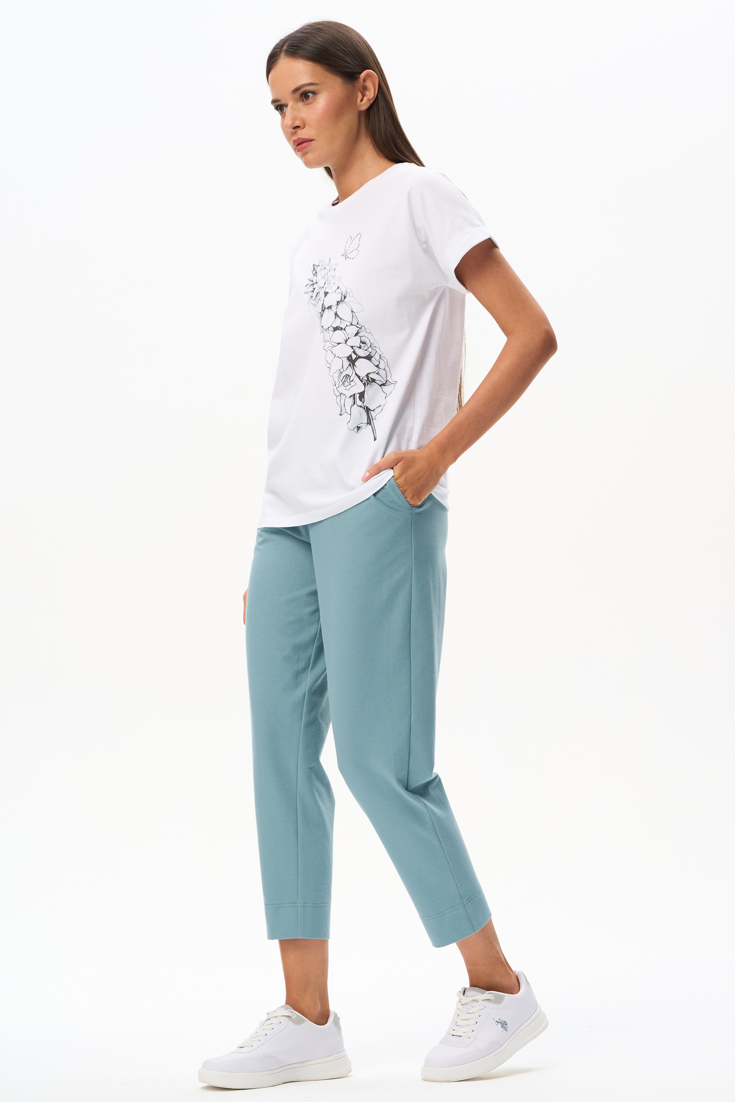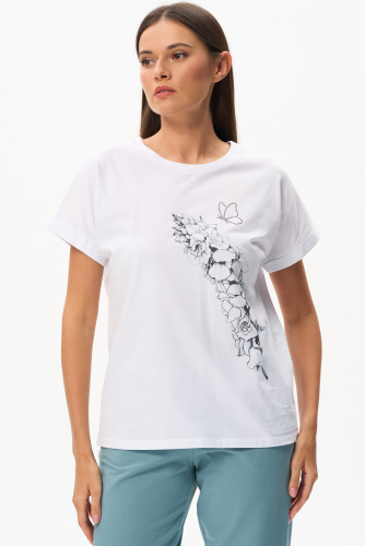 100% хлопок Футболка из кулирки пенье чистого белого оттенка. Модель с круглым вырезом горловины с отделкой из рибаны и цельнокроеными короткими рукавами с подворотом. На футболке "расцветает" красивый принт Дельфиниума в ботаническом стиле. Сочетается со многими брюками коллекции. Рост модели 175 см.