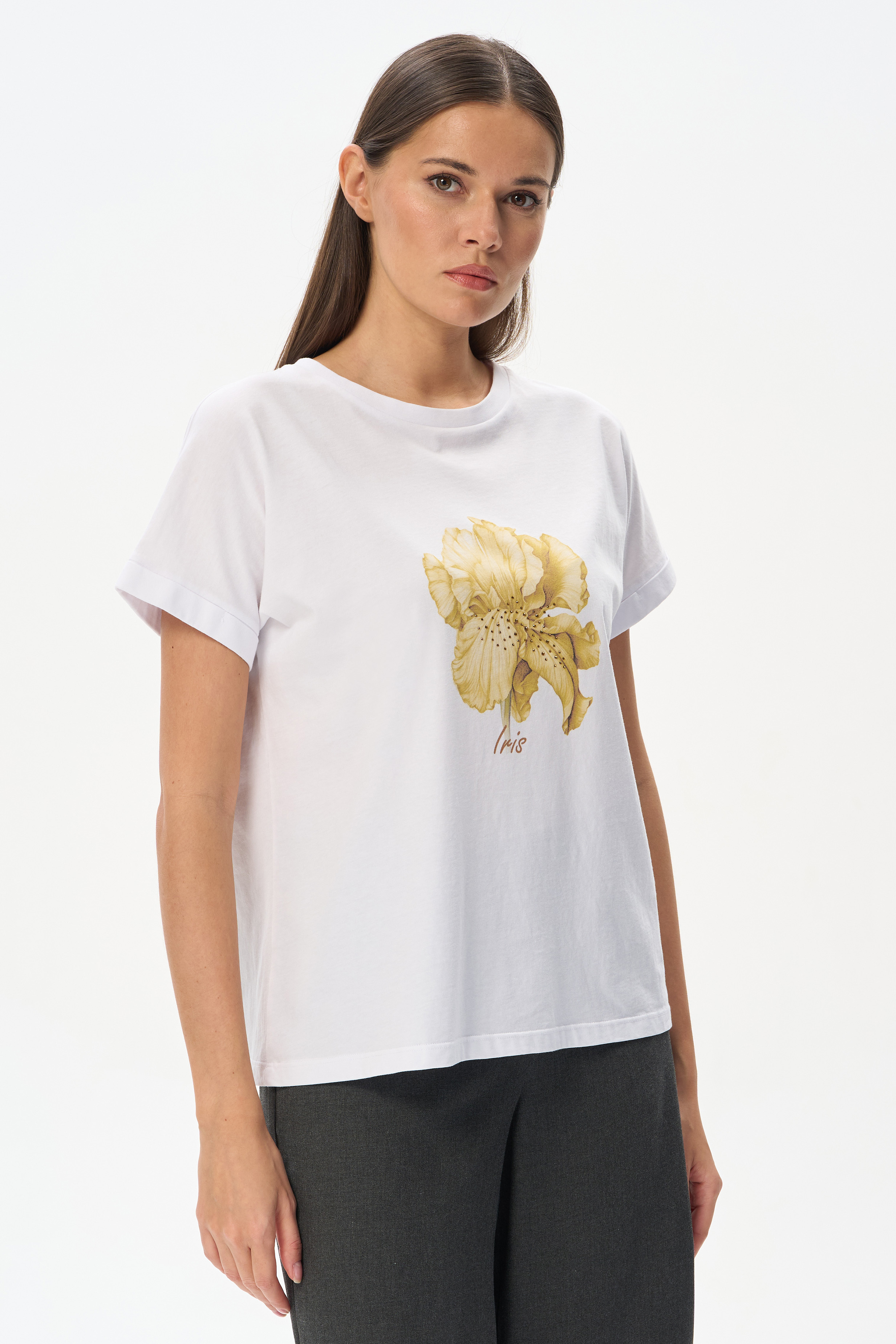 Белая футболка из хлопкового полотна качества пенье 150 гр. Модель с круглым вырезом горловины и цельнокроеными короткими рукавами с подворотом. Нежный ирис украшен блеском страз. Благодаря такой печати модель выглядит особенно эффектно и сделает ваш образ нарядным. Рост модели 175 см
