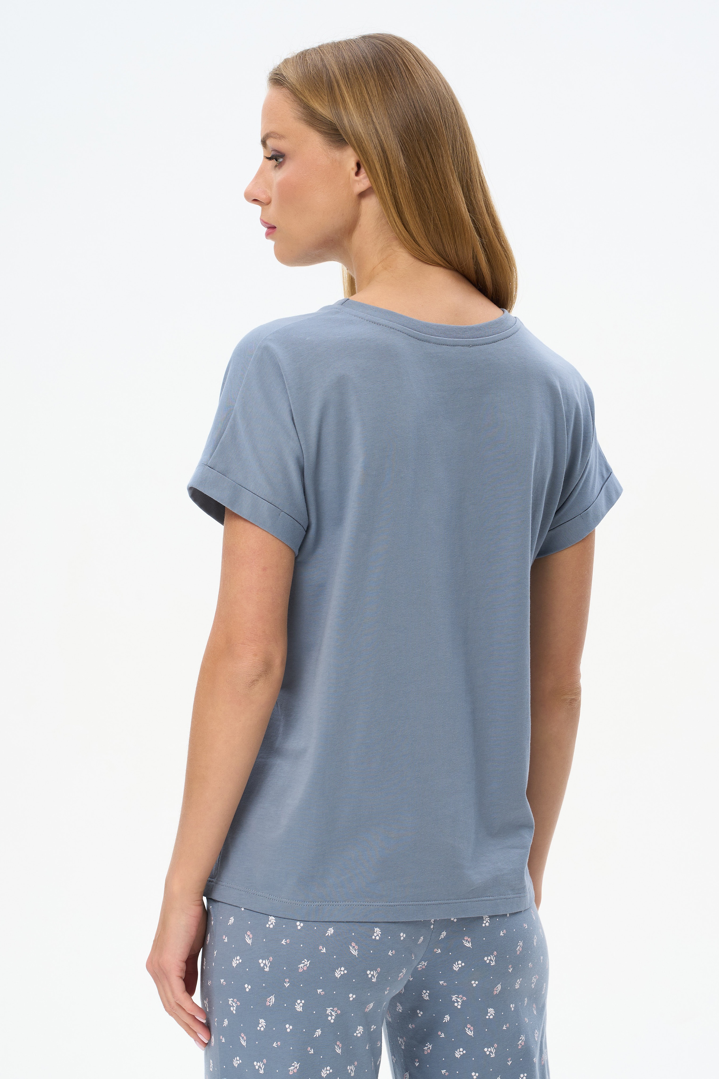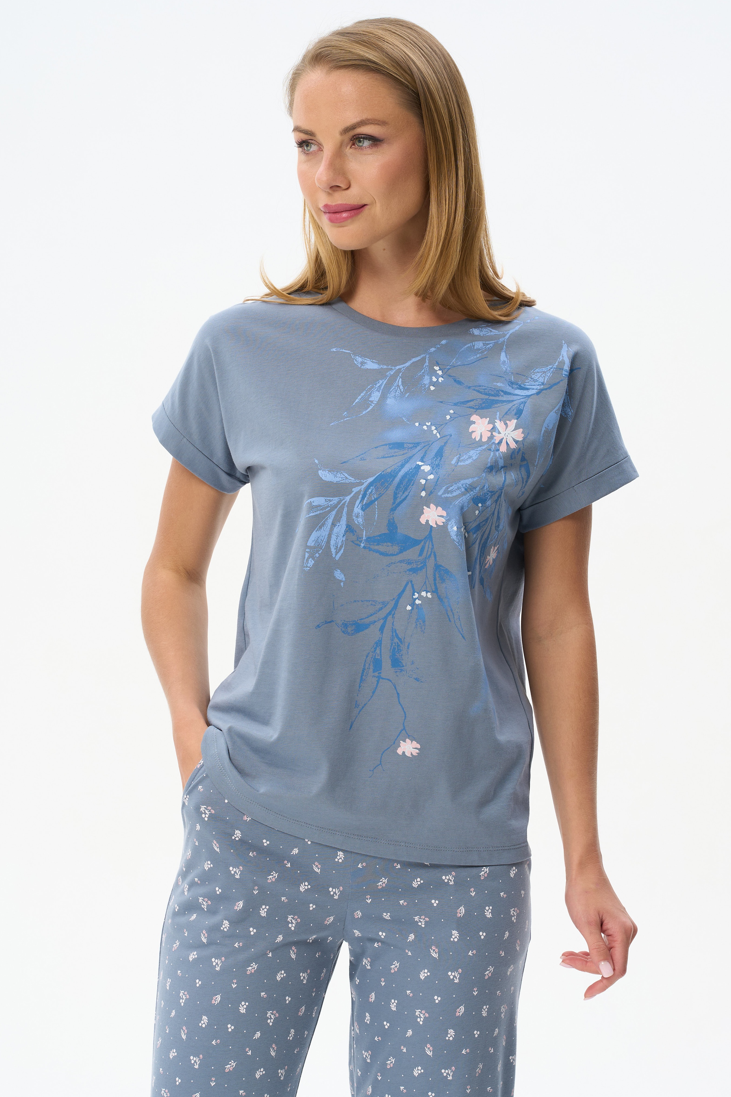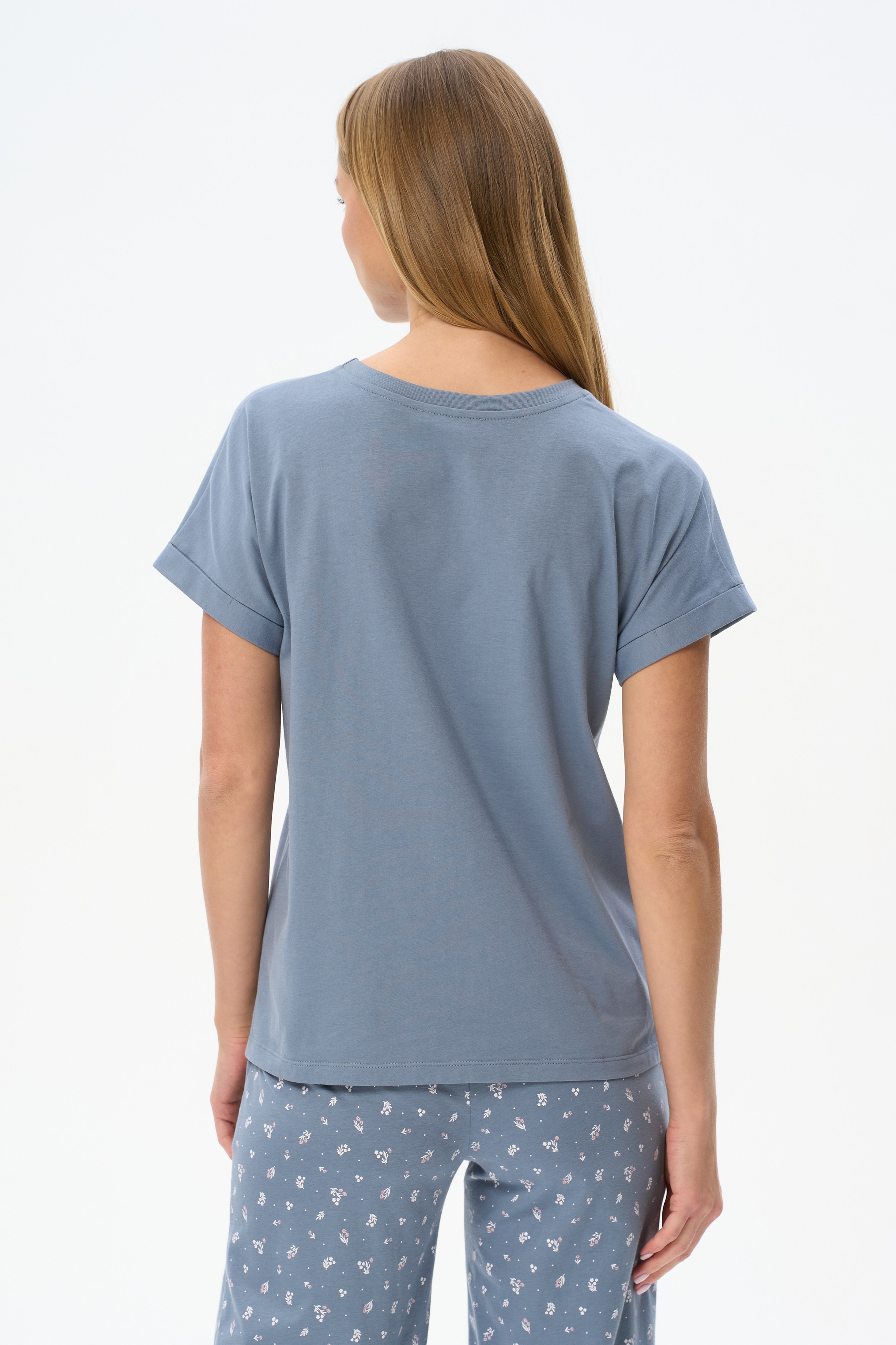 100% хлопок Футболка с принтом из хлопкового полотна качества пенье. Круглый вырез горловины окантован хлопковым полотном рибана. Цельнокроеные короткие рукава с отворотами. Рост модели на фото 178 см.