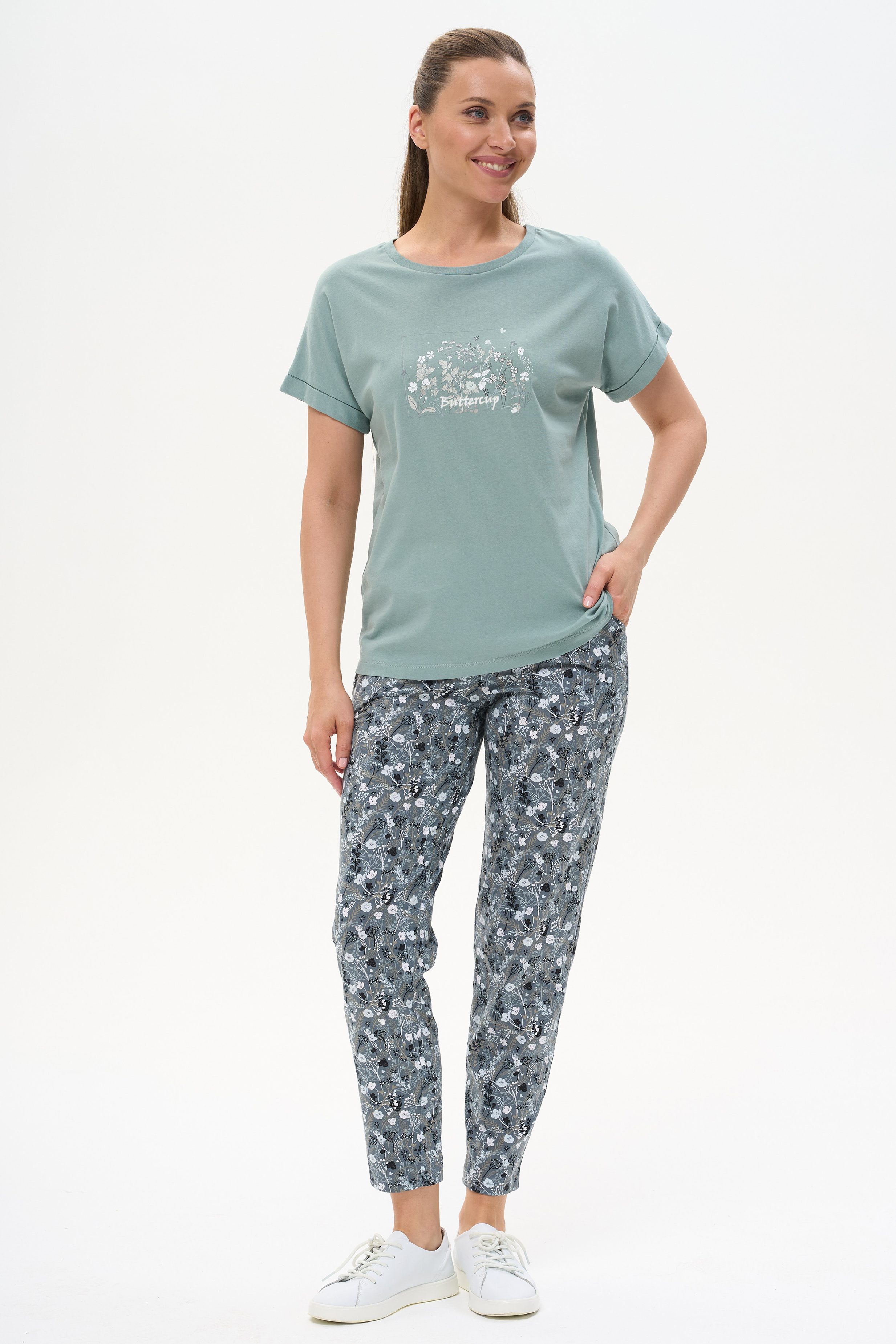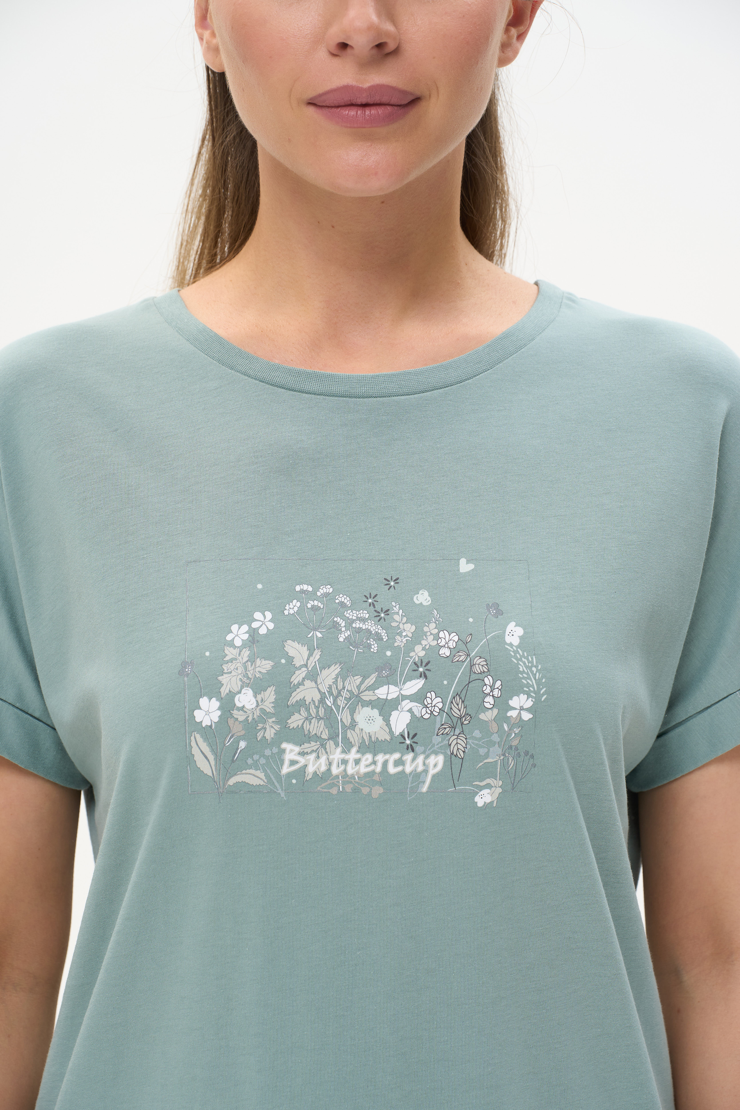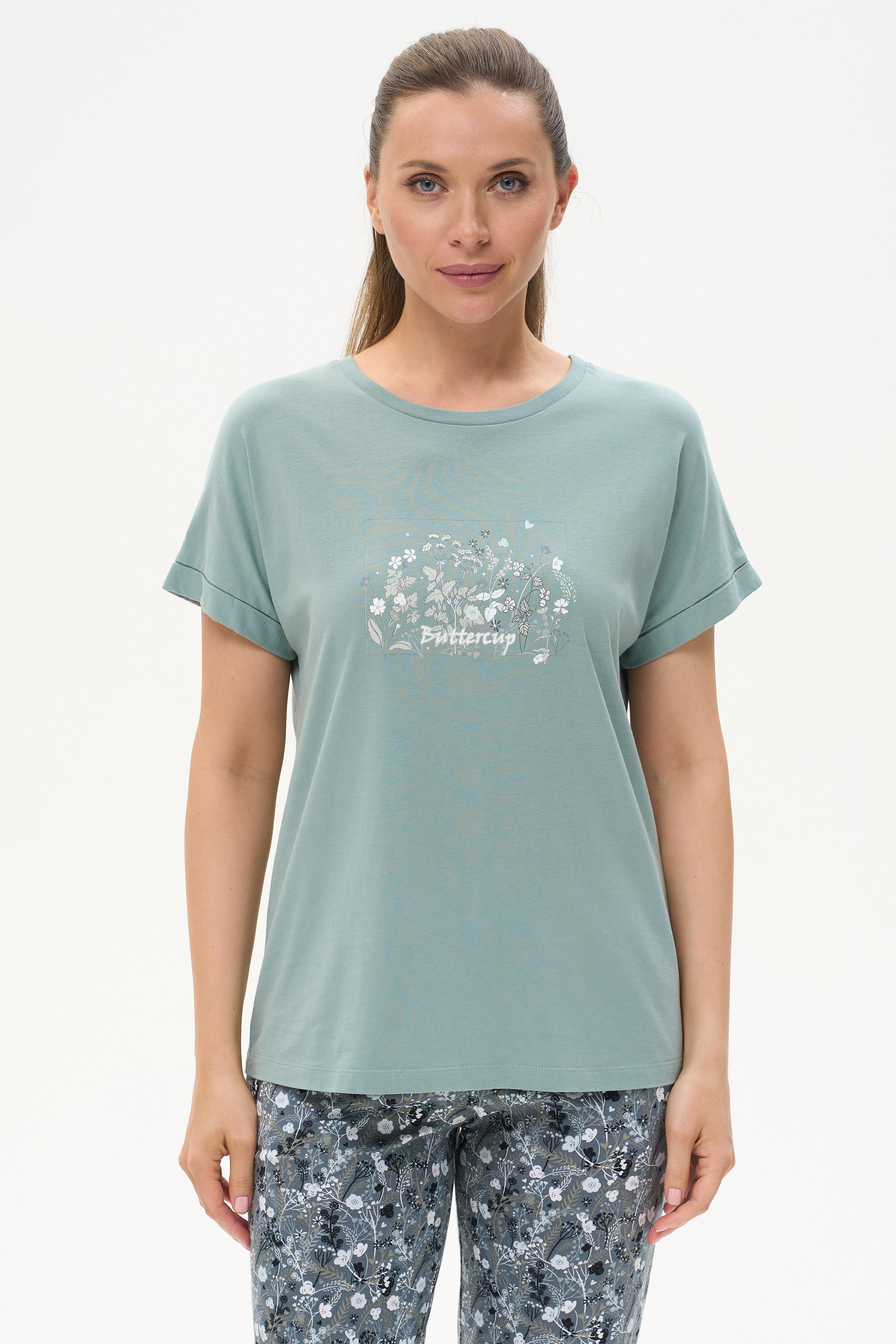 100% хлопок Футболка с принтом из хлопкового полотна качества пенье. Круглый вырез горловины окантован хлопковым полотном рибана. Цельнокроеные короткие рукава с отворотами. Рост модели на фото 178 см.