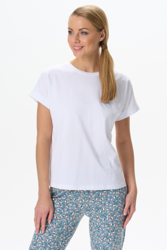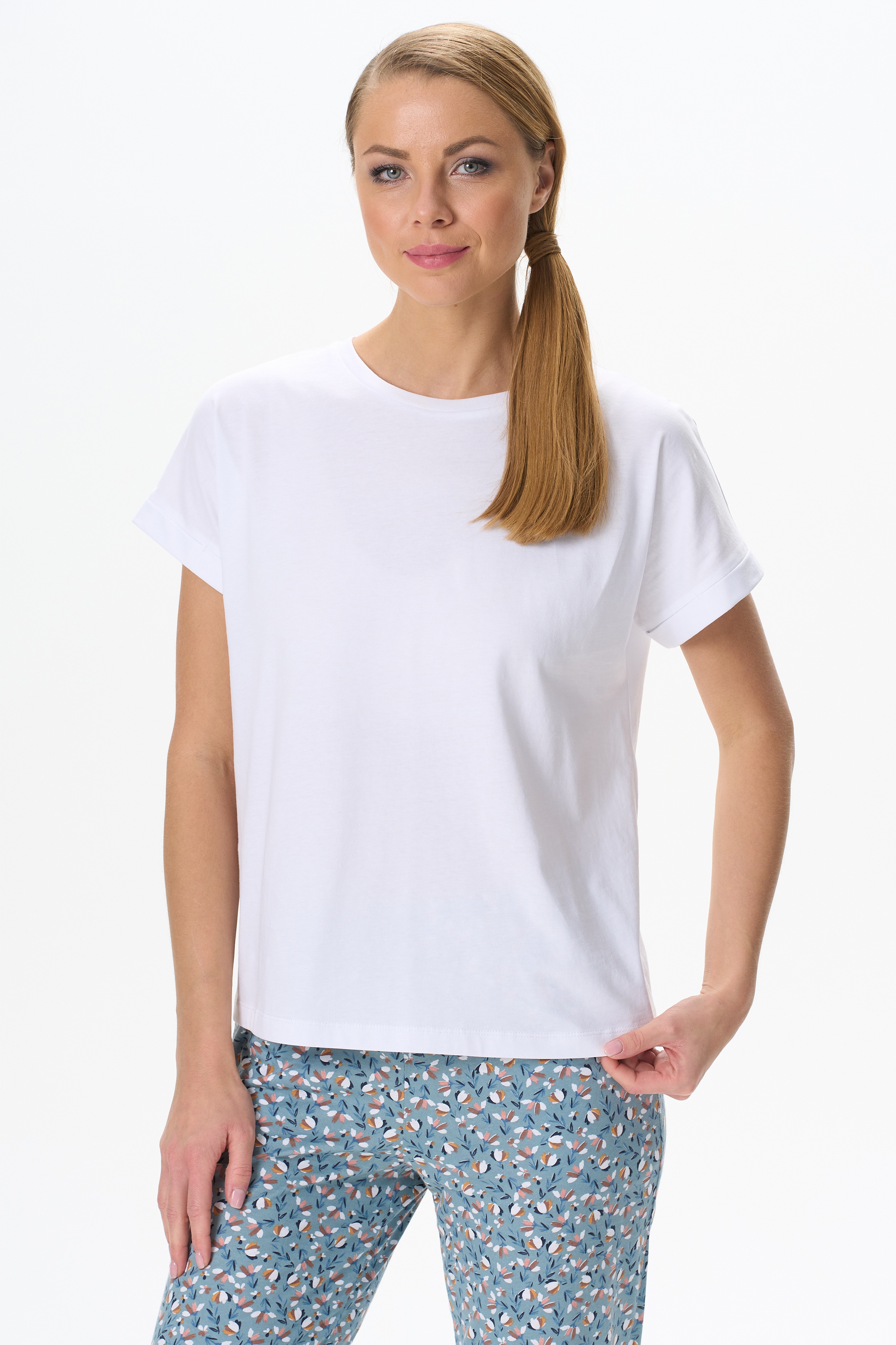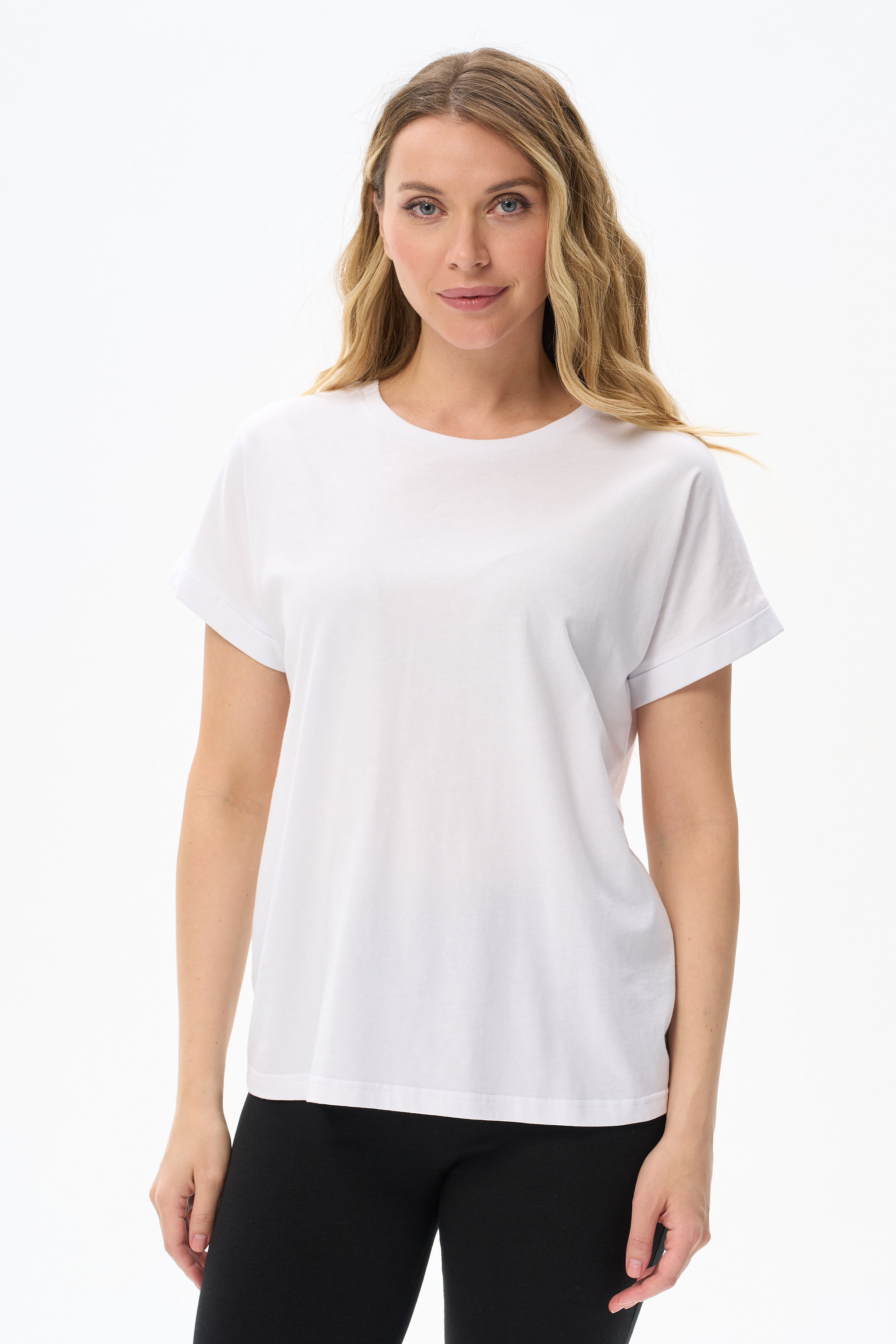 100% хлопок Футболка из хлопкового полотна качества пенье. Круглый вырез горловины окантован хлопковым полотном рибана. Цельнокроеные короткие рукава с отворотами. Рост модели на фото 175 см.
