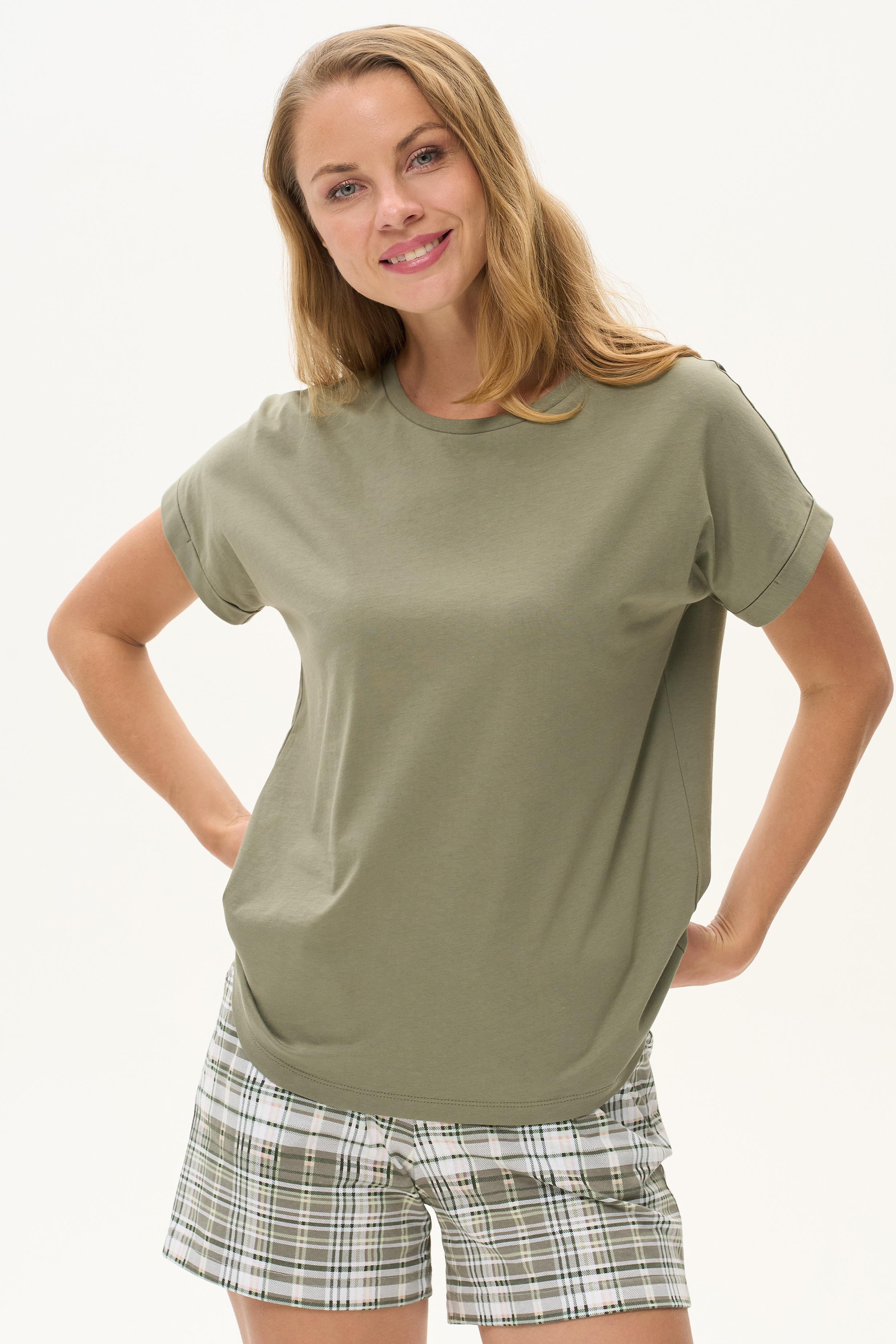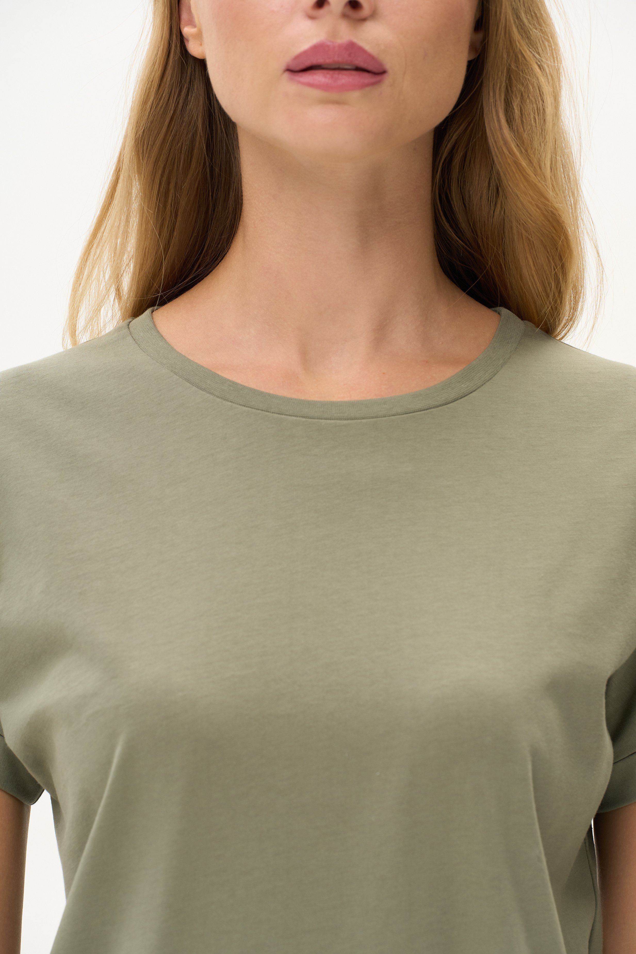 100% хлопок Базовая однотонная футболка из кулирки качества ПЕ150 гр. в оттенке Олива. Модель свободная, прямого силуэта, круглый вырез горловины обработан рибаной, цельнокроеные короткие рукава с зафиксированным подворотом. Удобная, повседневная модель. Рост модели 175 см