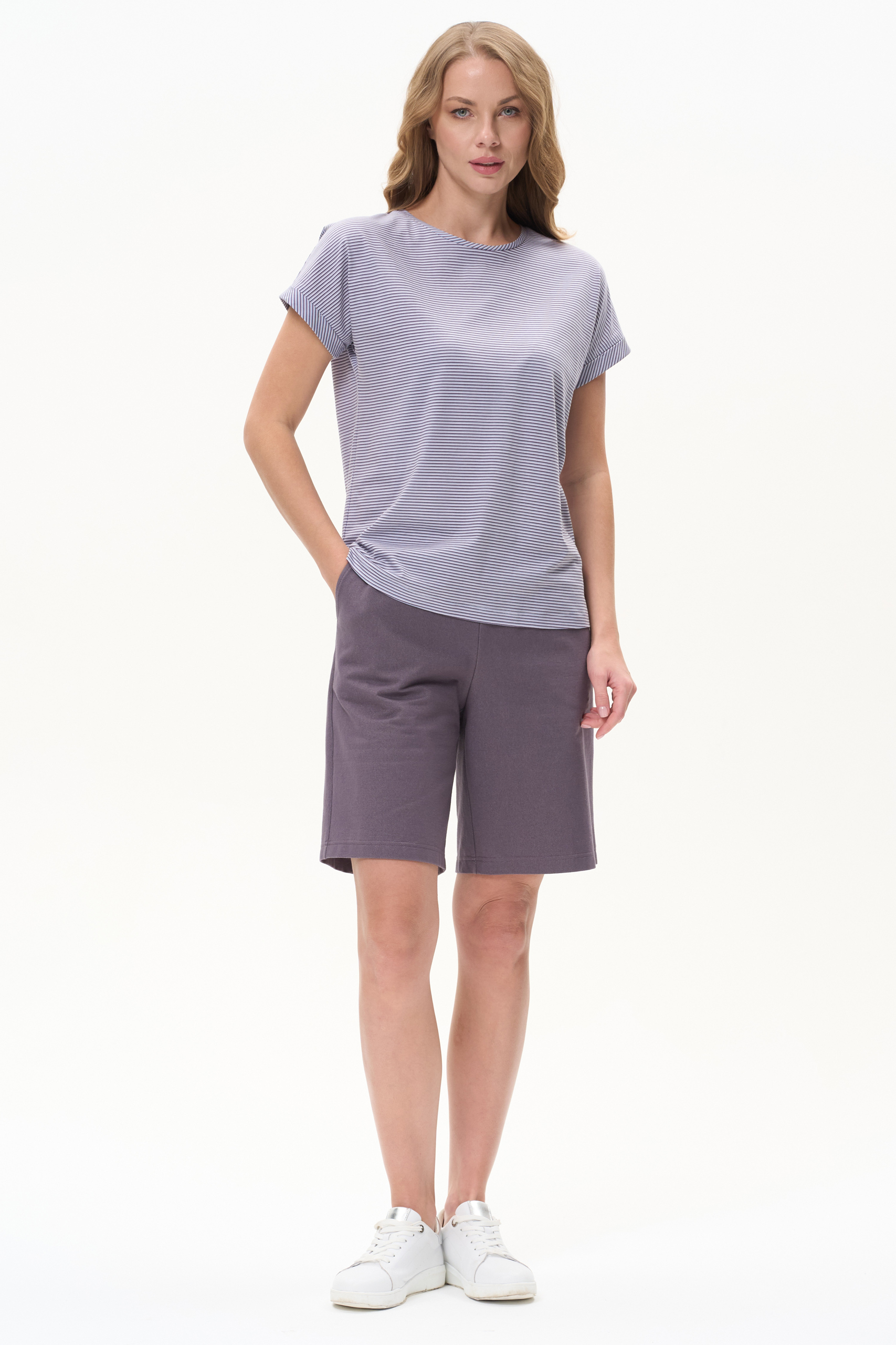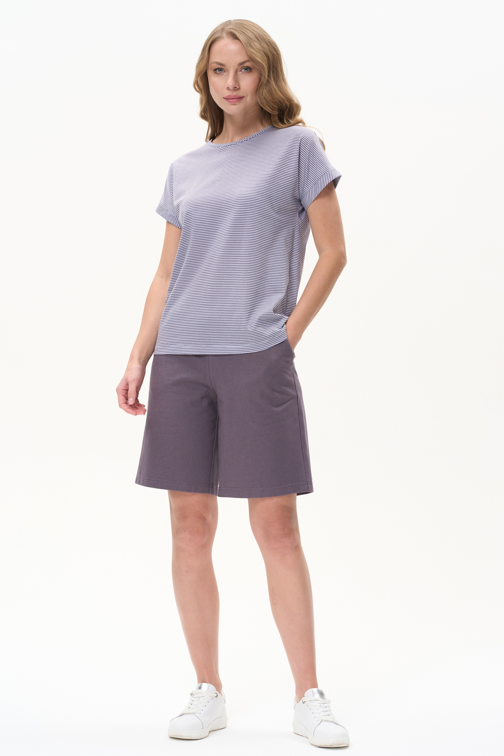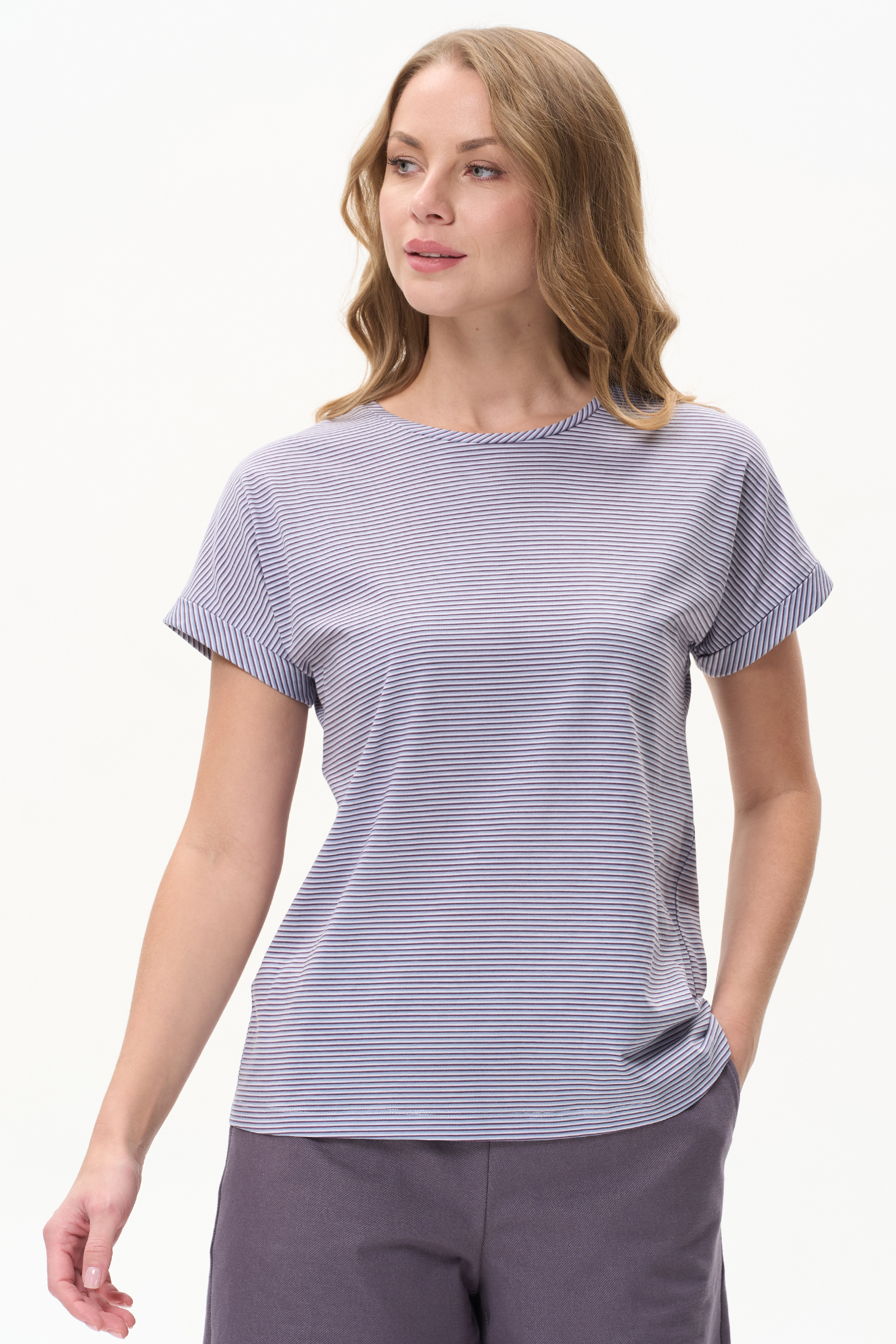 100% хлопок Повседневная базовая футболка в тонкую полоску в оттенках коллекции из хлопкового полотна качества пенье 150 гр. Модель с круглым вырезом горловины и цельнокроеными короткими рукавами с подворотом. Рост модели 175 см