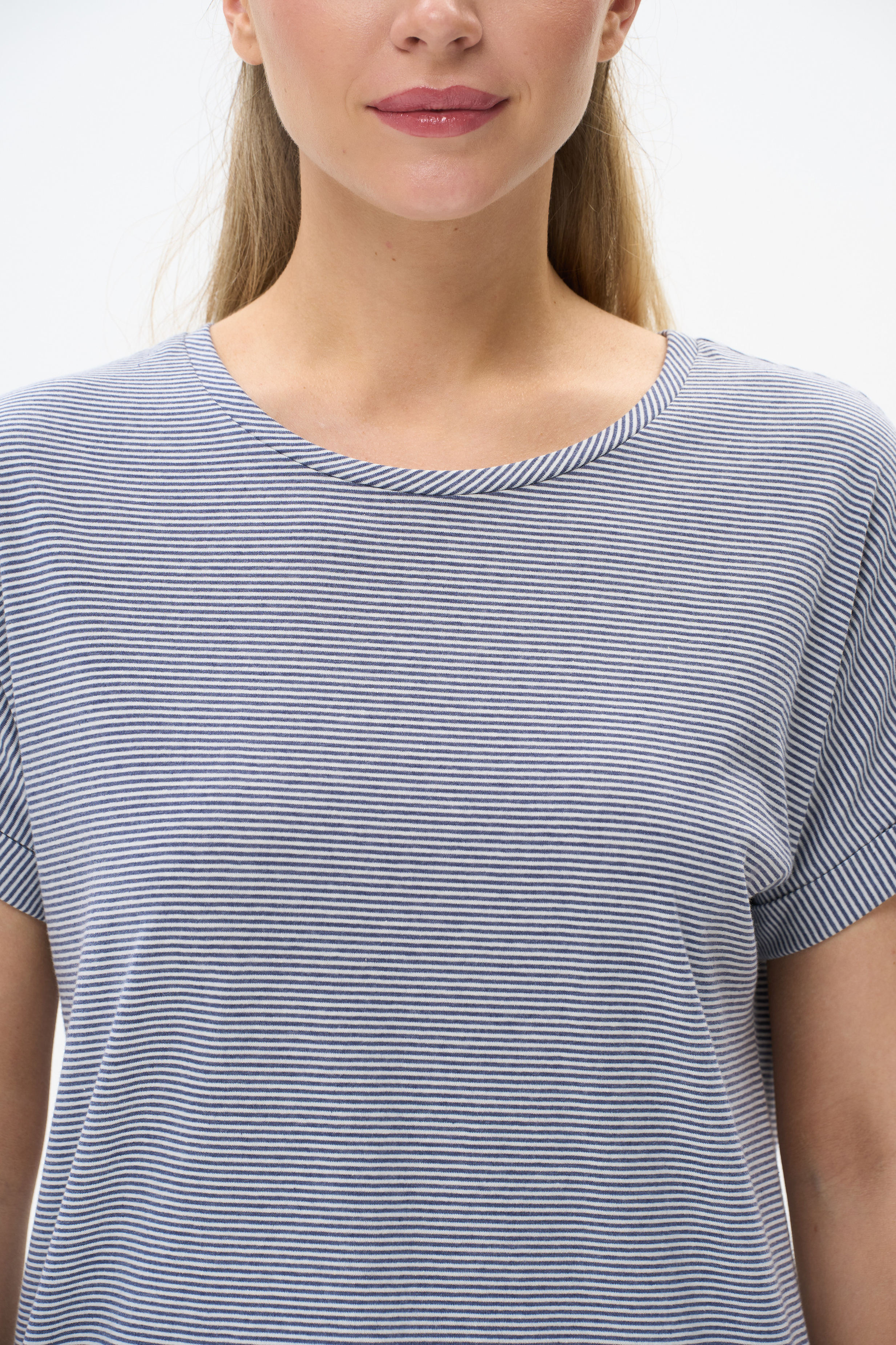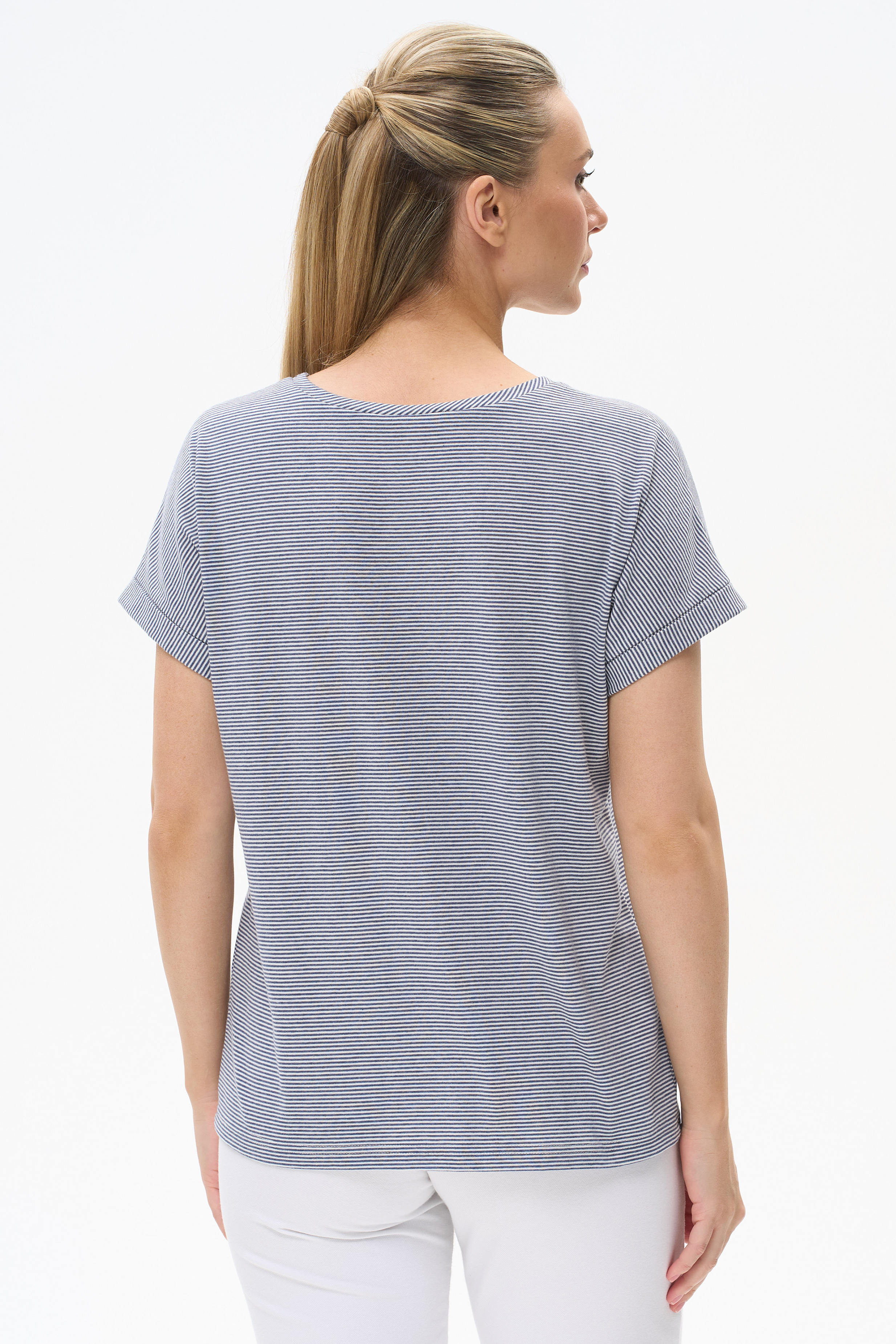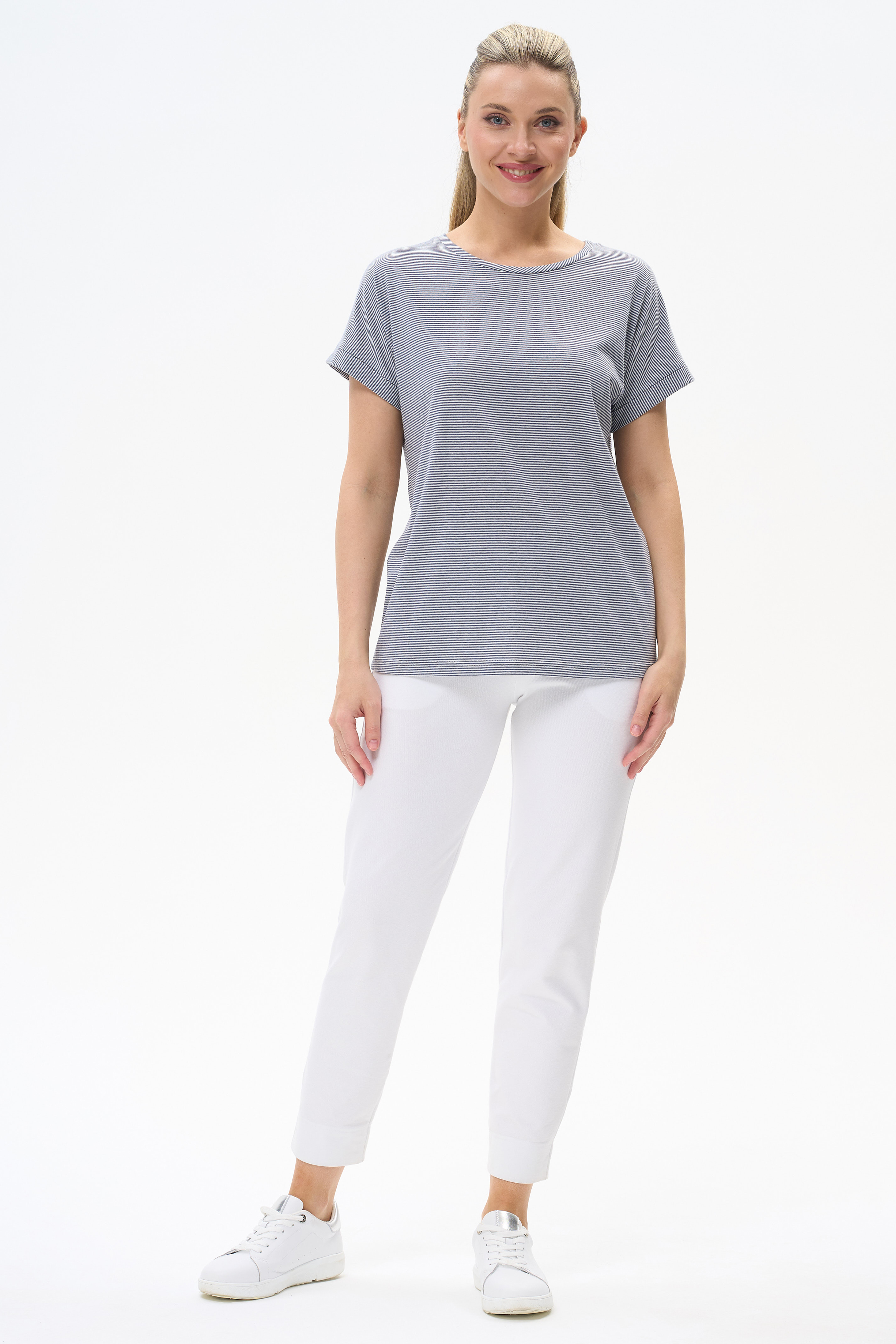 92% хлопок, 8% полиэстер Повседневная базовая футболка в тонкую полоску в оттенках коллекции из хлопкового полотна качества пенье 150 гр с добавлением ПЭ для придания мягкости и формоустойчивости полотна. Модель с круглым вырезом горловины и цельнокроеными короткими рукавами с зафиксированным подворотом. Рост модели 175 см.