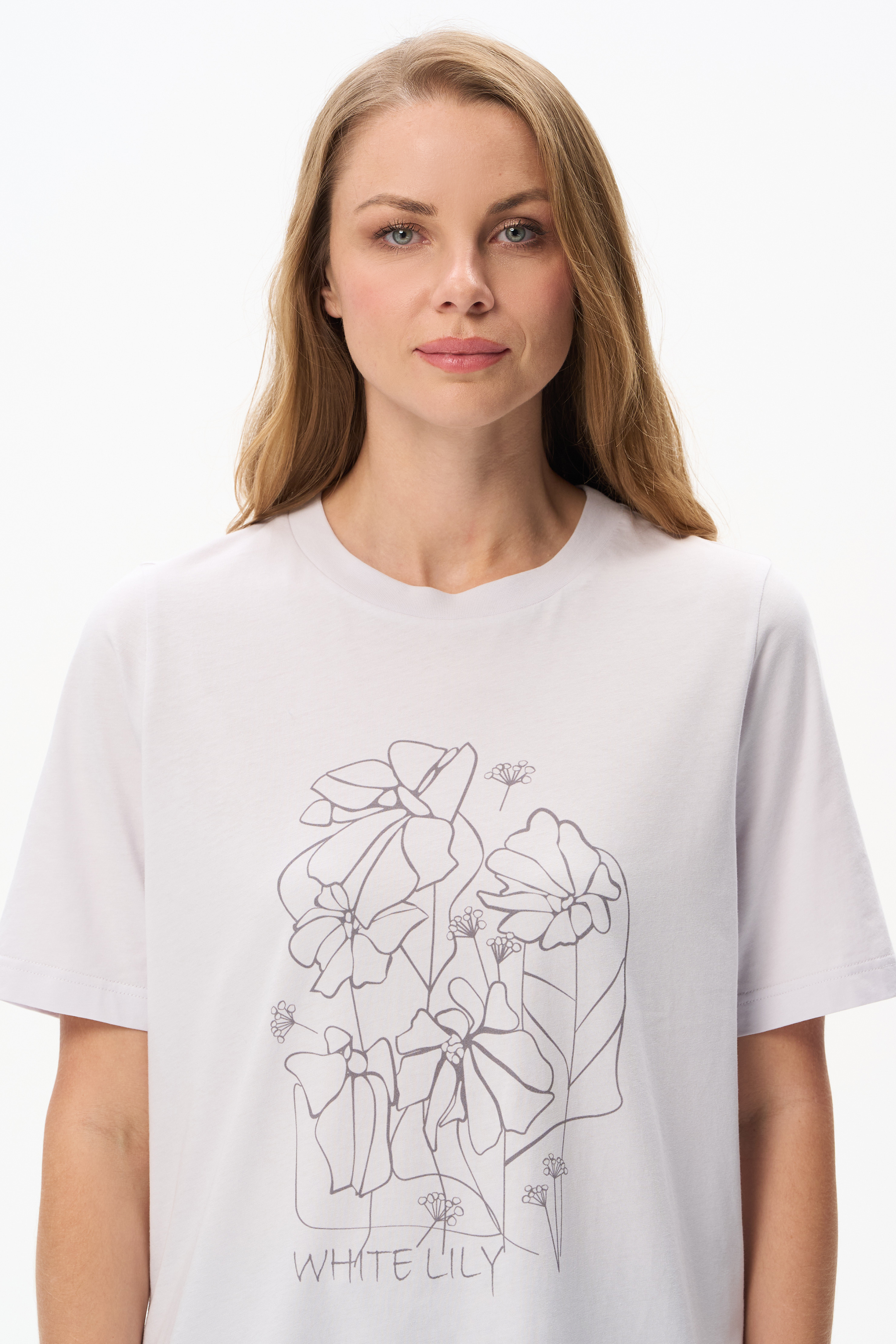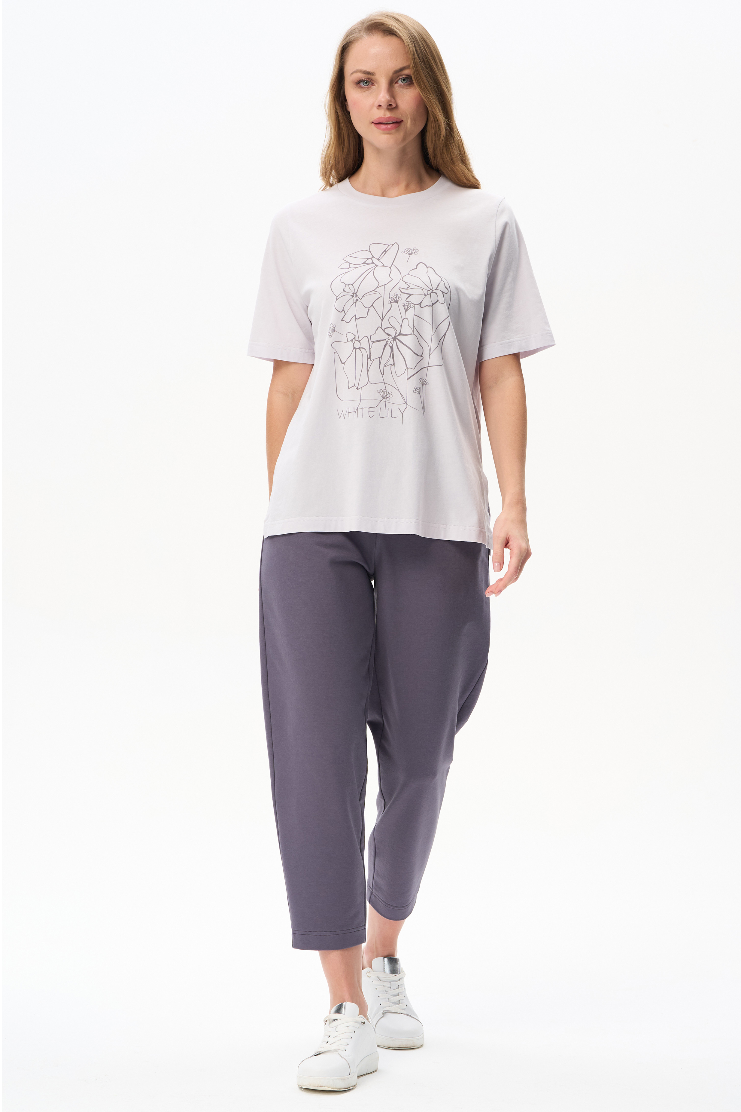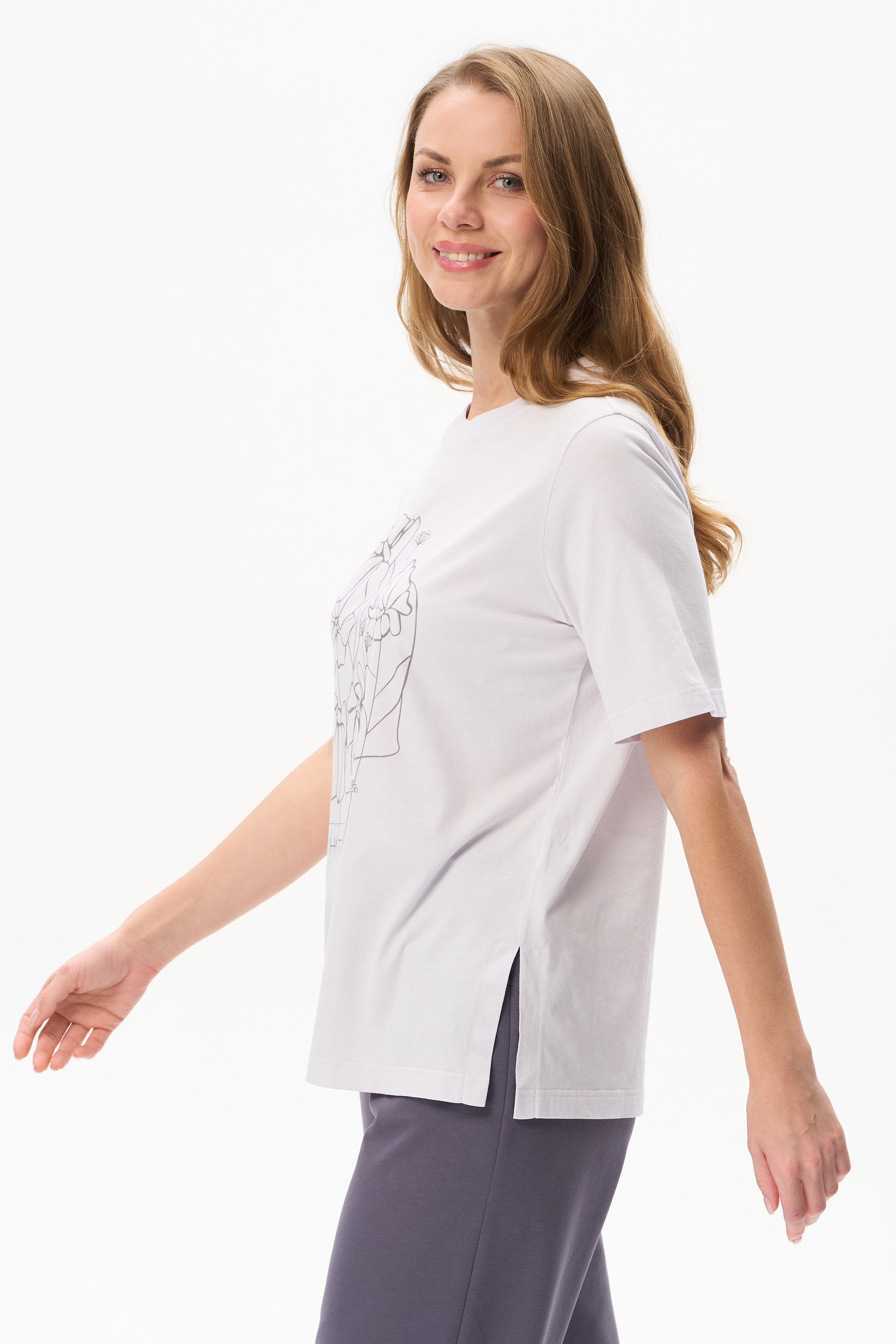 100% хлопок Базовая футболка из кулирки пенье красивого Жемчужного оттенка. Втачной рукав до локтя, круглый вырез горловины, по бокам разрезы. Крупный изящный принт придает модели актуальность и позволяет сочетать с брюками в цвет принта. Рост модели 175 см.