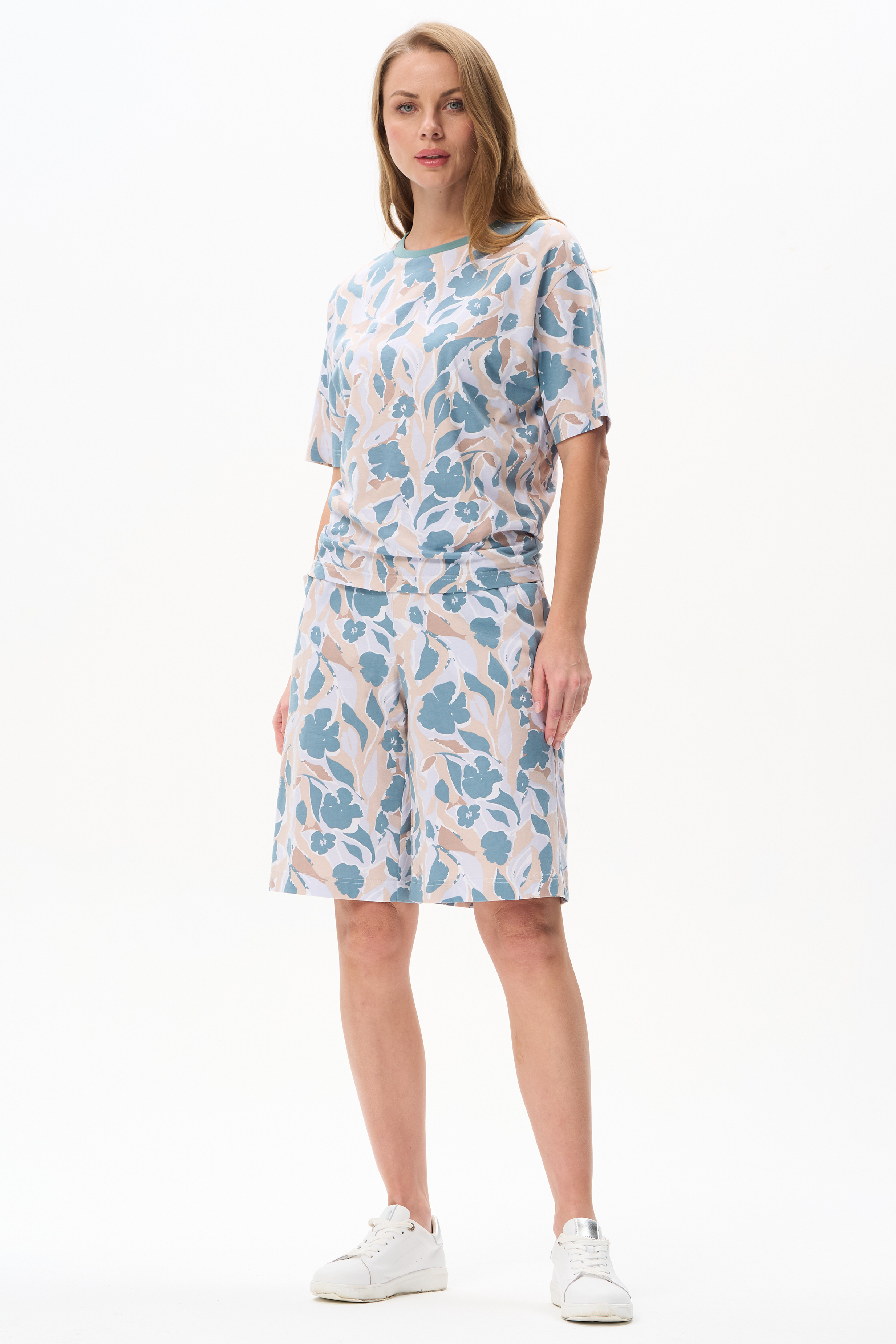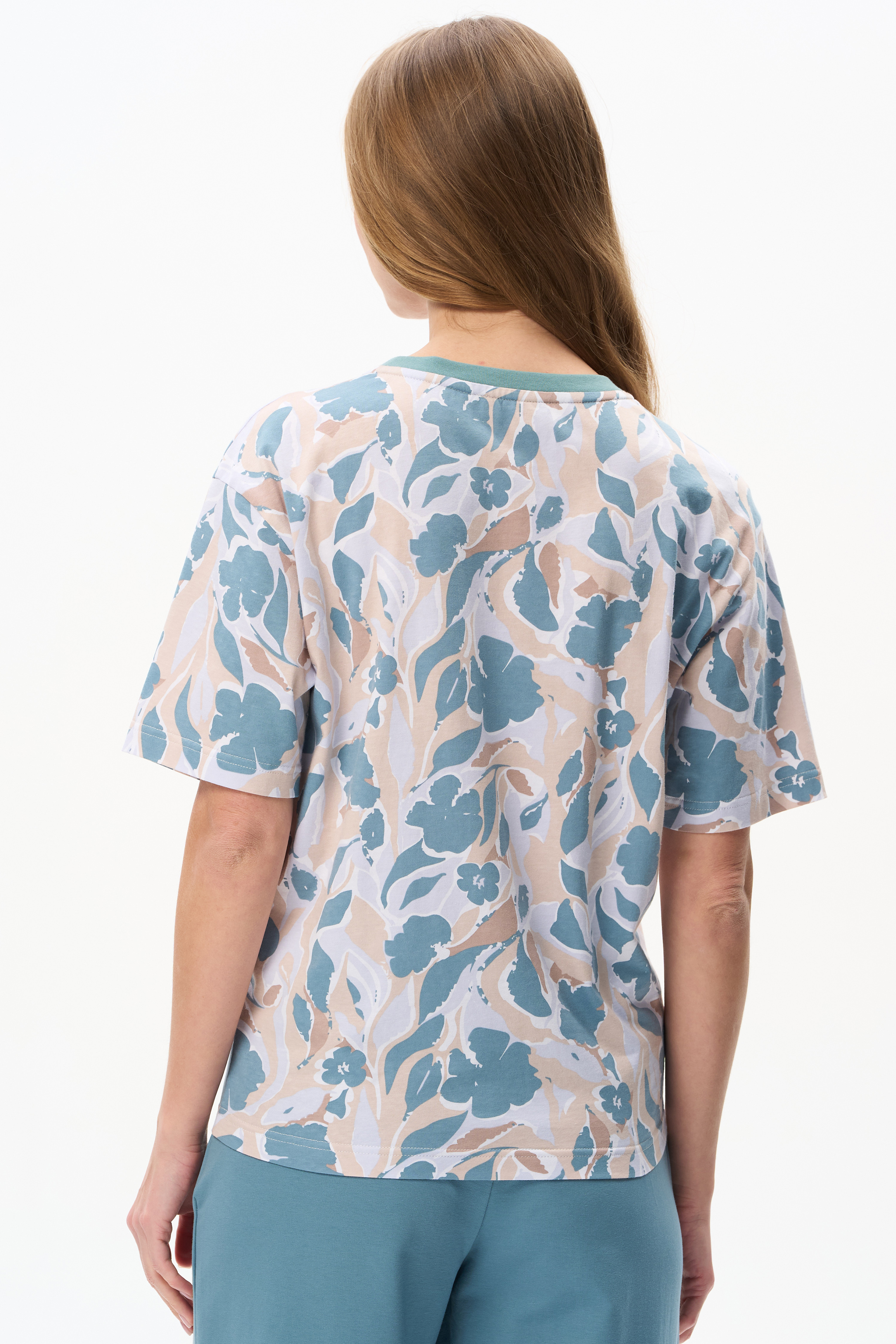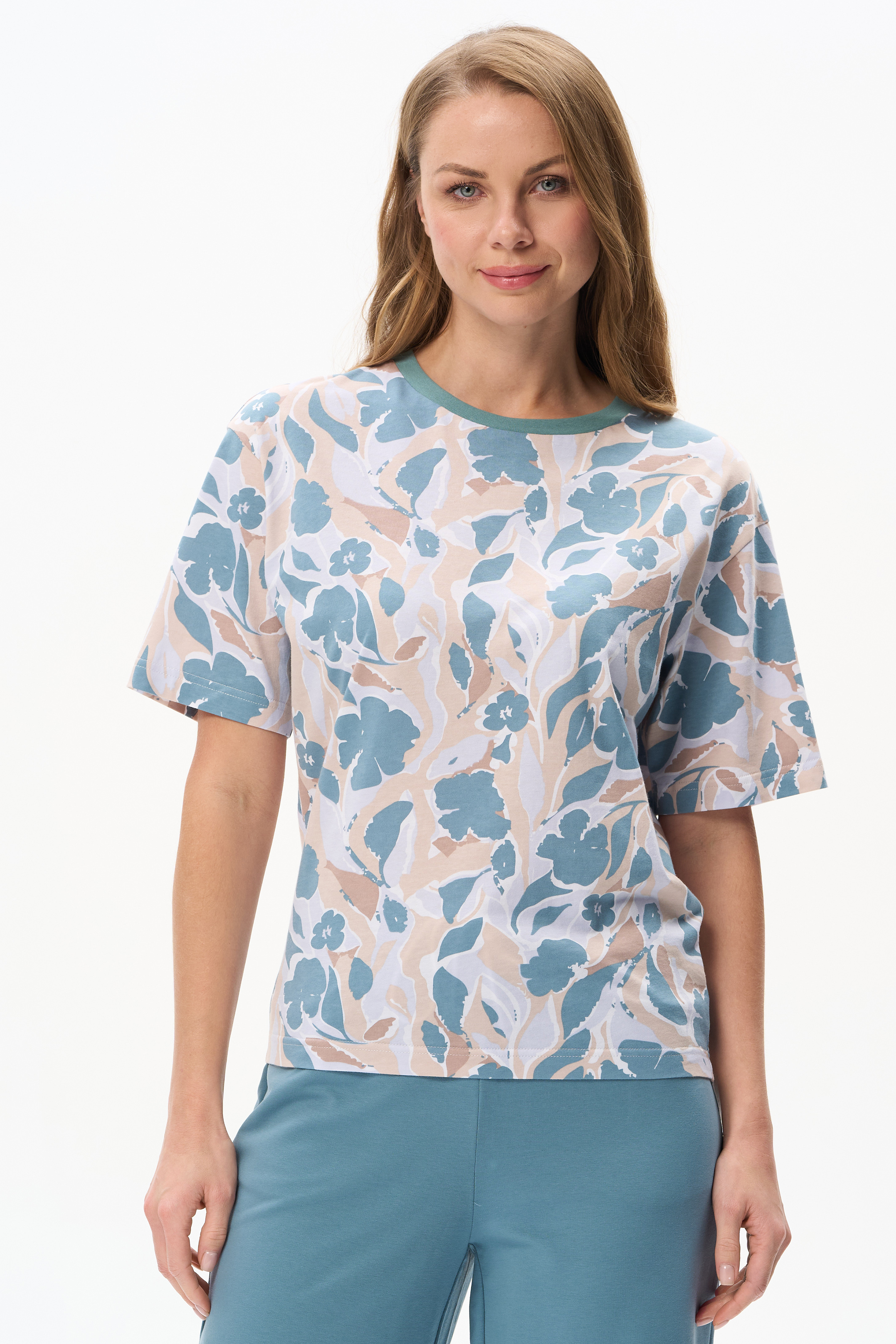 100% хлопок Эффектная футболка нового силуэта - свободная в плечевом поясе и прилегающая по бедрам, из кулирки 150 гр c дизайнерским рисунком - Цветочная абстракция в приятных оттенках. Модель со спущенным плечом, рукава до локтя, круглая горловина из контрастной рибаны. Рост модели 175 см
