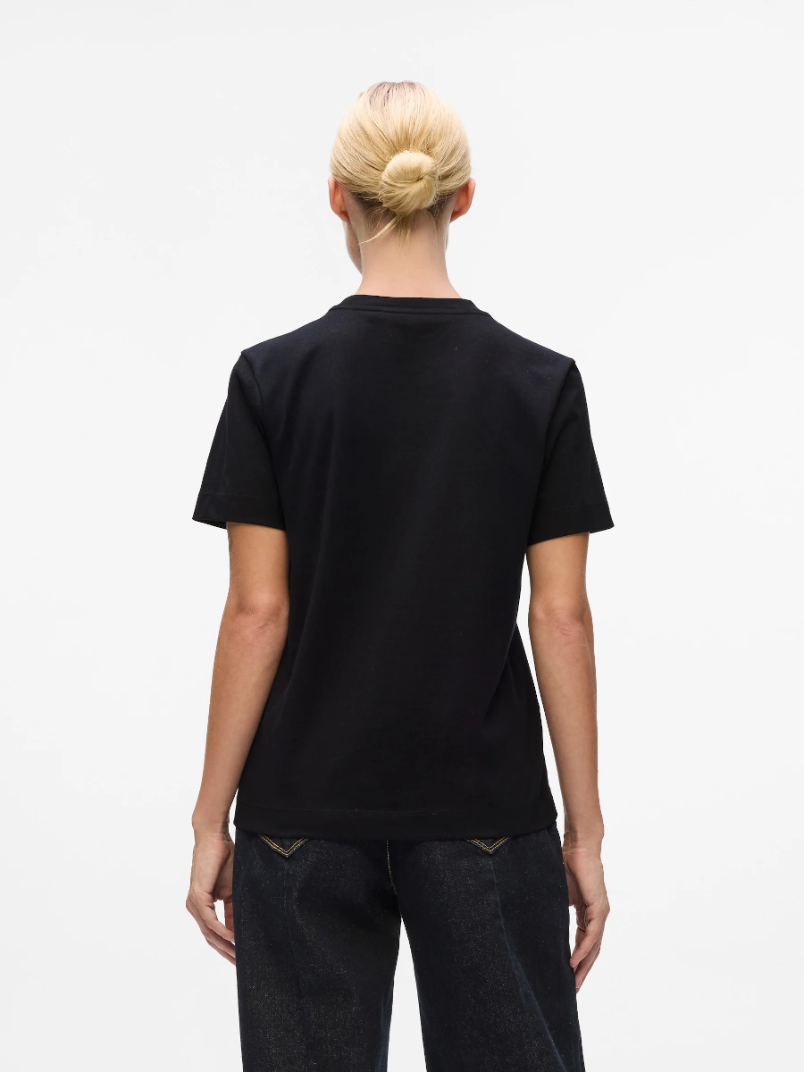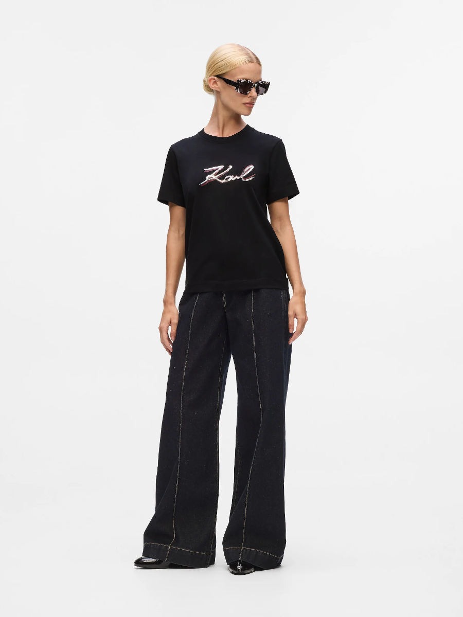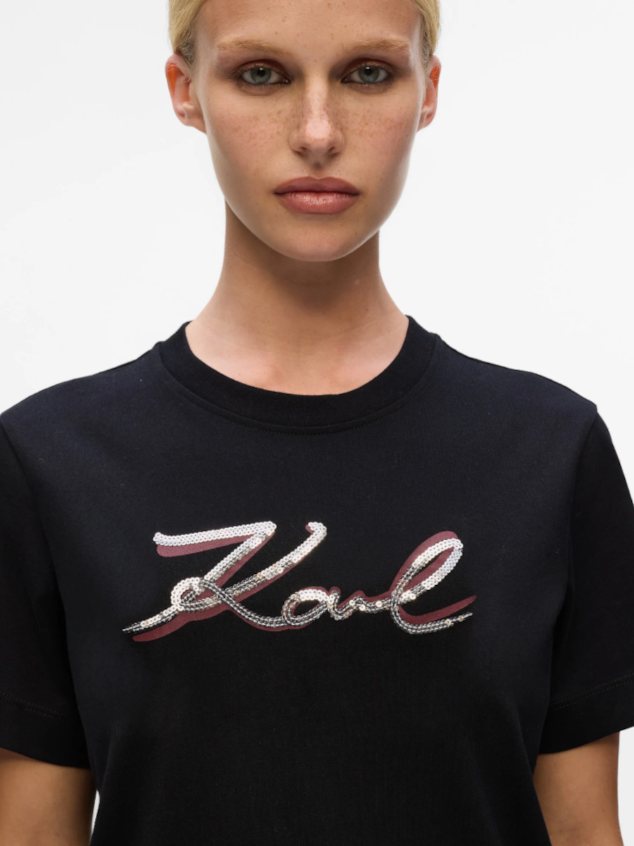 с классическим круглым вырезом и воздушными короткими рукавами, а также фирменным логотипом, украшенным пайетками, на груди.