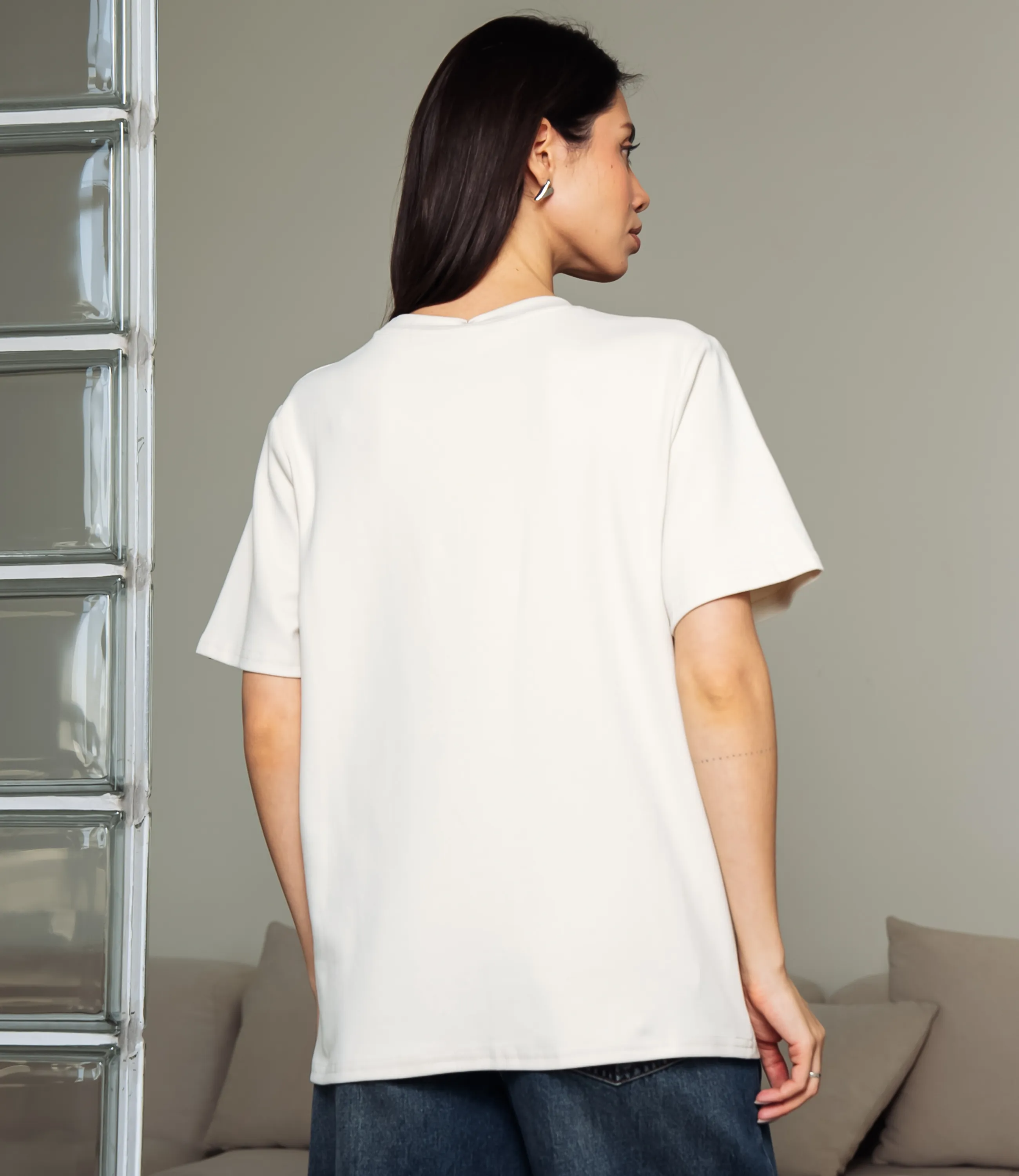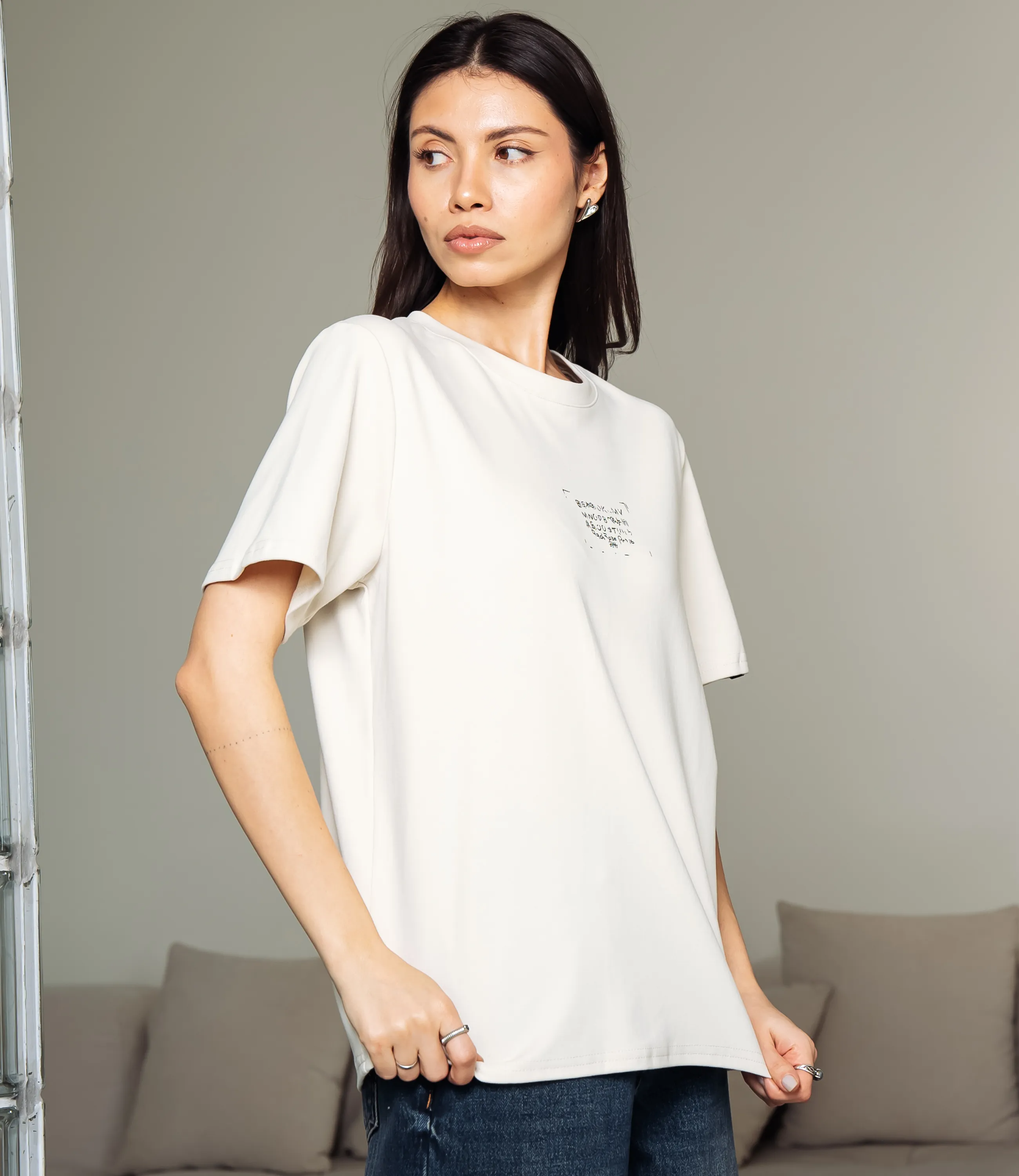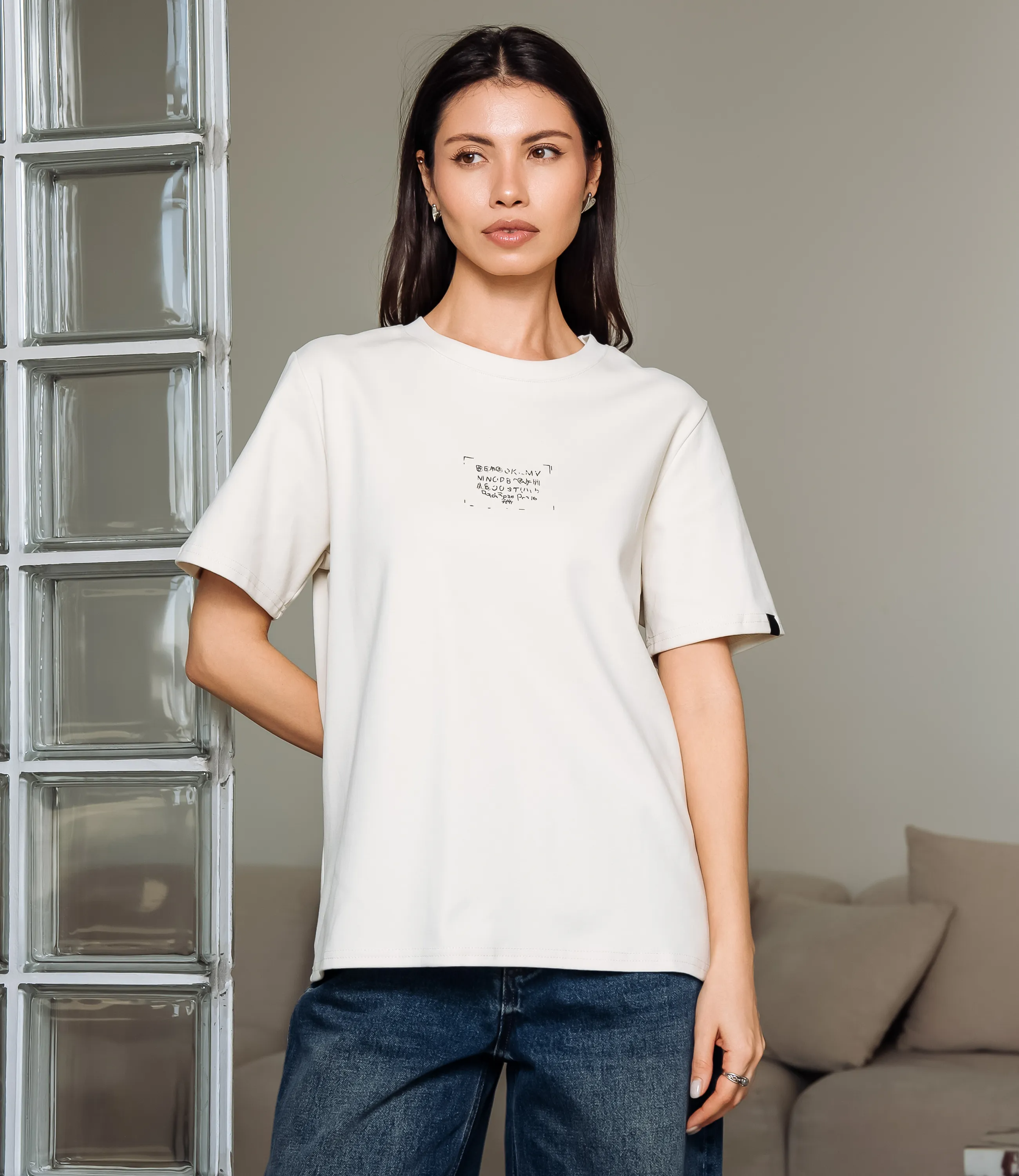 Эта футболка — прекрасный выбор для вашего магазина, предлагая стильный и универсальный дизайн, который станет отличным дополнением к гардеробу ваших клиентов. Футболка прямого свободного кроя с классическим круглым вырезом горловины и короткими рукавами стандартной длины, выполнена из плотного трикотажного полотна с мягкой, слегка матовой фактурой, плечевые швы расположены по линии плеч, рукава имеют равномерный, не заострённый край без отворотов; передняя деталь украшена небольшим прямоугольным принтом в области центра груди с мелким декоративным текстом и тонкой рамкой. Выполненная из ткани с 95% хлопка, 5% спандекс, футболка обеспечивает отличное качество и приятные тактильные ощущения. Независимо от сезона, она станет любимым элементом в гардеробе ваших клиентов. На странице сайта доступна таблица размеров, что позволит вашим покупателям легко найти подходящий вариант. Установленная цена делает эту футболку доступной для широкой аудитории, что обеспечит вам высокий уровень продаж. Рост модели: 164, параметры: 83-61-89.