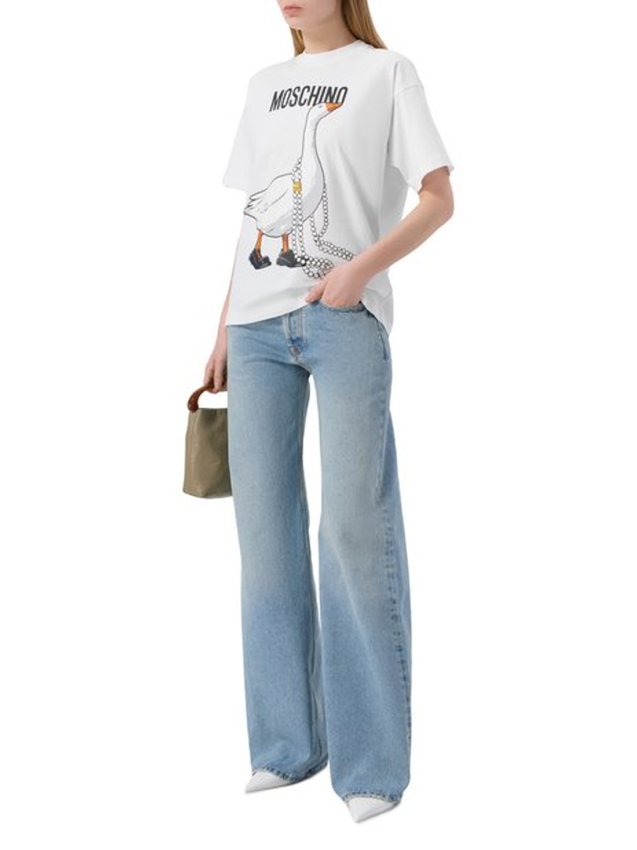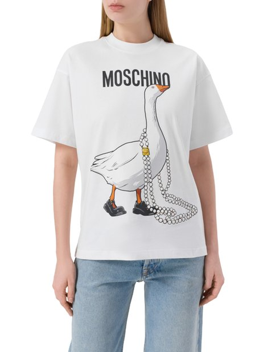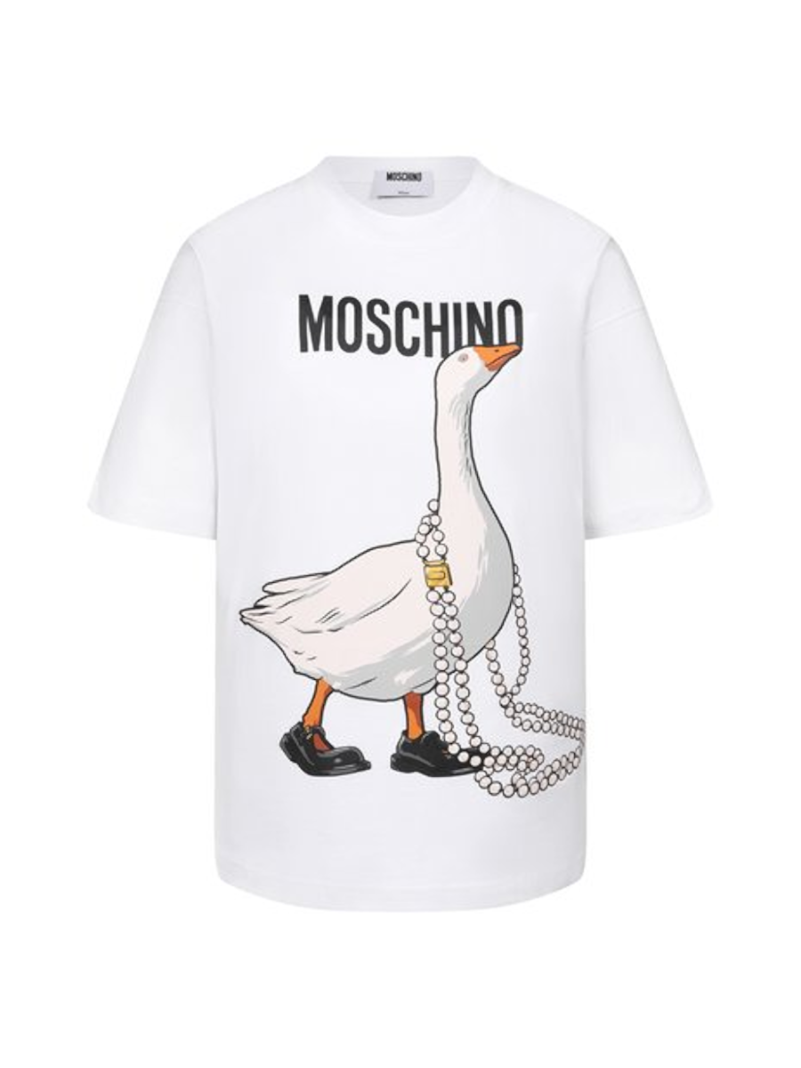 Спереди модель декорировали крупным логотипом и принтом в виде гуся в фирменных туфлях и длинных жемчужных бусах.