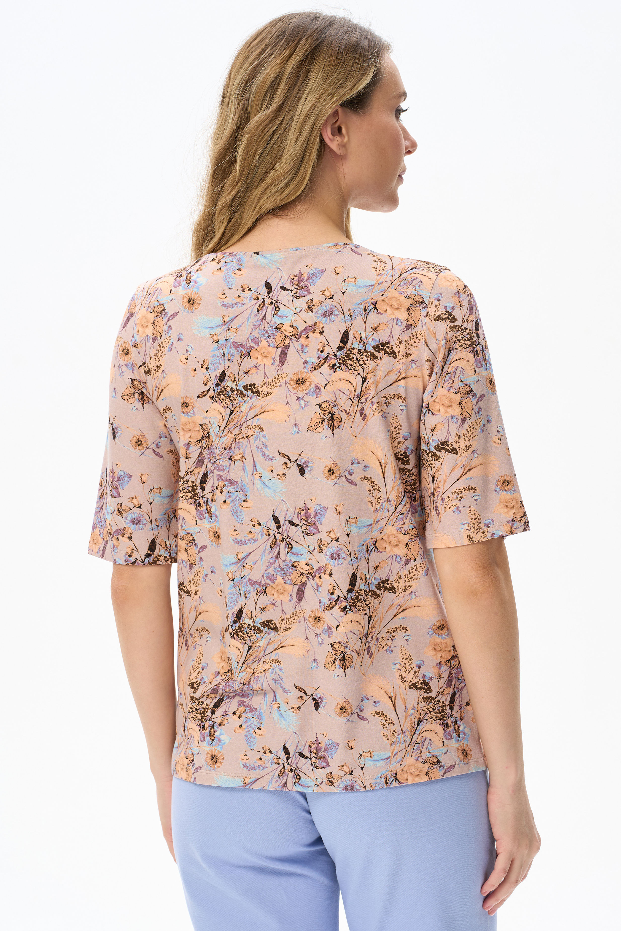 92% вискоза, 8% эластан Блузка из вискозного трикотажного полотна с эластаном. Круглая форма горловины, втачные рукава, длинной до локтя. Рост модели 175 см.