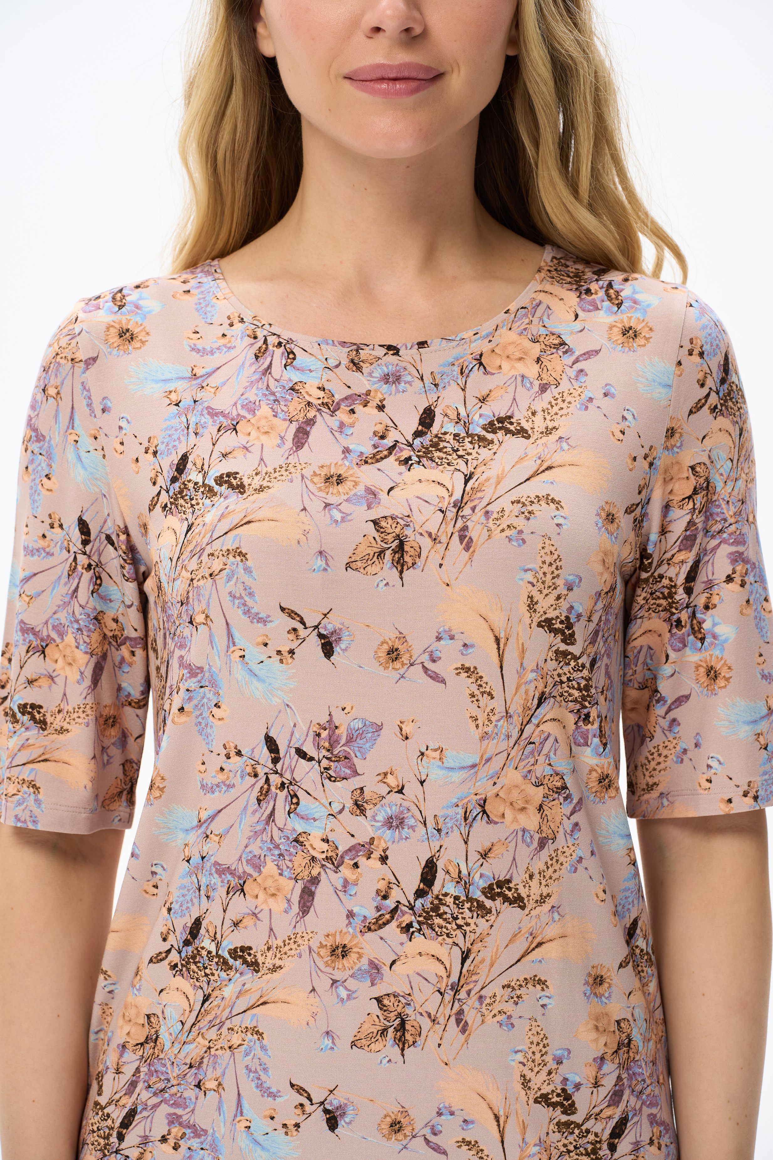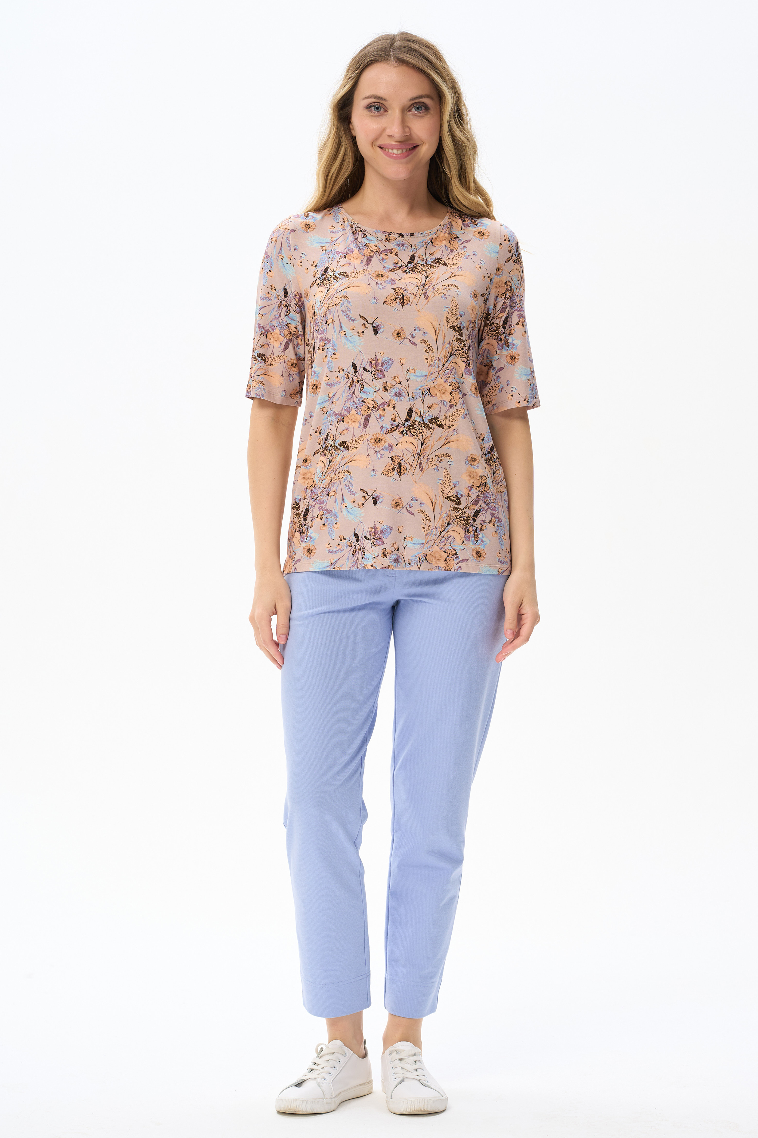 92% вискоза, 8% эластан Блузка из вискозного трикотажного полотна с эластаном. Круглая форма горловины, втачные рукава, длинной до локтя. Рост модели 175 см.