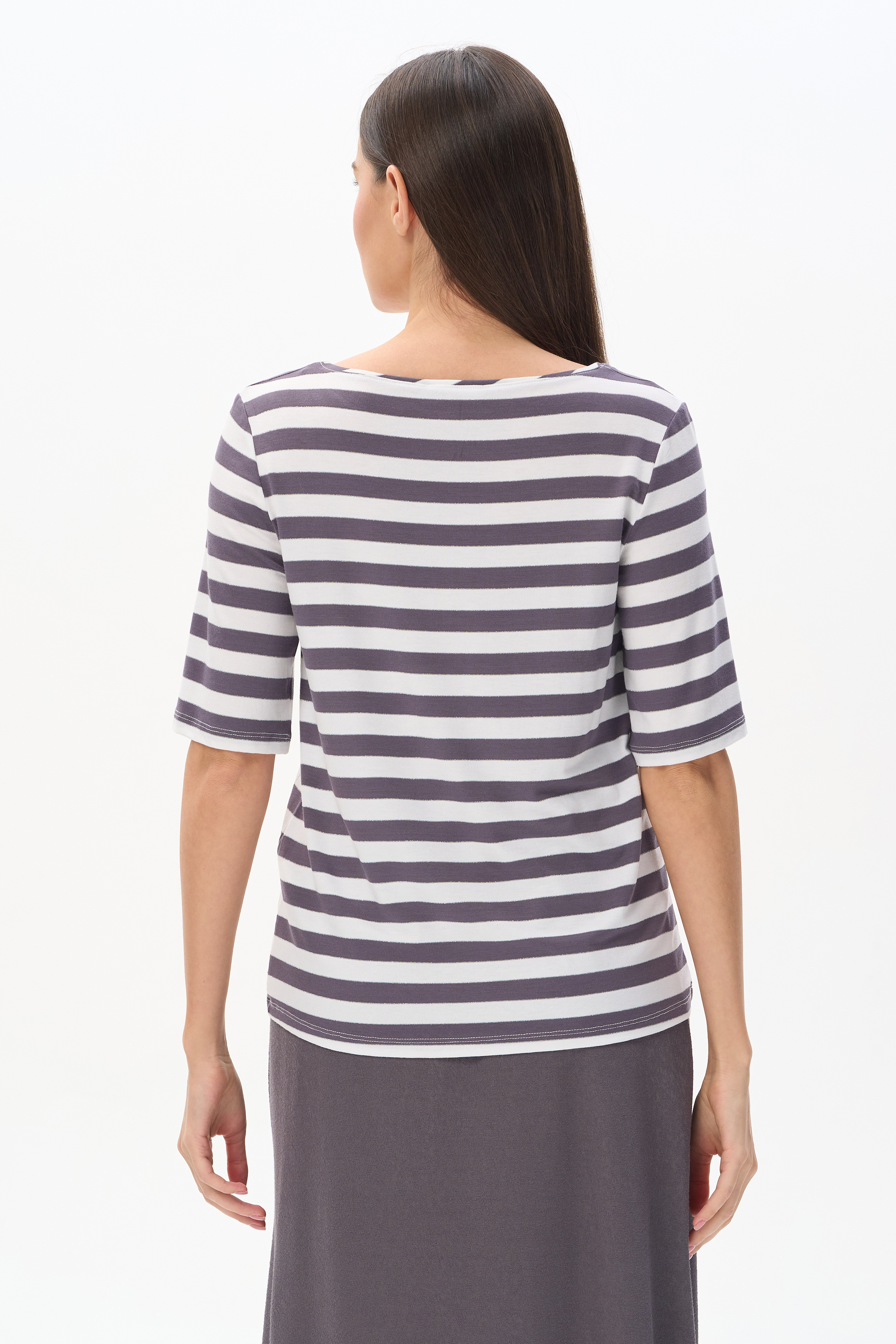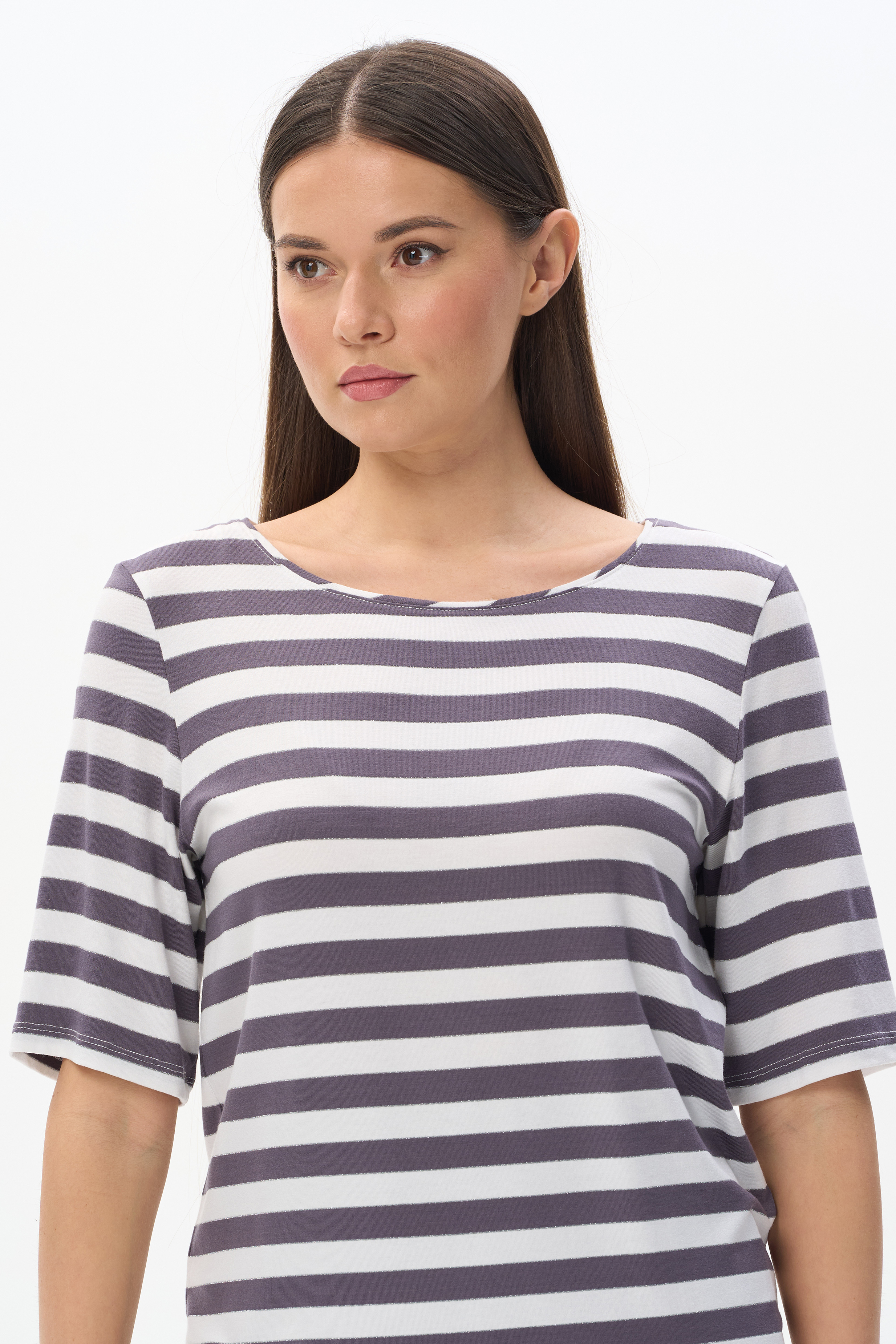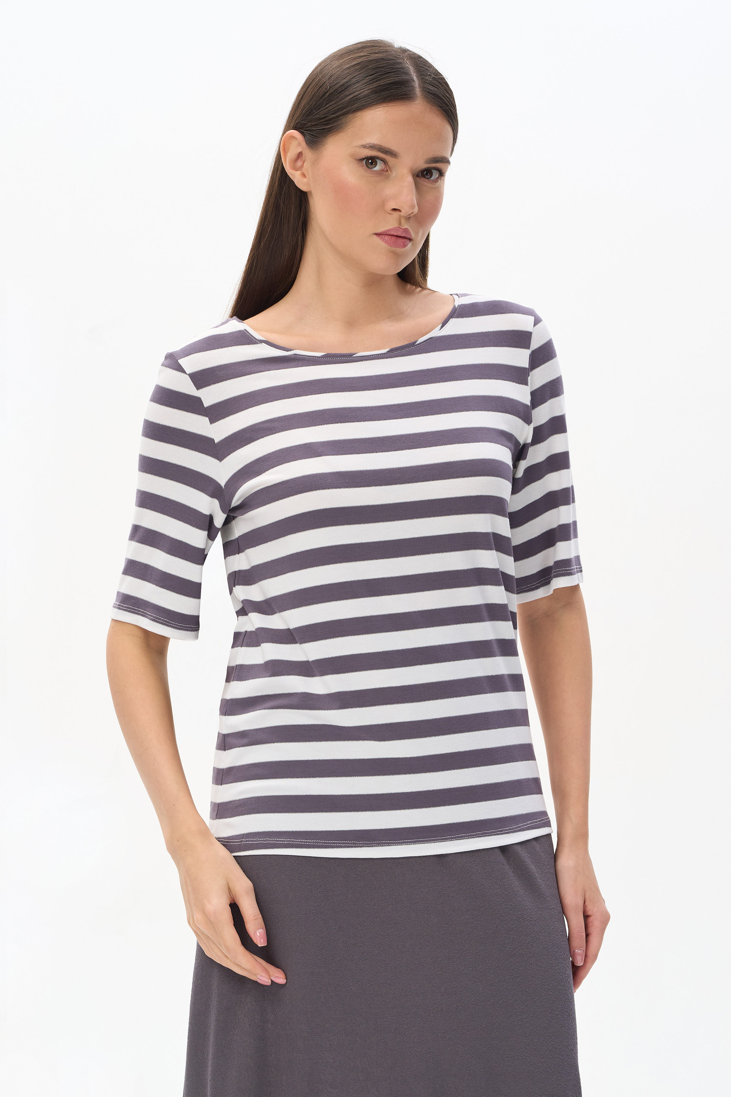 92% вискоза, 8% эластан Блузка из вискозы качества вортекс 200 гр, полоска в оттенках Городской горизонт и Белый песок. Круглая горловина с тонким кантом, втачные рукава до локтя, длина блузки закрывает паховую зону. Тонкая серебристая полоска добавляет изысканности и переводит базовую модель в разряд нарядных изделий. Рост модели 175 см