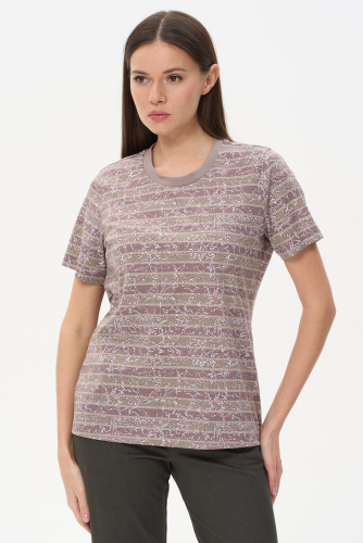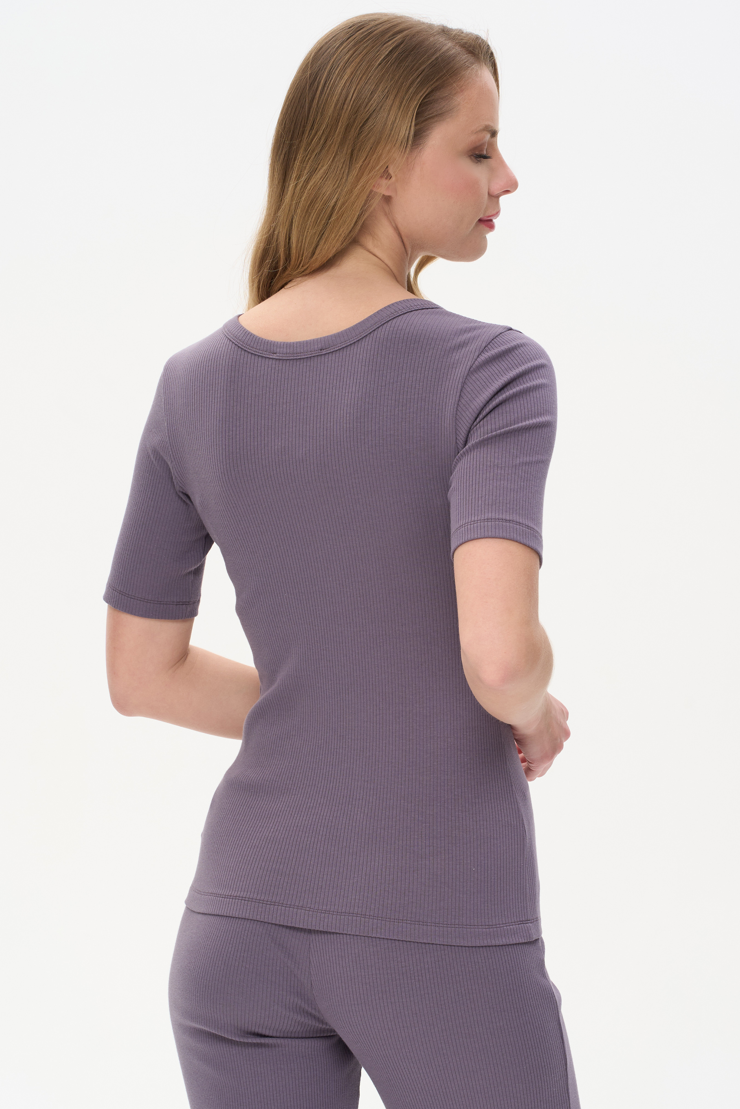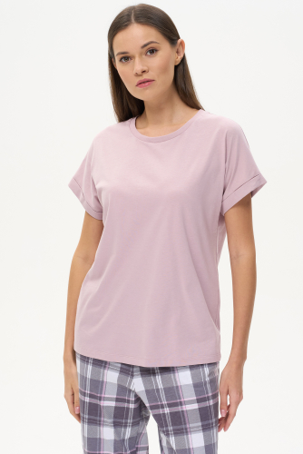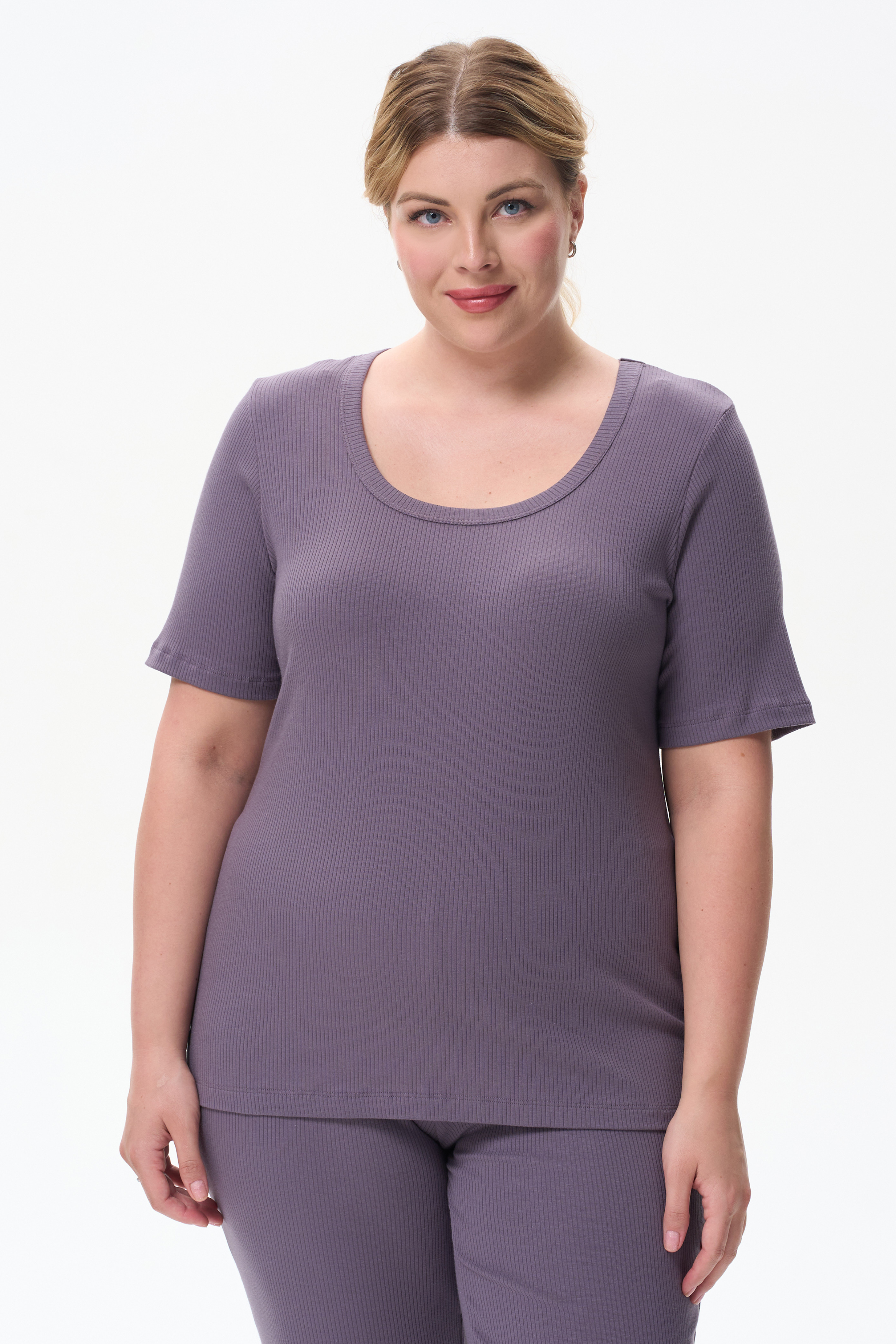 49% хлопок, 49% модал, 2% эластан Футболка из фактурного хлопкового полотна с модалом в трендовом фиалковом оттенке. Модель с комфортным прилеганием и идеальной посадкой. Круглый вырез горловины обработан бейкой, короткие втачные рукава. Универсальная модель для города, отдыха и путешествий. Рост модели 175 см.