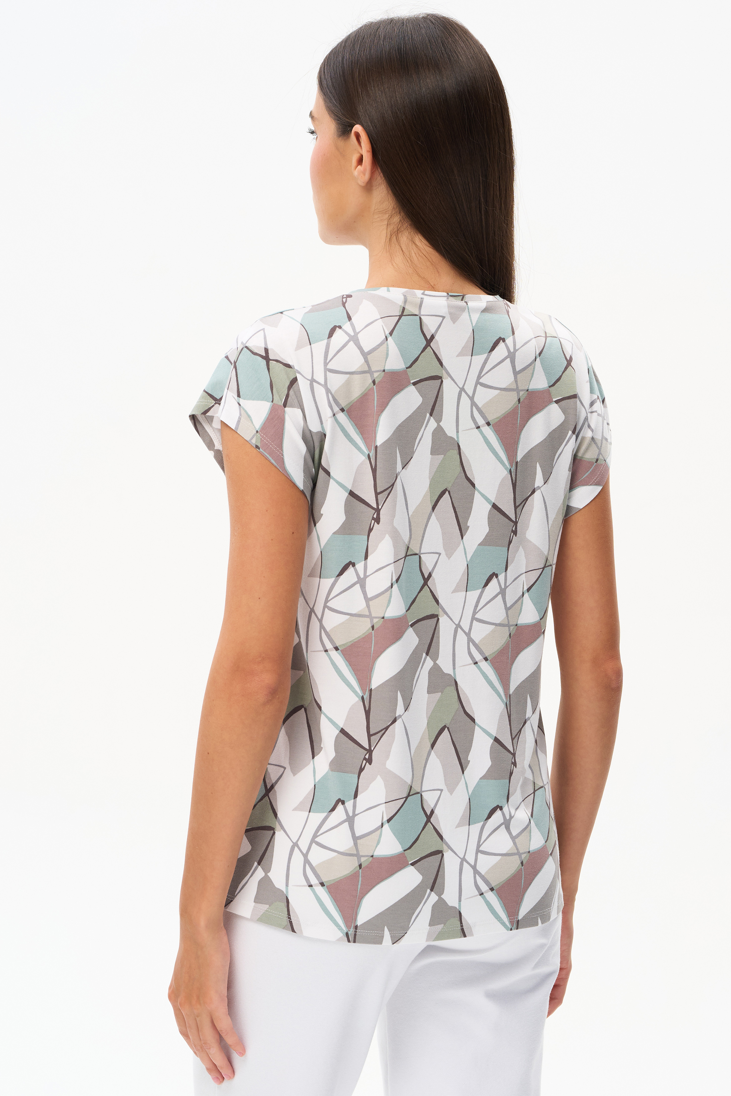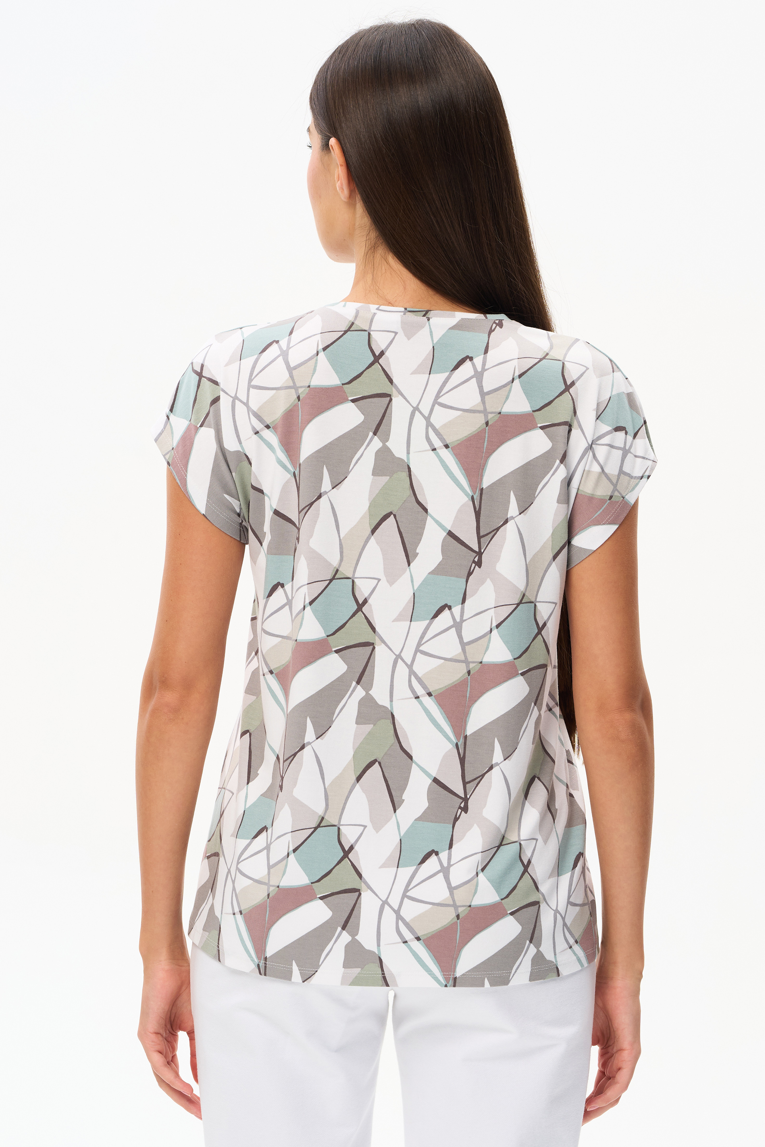 Футболка прямого силуэта из вискозного трикотажного полотна с эластаном. Круглый вырез горловины, цельнокроеные короткие рукава. Рост модели 175 см.