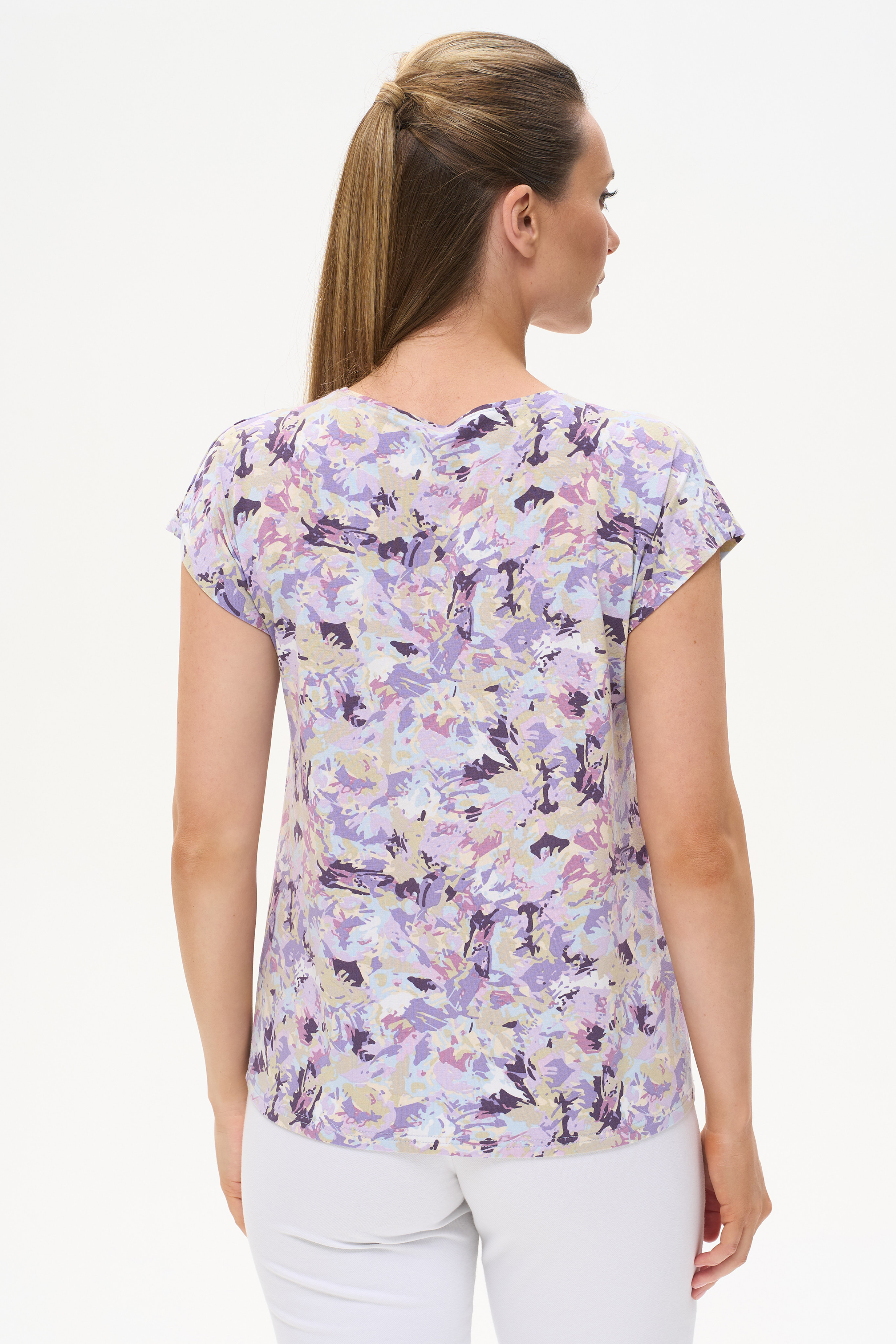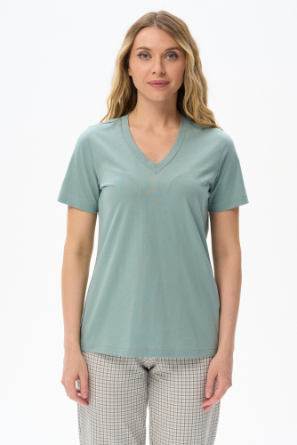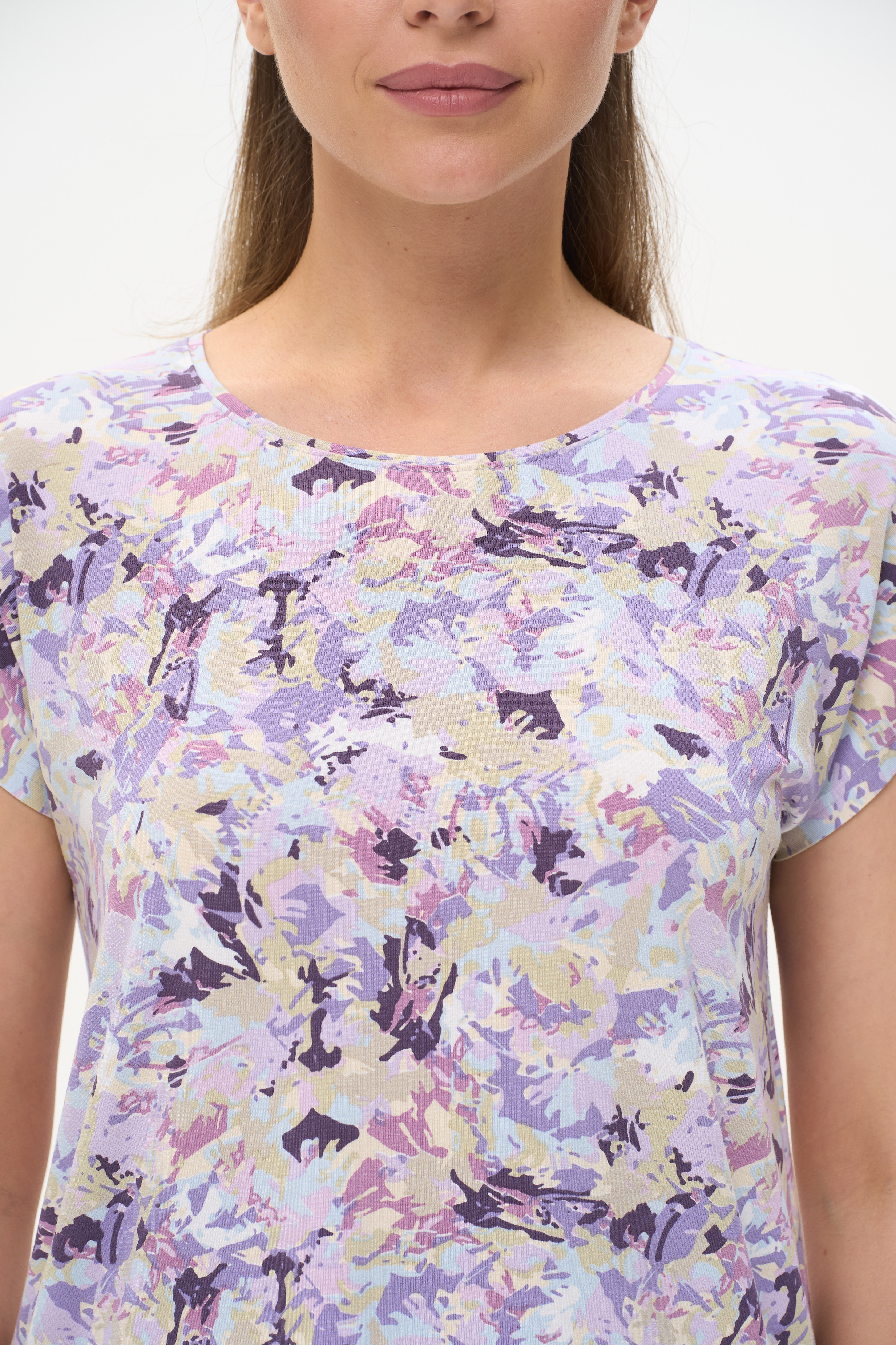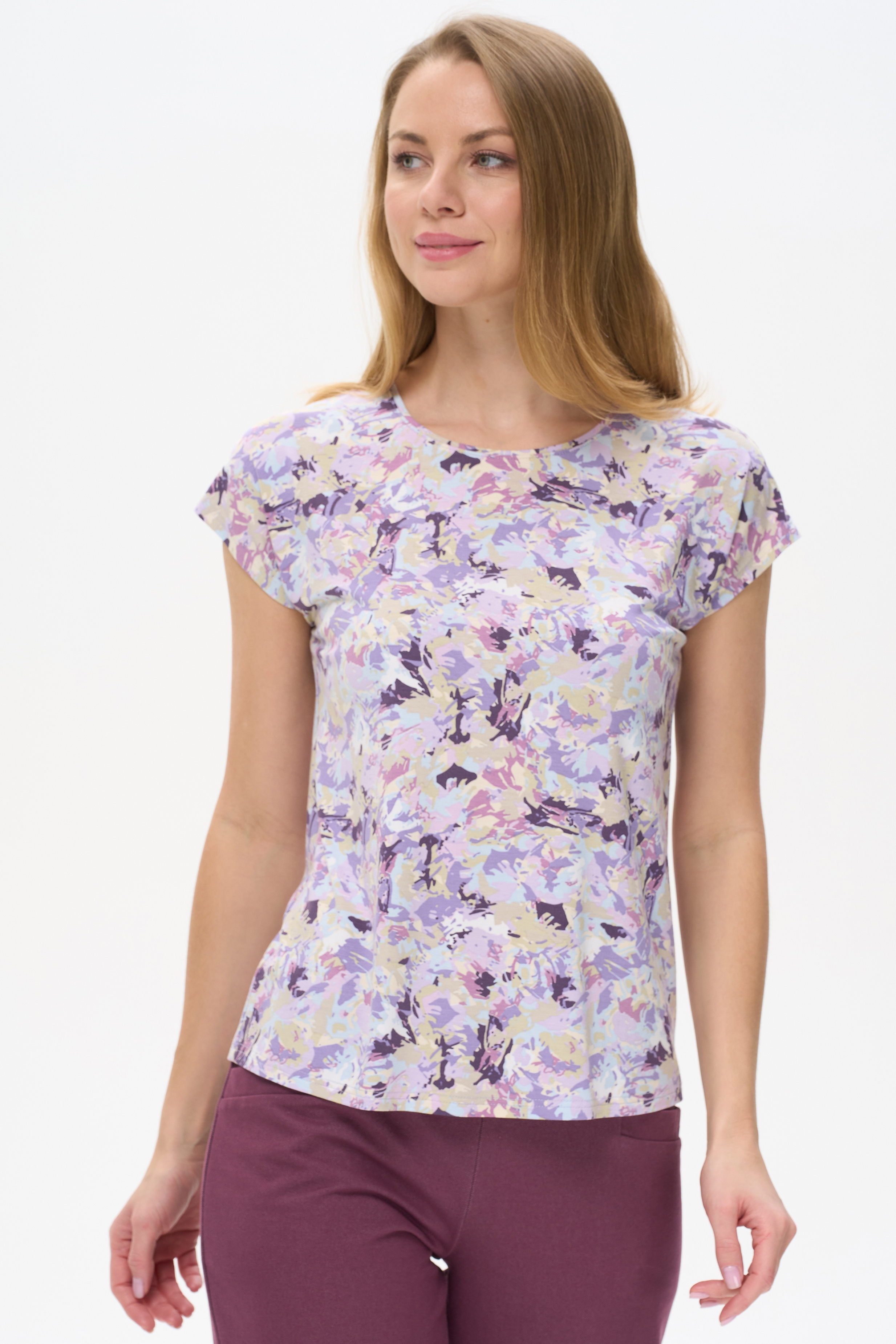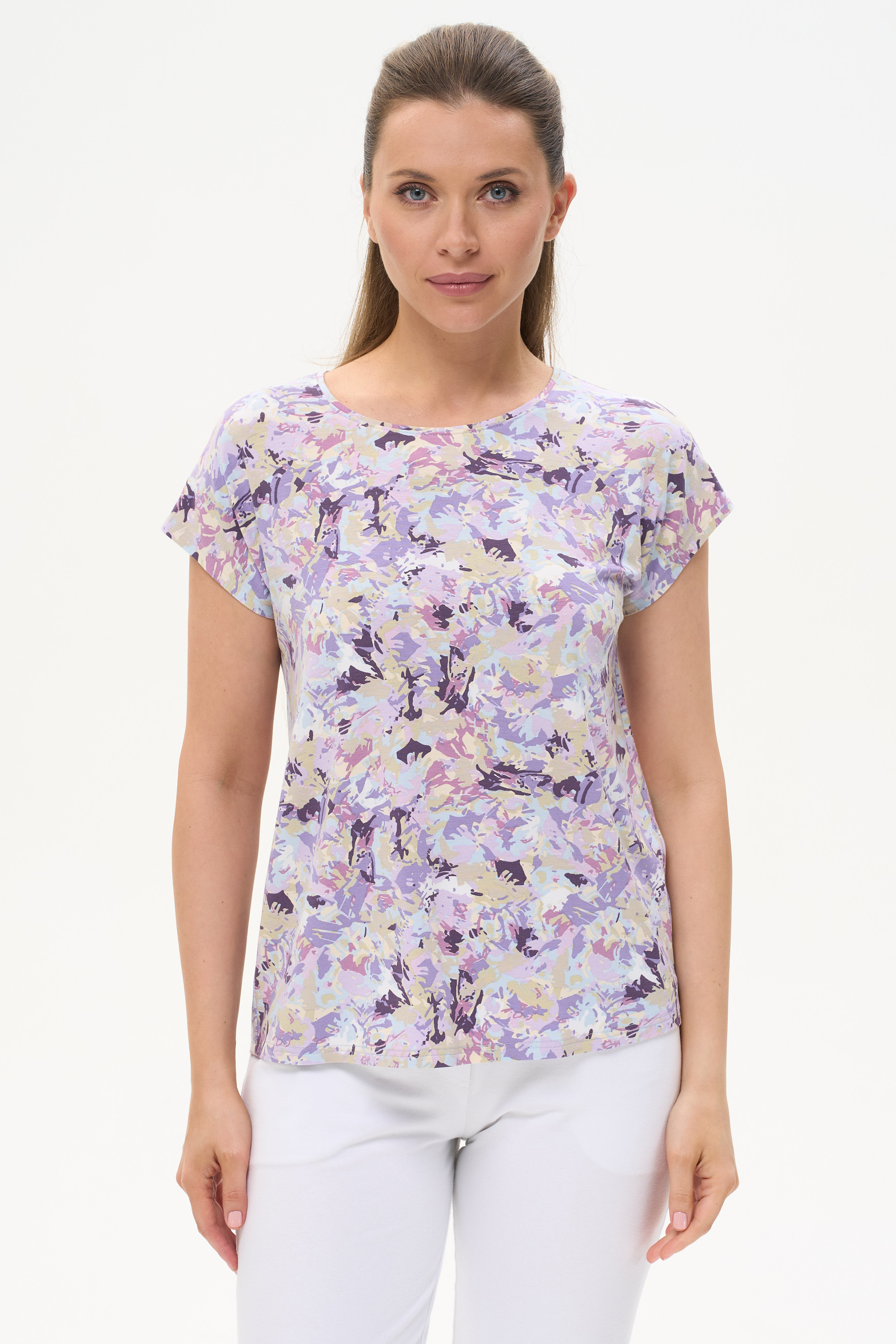 92% вискоза, 8% эластан Блузка прямого силуэта из вискозного трикотажного полотна с эластаном. Круглый вырез горловины, цельнокроеные короткие рукава. Рост модели 175 см.