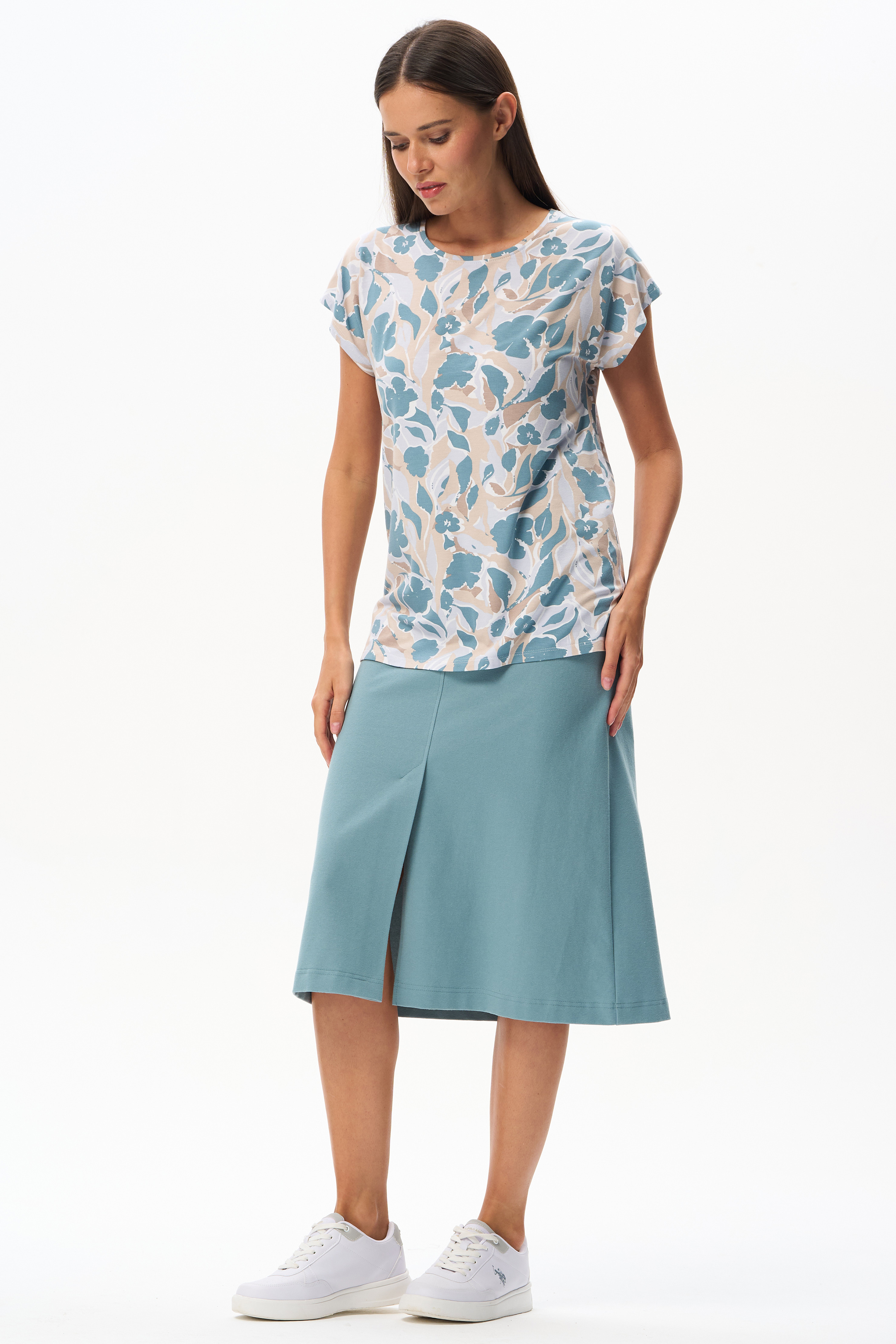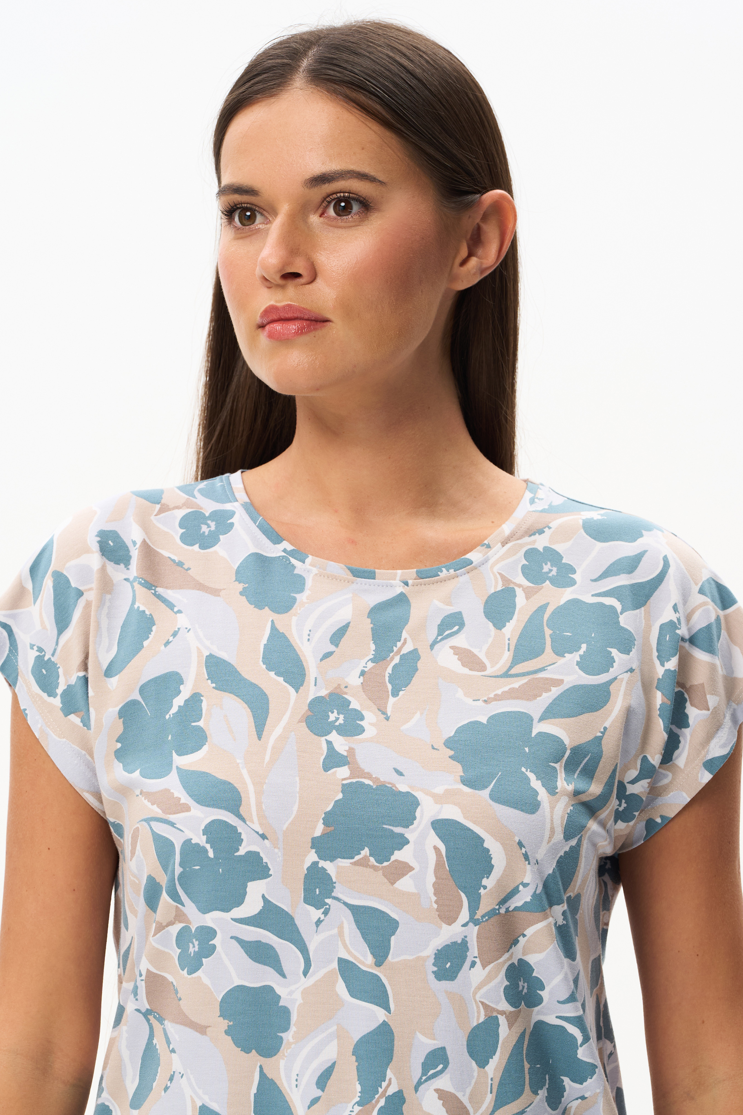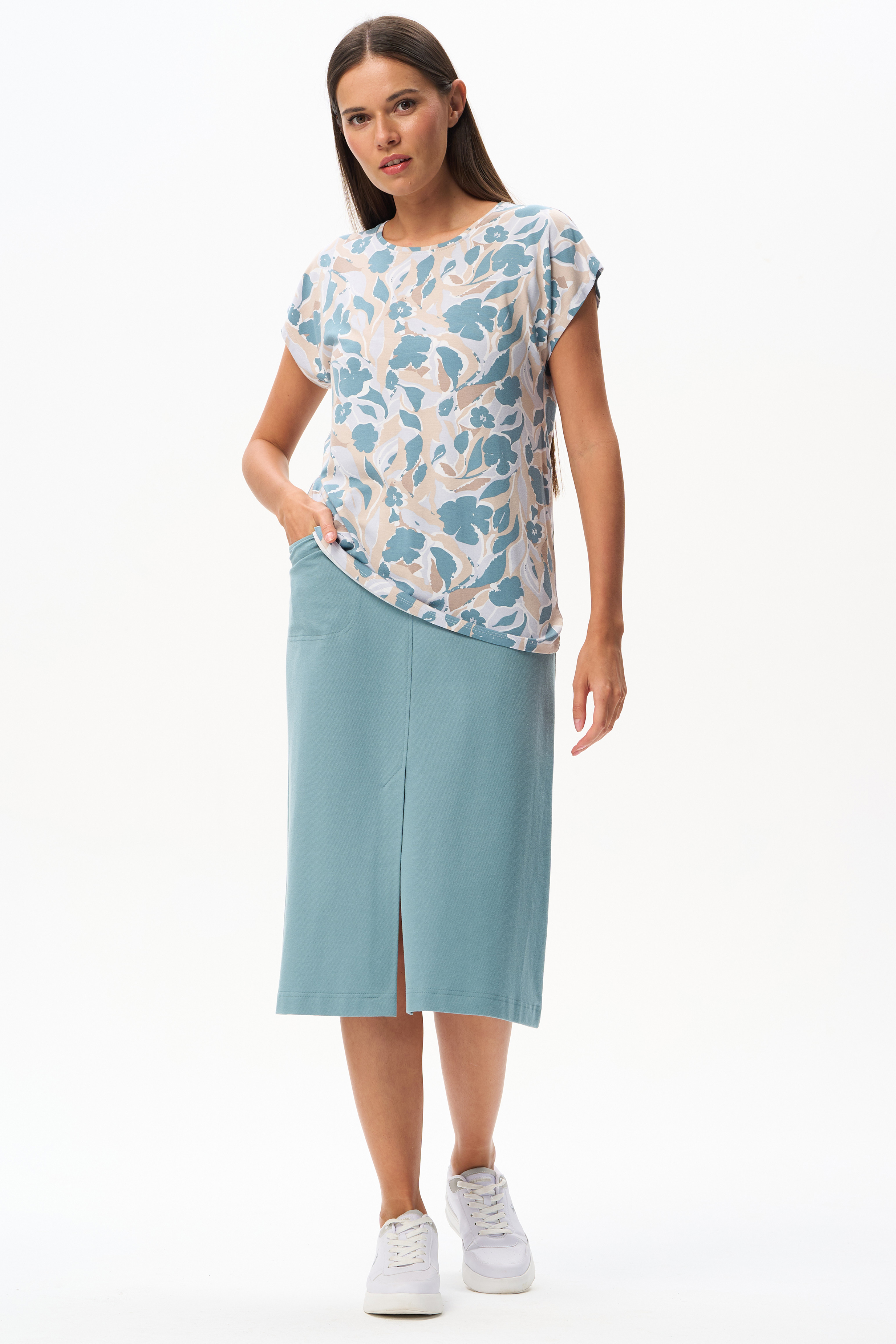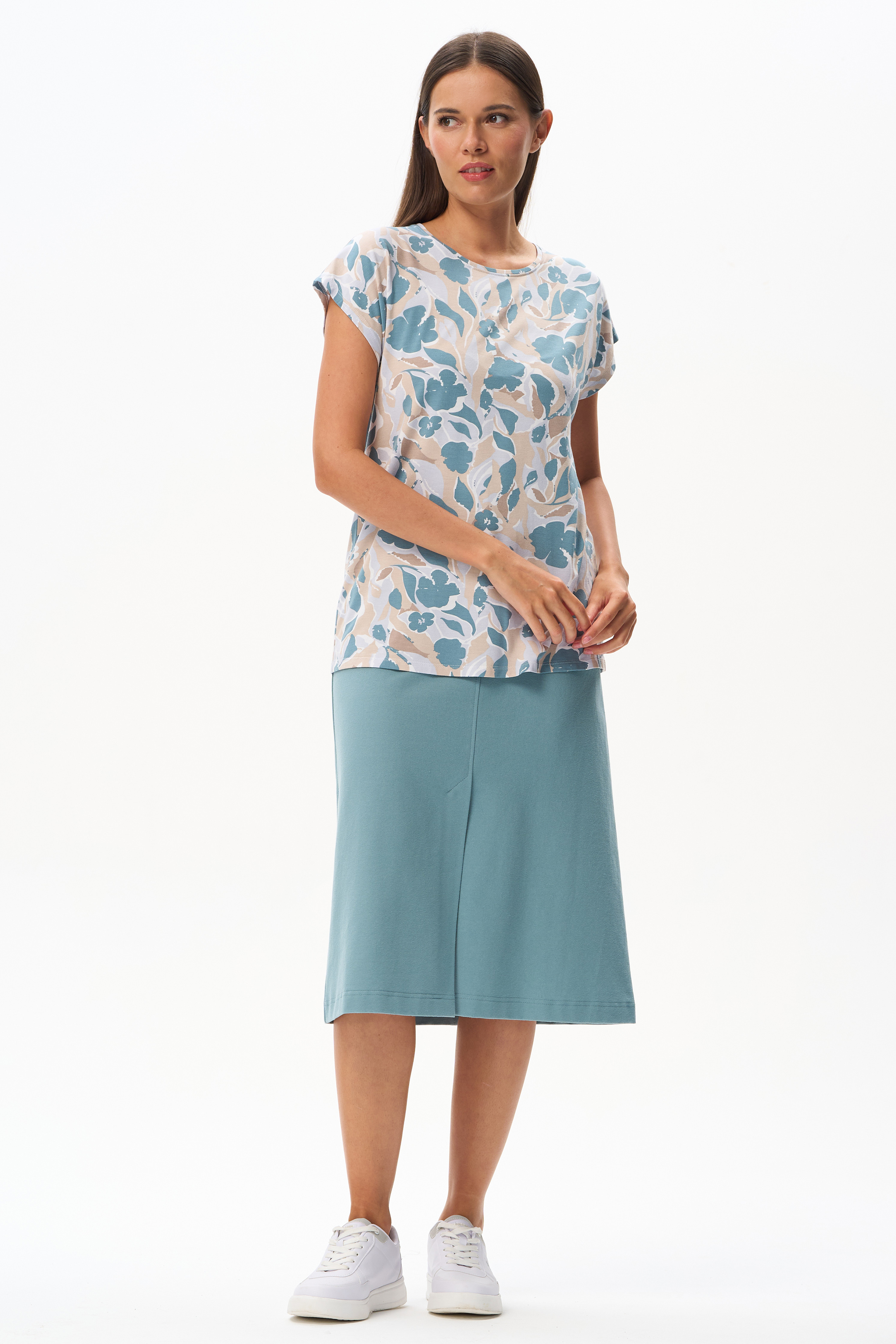 Блузка прямого силуэта из вискозного полотна c дизайнерским рисунком - Цветочная абстракция. Модель со спущенной линией плеча, цельнокроеные короткие рукава, круглый вырез горловины, длиной чуть ниже середины бедер. Универсальная, комфортная модель для лета. Рост модели 175 см