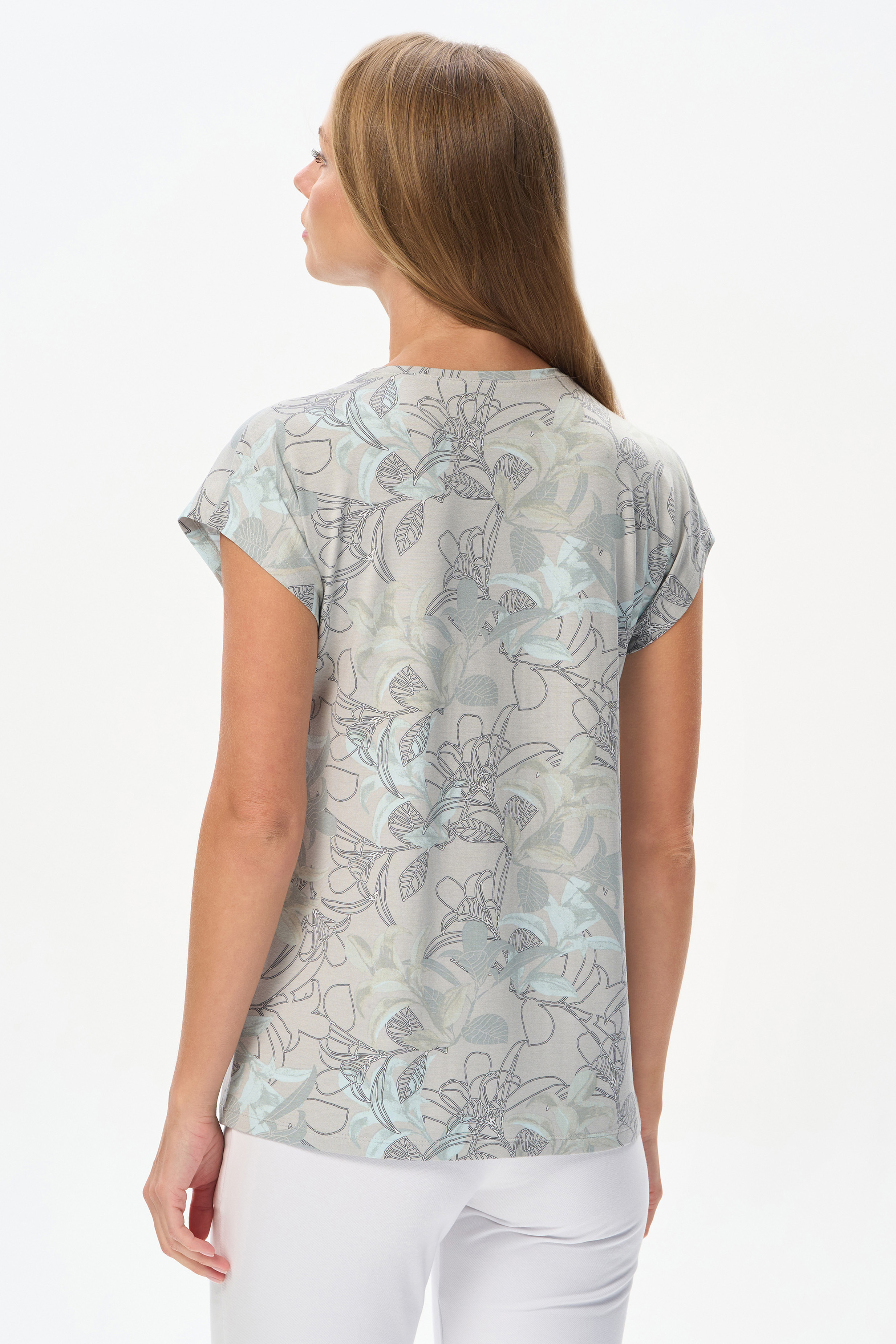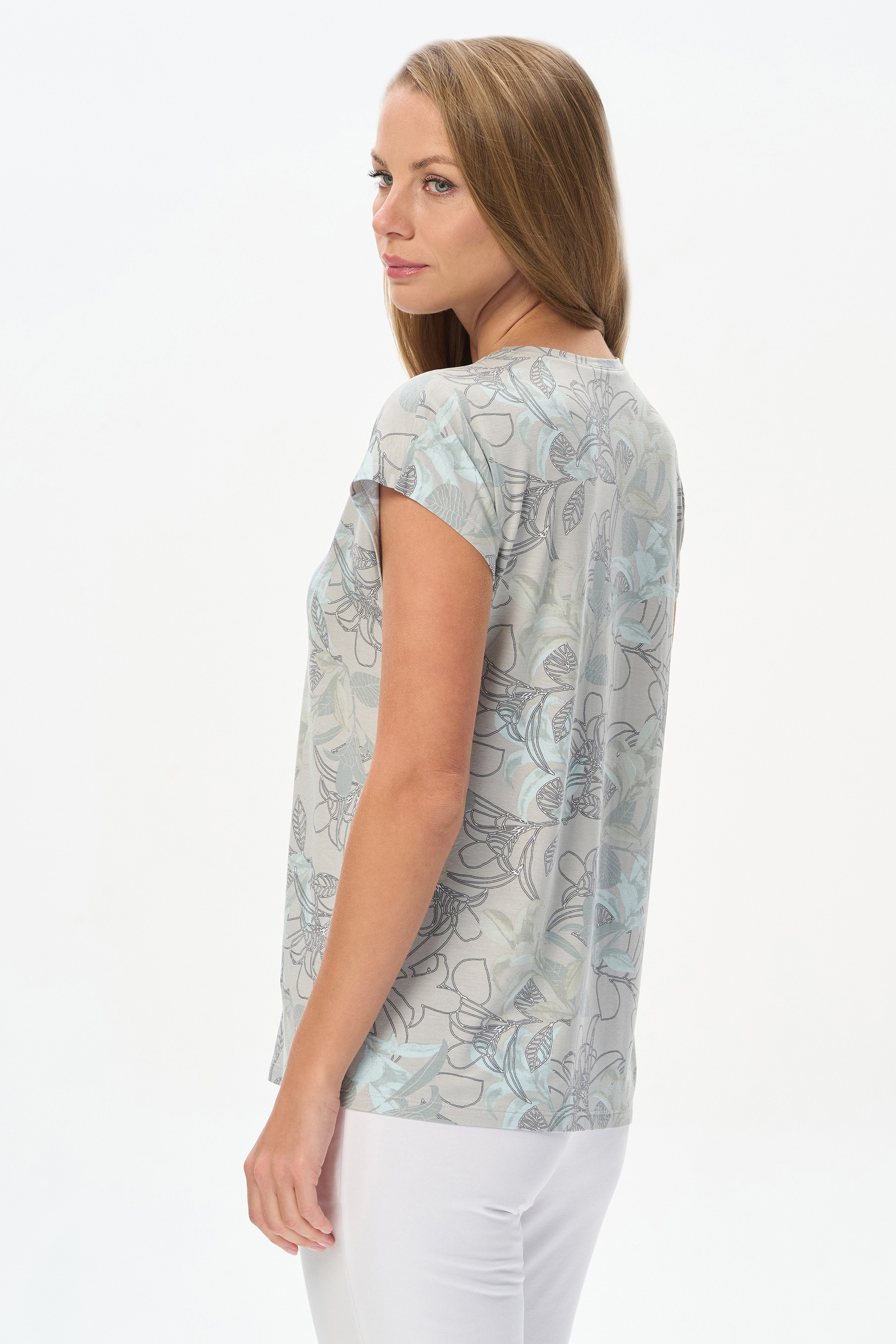 Футболка прямого силуэта из вискозного трикотажного полотна с эластаном. Круглый вырез горловины, цельнокроеные короткие рукава. Рост модели 175 см.