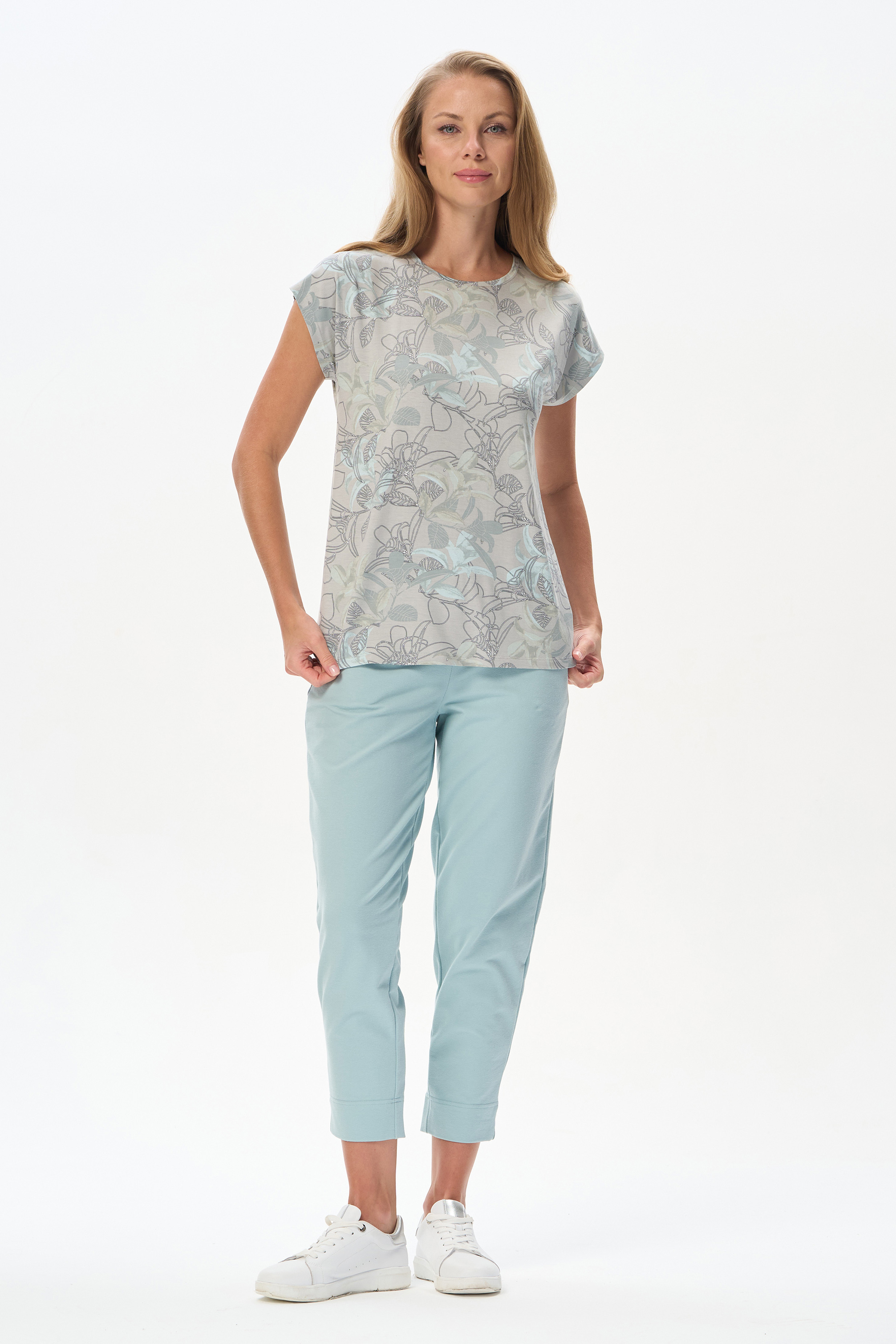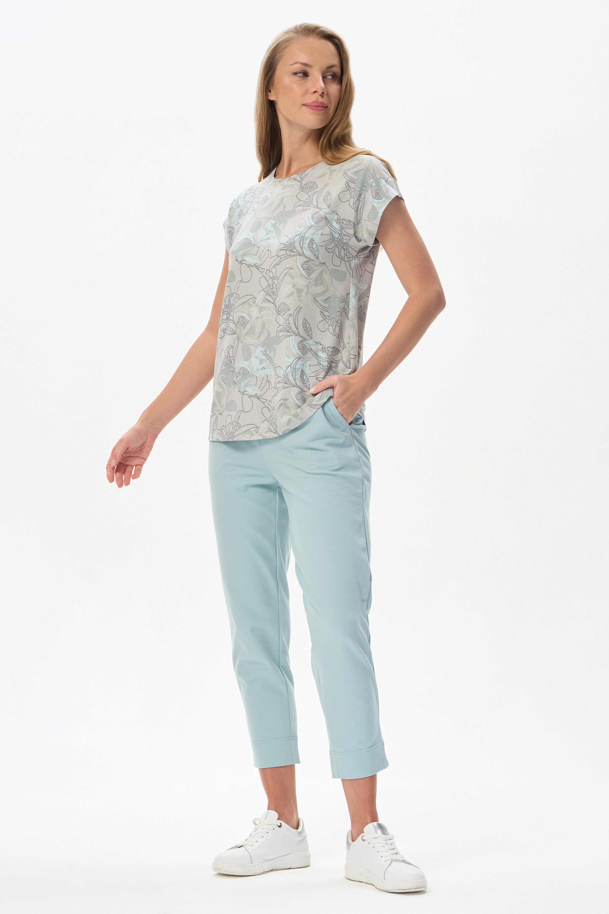 92% вискоза, 8% эластан Футболка прямого силуэта из вискозного трикотажного полотна с эластаном. Круглый вырез горловины, цельнокроеные короткие рукава. Рост модели 175 см.