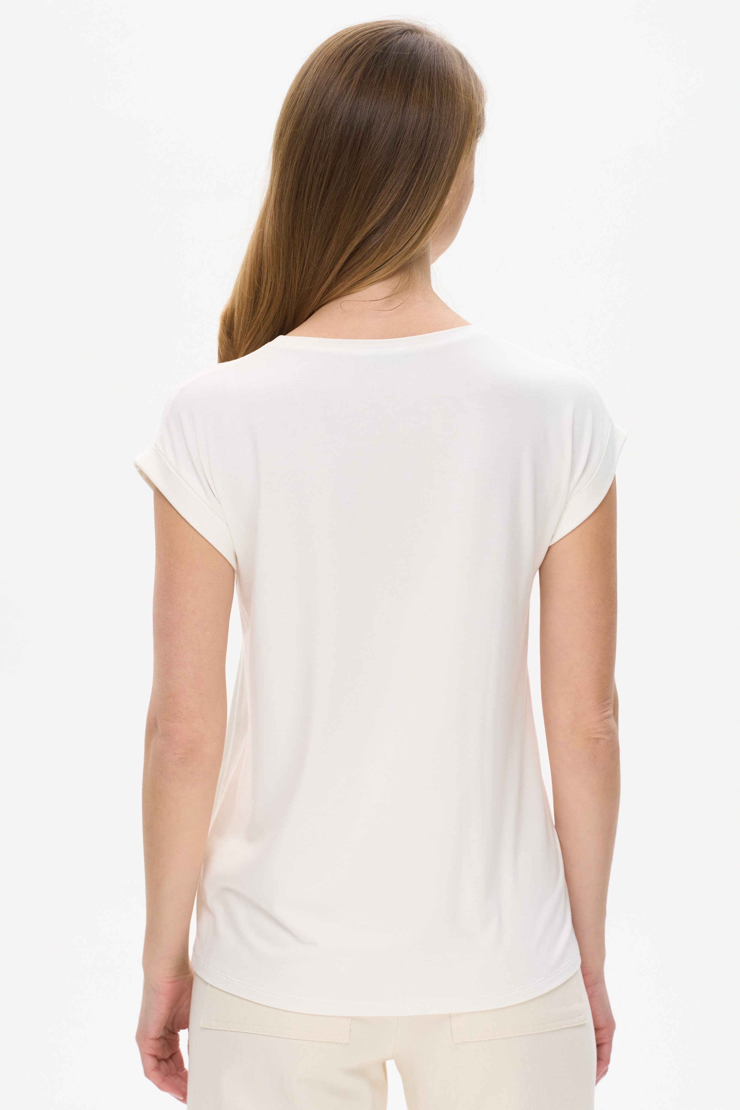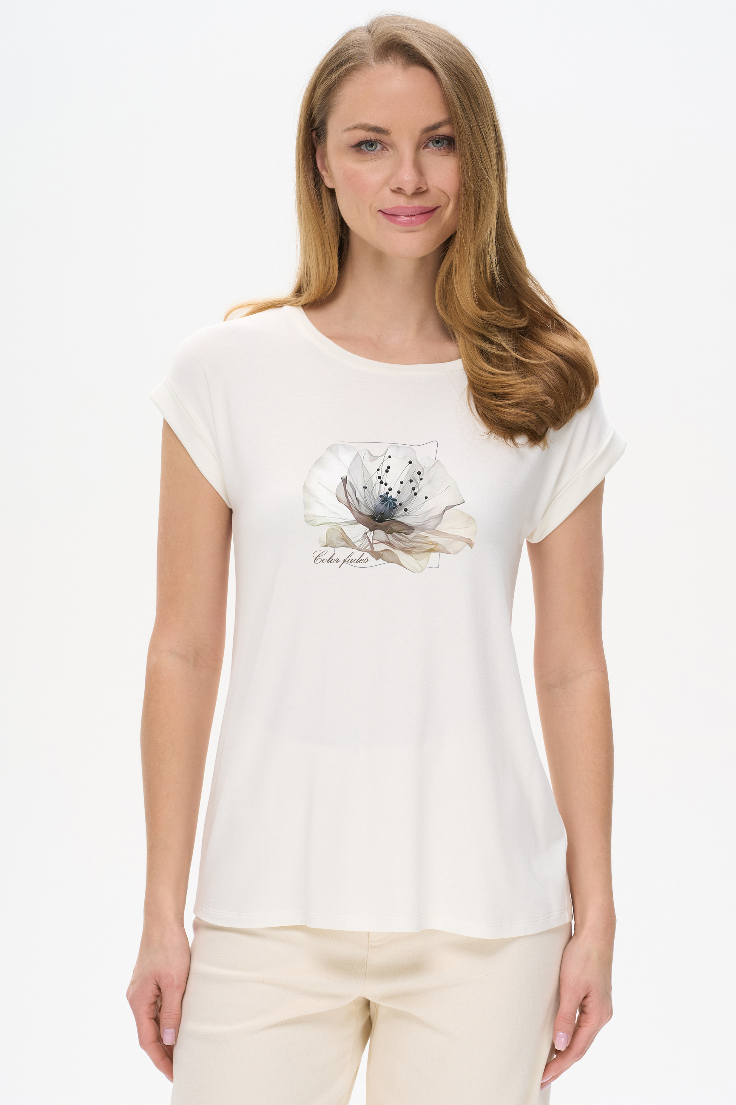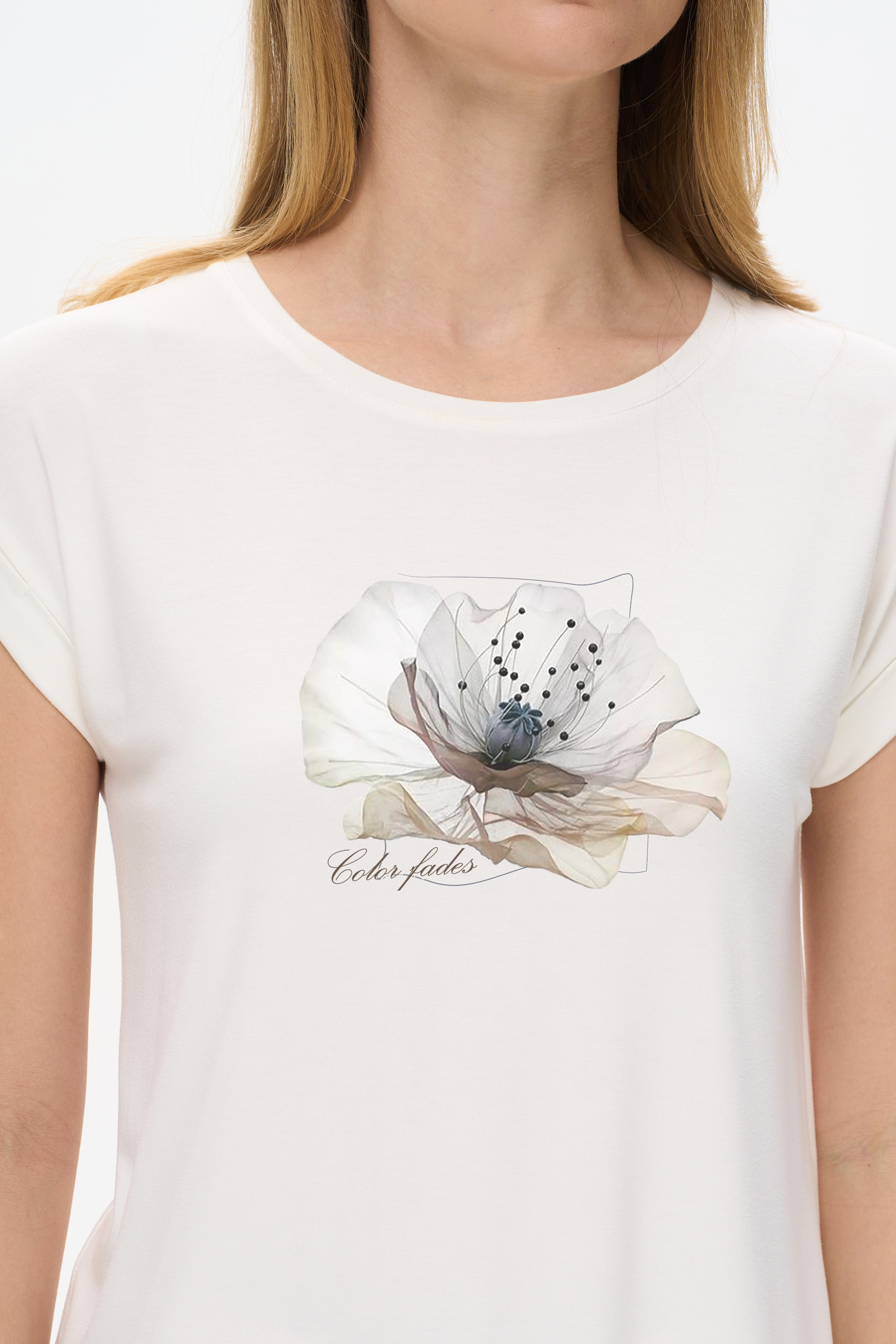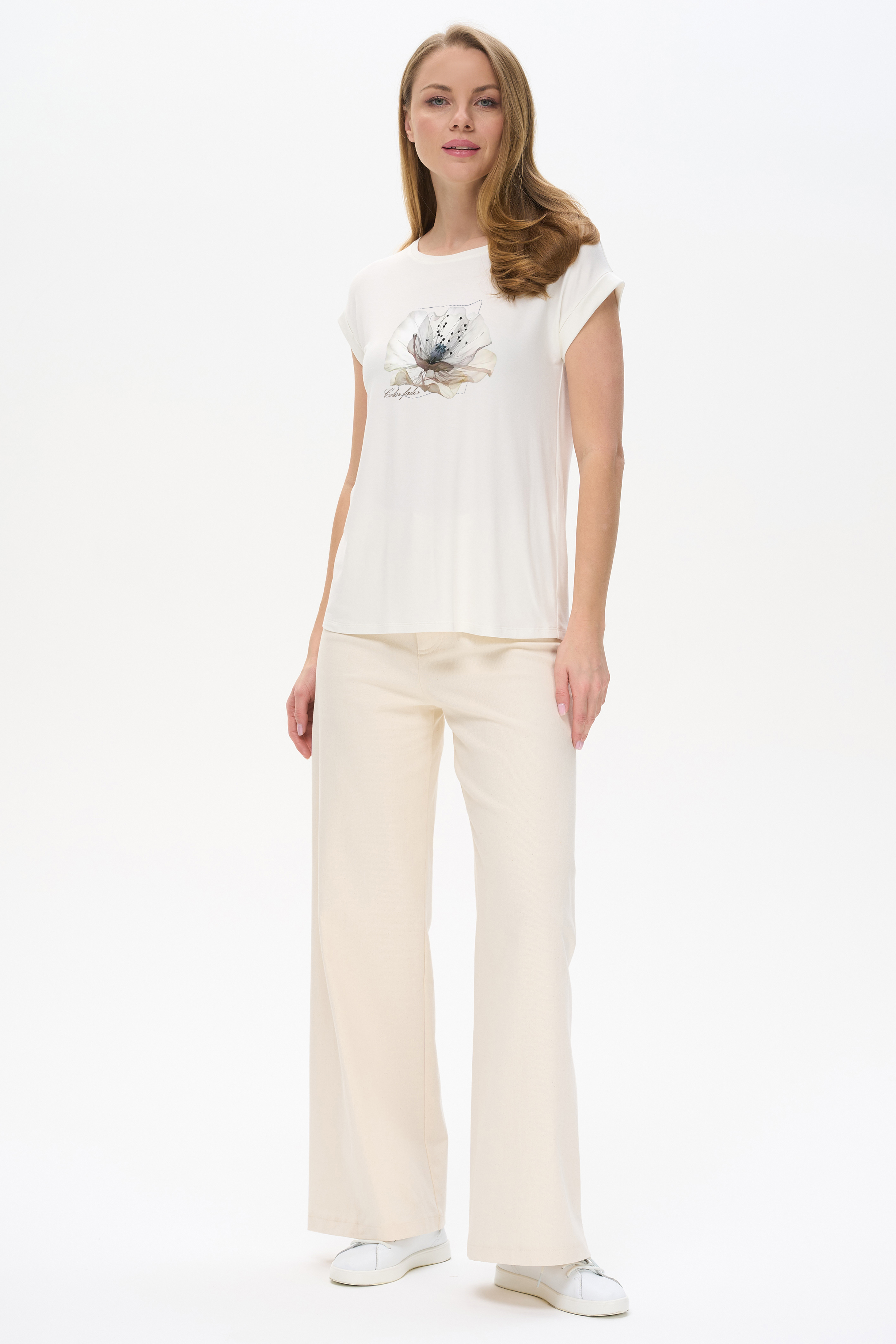92% вискоза, 8% эластан Футболка прямого силуэта из вискозного полотна 200 гр в молочном оттенке с принтом - Нежный акварельный цветок. Модель со спущеной линией плеча, цельнокроеные короткие рукава с зафиксированными подворотами, круглый вырез горловины, длиной чуть ниже середины бедер. Универсальная, комфортная модель на любой случай. Рост модели 175 см