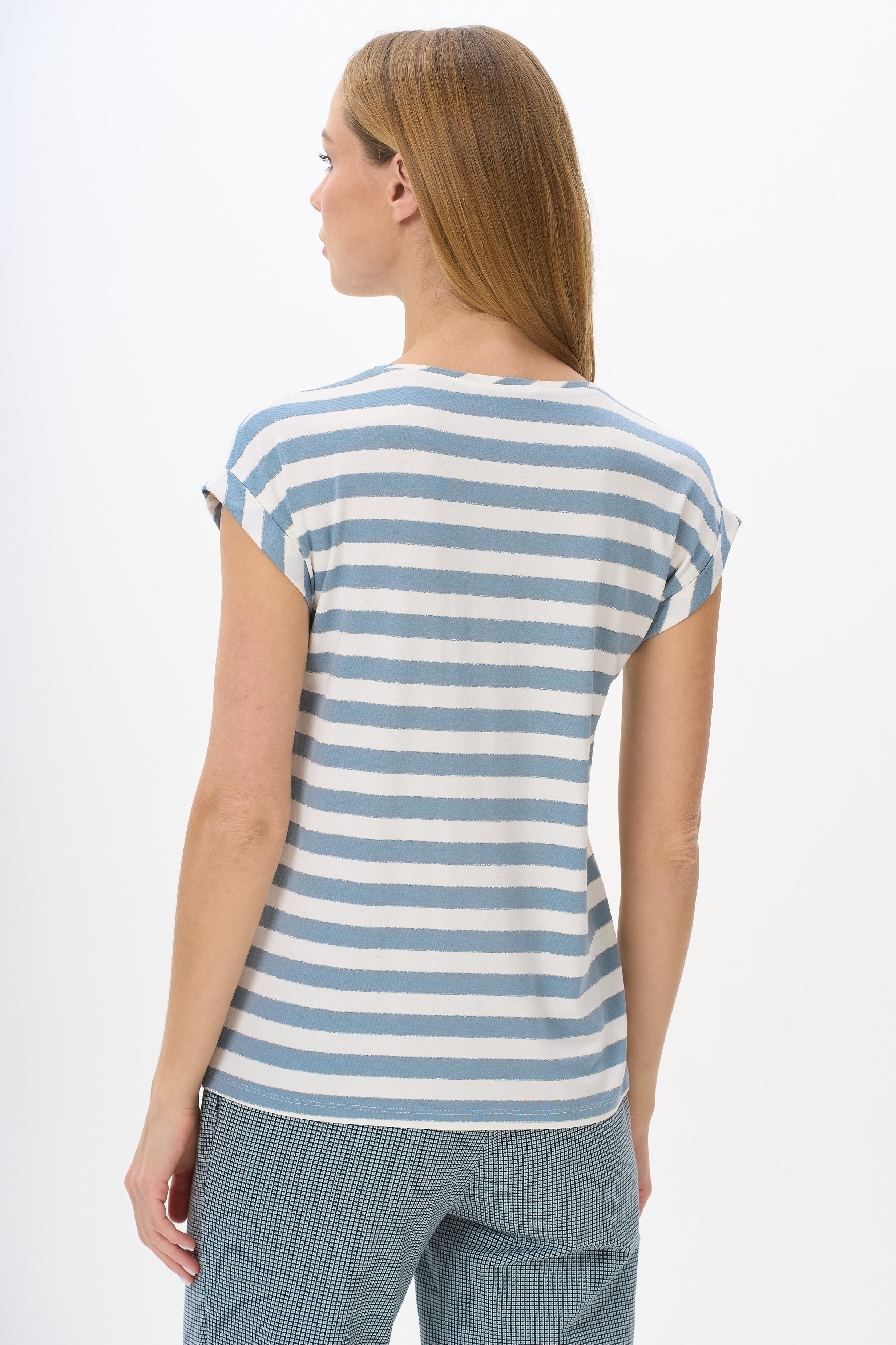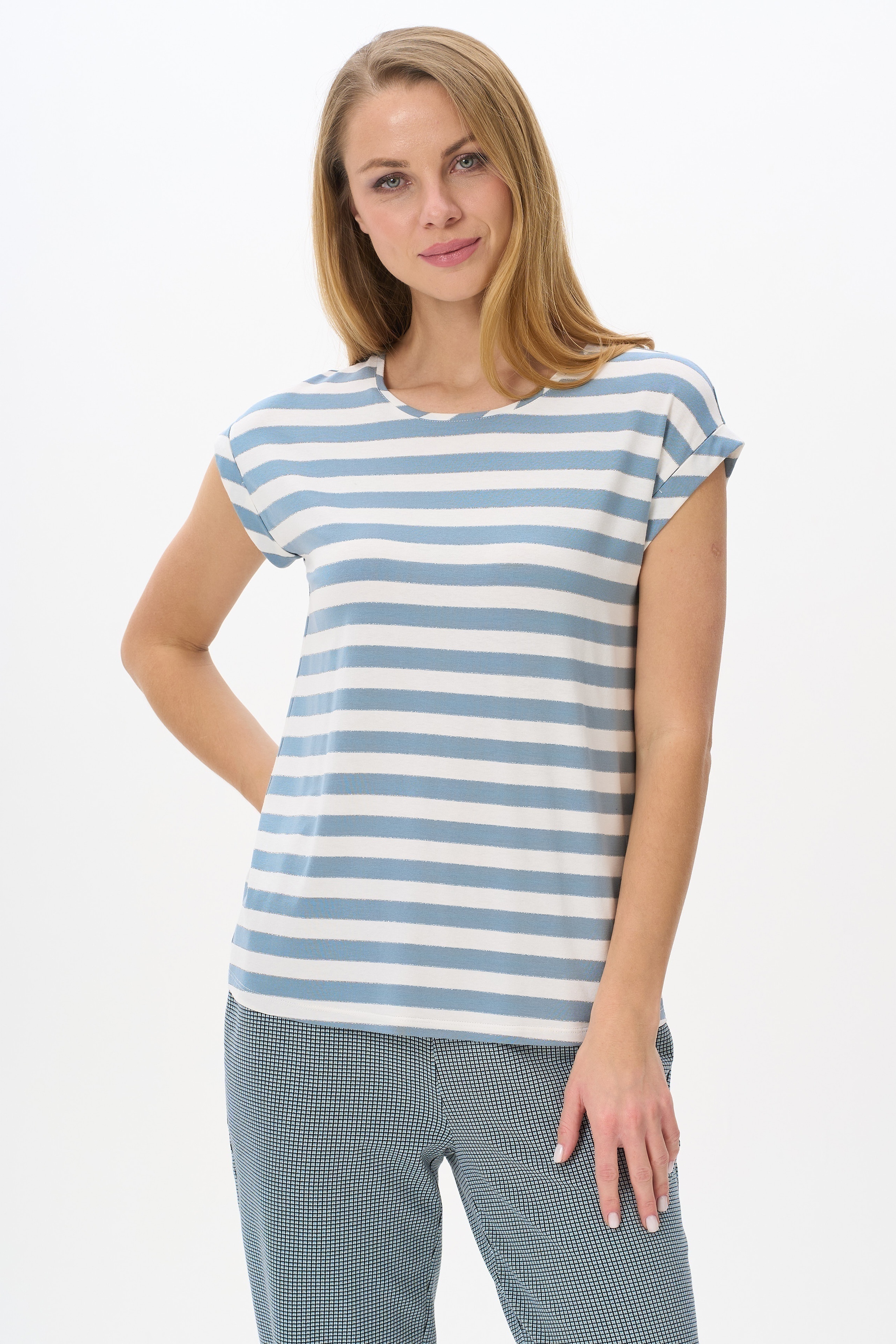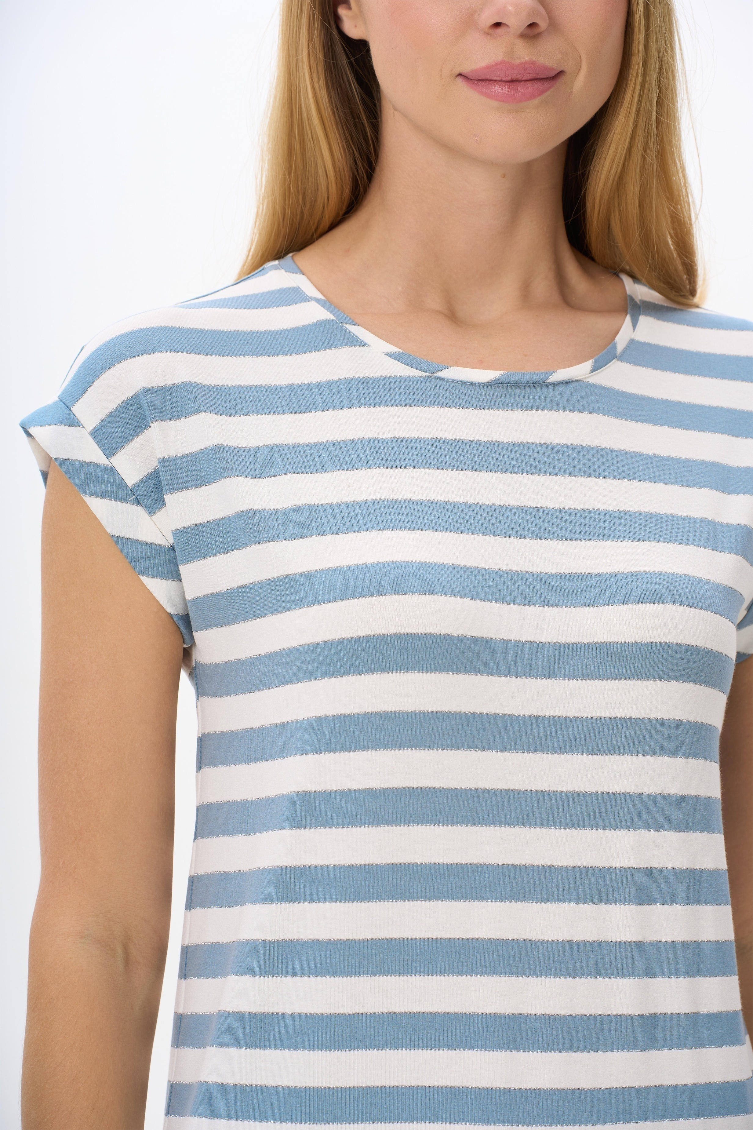 Футболка из вискозного полотна. Модель с круглым вырезом горловины и цельнокроеным коротким рукавом с отворотами. Рост модели на фото 177см.